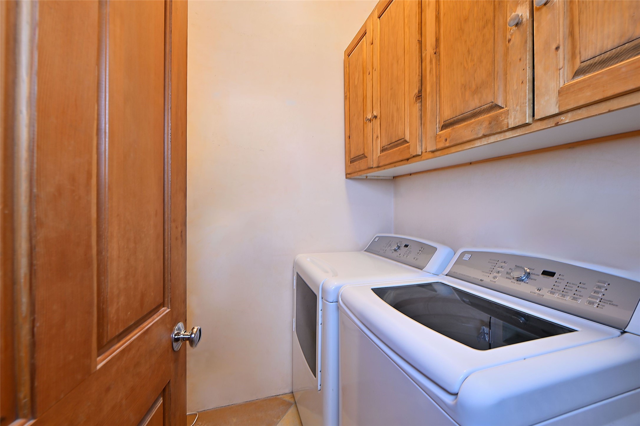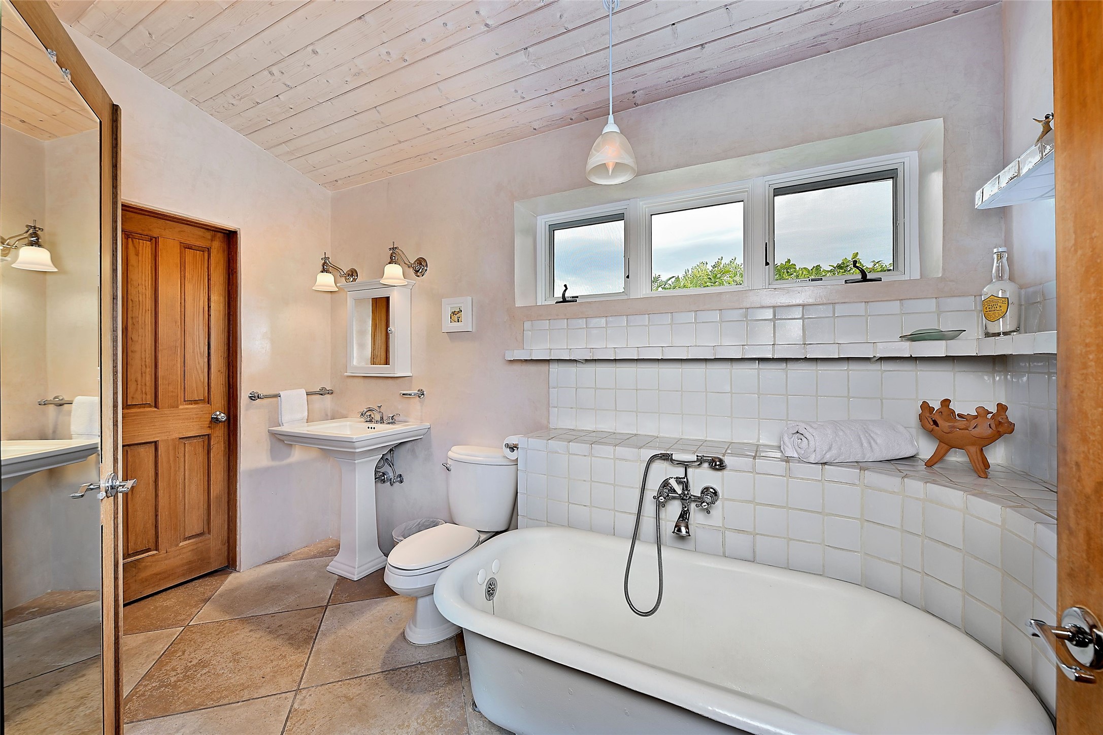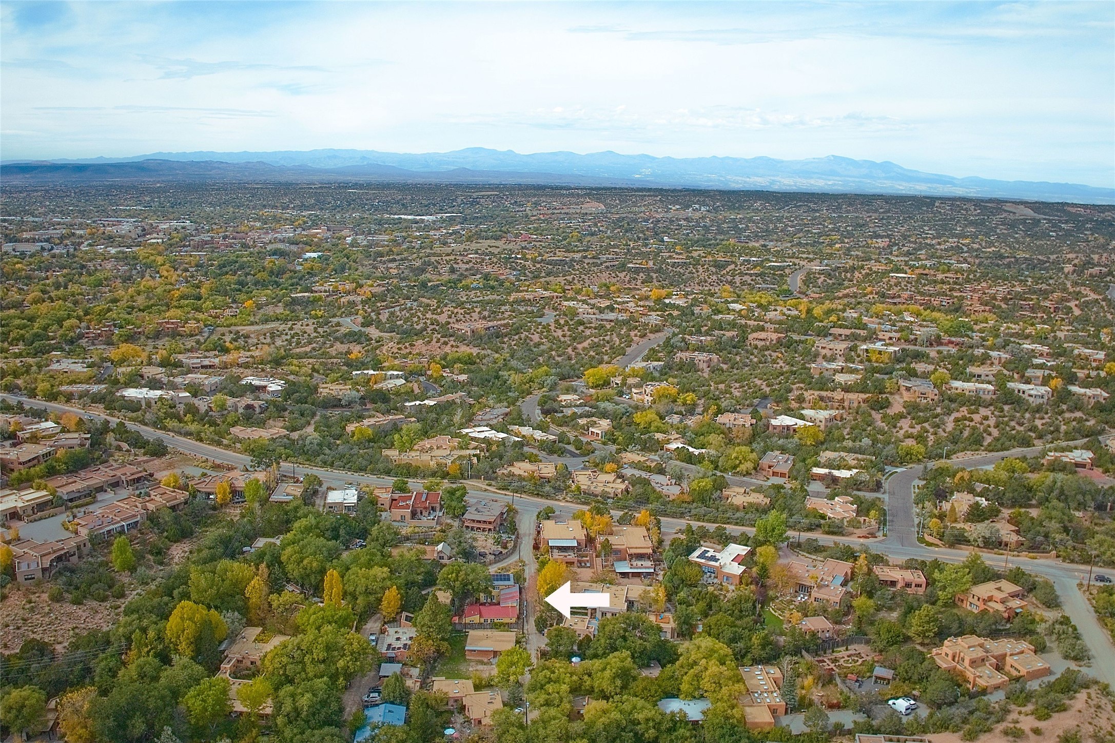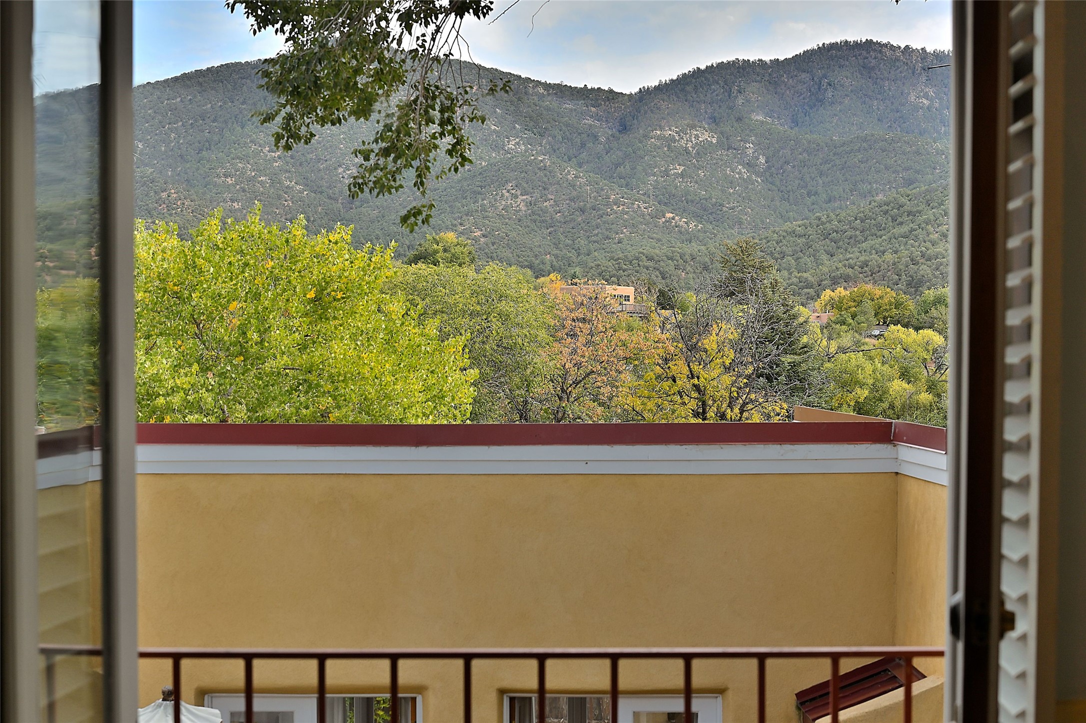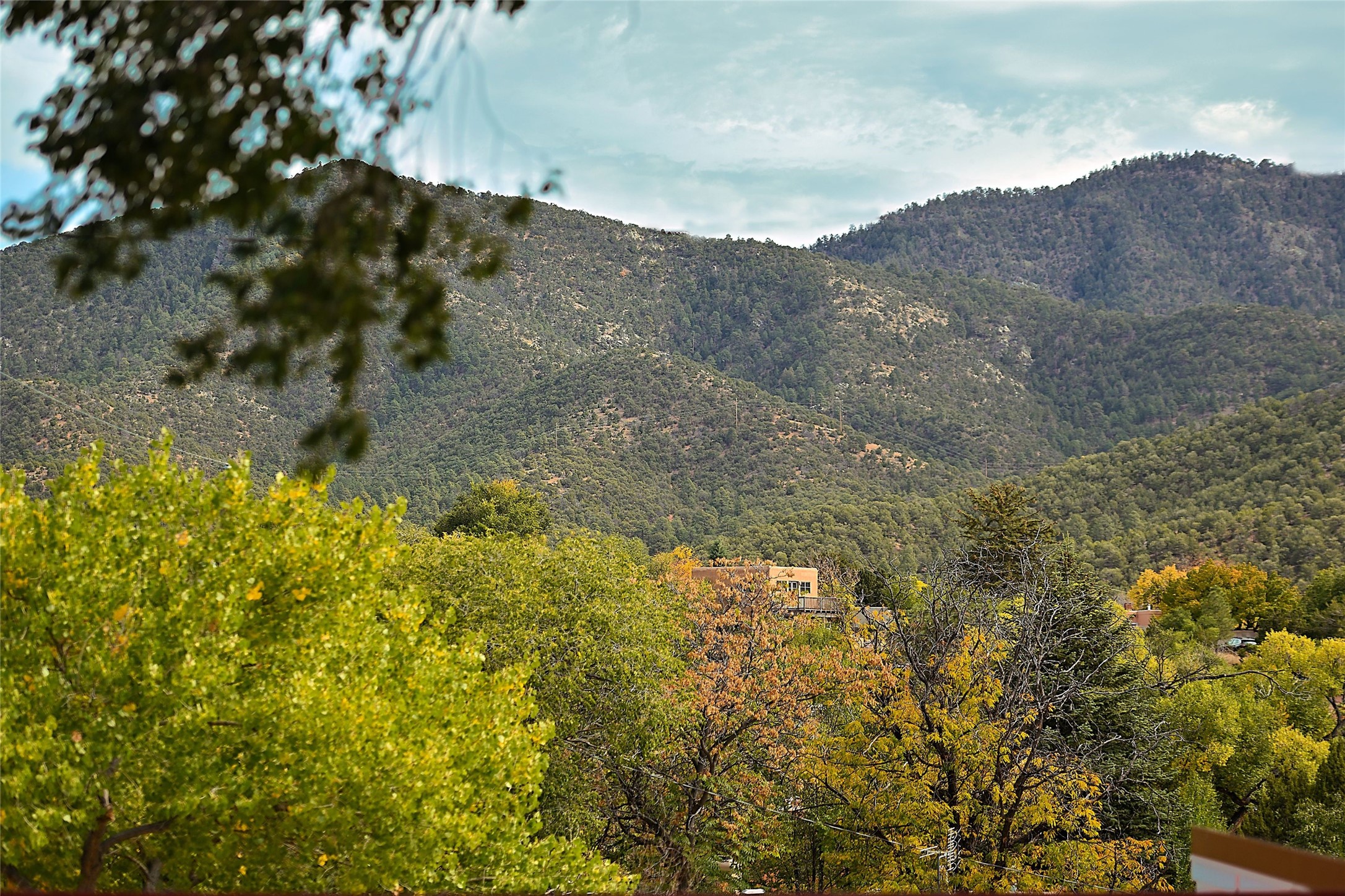 Quiet and charming oasis, located in the heart of Santa Fe's Historic Eastside, and a stone's throw to Canyon Road and the Plaza. Built in 1988 for Santa Fe New Mexican arts critic David Bell, the original two-story structure is carved into an east-facing hillside at the fork of Lorenzo Lane in a verdant neighborhood of historic homes. Unusual for Santa Fe, the yellow stucco exterior gives this delightful home the look of a French country house. Through the quaint, unimposing facade, one enters a surprisingly spacious, yet cozy, three-bedroom home with stunning views of Mount Atalaya and Picacho Peak. French doors open from the living/dining room and all three en-suite bedrooms to a tranquil courtyard surrounded by stone walls, walkways, and irrigated, terraced beds planted with lavender, perennials and shade trees. The primary bedroom was added in 1997 and the attached casita (accessed from the courtyard) was built in 2017 per the design of famed Santa Fe architect Richard Martinez. The property features an abundance of charming features, including: Antique kitchen cabinetry repurposed from a landmark Santa Fe hardware store; 12-foot living/room dining room ceiling with vigas; Diamond-plaster-finished living/dining room, primary bedroom, and casita walls; Painted floors and wood ceiling detailing; Kiva fireplace; French doors into the courtyard from all bedrooms and living/dining room; Landscape lighting and small fountain in courtyard. Modern upgrades include: AC/Heat supplied by mini-splits installed in kitchen and all bedrooms in 2017; Lochinvar, high-efficiency gas furnace installed in 2021 supplies radiant floor heat and instant hot water; Roof-mounted solar panels installed in 2017 that supply 100% of the electricity. The property was previously a popular short-term rental with rave reviews from guests. This is truly the ideal enchanting Santa Fe retreat that is not to be missed!