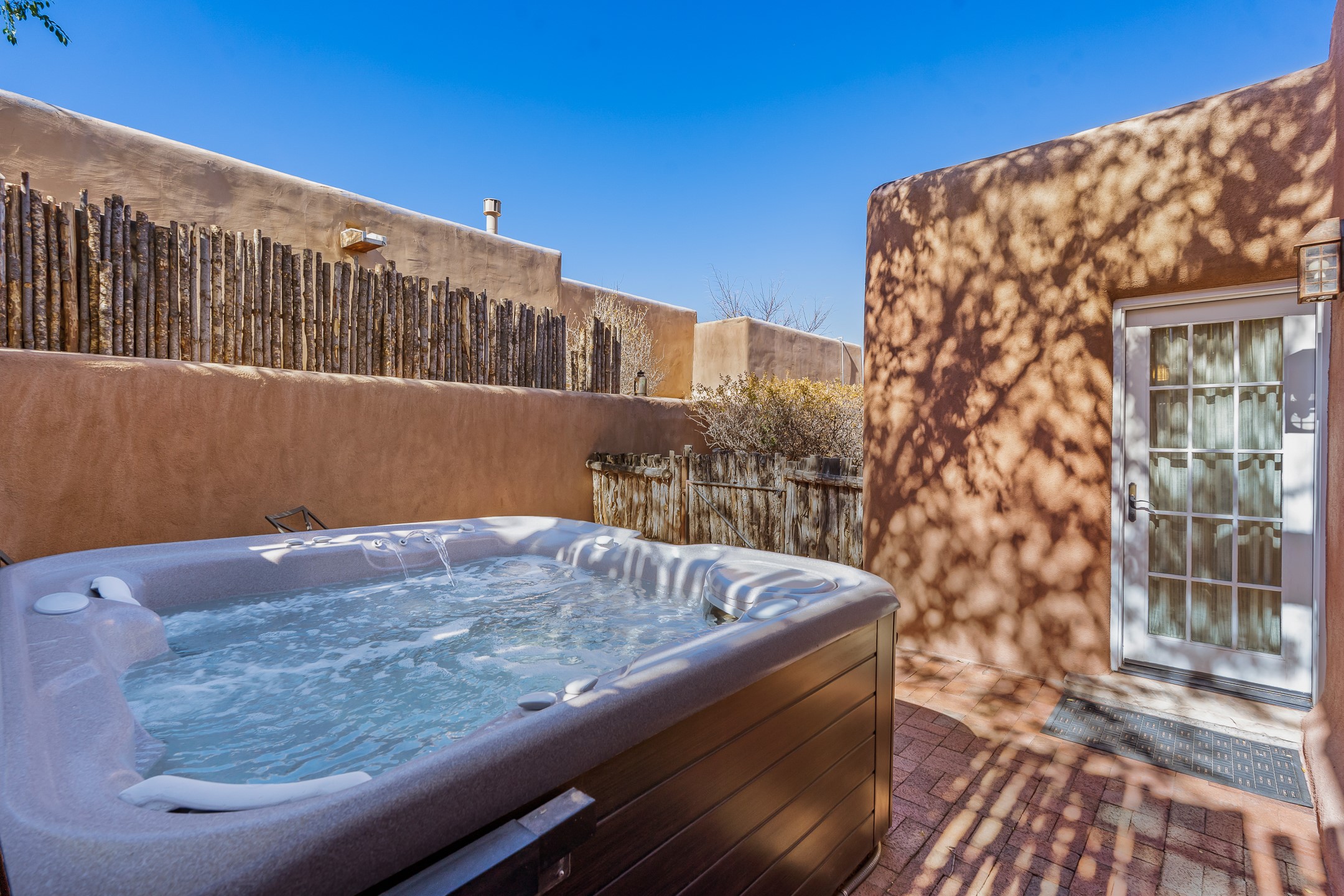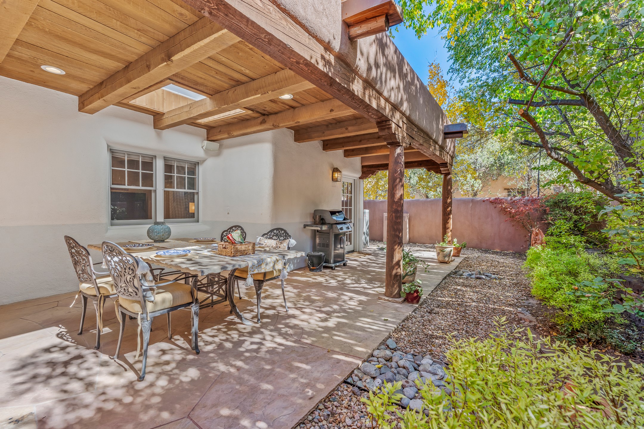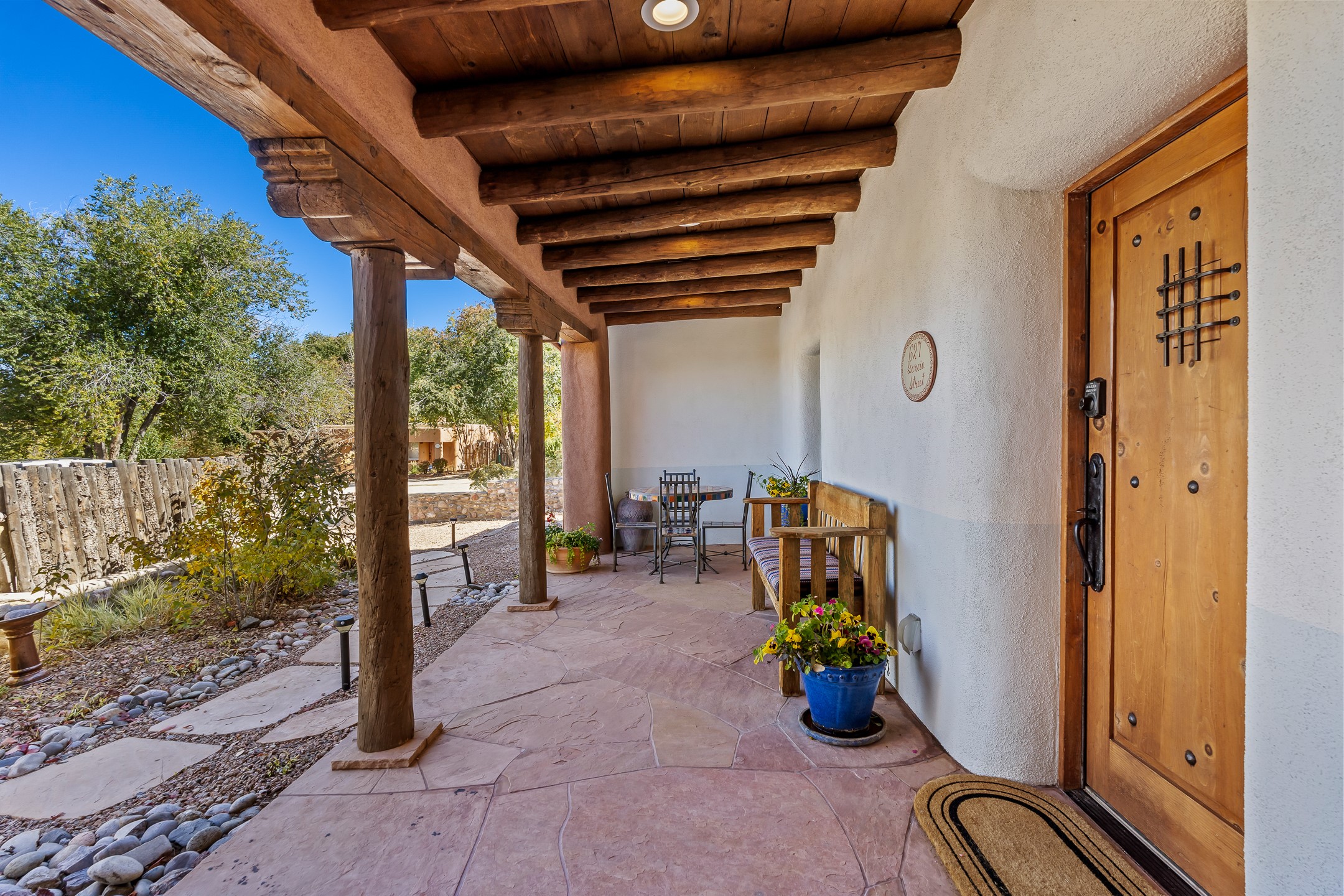 Classic Eastside adobe pied--terre that exemplifies the timeless beauty and investment value of Santa Fe real estate. Set down a quiet private lane off Garcia Street, the home offers an ideal combination of historic Pueblo-style architecture, privacy, and exceptional short-term rental performance. Built in 1937, the home features thick adobe walls, exposed vigas, plaster ceilings, and hardwood floors, creating a warm and authentic interior. The living room centers around a traditional kiva fireplace, with an open flow to the dining area and updated kitchen. Two shaded portals provide elegant outdoor living, while the primary suite opens to a private patio with hot tub. The property is surrounded by drought-tolerant, low-maintenance landscaping, creating a serene environment that enhances both livability and curb appeal. In addition to +/-1,500 square feet of heated living space, a 413-square-foot basement offers rare and valuable storage. Notably, 627 Garcia has an impressive rental history, generating net rental income of approximately $100,000 in 2023, $93,000 in 2024, and $65,000 year-to-date in 2025 (as of October). This proven performance makes the home a turnkey opportunity for buyers seeking a lifestyle investment. Located just minutes from Canyon Road, Museum Hill, and the historic Plaza, this property is perfectly positioned to enjoy the very best of Santa Fe's culture, art, and natural beauty.