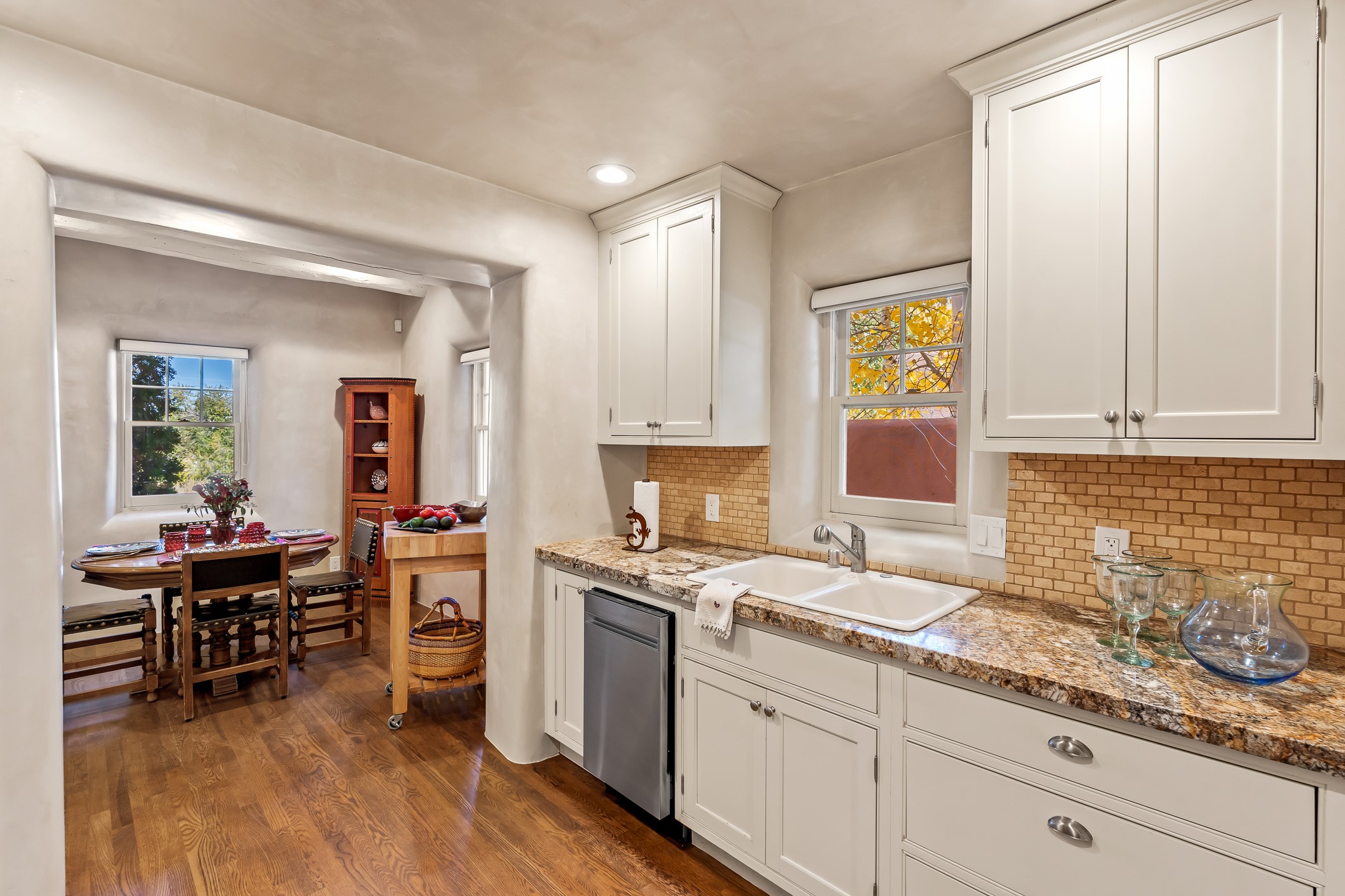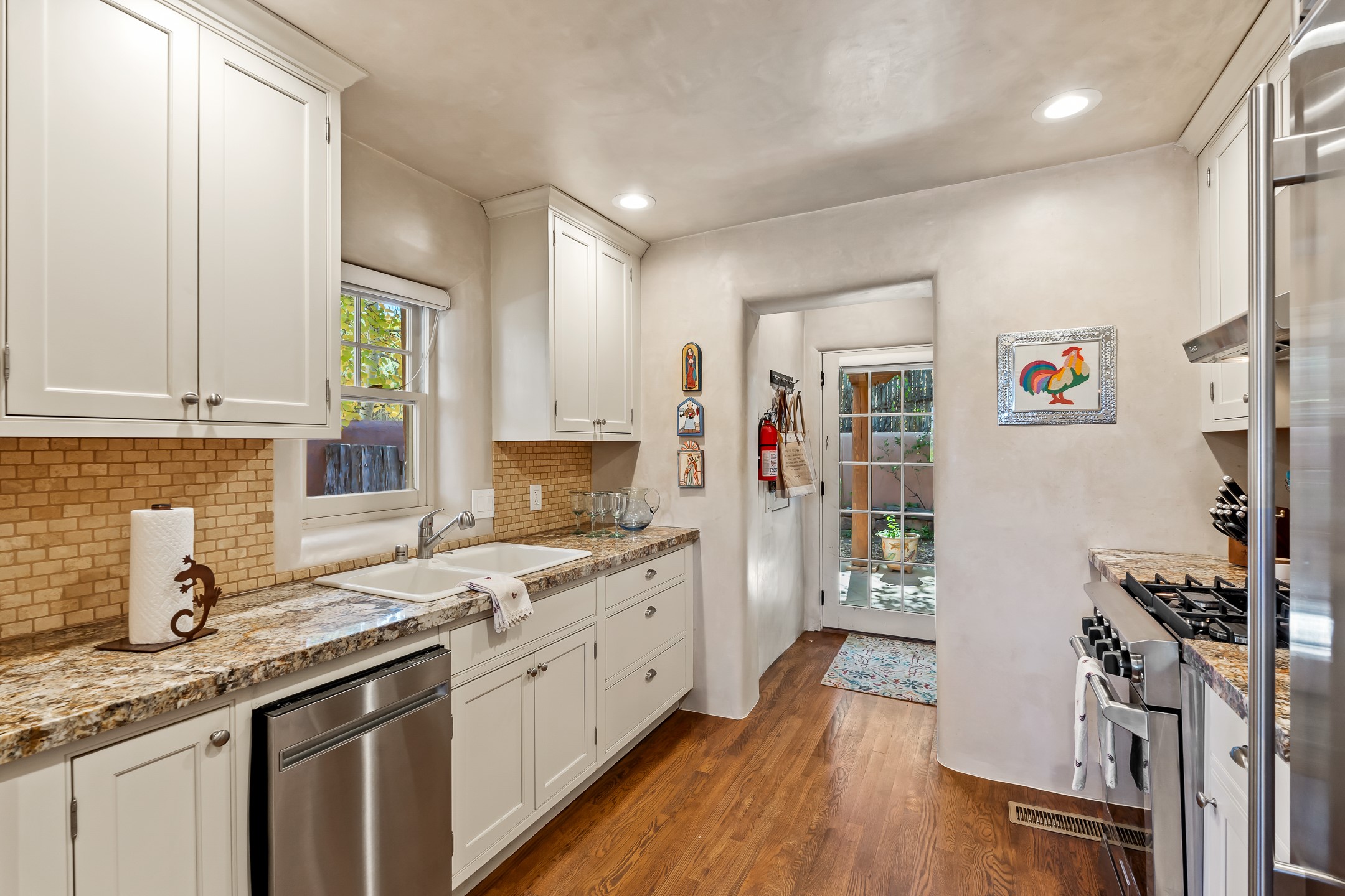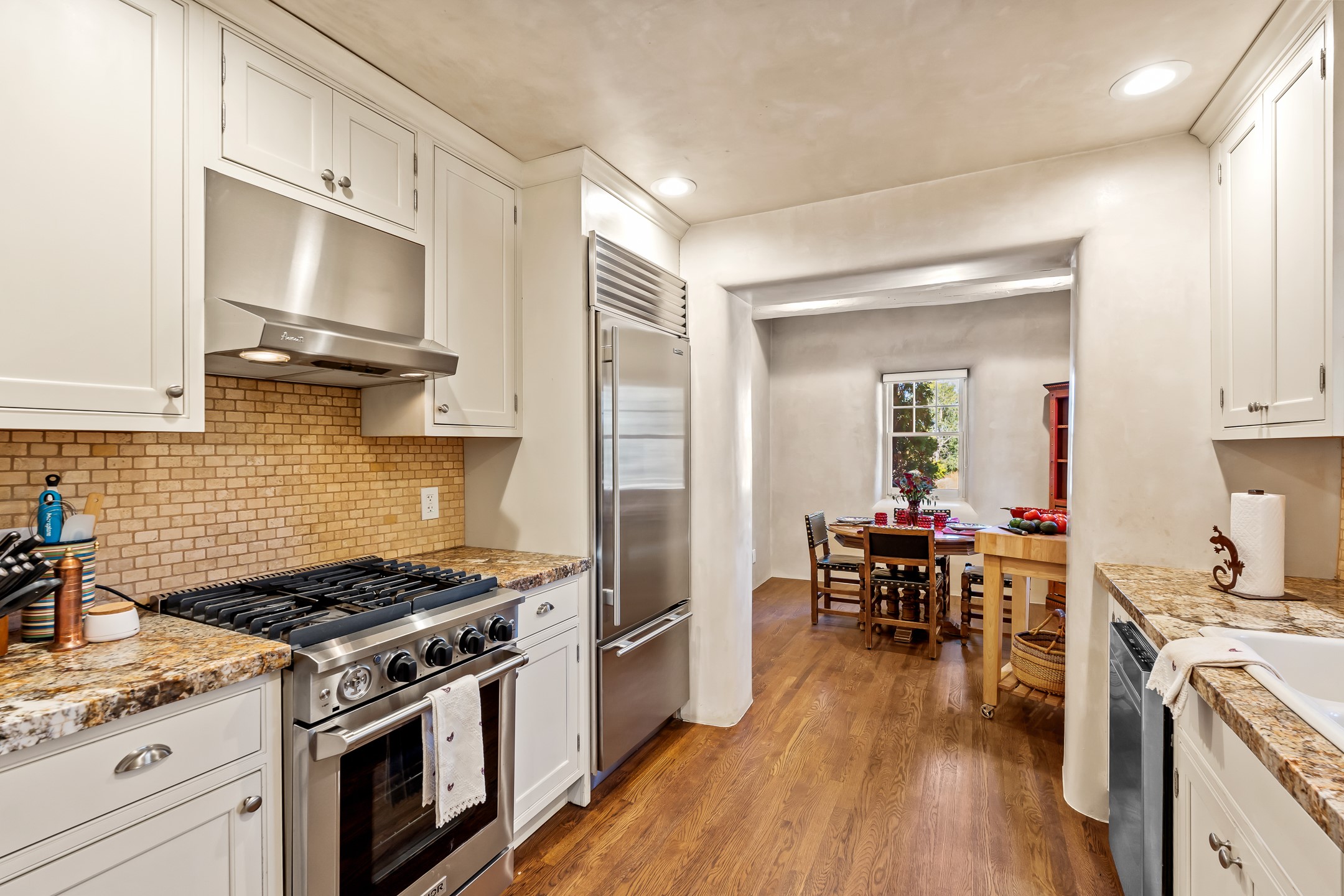 Classic Eastside adobe pied--terre that exemplifies the timeless beauty and investment value of Santa Fe real estate. Set down a quiet private lane off Garcia Street, the home offers an ideal combination of historic Pueblo-style architecture, privacy, and exceptional short-term rental performance. Built in 1937, the home features thick adobe walls, exposed vigas, plaster ceilings, and hardwood floors, creating a warm and authentic interior. The living room centers around a traditional kiva fireplace, with an open flow to the dining area and updated kitchen. Two shaded portals provide elegant outdoor living, while the primary suite opens to a private patio with hot tub. The property is surrounded by drought-tolerant, low-maintenance landscaping, creating a serene environment that enhances both livability and curb appeal. In addition to +/-1,500 square feet of heated living space, a 413-square-foot basement offers rare and valuable storage. Notably, 627 Garcia has an impressive rental history, generating net rental income of approximately $100,000 in 2023, $93,000 in 2024, and $65,000 year-to-date in 2025 (as of October). This proven performance makes the home a turnkey opportunity for buyers seeking a lifestyle investment. Located just minutes from Canyon Road, Museum Hill, and the historic Plaza, this property is perfectly positioned to enjoy the very best of Santa Fe's culture, art, and natural beauty.