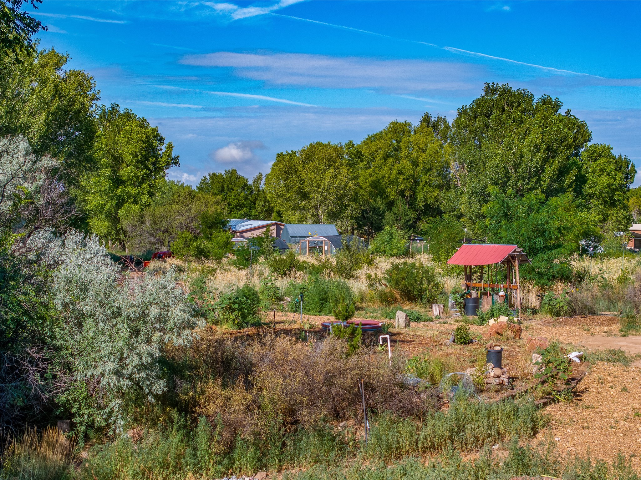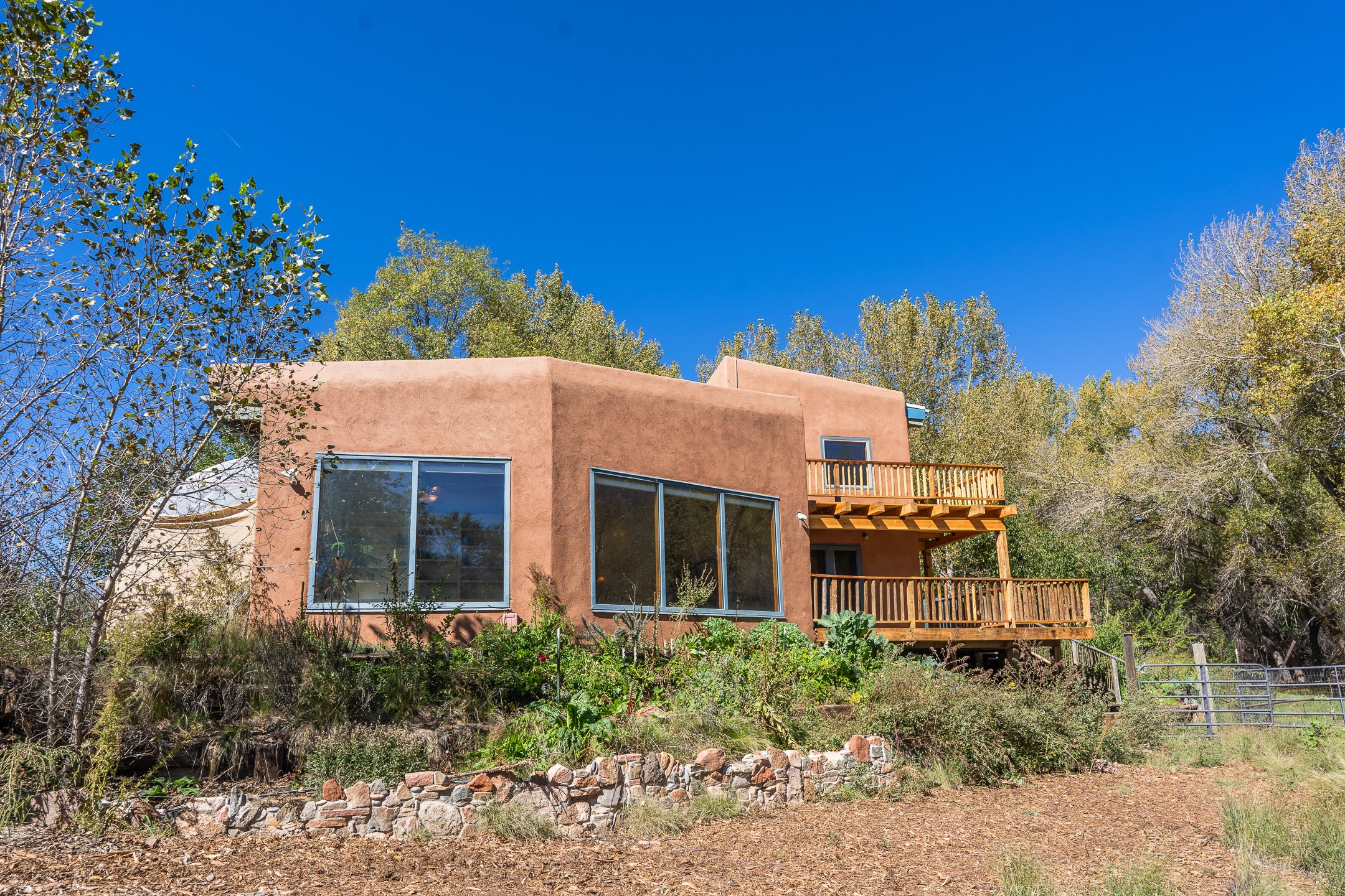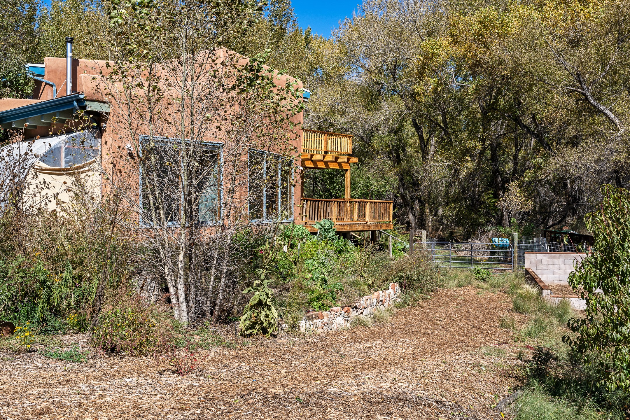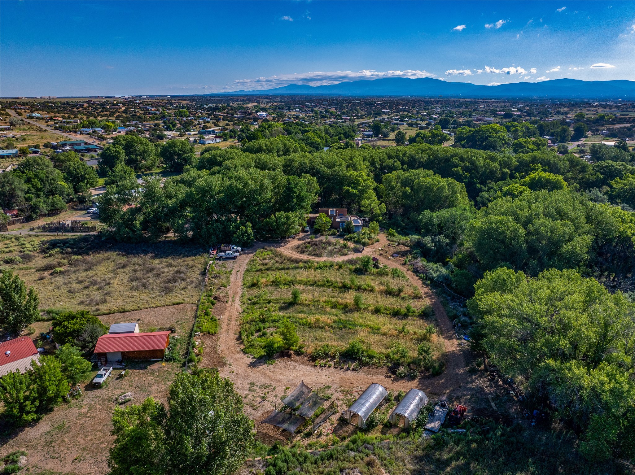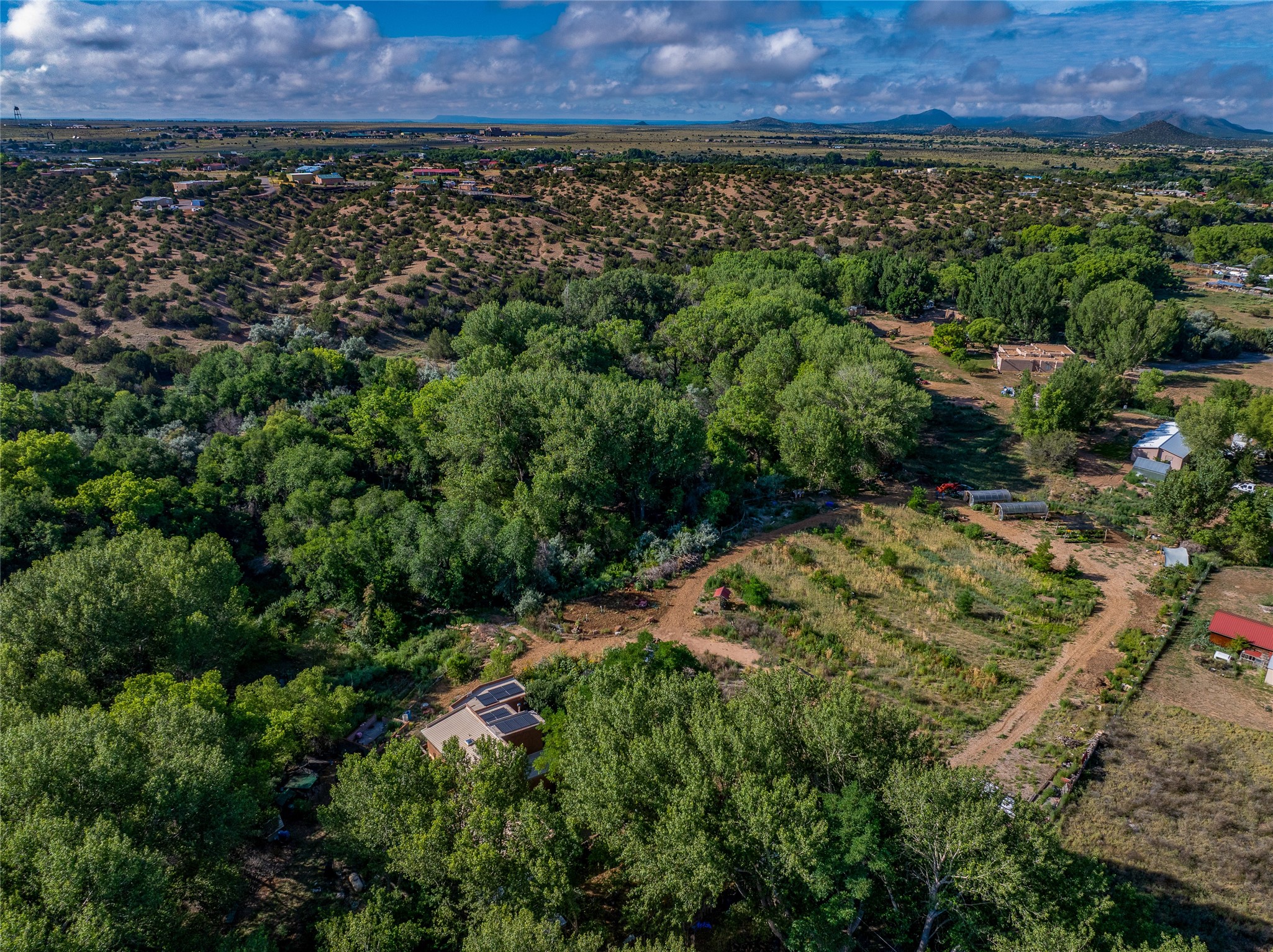 High desert permaculture oasis! 3-bedroom, 2-bath, 3066 square foot home, with large bonus room with it's own entry that could serve as studio, office, or another bedroom, nestled in towering cottonwoods on three lots totaling almost 18 acres along the lower Arroyo Hondo, with an intermittent spring and a year-round pond. This working permaculture farm produces nursery stock and landscaping plants, as well as generous amounts of food for family and friends, with a chicken coop, two 360 sq. ft. hoop houses and roughly 8/10ths of an acre in cultivation, including gardens and fruit trees. Set up for energy efficiency, with owned solar panels, a greenhouse attached to the house for ample solar gain, rainwater catchment, the house provides year round comfort. Inside, the main living area features high beamed ceilings and plaster walls, a cozy high-efficiency wood stove, and Saltillo tile. The kitchen features stainless steel appliances, the bathrooms have been recently updated, and the primary suite opens to a second story deck to take it all in. Sellers have done substantial recent work to decks, stucco, windows and roof. All of this less than three miles from city limits and a quarter mile from Ojo Santa Fe.