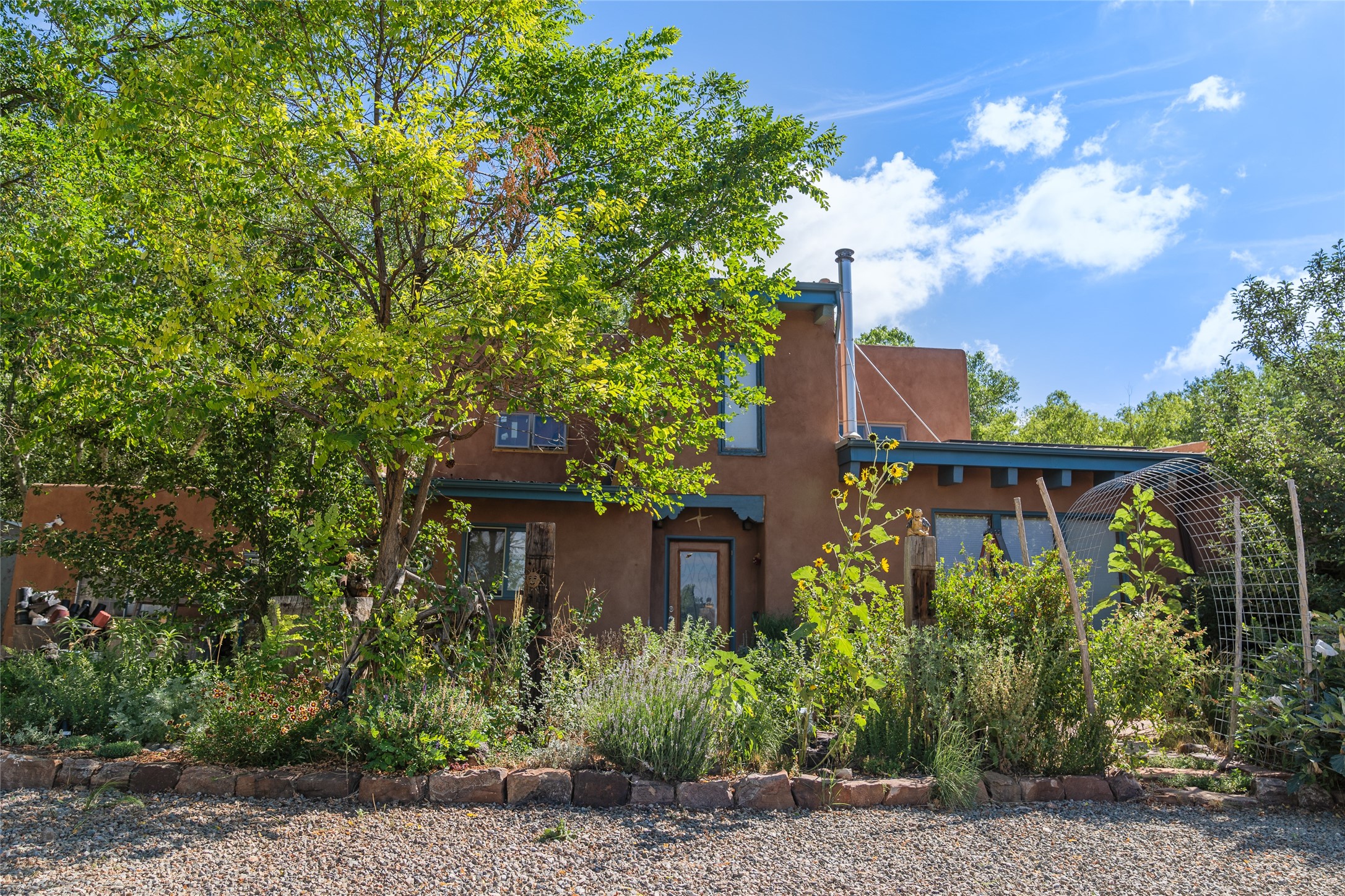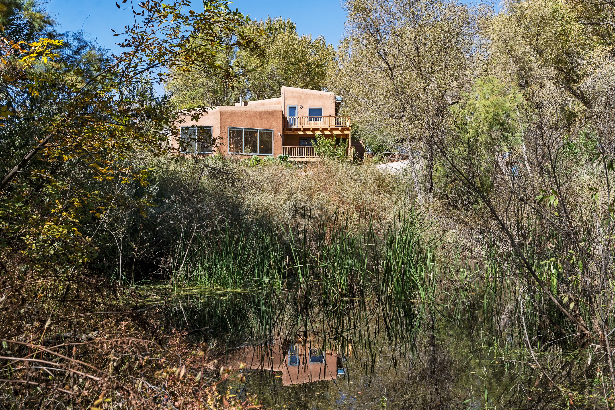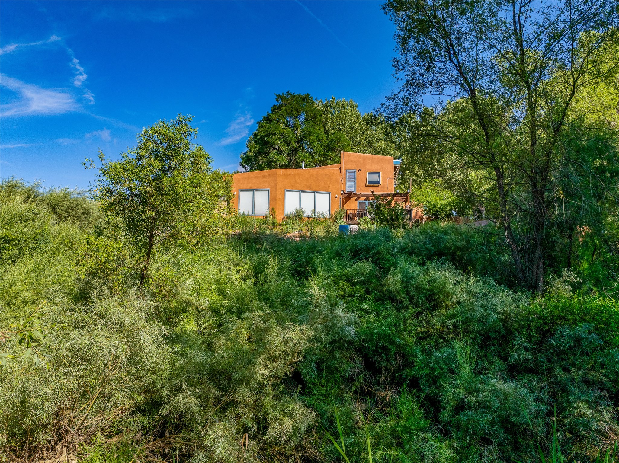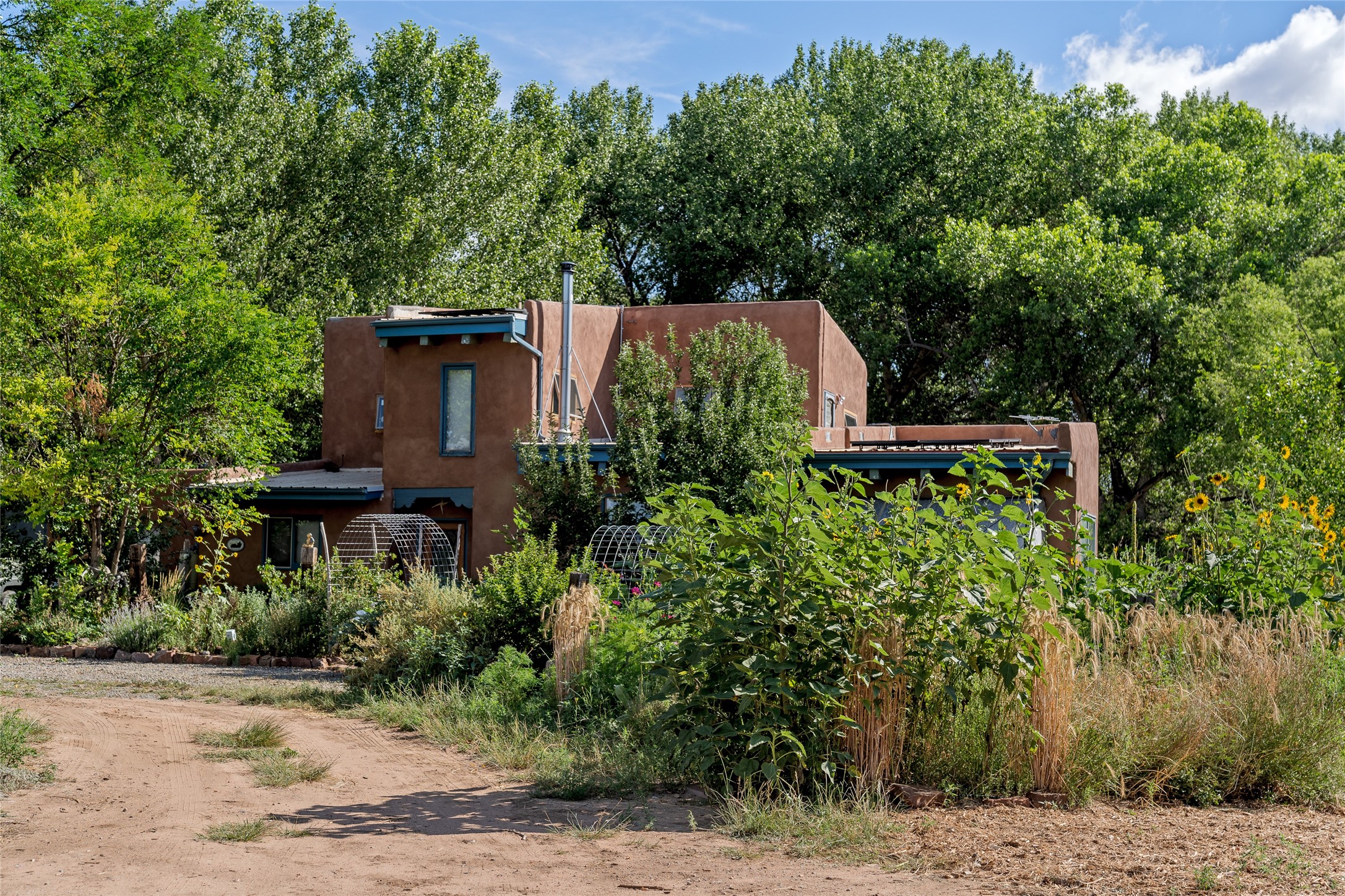 High desert permaculture oasis! 3-bedroom, 2-bath, 3066 square foot home, with large bonus room with it's own entry that could serve as studio, office, or another bedroom, nestled in towering cottonwoods on three lots totaling almost 18 acres along the lower Arroyo Hondo, with an intermittent spring and a year-round pond. This working permaculture farm produces nursery stock and landscaping plants, as well as generous amounts of food for family and friends, with a chicken coop, two 360 sq. ft. hoop houses and roughly 8/10ths of an acre in cultivation, including gardens and fruit trees. Set up for energy efficiency, with owned solar panels, a greenhouse attached to the house for ample solar gain, rainwater catchment, the house provides year round comfort. Inside, the main living area features high beamed ceilings and plaster walls, a cozy high-efficiency wood stove, and Saltillo tile. The kitchen features stainless steel appliances, the bathrooms have been recently updated, and the primary suite opens to a second story deck to take it all in. Sellers have done substantial recent work to decks, stucco, windows and roof. All of this less than three miles from city limits and a quarter mile from Ojo Santa Fe.