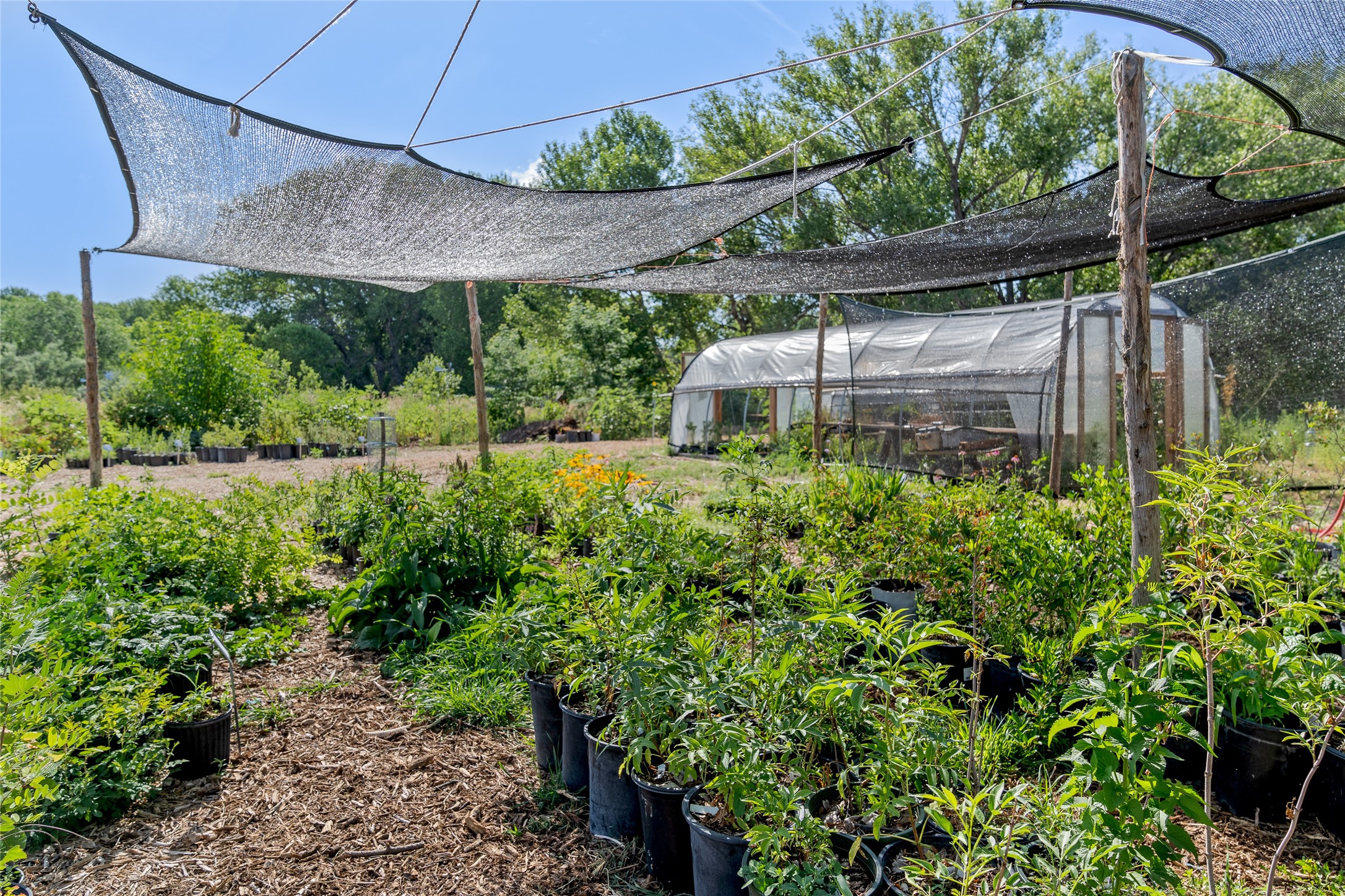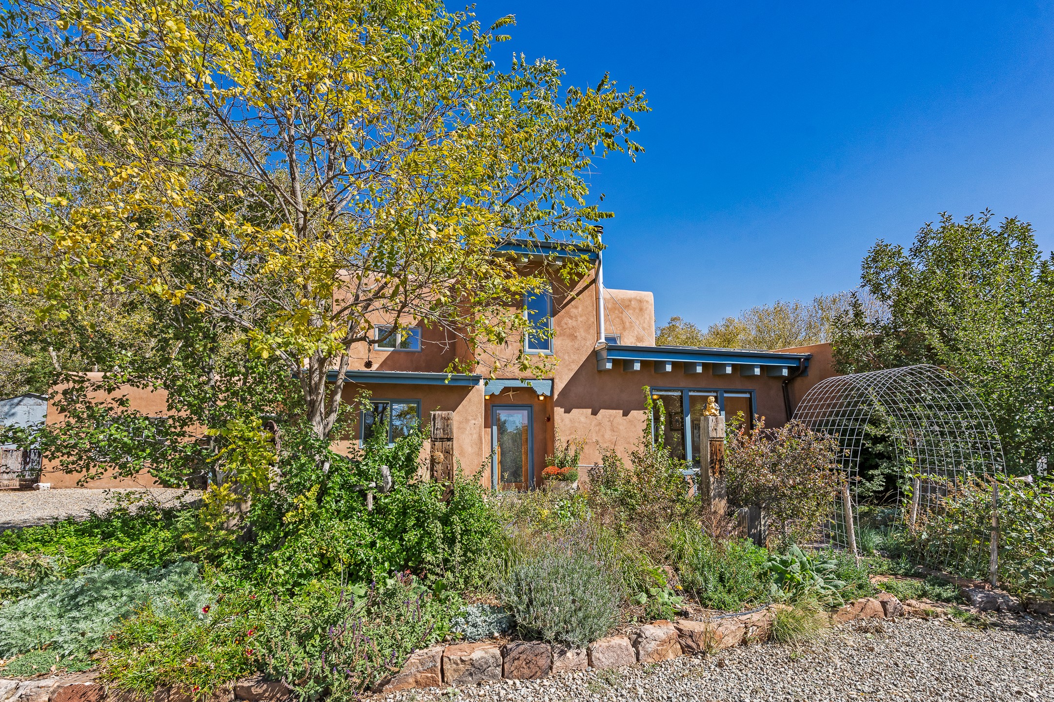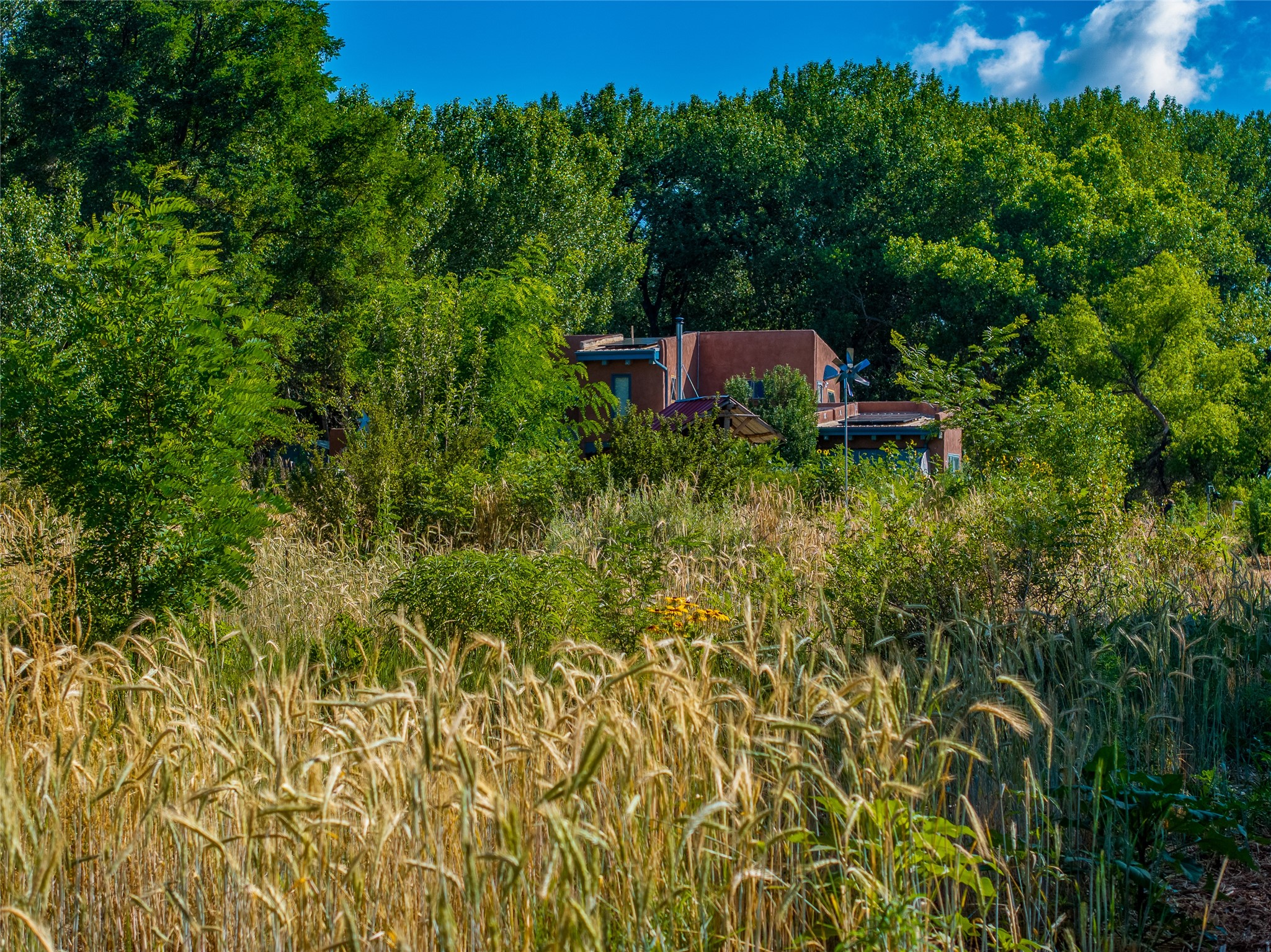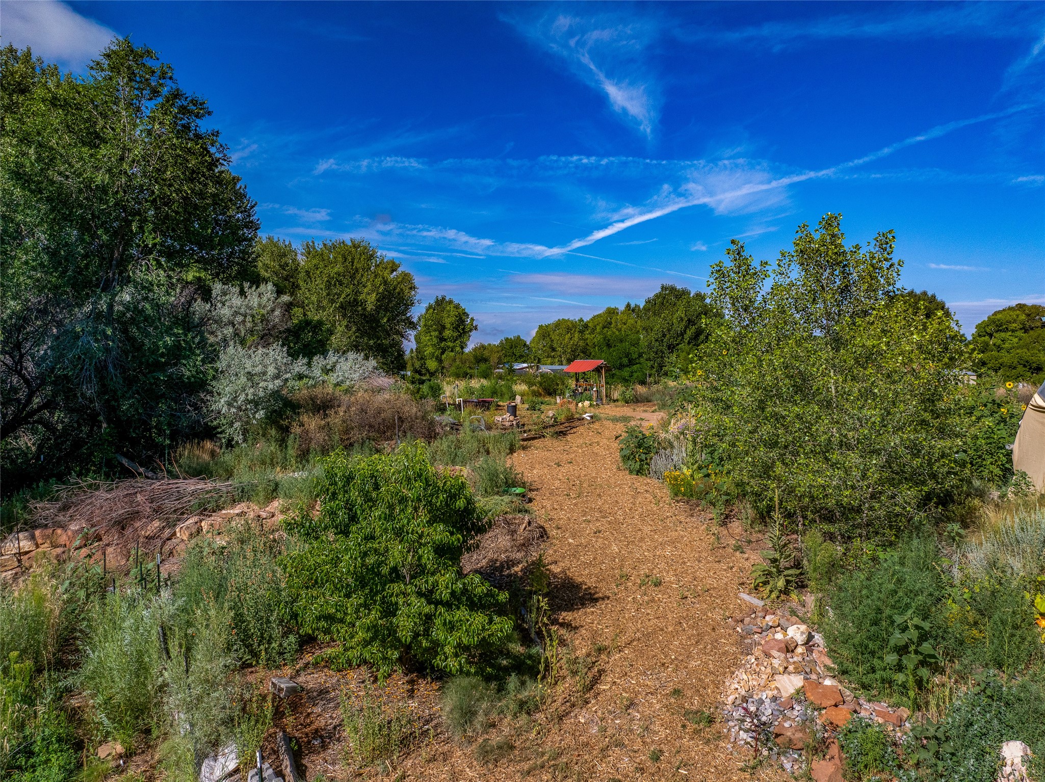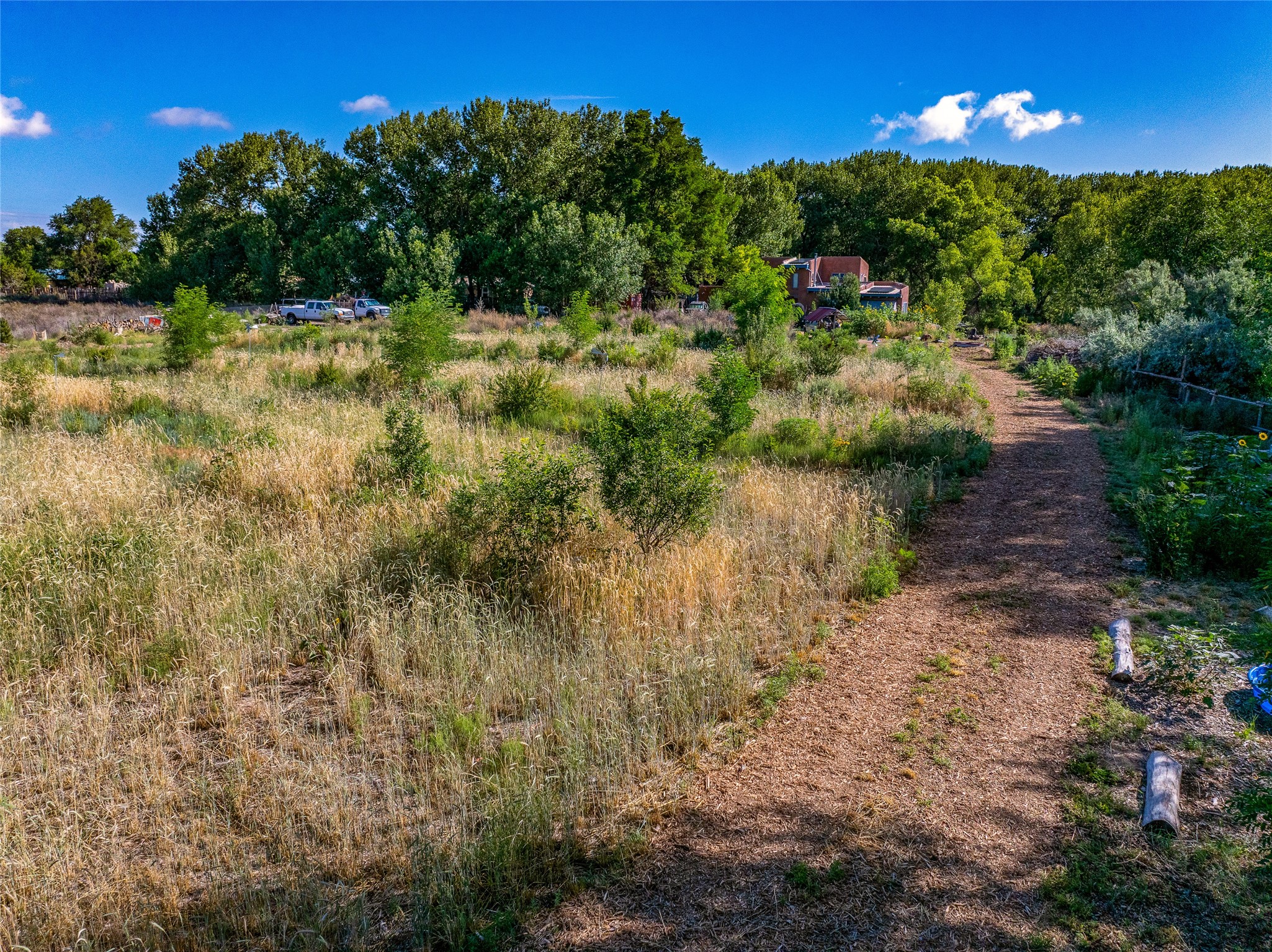 High desert permaculture oasis! 3-bedroom, 2-bath, 3066 square foot home, with large bonus room with it's own entry that could serve as studio, office, or another bedroom, nestled in towering cottonwoods on three lots totaling almost 18 acres along the lower Arroyo Hondo, with an intermittent spring and a year-round pond. This working permaculture farm produces nursery stock and landscaping plants, as well as generous amounts of food for family and friends, with a chicken coop, two 360 sq. ft. hoop houses and roughly 8/10ths of an acre in cultivation, including gardens and fruit trees. Set up for energy efficiency, with owned solar panels, a greenhouse attached to the house for ample solar gain, rainwater catchment, the house provides year round comfort. Inside, the main living area features high beamed ceilings and plaster walls, a cozy high-efficiency wood stove, and Saltillo tile. The kitchen features stainless steel appliances, the bathrooms have been recently updated, and the primary suite opens to a second story deck to take it all in. Sellers have done substantial recent work to decks, stucco, windows and roof. All of this less than three miles from city limits and a quarter mile from Ojo Santa Fe.