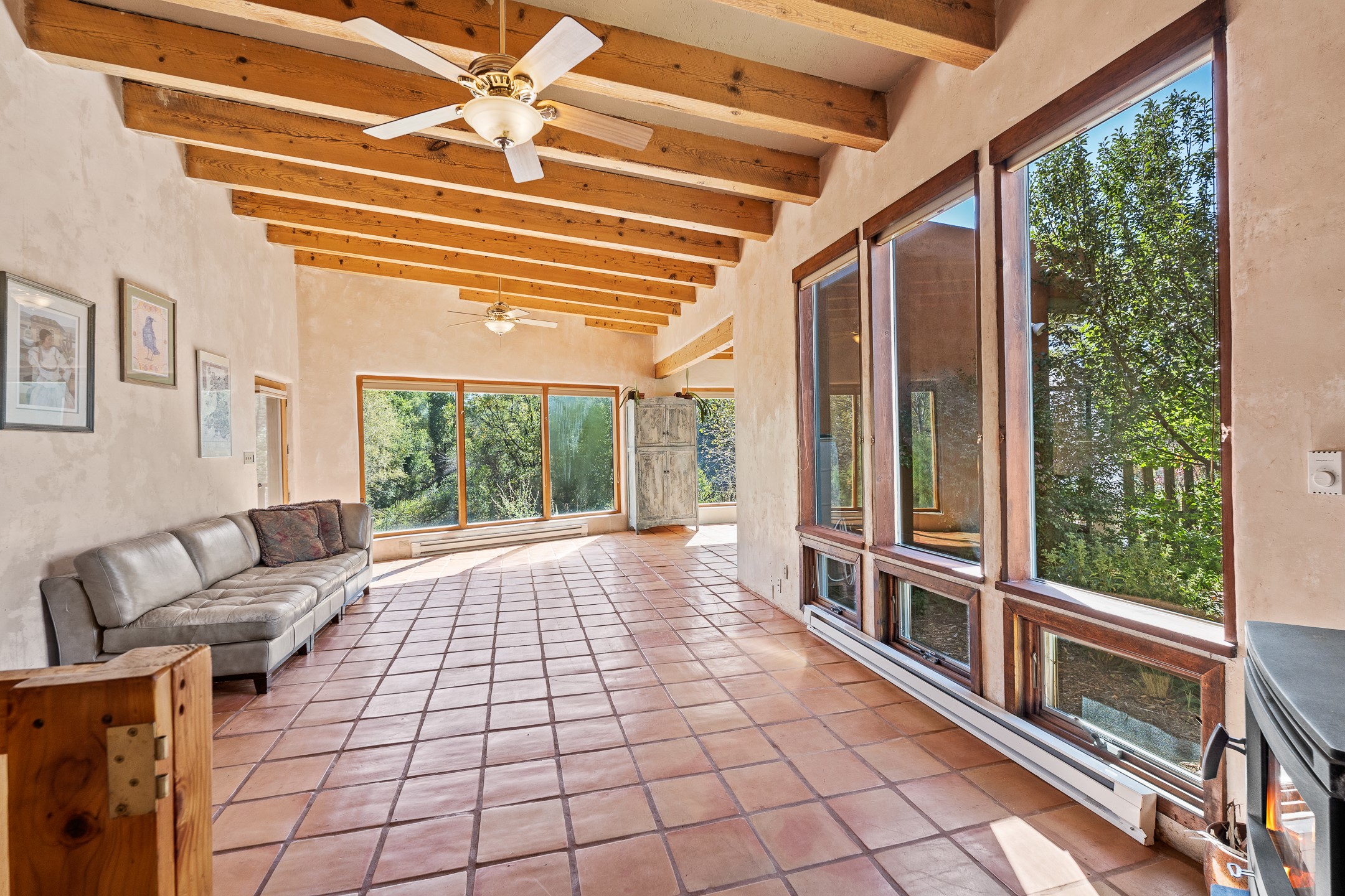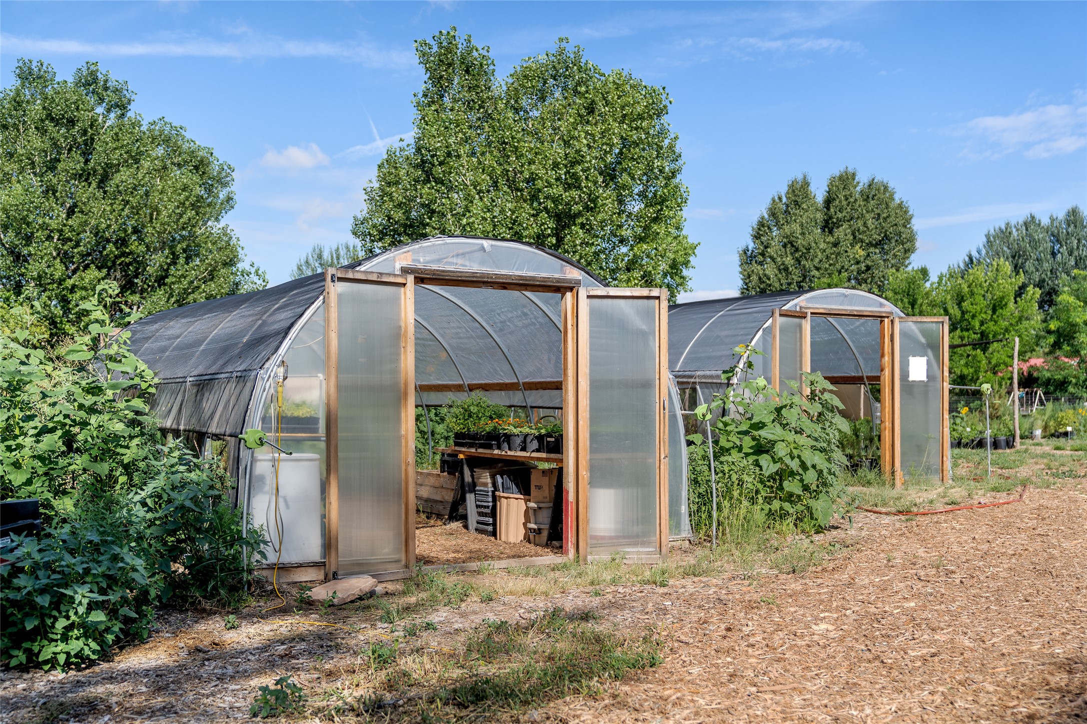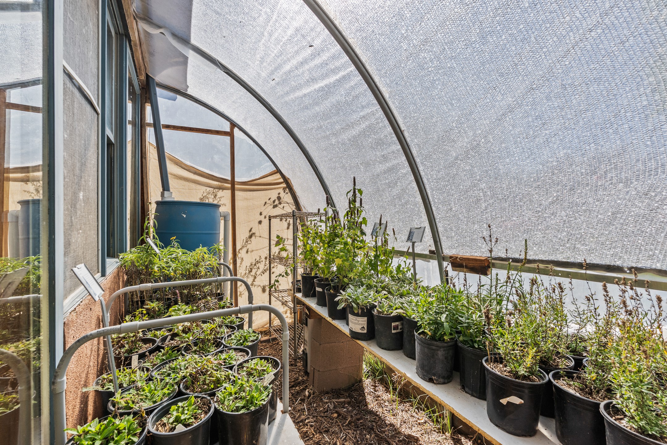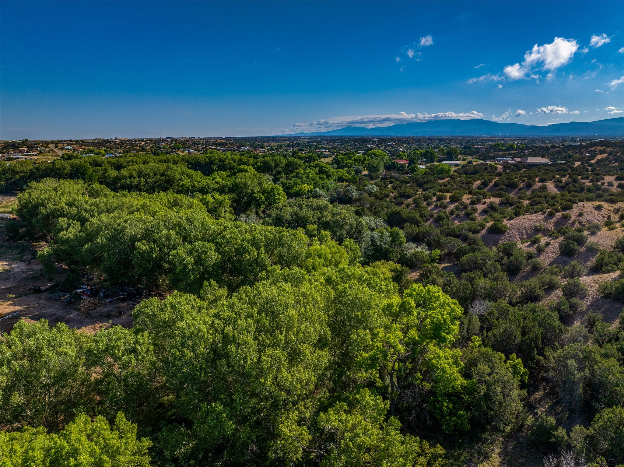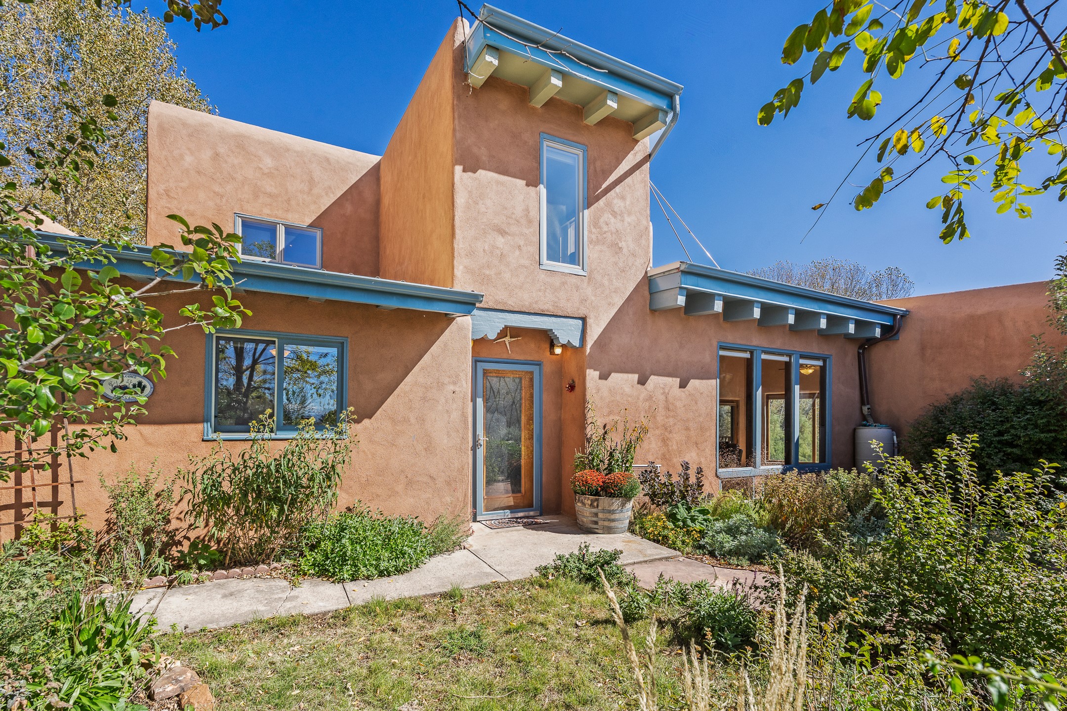 High desert permaculture oasis! 3-bedroom, 2-bath, 3066 square foot home, with large bonus room with it's own entry that could serve as studio, office, or another bedroom, nestled in towering cottonwoods on three lots totaling almost 18 acres along the lower Arroyo Hondo, with an intermittent spring and a year-round pond. This working permaculture farm produces nursery stock and landscaping plants, as well as generous amounts of food for family and friends, with a chicken coop, two 360 sq. ft. hoop houses and roughly 8/10ths of an acre in cultivation, including gardens and fruit trees. Set up for energy efficiency, with owned solar panels, a greenhouse attached to the house for ample solar gain, rainwater catchment, the house provides year round comfort. Inside, the main living area features high beamed ceilings and plaster walls, a cozy high-efficiency wood stove, and Saltillo tile. The kitchen features stainless steel appliances, the bathrooms have been recently updated, and the primary suite opens to a second story deck to take it all in. Sellers have done substantial recent work to decks, stucco, windows and roof. All of this less than three miles from city limits and a quarter mile from Ojo Santa Fe.