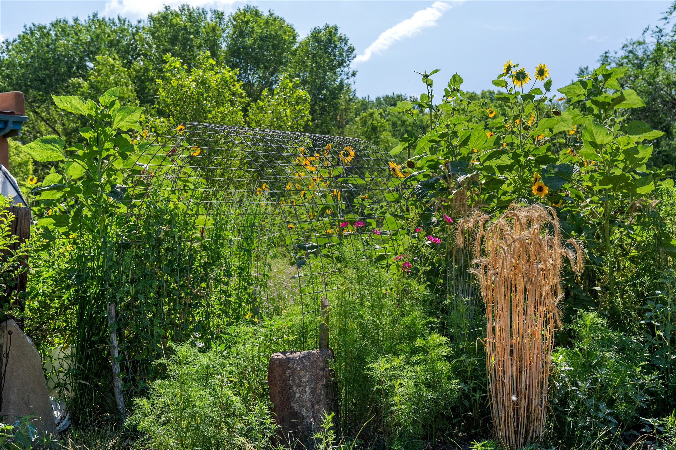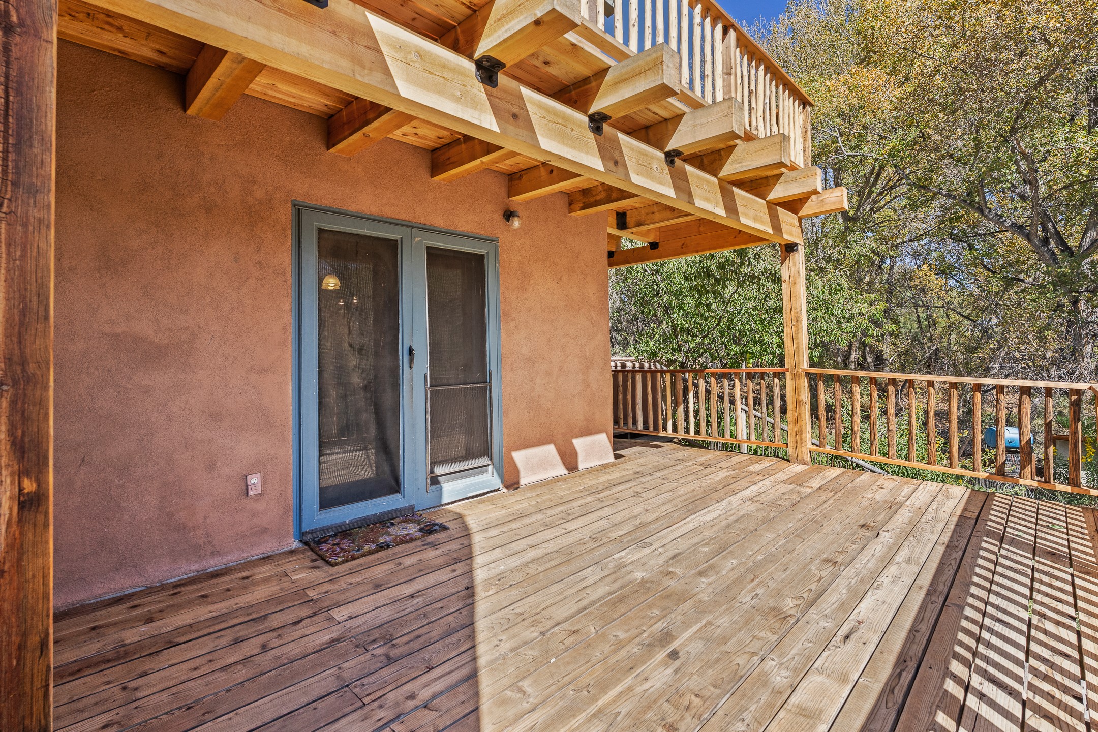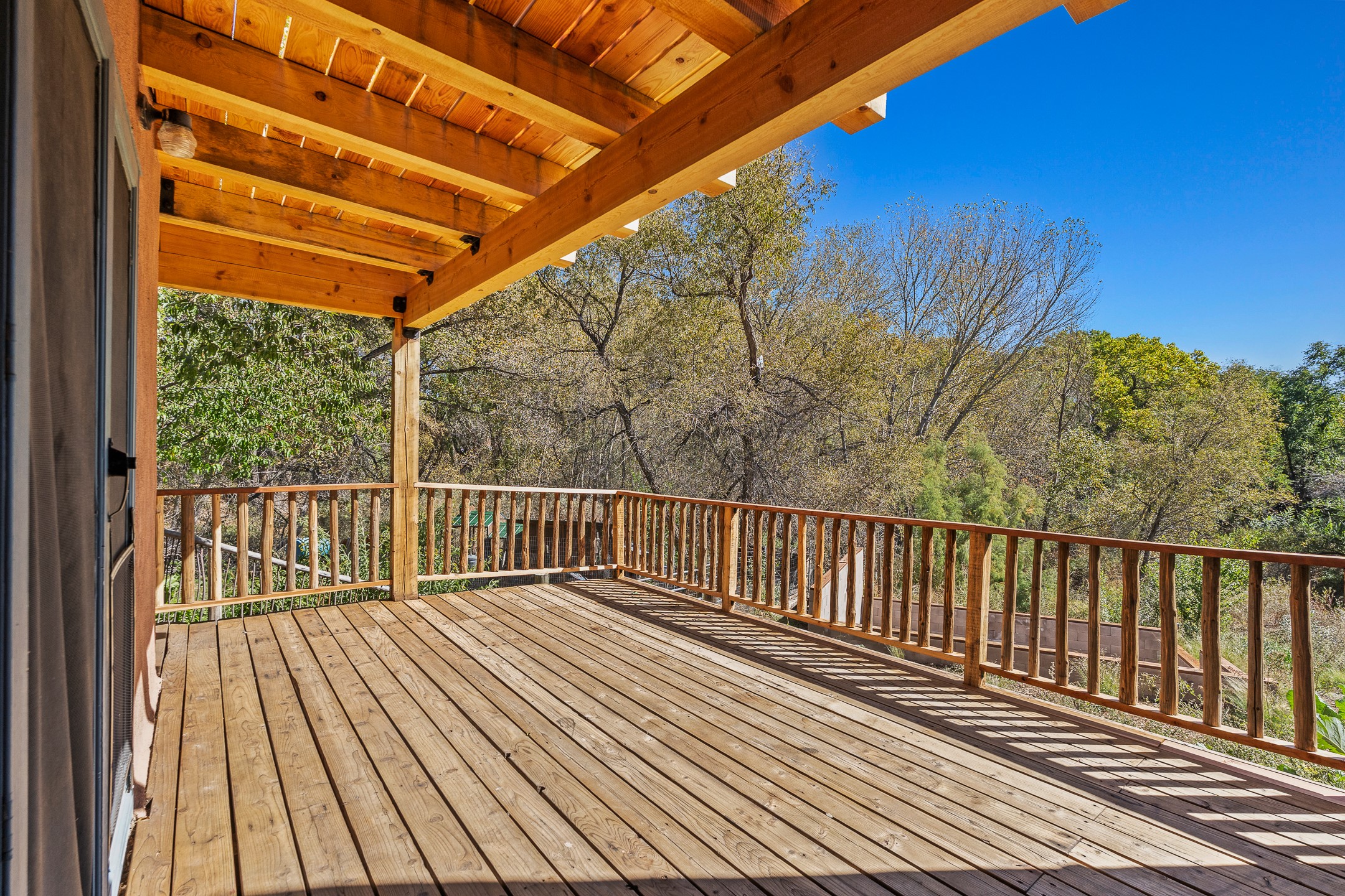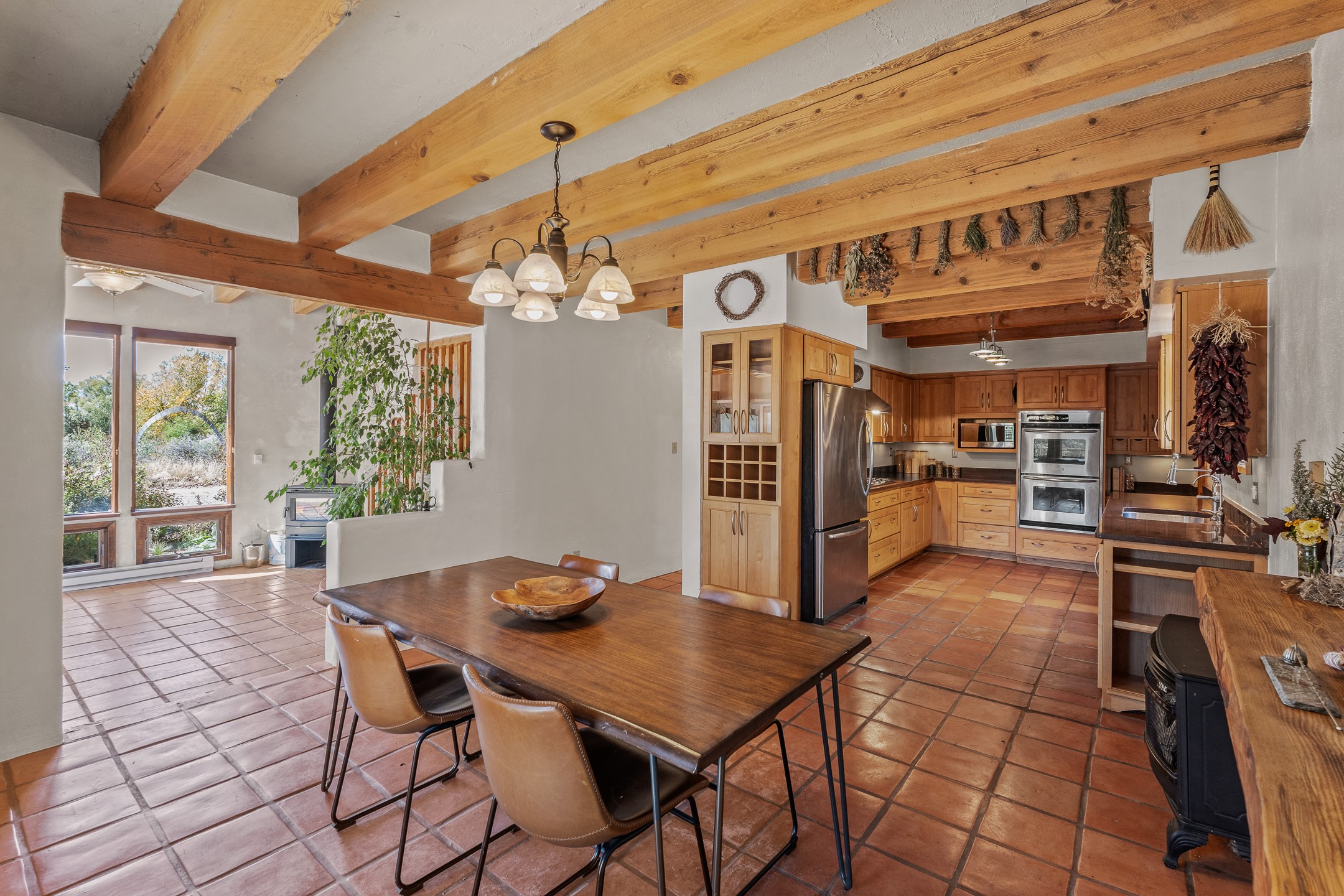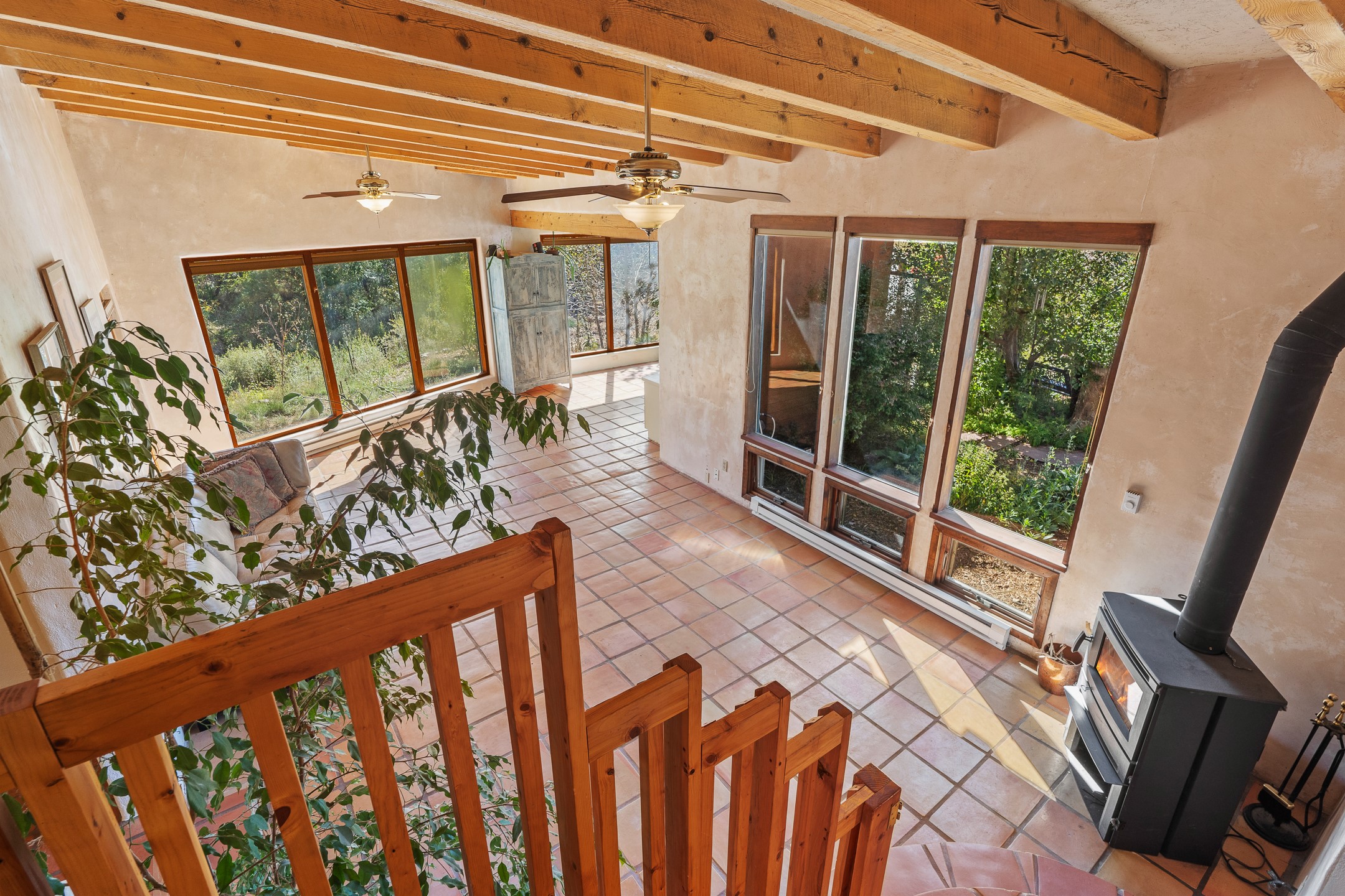 High desert permaculture oasis! 3-bedroom, 2-bath, 3066 square foot home, with large bonus room with it's own entry that could serve as studio, office, or another bedroom, nestled in towering cottonwoods on three lots totaling almost 18 acres along the lower Arroyo Hondo, with an intermittent spring and a year-round pond. This working permaculture farm produces nursery stock and landscaping plants, as well as generous amounts of food for family and friends, with a chicken coop, two 360 sq. ft. hoop houses and roughly 8/10ths of an acre in cultivation, including gardens and fruit trees. Set up for energy efficiency, with owned solar panels, a greenhouse attached to the house for ample solar gain, rainwater catchment, the house provides year round comfort. Inside, the main living area features high beamed ceilings and plaster walls, a cozy high-efficiency wood stove, and Saltillo tile. The kitchen features stainless steel appliances, the bathrooms have been recently updated, and the primary suite opens to a second story deck to take it all in. Sellers have done substantial recent work to decks, stucco, windows and roof. All of this less than three miles from city limits and a quarter mile from Ojo Santa Fe.