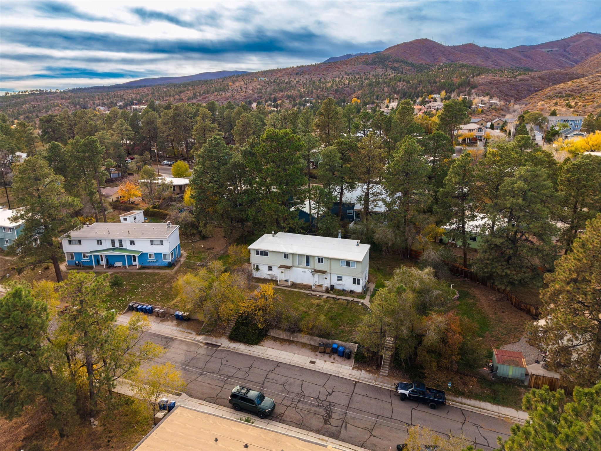 Charming North Community Condo with Expansive Yard & GreenhouseSet on a spacious corner lot in the quiet North Community neighborhood, this two-story condo offers privacy, character, and exceptional outdoor space--just 5 minutes from Los Alamos National Lab (LANL).Upstairs, you'll find three generously sized bedrooms with hardwood floors and large windows that fill the space with natural light. Two bedrooms are connected by a convenient walk-through closet, and the full bath features a clean, classic design with a pedestal sink and tub/shower combo.The main level offers a bright galley kitchen with white cabinetry, chrome hardware, and all appliances--including washer and dryer. The adjacent dining area opens to an enclosed back porch with a storage closet, while the large living room features original hardwood floors, track lighting, and access to a unique greenhouse with built-in workbench.Outdoors, the home offers a mix of privacy and open space with established landscaping, a treehouse platform, a covered patio, and a fully fenced backyard--perfect for gardening, entertaining, or simply relaxing.Located steps from Urban Park and close to hiking trails, excellent schools, and the amenities of downtown Los Alamos. Schedule your showing today!