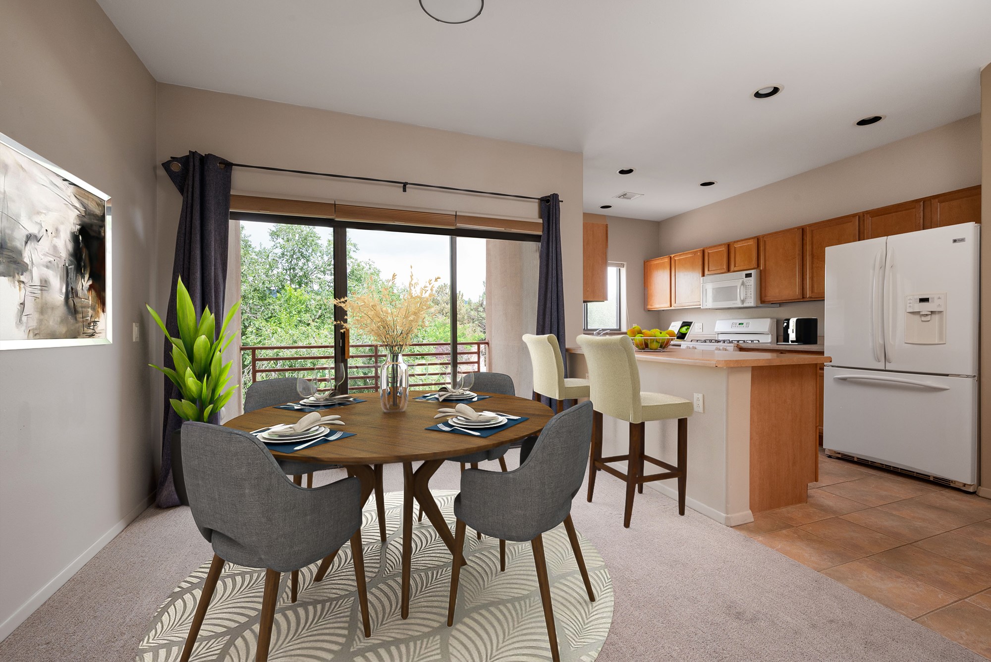 $10,000 CREDIT TO BUYER to use towards rate buy-down, assessments or closing costs. Live among the trees in this soft contemporary condo in the heart of Santa Fe. Perched on the top floor, this light-filled unit features east- and west-facing balconies and mountain views from the kitchen. The floor plan offers well-defined spaces for living, dining, and working, along with two generously sized bedrooms with soft, leafy trees at the windows. The secure building includes a street-level security door, a covered direct-entry carport with designated parking, and a large private storage unit. While the condo is on the third floor, a convenient dumbwaiter makes grocery trips easier. Come visit this serene abode and make yourself at home.