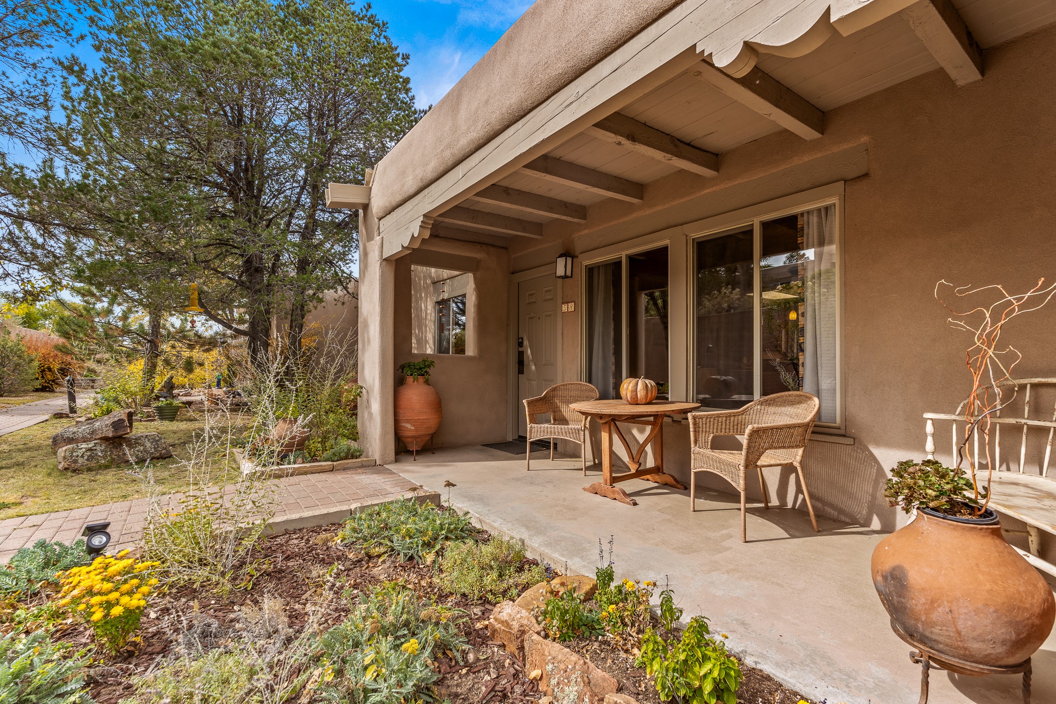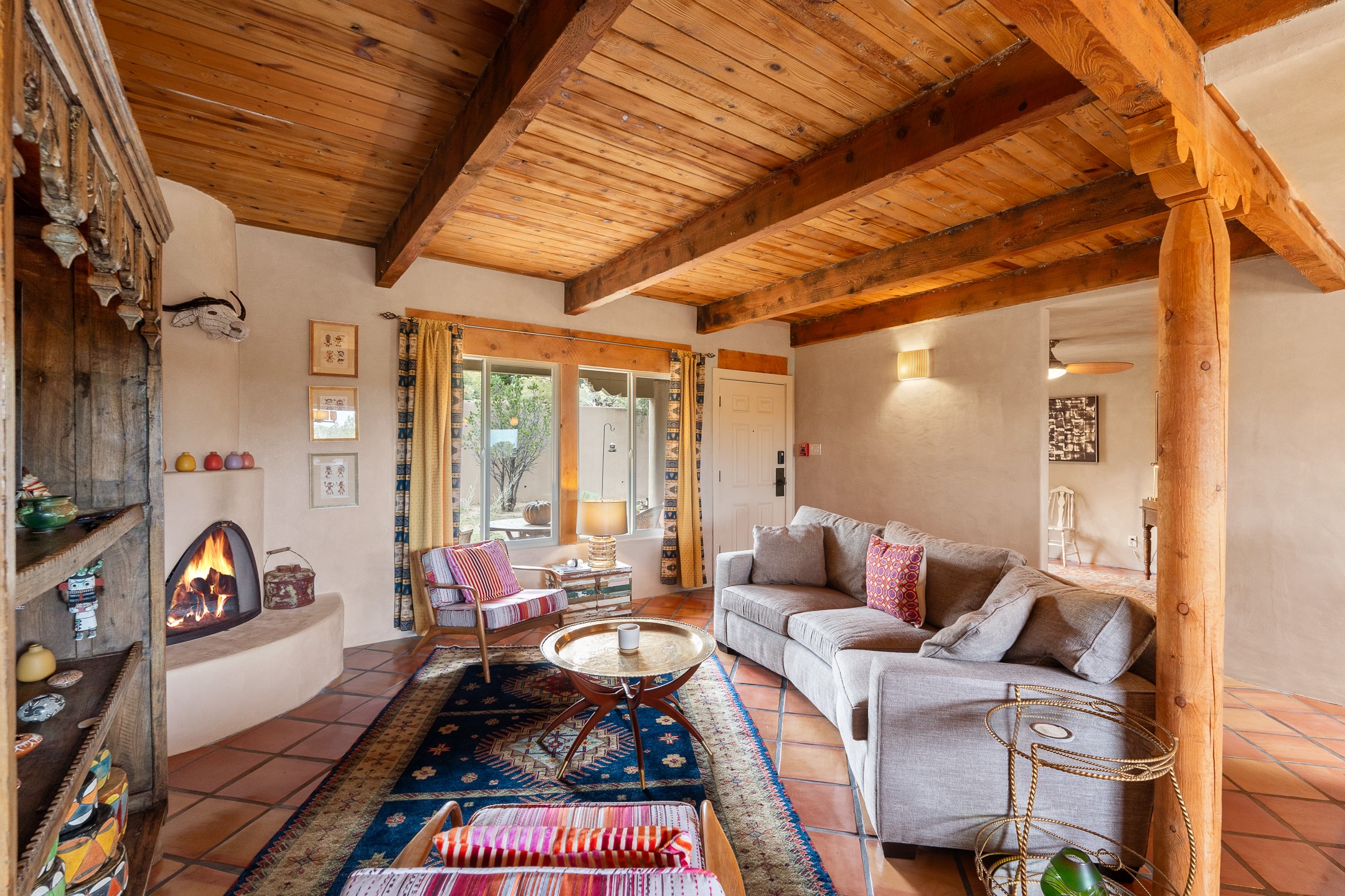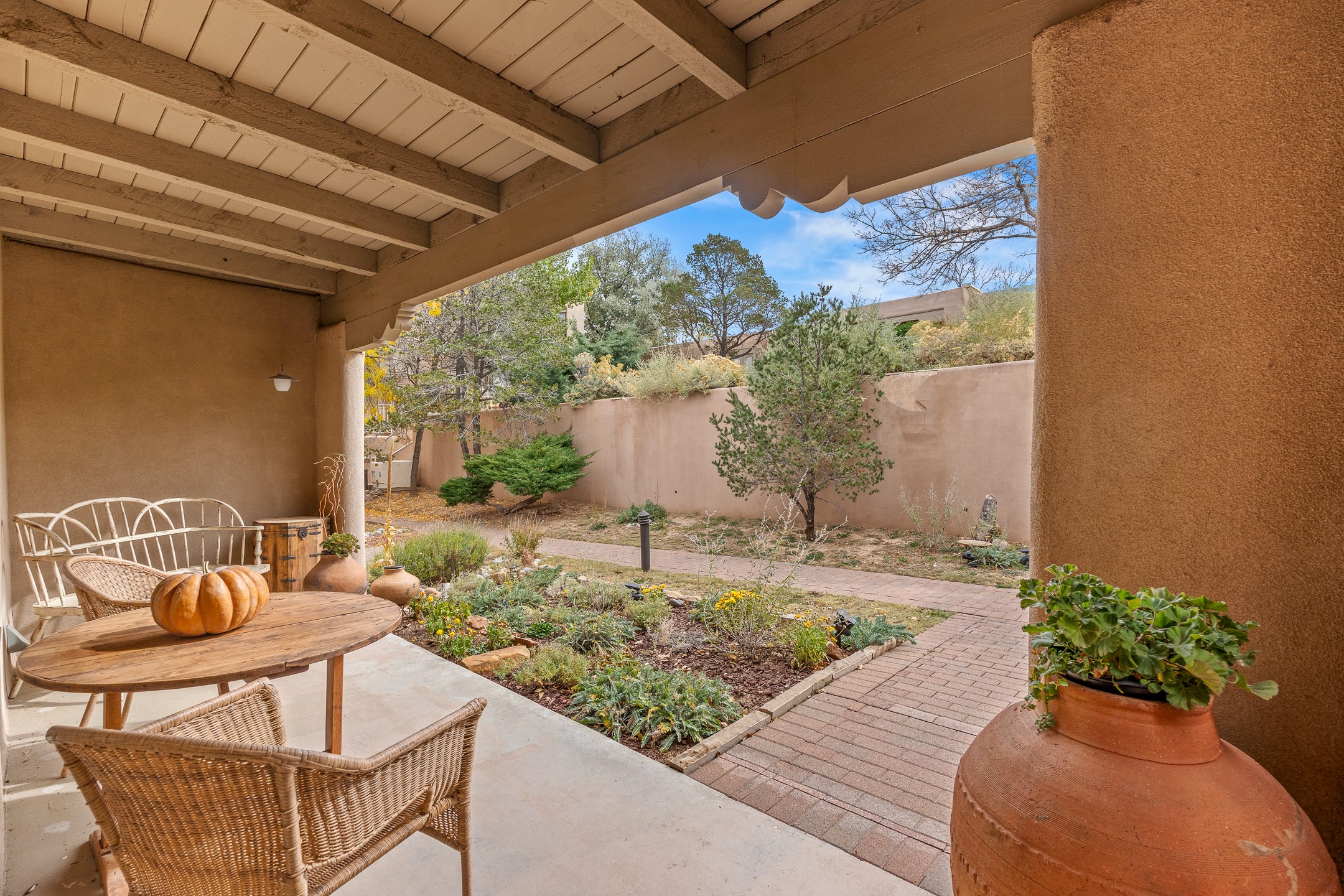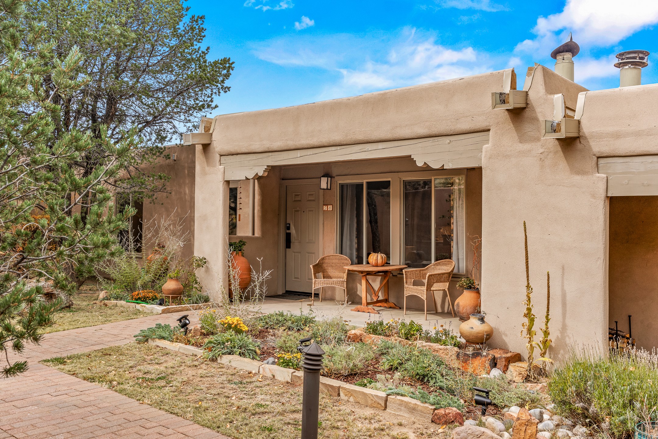 This charming 2 bedroom, 2 bathroom single-level condominium is ideally located just 6 blocks from the vibrant heart of downtown Santa Fe and only 1 block from the scenic road to Ski Santa Fe, with access to numerous hiking and biking trails. Nestled within the coveted Fort Marcy Compound, this beautifully updated home offers a quiet setting with minimal passersby. The HOA does not place restrictions on rentals, making this a perfect candidate for a short-term rental property, a vacation home for when you want to visit Santa Fe, or a full-time residence as it has been for the current owners! The spacious interior features Saltillo tiles laid on an angle, American Clay walls, and exposed natural beams. Enjoy cozy evenings by the Kiva fireplace and the convenience of an office space that opens into the living area for better flow. The modern kitchen boasts a new induction stove, a low-profile fridge, custom cabinetry with a bar, and full pantry storage. With two windows showcasing stunning sunset views and a beautifully landscaped garden area, this condo is the perfect blend of comfort and style. Don't miss your chance to experience the best of Santa Fe living! The on-site management company operates a vountary STR propram. Ask listing broker for details. Amenities include an indoor swimming pool and hot tub, a popular attraction for vacationers in the summer and winter months! Call for your showing today, before it's gone!