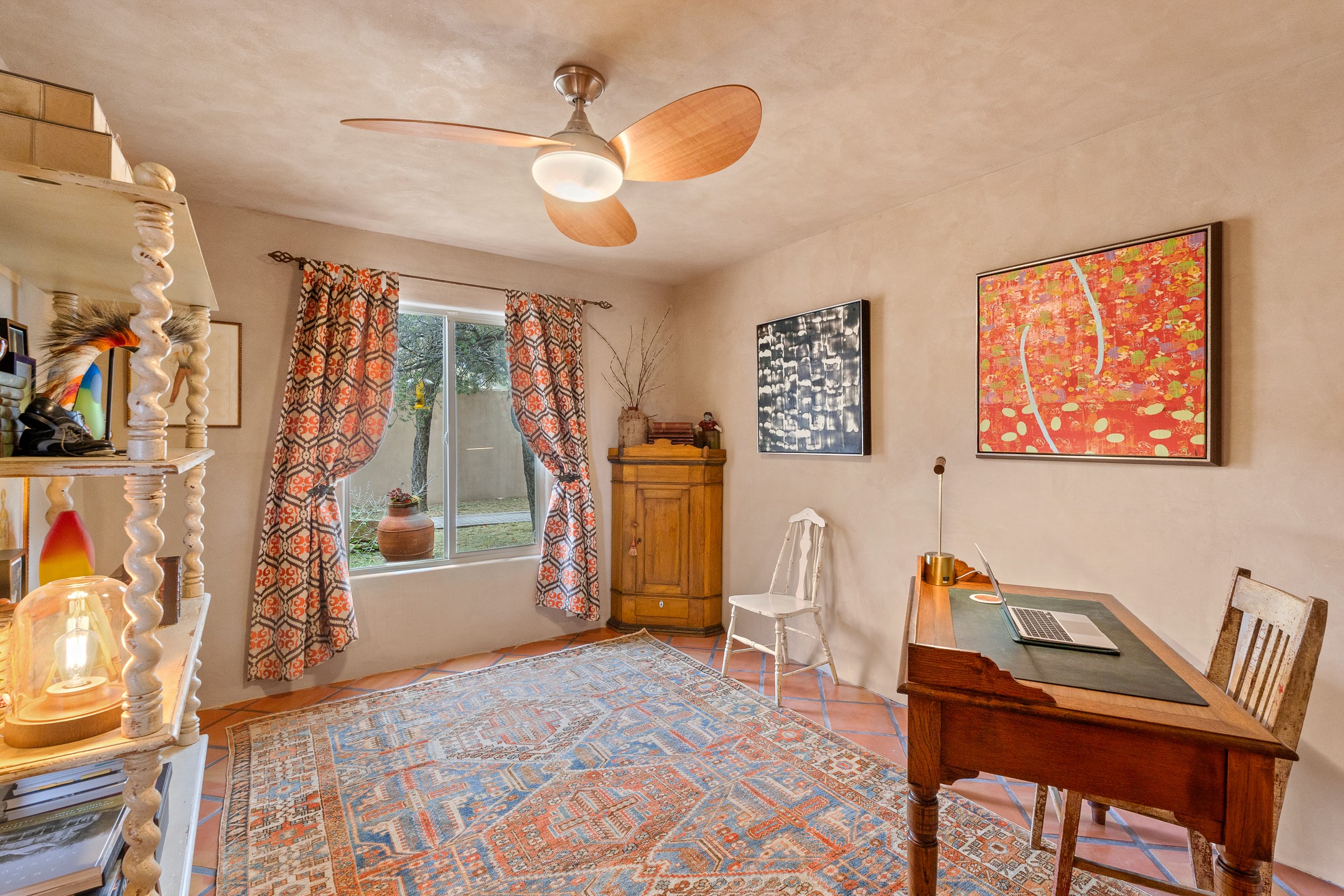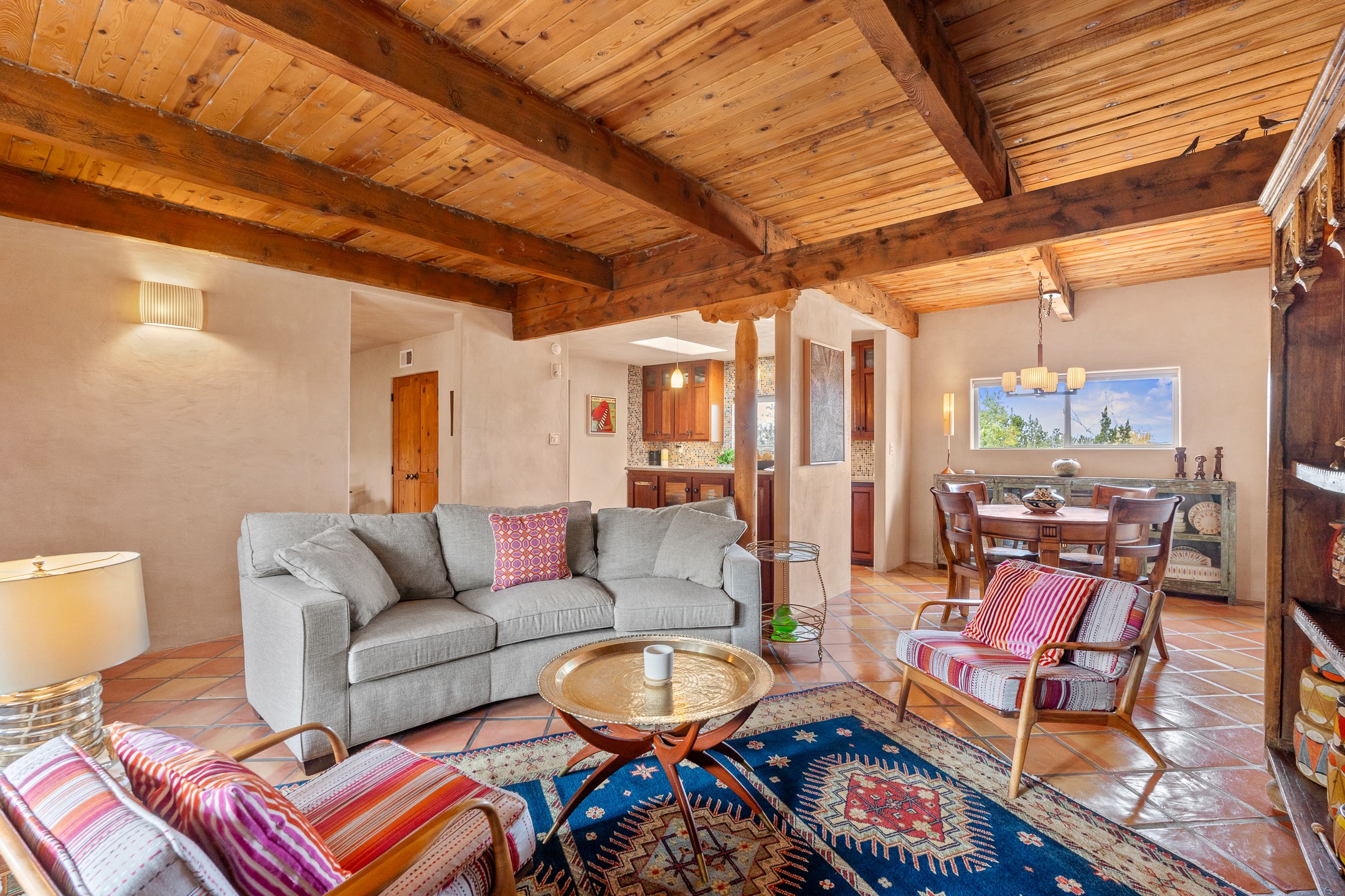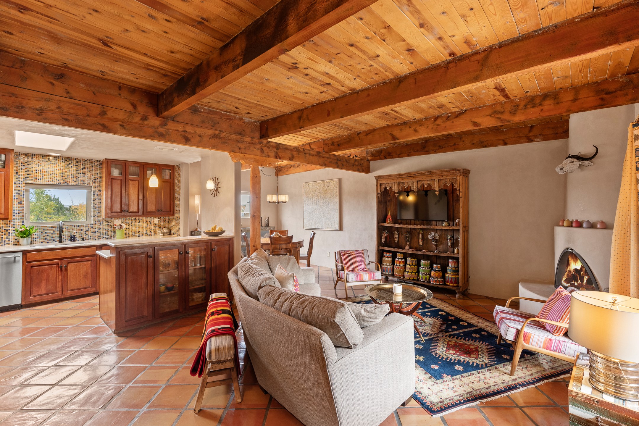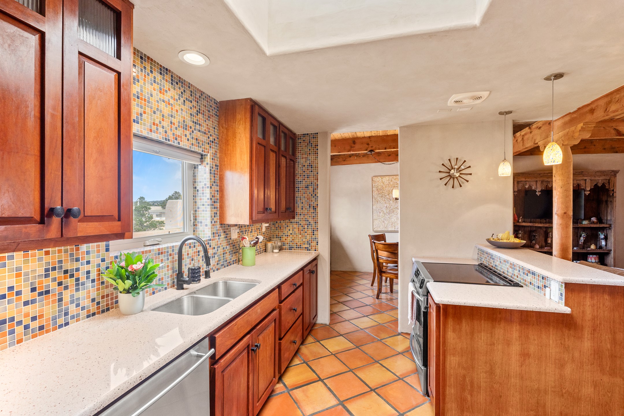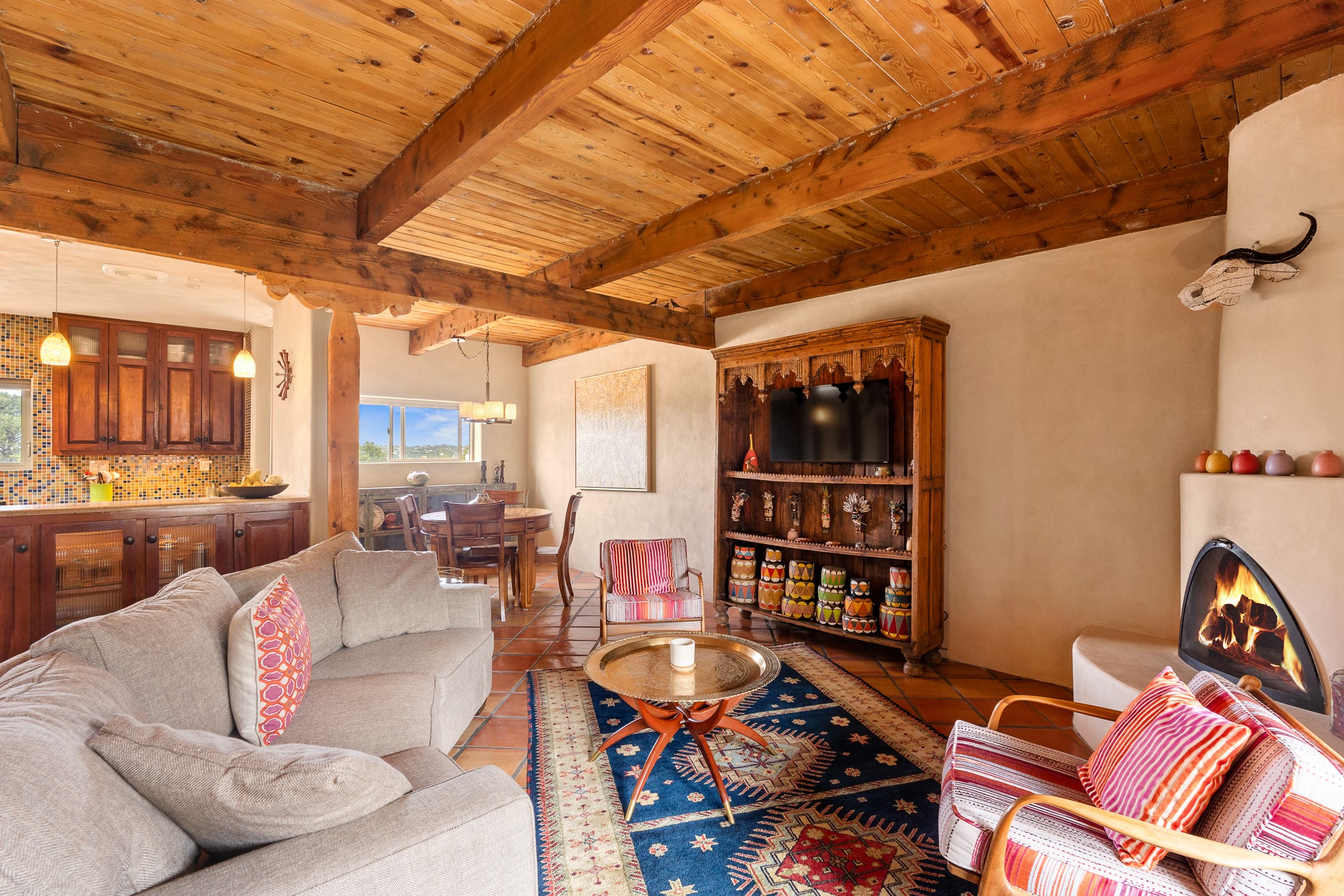 This charming 2 bedroom, 2 bathroom single-level condominium is ideally located just 6 blocks from the vibrant heart of downtown Santa Fe and only 1 block from the scenic road to Ski Santa Fe, with access to numerous hiking and biking trails. Nestled within the coveted Fort Marcy Compound, this beautifully updated home offers a quiet setting with minimal passersby. The HOA does not place restrictions on rentals, making this a perfect candidate for a short-term rental property, a vacation home for when you want to visit Santa Fe, or a full-time residence as it has been for the current owners! The spacious interior features Saltillo tiles laid on an angle, American Clay walls, and exposed natural beams. Enjoy cozy evenings by the Kiva fireplace and the convenience of an office space that opens into the living area for better flow. The modern kitchen boasts a new induction stove, a low-profile fridge, custom cabinetry with a bar, and full pantry storage. With two windows showcasing stunning sunset views and a beautifully landscaped garden area, this condo is the perfect blend of comfort and style. Don't miss your chance to experience the best of Santa Fe living! The on-site management company operates a vountary STR propram. Ask listing broker for details. Amenities include an indoor swimming pool and hot tub, a popular attraction for vacationers in the summer and winter months! Call for your showing today, before it's gone!