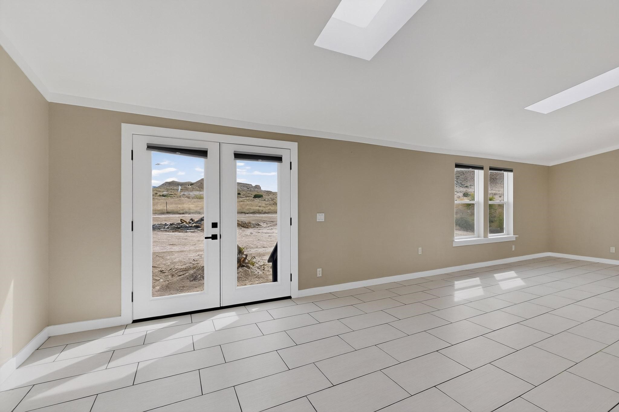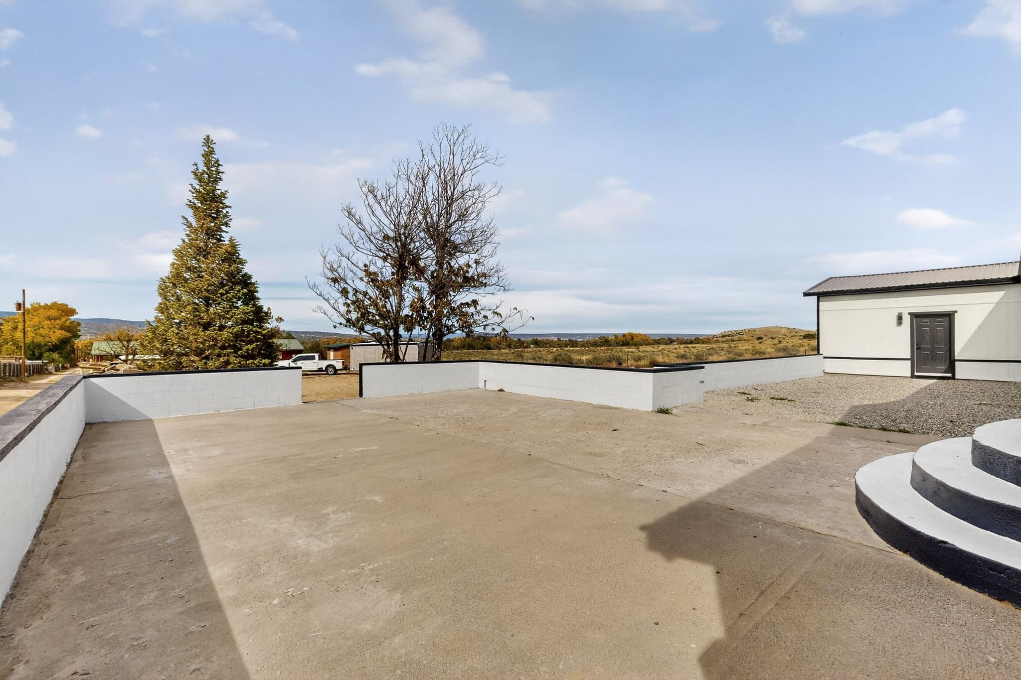 This beautifully remodeled 3-bedroom, 2 bath home offers modern comfort in a peaceful rural setting with spectacular views of the Jemez Mnts. Revel in the natural light that comes in through the 3 skylights. Enjoy a bonus room perfect for a home office or hobby space. Recent upgrades include new windows, new blinds, new roof, new tile flooring with plush carpet in the bedrooms, new lighting, and a new furnace and refrigerated air unit and new hot water heater. The kitchen has been thoughtfully redesigned with custom cabinetry, granite countertops and a new stainless appliance package.Home sits on a permanent foundation, with a new septic system and well improvements completed for peace of mind. Home also has an over sized 2-car garage. Property borders BLM land, providing privacy, open space and unmatched beauty right outside your door. Move-in ready and beautifully finished!!
