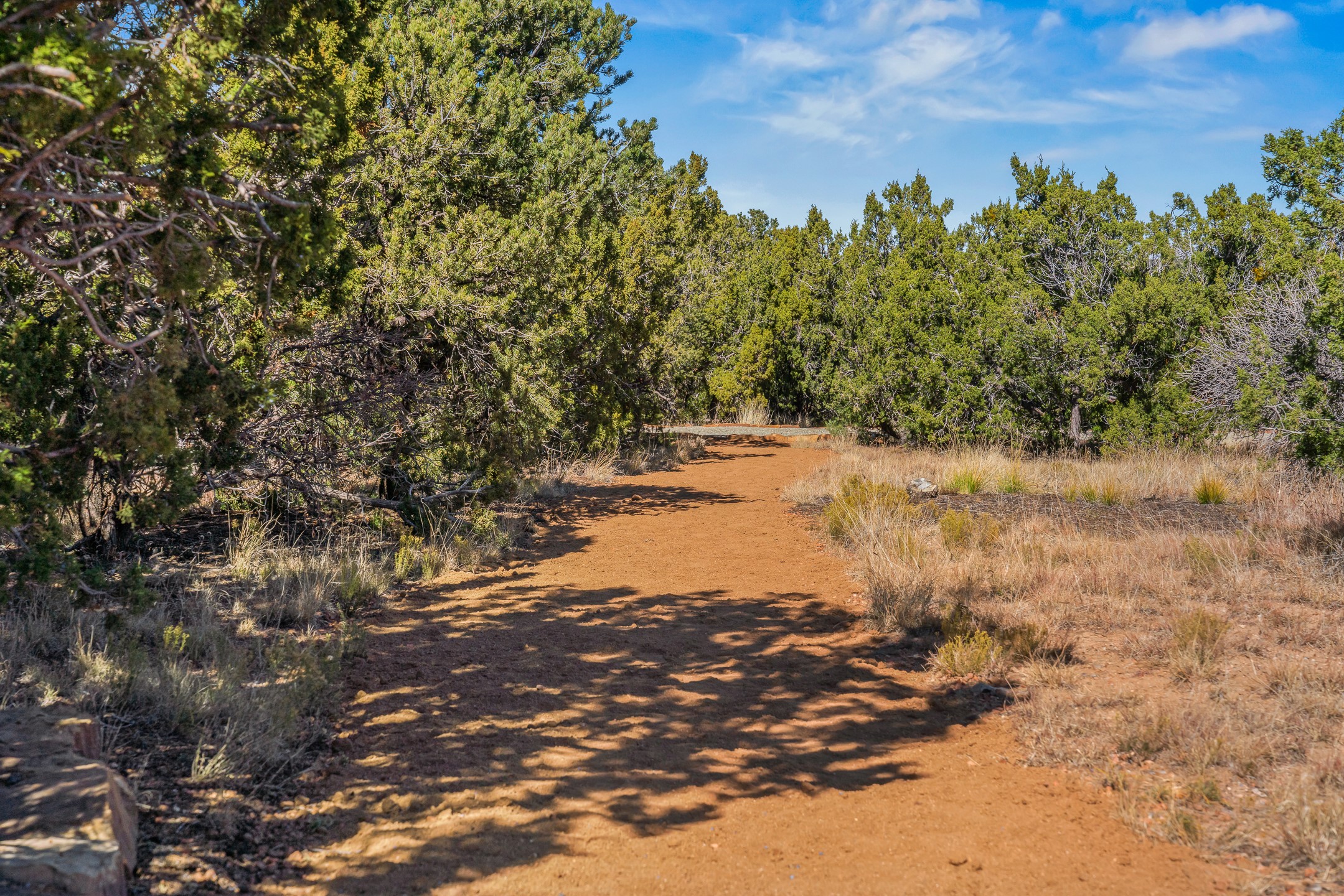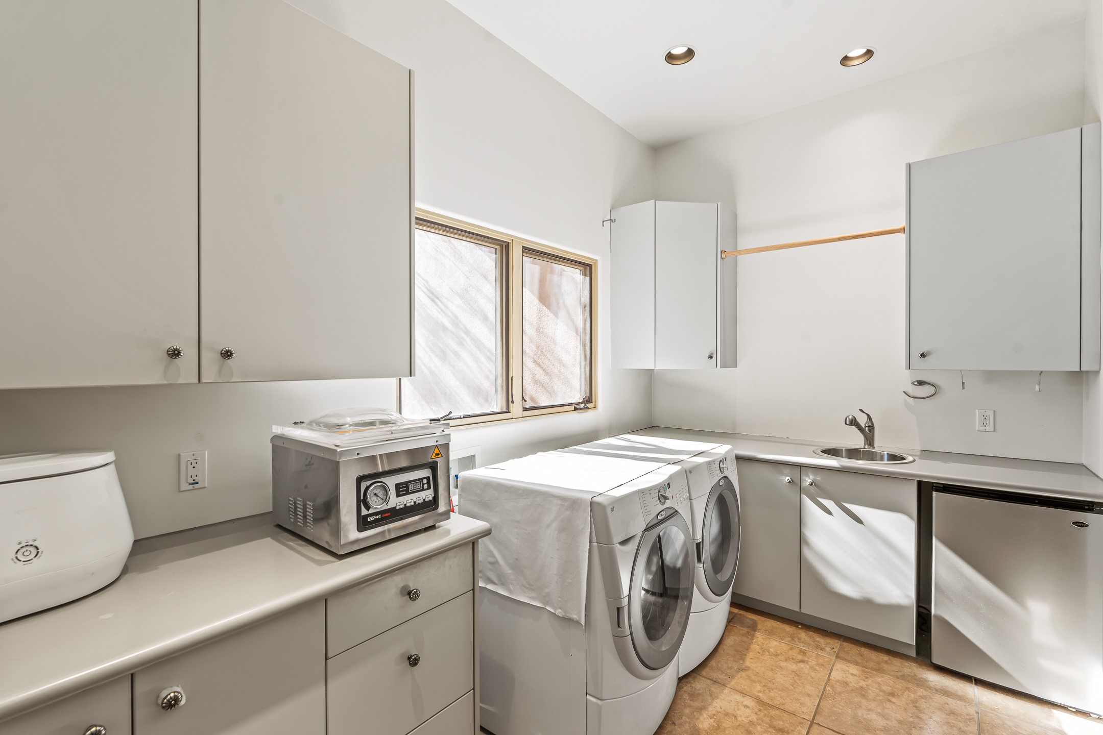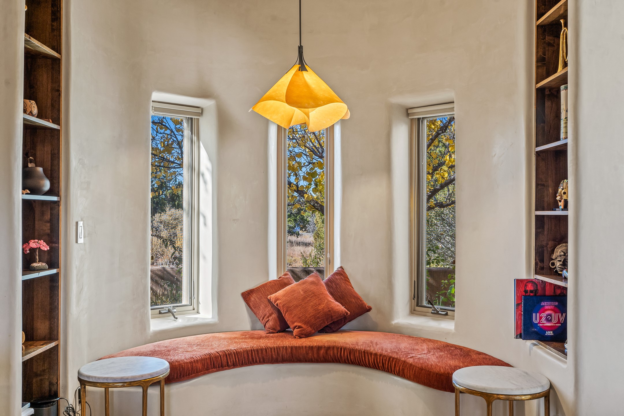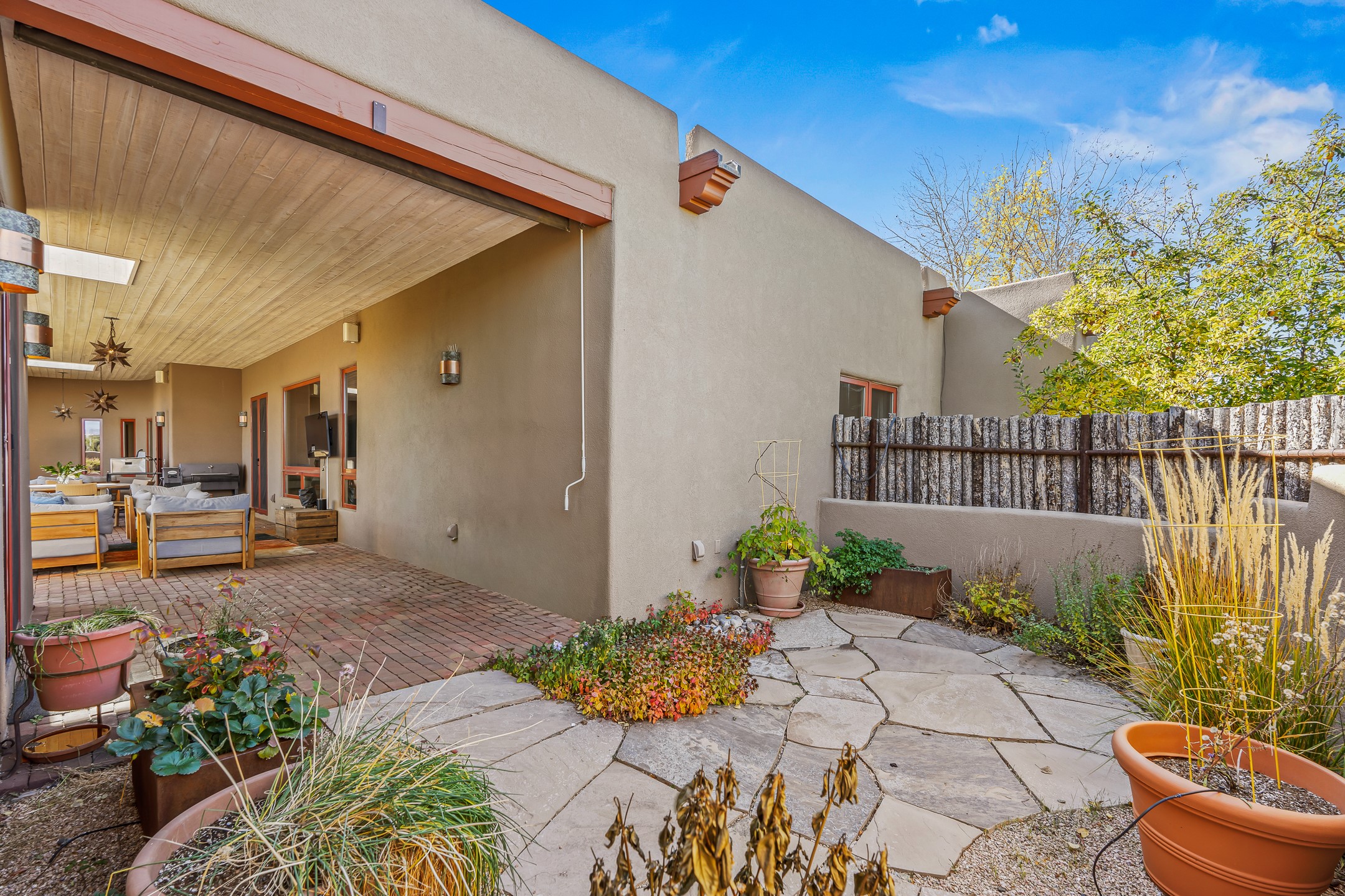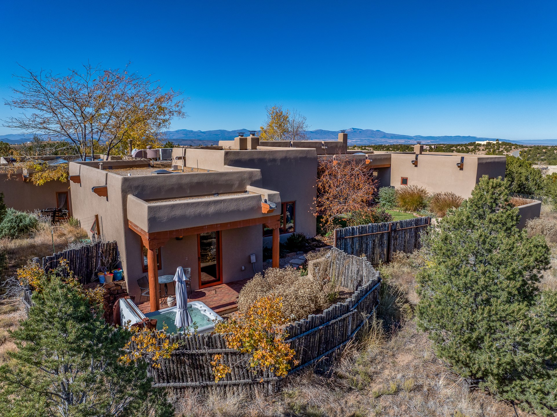 Experience true Santa Fe living in this elegant residence with a detached guesthouse, perfectly positioned in the coveted Sundance Estates to capture sweeping views of the Sangre de Cristo Mountains. Designed for seamless indoor-outdoor living, this home offers expansive portals, an inviting outdoor kiva fireplace, and exquisite landscaping that frame the essence of the Santa Fe lifestyle. Step inside to the beautifully designed open-concept formal living and dining room featuring smooth plaster walls, tall beamed ceilings, a kiva fireplace, expansive windows and double French doors that flood the interiors with natural light and boast the sweeping mountain views. The kitchen is a cook's delight--featuring high-end appliances including a Wolf cooktop and oven, a walk-in pantry, a large cherrywood island, and thoughtful finishes that blend style and function. The primary suite is both luxurious and serene, complete with a gas fireplace, spa-like bath with dual marble vanities, a soaking tub, a walk-in shower, and a grand walk-in closet. Step outside to your private patio and unwind in the hot tub beneath the stars. A pre-wired media room/theater offers the perfect setting for entertainment, while guests enjoy privacy in their own wing with an en-suite bedroom nearby and two convenient powder rooms for visitors. The detached casita provides a private retreat with its own entrance, kiva fireplace, bedroom, kitchenette, and access to the main home through the landscaped backyard. The grounds are as impressive as the interiors, with mature trees, lush lawn, a tranquil water feature, and walkways that connect every outdoor living space--from the primary suite's patio to the guesthouse. A circular driveway completes the property's sense of arrival and sophistication, along with solar and a heated three-car garage, where the third bay currently functions as a gym. 58 Sundance Drive is a home where elegance, comfort, and the natural beauty of Santa Fe come together in harmony.