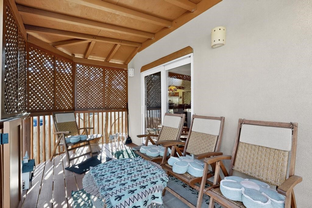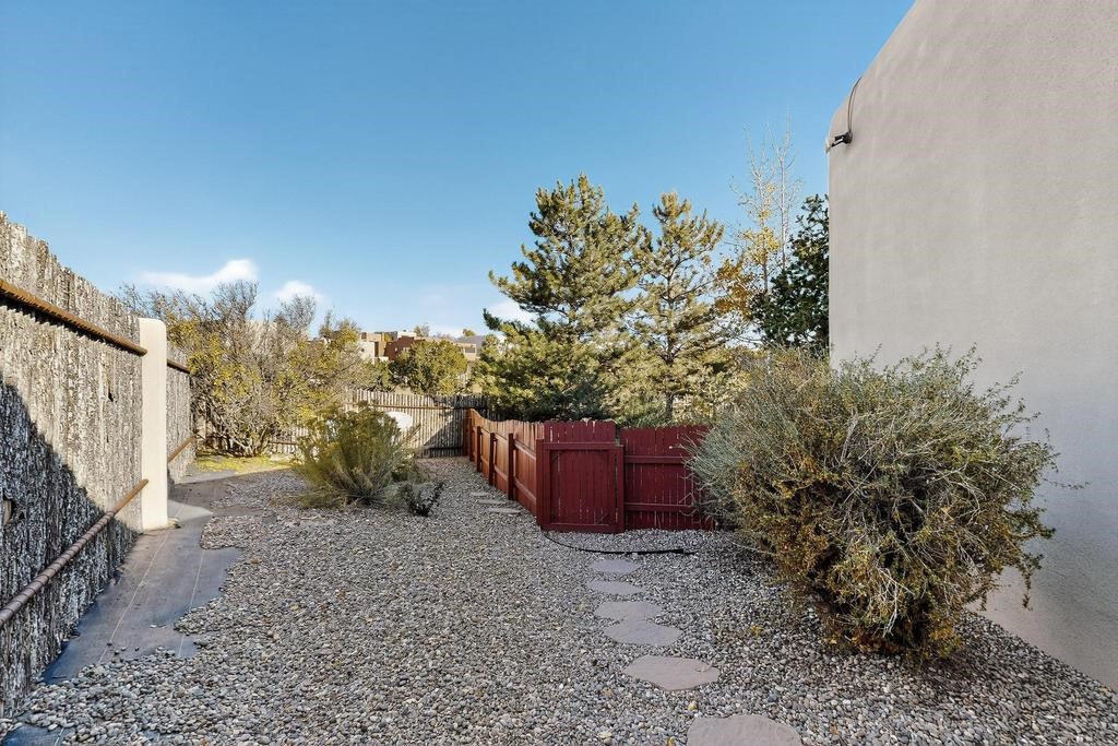 Don't miss this charming single-level home in Pueblos del Sol featuring three bedrooms and two bathrooms. This residence showcases classic Santa Fe details such as Vigas and a cozy Kiva fireplace. Lots of natural light streaming in from five skylights throughout the home. The open floor plan provides great flow and comfortable bedroom separation, while the spacious deck with a solid portal--accessible from both the living room and primary bedroom--offers the perfect place to relax and enjoy the beautiful mountain views. York Central air conditioning and a two-car garage complete this wonderful Santa Fe home. Additionally, the raised subfloor design allows for easy access to plumbing for repairs or modifications. Situated on a large, beautifully landscaped corner lot with native plants and an apricot tree, the property backs onto a greenbelt for added privacy. Recent updates include a finished garage with a new door (2016), a new TPO roof (2021), new coyote and dog-eared fencing (2021), stucco patched and stained (2025), a new hot water heater (2025), and a new sump pump (2023). We invite you to come take a look at this wonderful property.