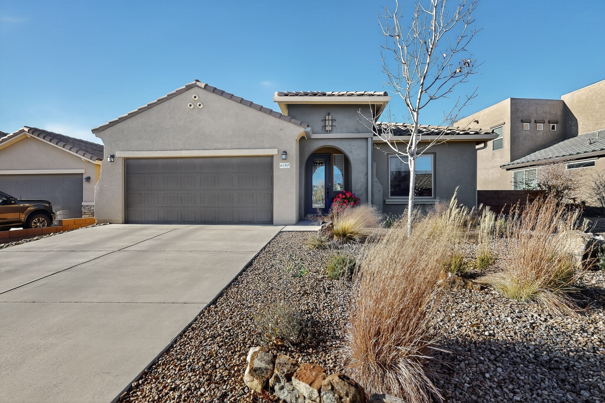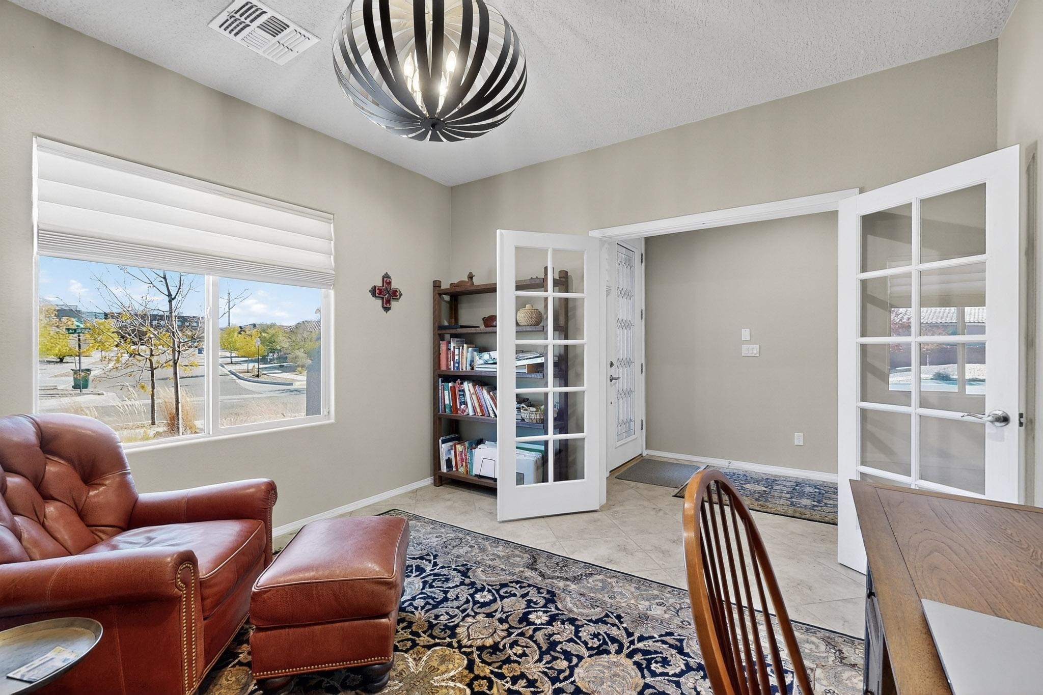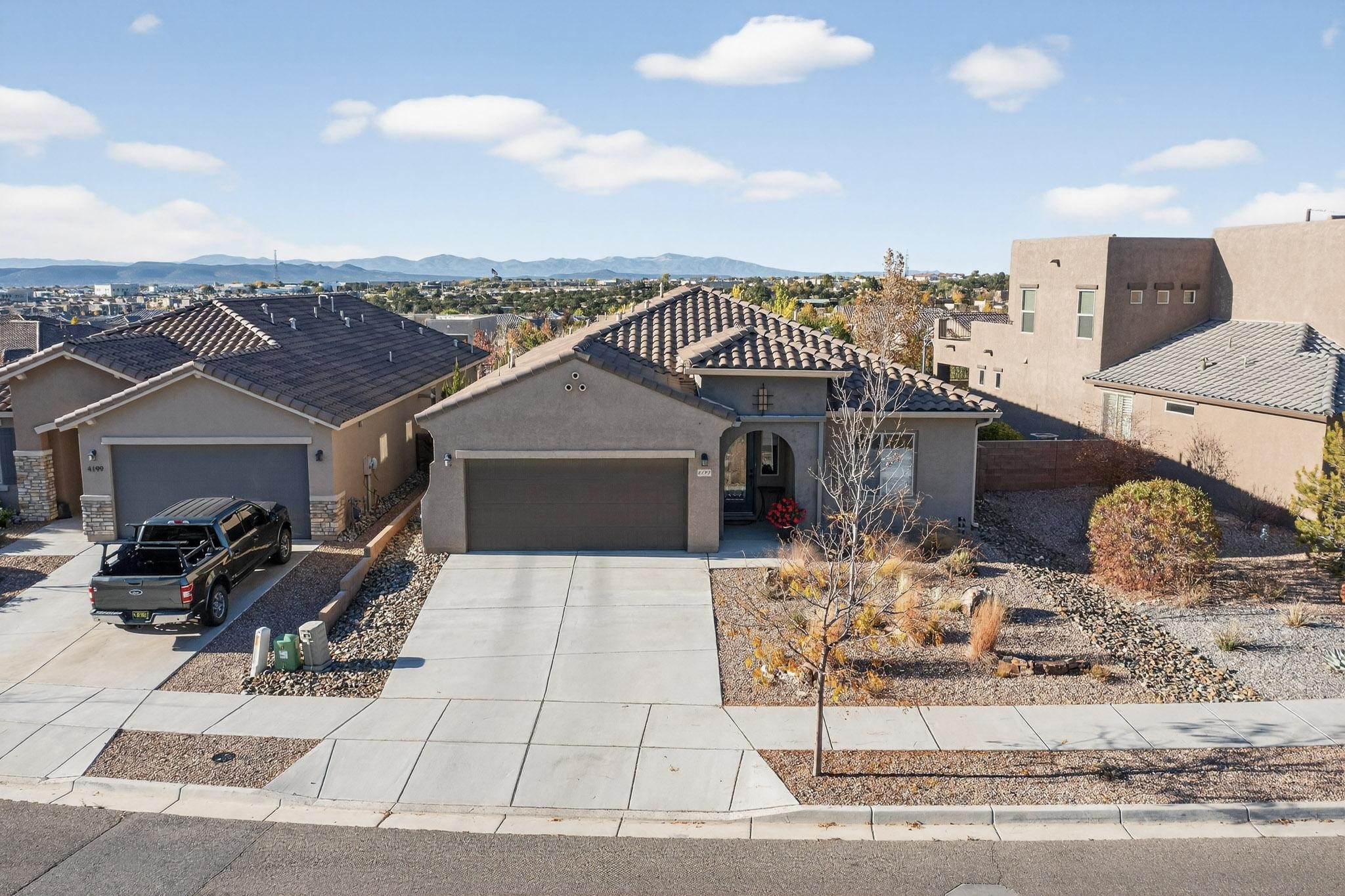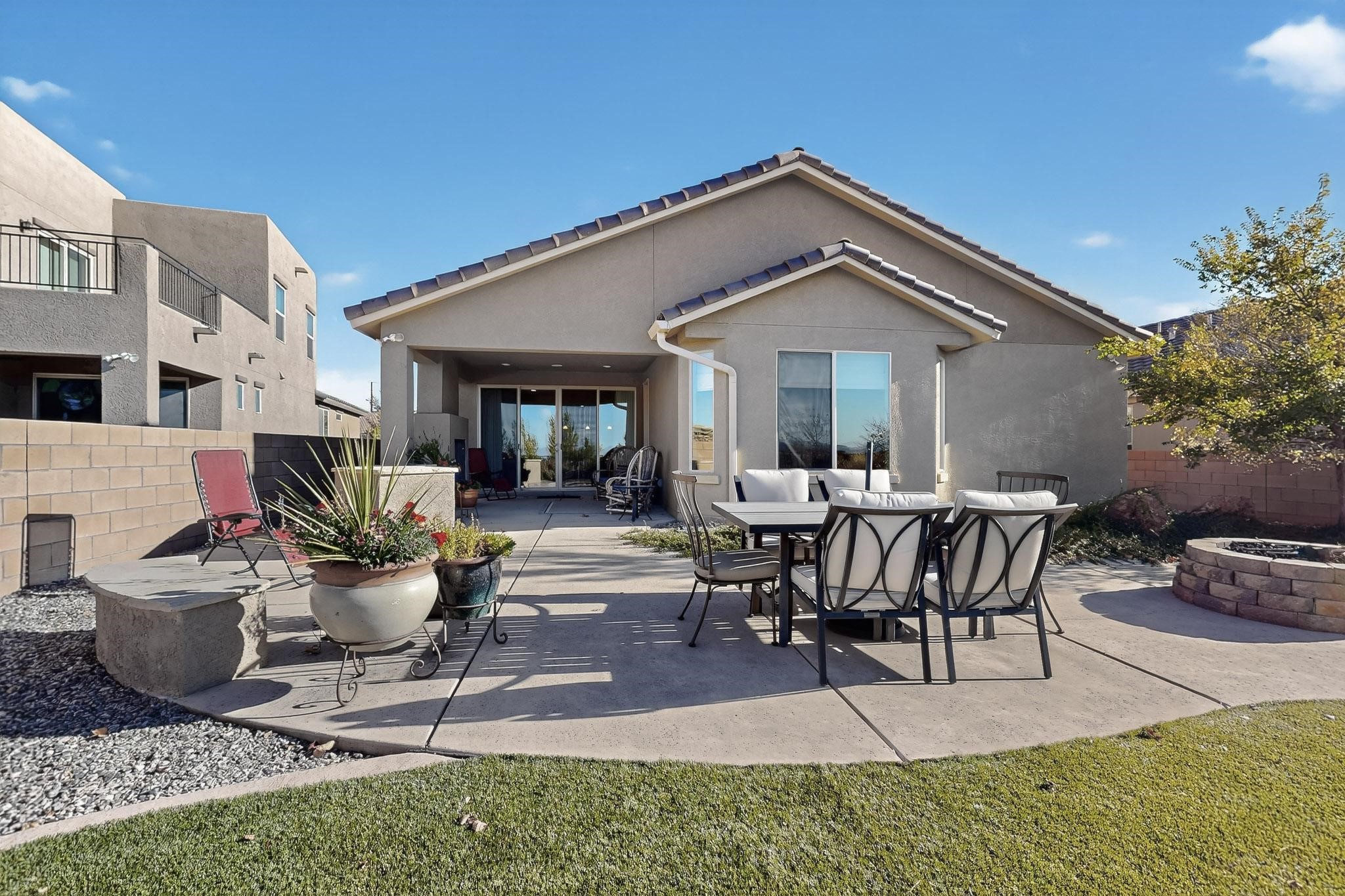 This is a one owner, former model home on a premium lot with many upgrades and even mountain views! There is shopping and restaurants nearby and easy access to I-25. The open concept living area is spacious and separates the primary suite from the 3 guest bedrooms. There are 2 bathrooms and also a den/office. Included are custom window coverings throughout. The front and back yards are beautifully landscaped. The turf and drip irrigation makes for easy maintenance. The backyard will bring year round enjoyment with a gas fireplace in the portal and a gas fire pit with sitting area in the yard. The house backs up to open space from which you will enjoy the mountain views and gorgeous Santa Fe sunsets. This is a must see if you are looking for a meticulously maintained single level home that is truly move in ready.