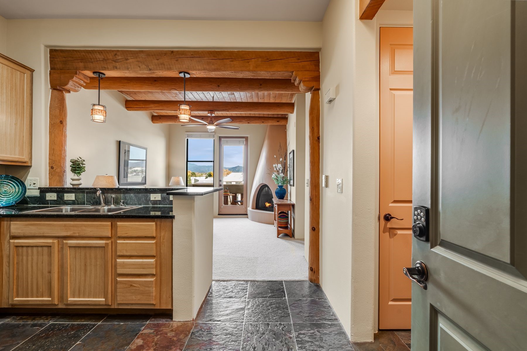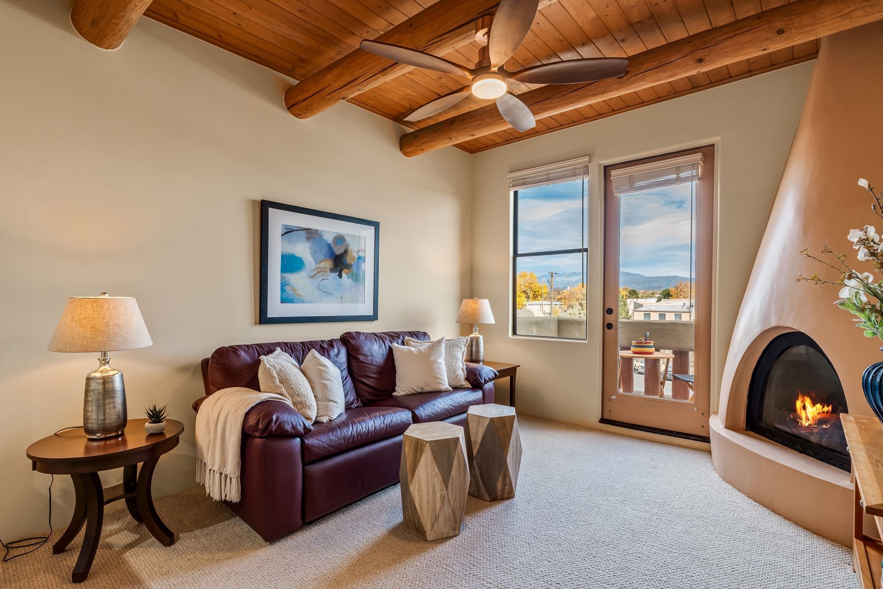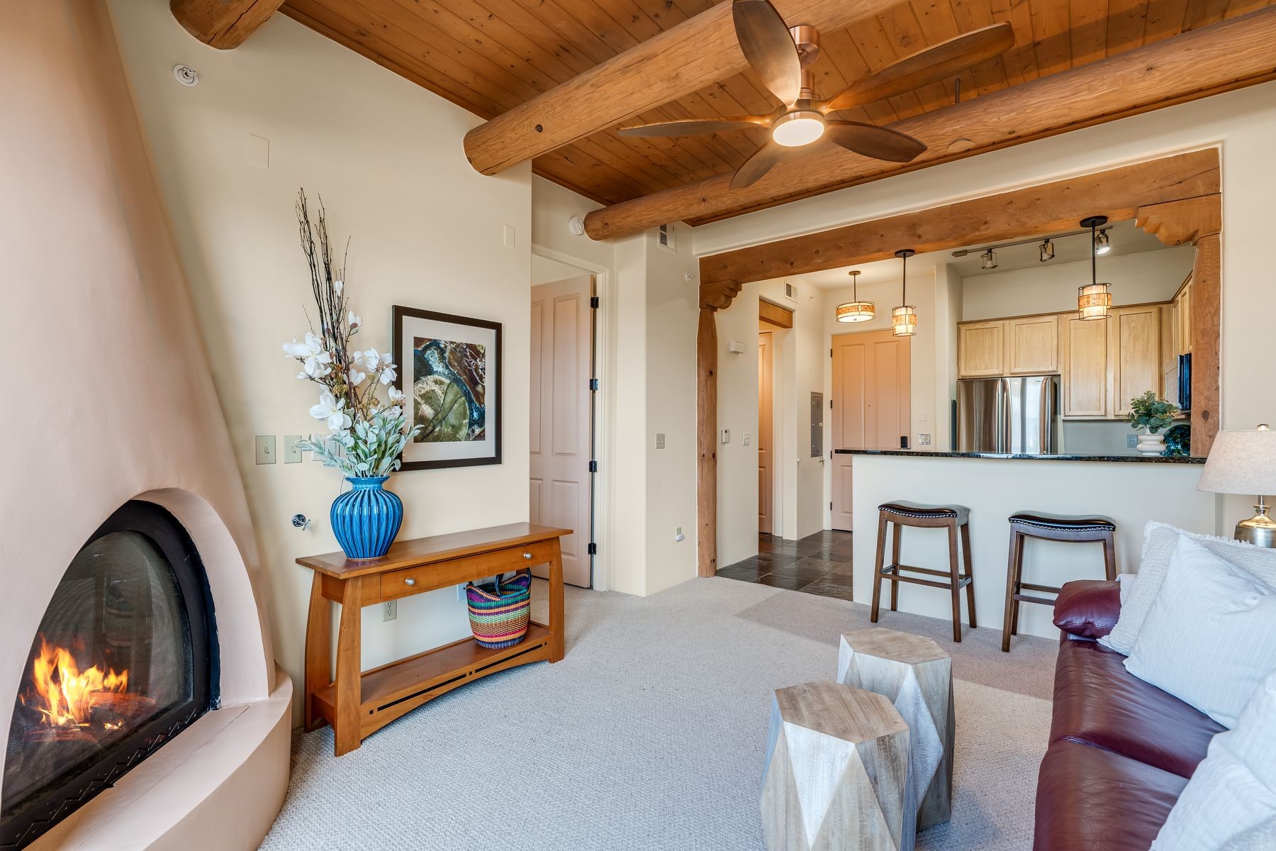 High-end top floor elegance at The Alameda! This 1 Bedroom/1 Bathroom luxe condo has rare and sought after Sangre de Cristo mountain views from the Living Room, Kitchen, Bedroom and Balcony. Enjoy the fine architectural interior features of wood vigas, tongue and groove ceilings, corbels and a handsome corner gas kiva fireplace. Significant upgrades have been made this year that include: All new paint, stripped and sealed slate flooring, 100% berber carpeting, new induction stove, Elfa custom closets, new hot water tank, new pendant lighting and new blinds. This unit includes a one-car garage and 50 square foot storage room right across the hallway. The Alameda is a luxury amenity condominium gated community that includes: Heated outside swimming pool with BBQ; Fitness Center; Party Rooms with Kitchens and Lounge Areas throughout and a Dog Run. Onsite professional manager and 24 hour controlled access. Fabulous location and close to shopping, dining and entertainment. This great opportunity can be yours so live La Dolce Vita and schedule your showing today!