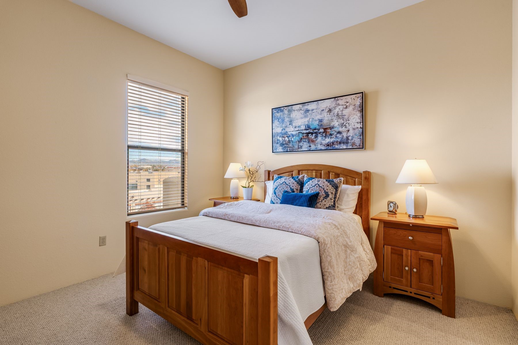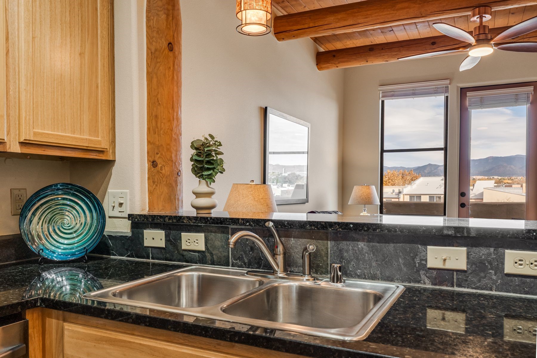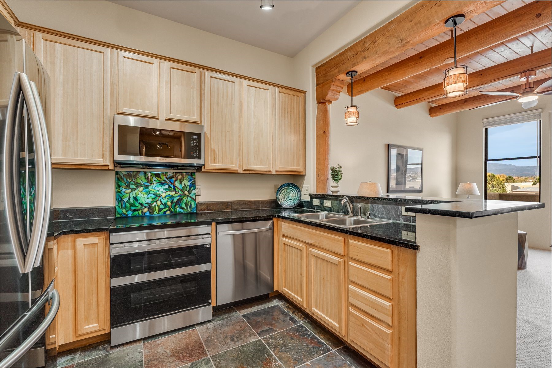 High-end top floor elegance at The Alameda! This 1 Bedroom/1 Bathroom luxe condo has rare and sought after Sangre de Cristo mountain views from the Living Room, Kitchen, Bedroom and Balcony. Enjoy the fine architectural interior features of wood vigas, tongue and groove ceilings, corbels and a handsome corner gas kiva fireplace. Significant upgrades have been made this year that include: All new paint, stripped and sealed slate flooring, 100% berber carpeting, new induction stove, Elfa custom closets, new hot water tank, new pendant lighting and new blinds. This unit includes a one-car garage and 50 square foot storage room right across the hallway. The Alameda is a luxury amenity condominium gated community that includes: Heated outside swimming pool with BBQ; Fitness Center; Party Rooms with Kitchens and Lounge Areas throughout and a Dog Run. Onsite professional manager and 24 hour controlled access. Fabulous location and close to shopping, dining and entertainment. This great opportunity can be yours so live La Dolce Vita and schedule your showing today!