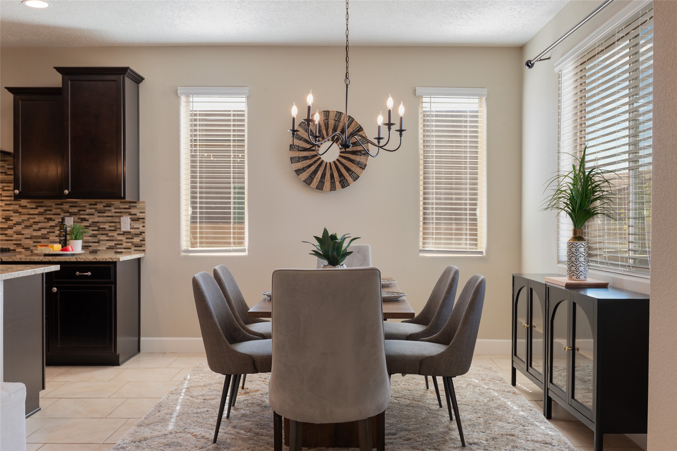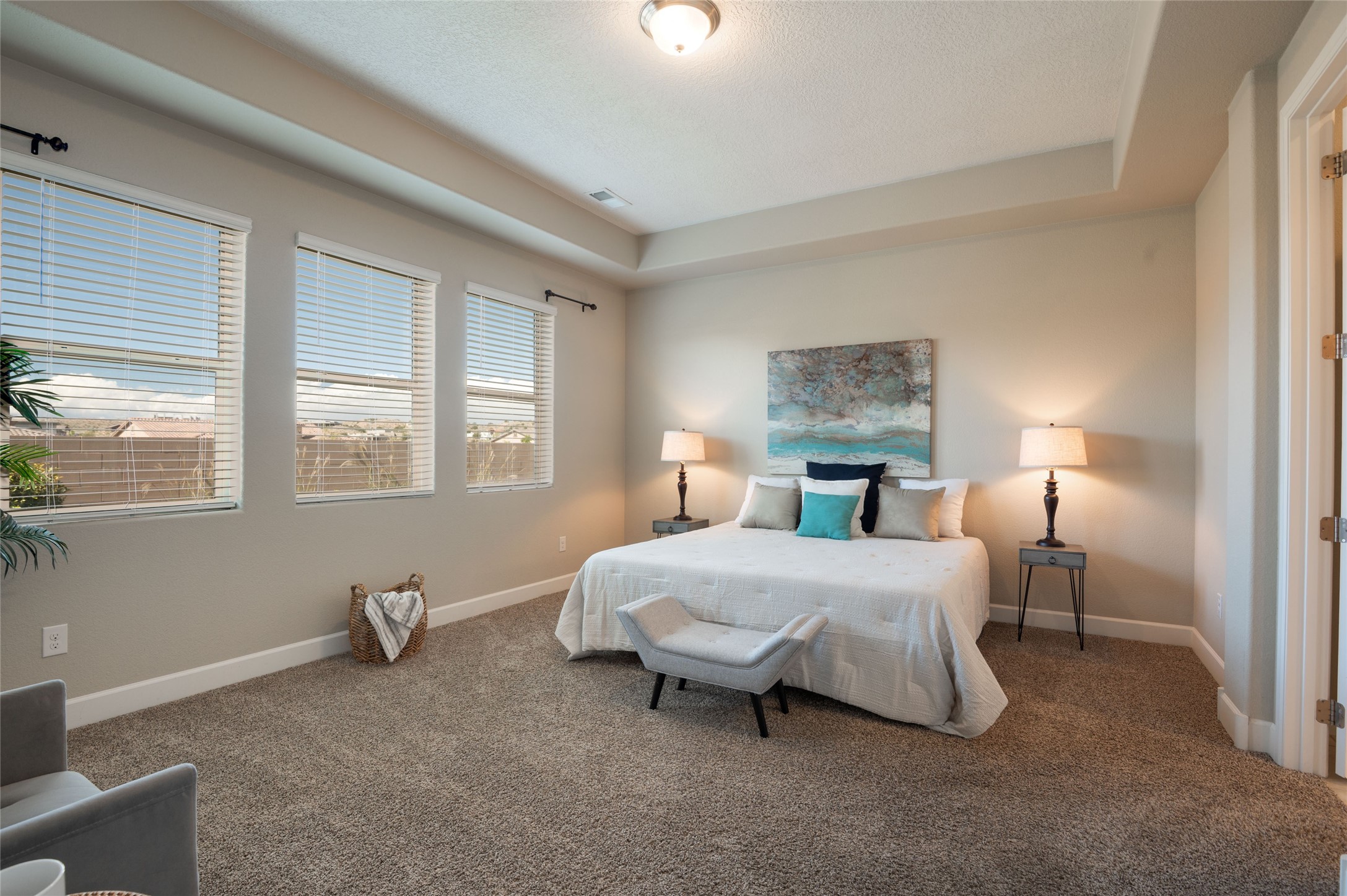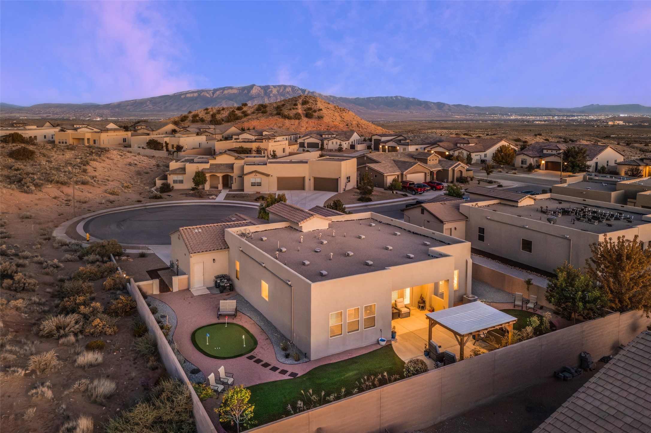 Warm, inviting home in beautiful Mariposa at the north end or Rio Rancho. Spectacular community surrounded by nature. Miles of trails, community pool and a gym. This home is located in a gated community at the end of a cul-de-sac beside open space. Secure and Serene. Spacious kitchen/dining/living area is a perfect gathering space, filled w/ natural light & offers generous counter space, gas stove, stainless appliances & walk-in pantry. The floor plan is open yet offers privacy in bedroom wings. Large primary suite w/ double sinks, separate tub, walk-in shower & large walk-in closet w/ access to laundry room. Three additional bedrooms are each connected to a bathroom, including one Jack-n-Jill & one en suite. Comfortable office space is perfect for those who work from home or can offer a second living space near bedrooms. Gorgeous custom landscaped back yard w/ pergola & putting green perfect for relaxing outdoors. Generous Three car garage.