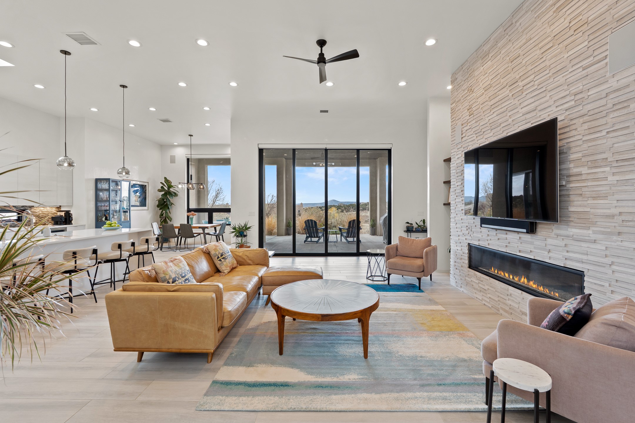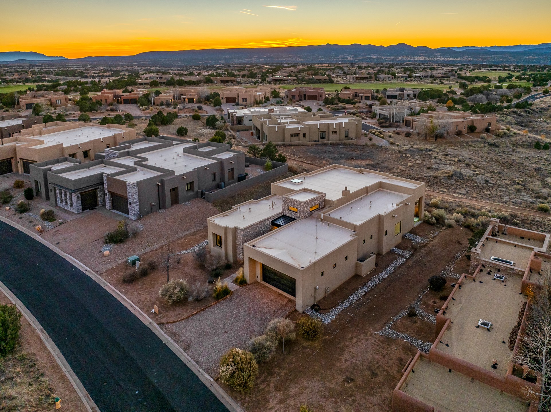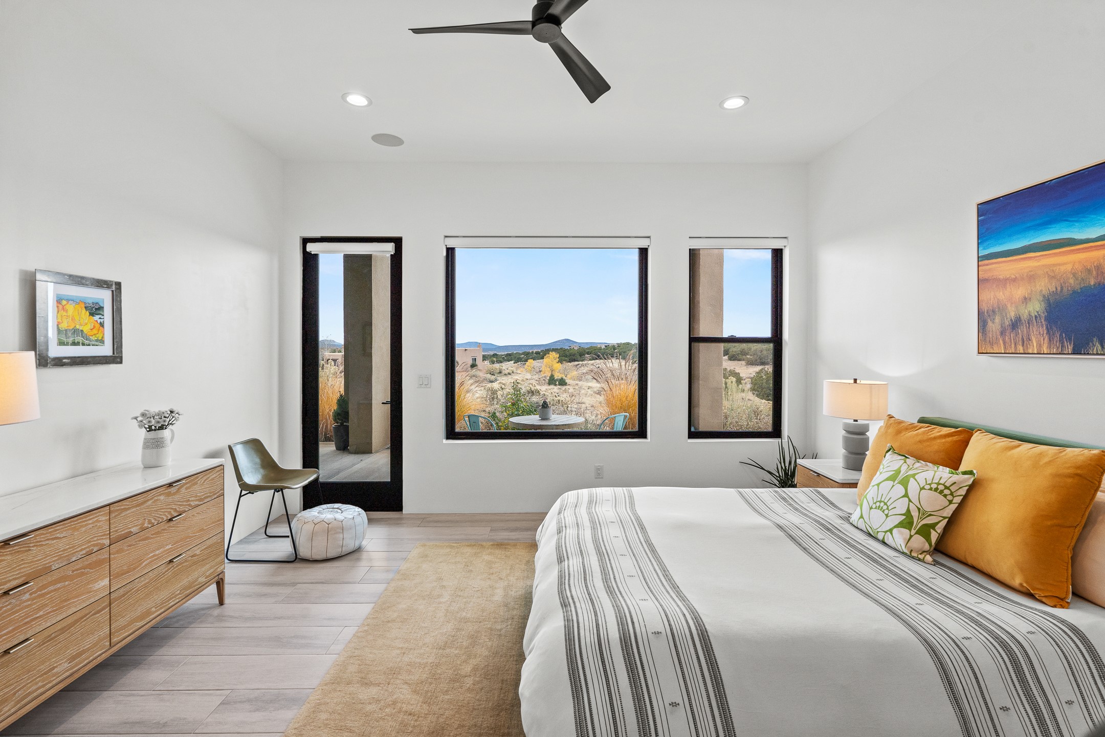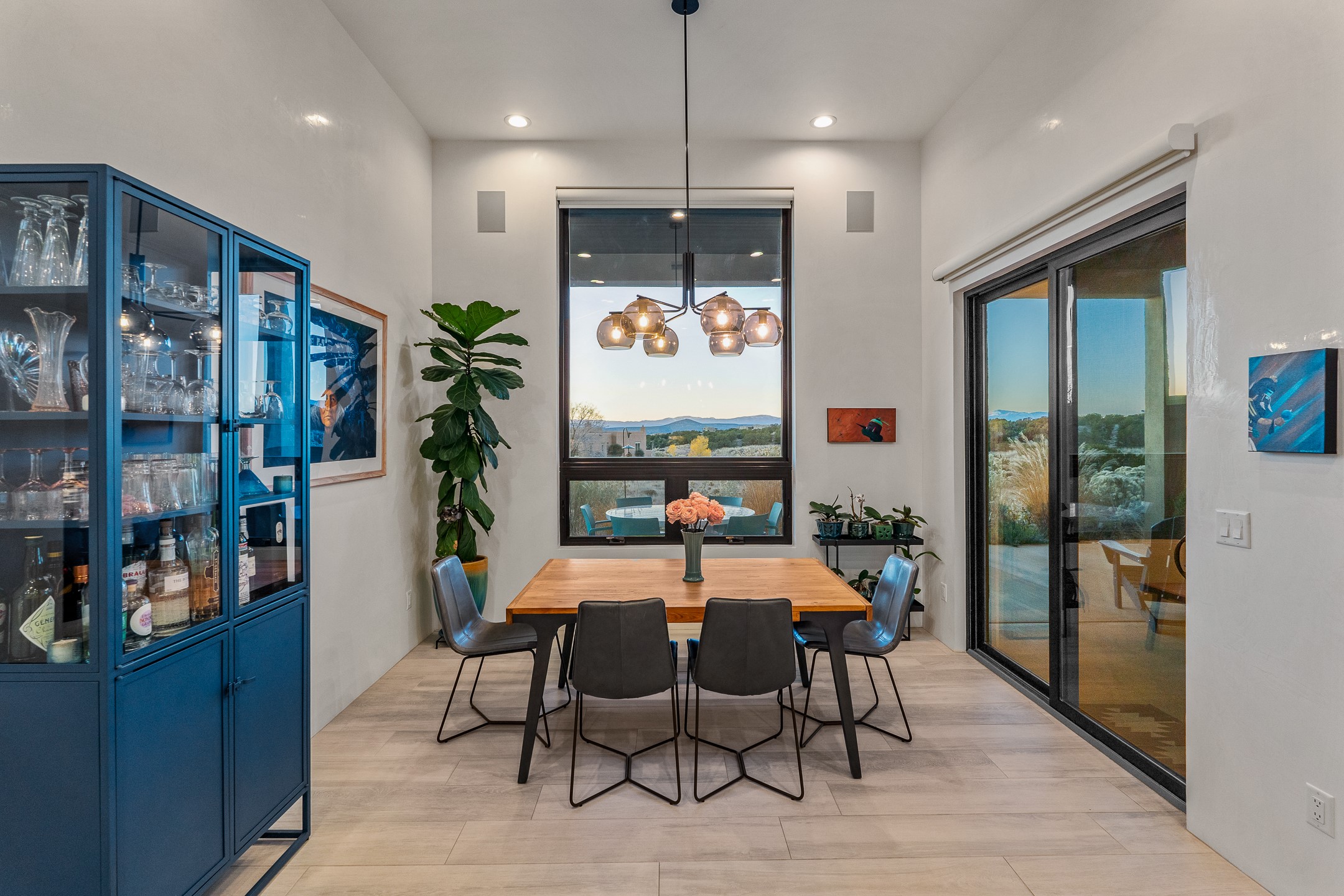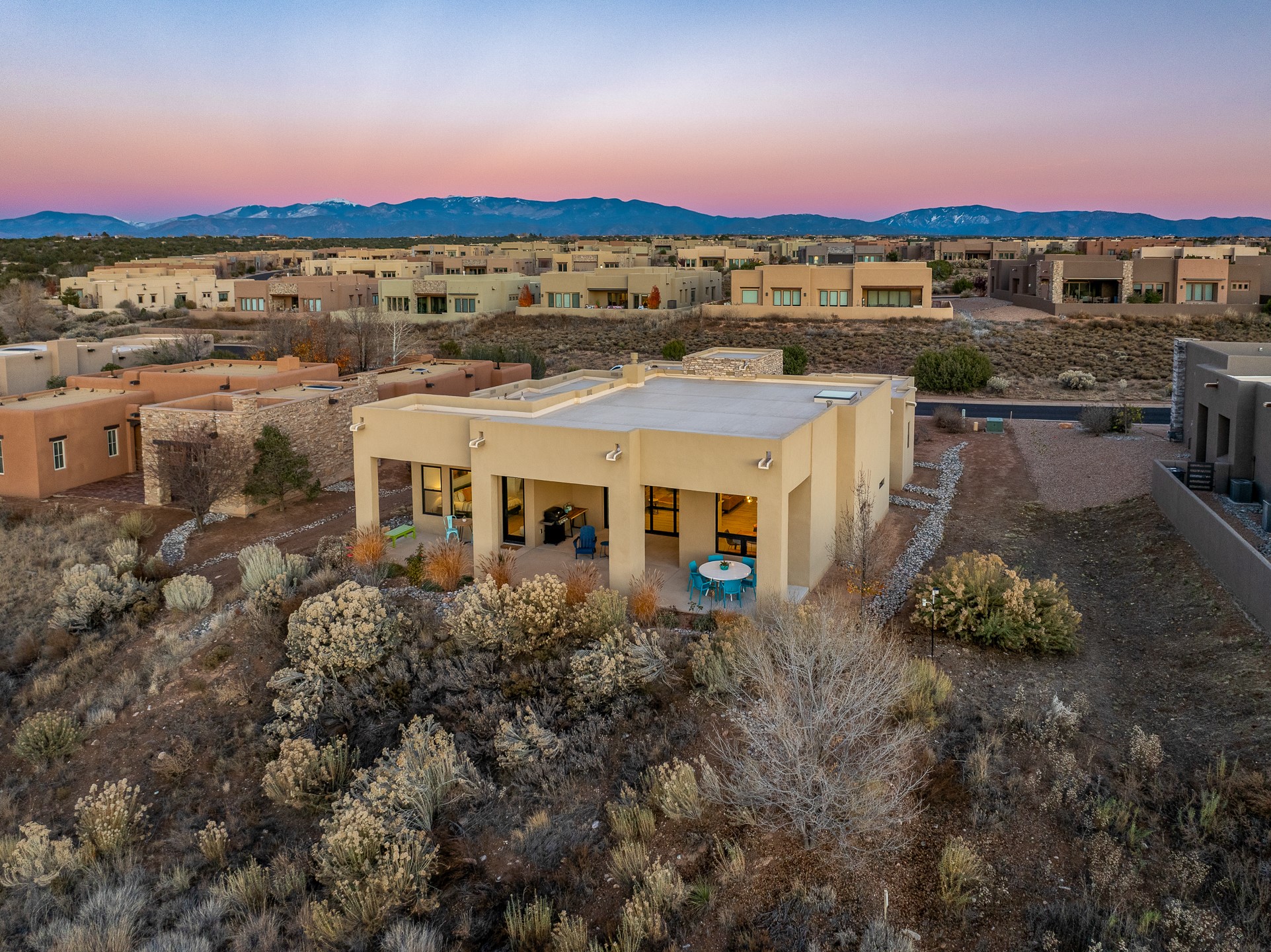 Experience the singular magic of Santa Fe living from this sophisticated, custom-designed contemporary residence. Completed in 2019 by Boss Builders, this single-level home is an artful composition of exquisite craftsmanship and intelligent design, thoughtfully curated for both entertaining and peaceful daily life. High ceilings, generous natural light, and beautiful plaster walls create a bright and welcoming aesthetic often reserved for more expensive homes. The heart of the residence is the expansive living space, where the entire western wall gives way to panoramic vistas via a dramatic Nanawall system. This seamless integration of indoors and out captures the high-desert light, transforming daily moments into an endless spectacle of stunning sunsets. The gourmet kitchen is a study in subtle elegance, featuring premium Viking appliances, a unique stone backsplash, and classic cabinetry. Functional luxury is paramount, evidenced by the dedicated wine cooler and a convenient pot filler at the stove. Designed for ultimate comfort, the floor plan provides exceptional sanctuary. The generous primary suite is a private retreat, offering direct patio access, commanding views, and a luxurious five-fixture bath complete with a deep soaking tub and a separate steam shower. Guest quarters are strategically separated, ensuring privacy for all. Year-round comfort is assured by a dual-system approach: responsive forced air heating for quick temperature adjustments, coupled with radiant heat in the floors for consistent, enveloping warmth. Additional high-end features include refrigerated air-conditioning and remote-controlled window treatments. Set within Santa Fe's premier gated community, this property promises effortless living, beautiful common area landscaping, well-maintained streets, and 24-hour security and paramedic services. With its direct-access garage and fully automated drip irrigation system, the home also caters to modern living with whole-home audio wiring and high-speed internet connections in every bedroom--an ideal, secure lock-and-leave lifestyle.