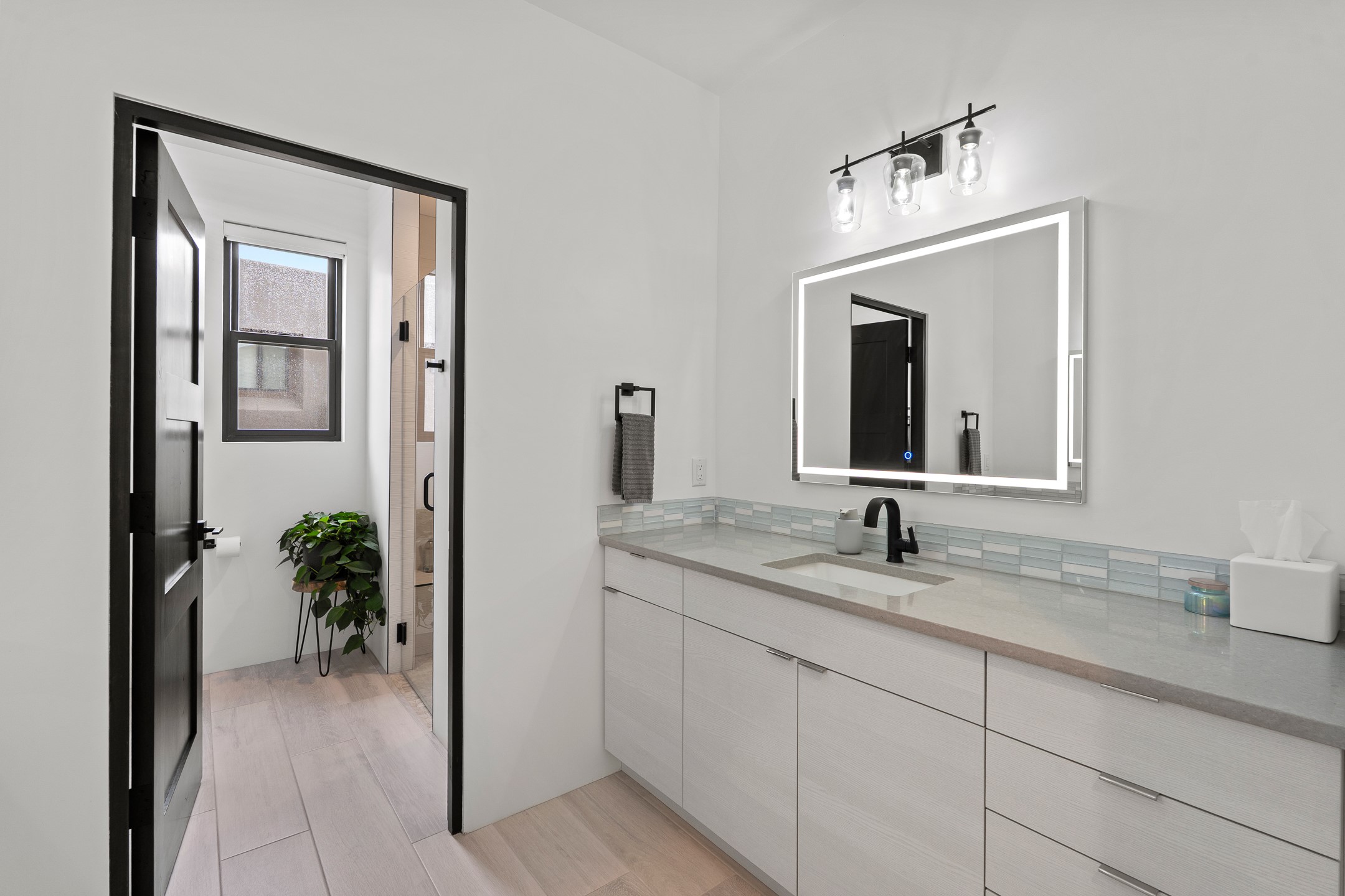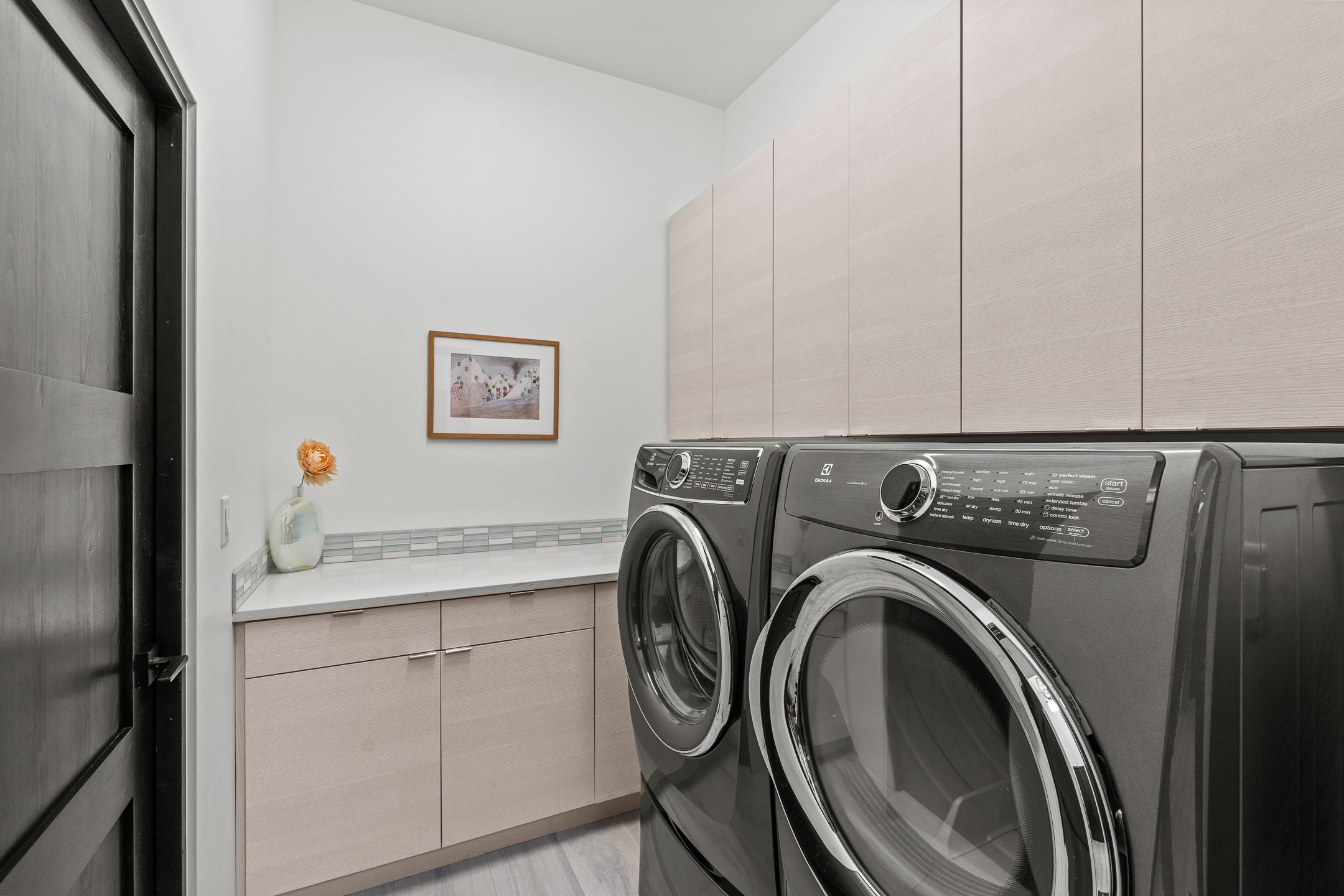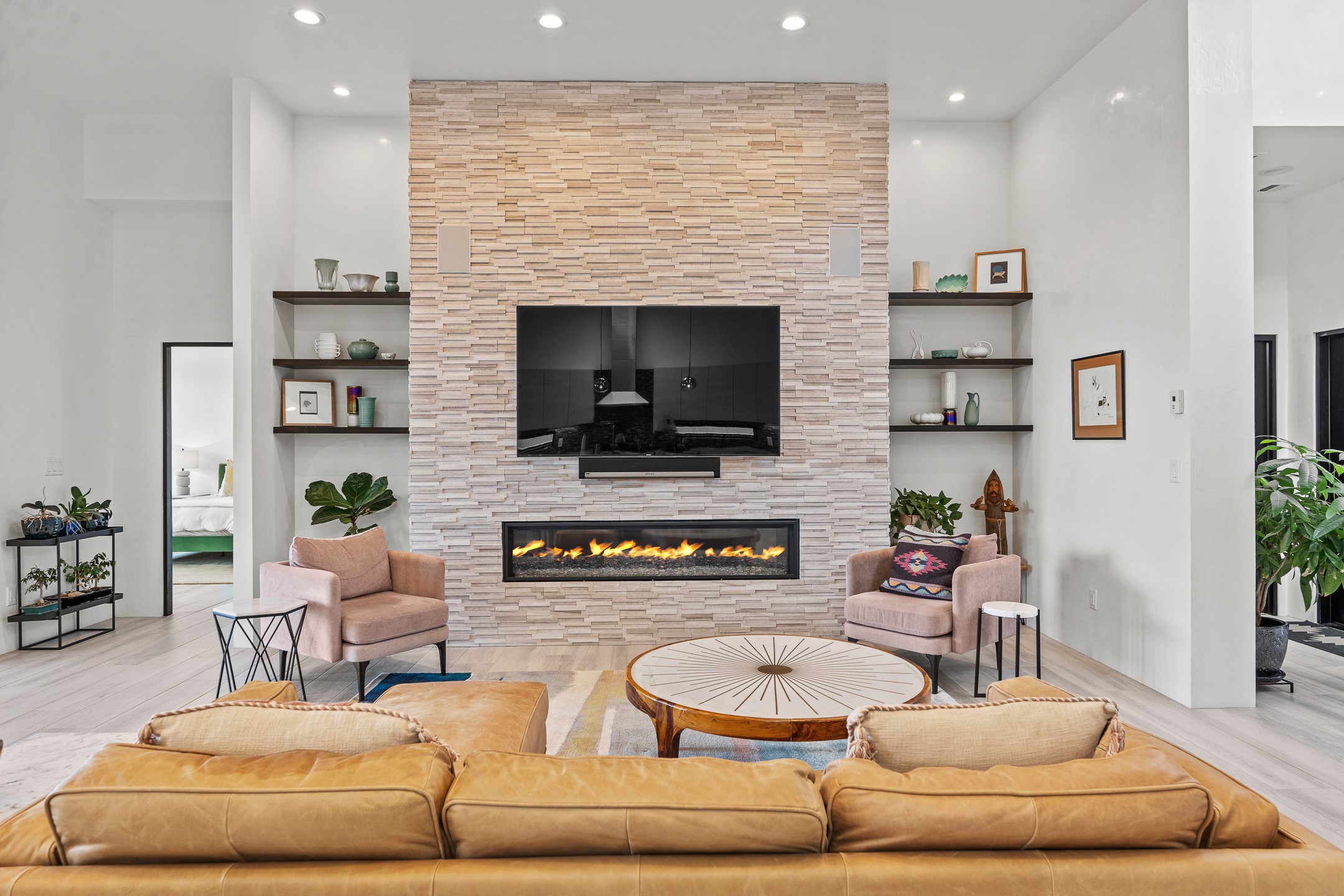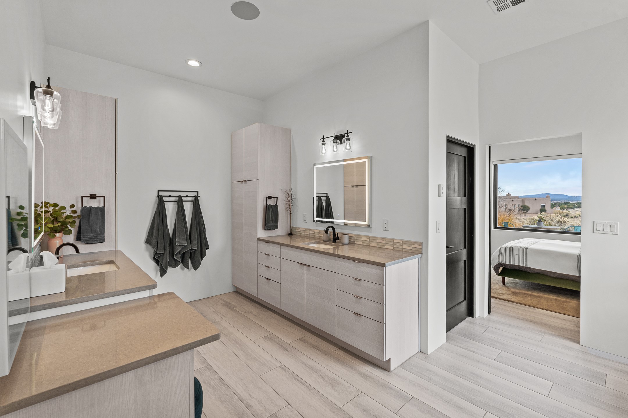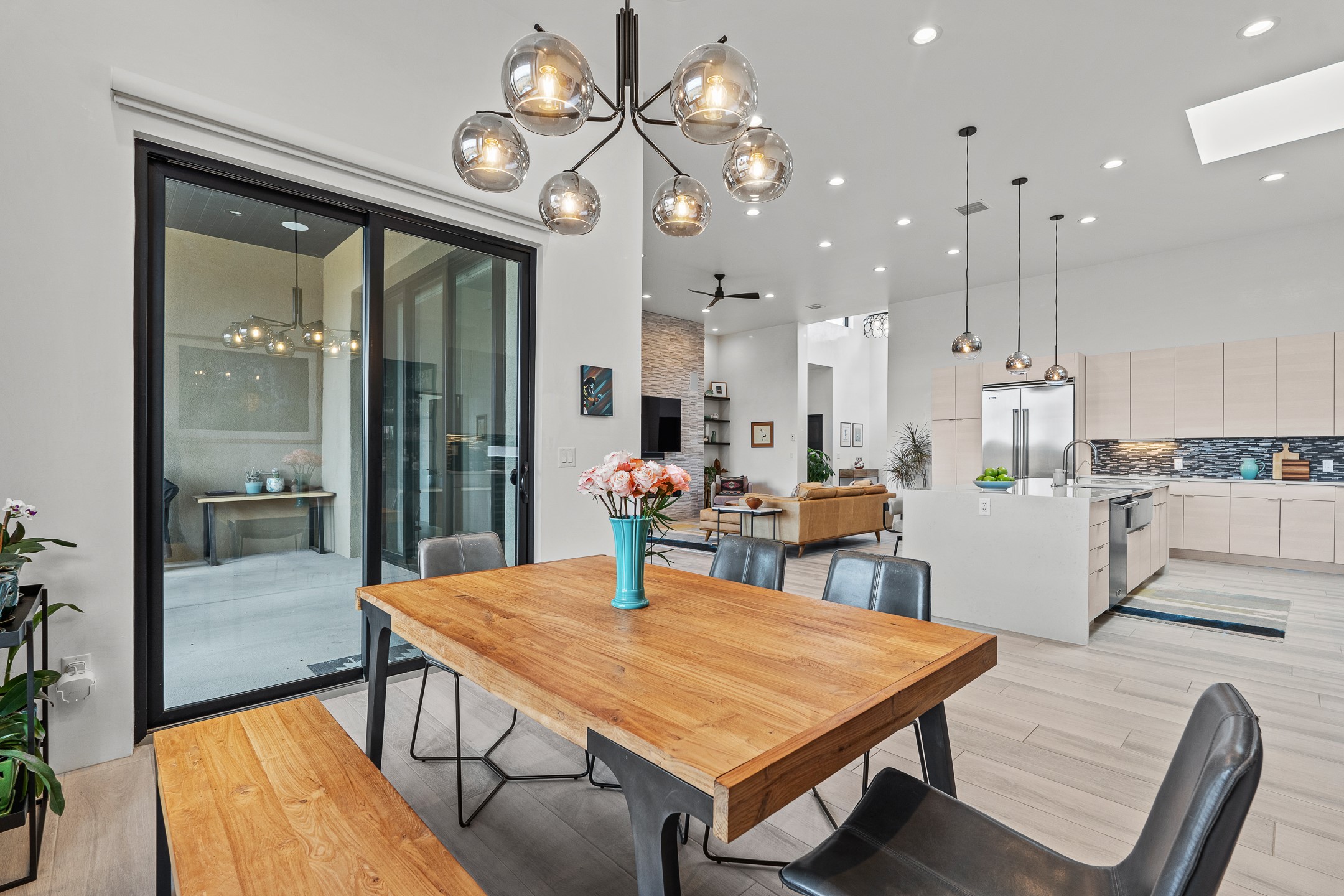 Experience the singular magic of Santa Fe living from this sophisticated, custom-designed contemporary residence. Completed in 2019 by Boss Builders, this single-level home is an artful composition of exquisite craftsmanship and intelligent design, thoughtfully curated for both entertaining and peaceful daily life. High ceilings, generous natural light, and beautiful plaster walls create a bright and welcoming aesthetic often reserved for more expensive homes. The heart of the residence is the expansive living space, where the entire western wall gives way to panoramic vistas via a dramatic Nanawall system. This seamless integration of indoors and out captures the high-desert light, transforming daily moments into an endless spectacle of stunning sunsets. The gourmet kitchen is a study in subtle elegance, featuring premium Viking appliances, a unique stone backsplash, and classic cabinetry. Functional luxury is paramount, evidenced by the dedicated wine cooler and a convenient pot filler at the stove. Designed for ultimate comfort, the floor plan provides exceptional sanctuary. The generous primary suite is a private retreat, offering direct patio access, commanding views, and a luxurious five-fixture bath complete with a deep soaking tub and a separate steam shower. Guest quarters are strategically separated, ensuring privacy for all. Year-round comfort is assured by a dual-system approach: responsive forced air heating for quick temperature adjustments, coupled with radiant heat in the floors for consistent, enveloping warmth. Additional high-end features include refrigerated air-conditioning and remote-controlled window treatments. Set within Santa Fe's premier gated community, this property promises effortless living, beautiful common area landscaping, well-maintained streets, and 24-hour security and paramedic services. With its direct-access garage and fully automated drip irrigation system, the home also caters to modern living with whole-home audio wiring and high-speed internet connections in every bedroom--an ideal, secure lock-and-leave lifestyle.