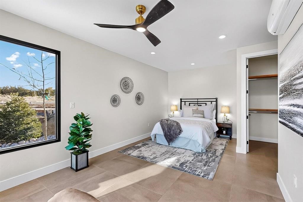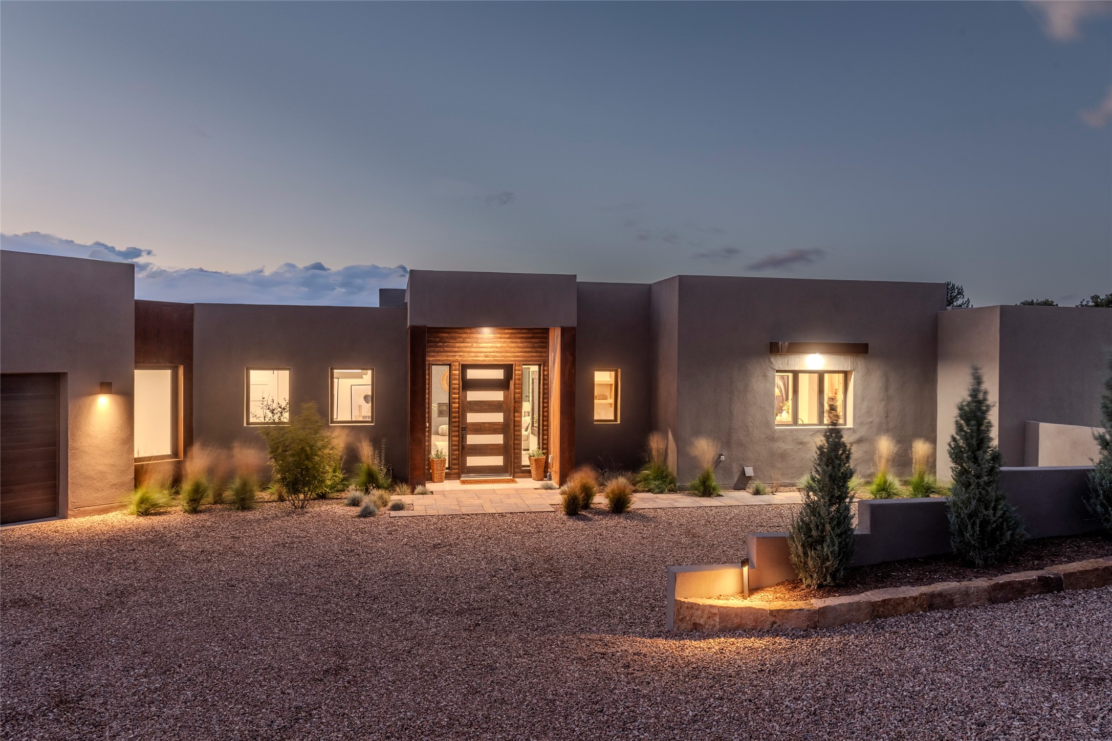 Set on an elevated 0.71-acre lot in Las Campanas, this brand-new soft contemporary home pairs clean modern lines with subtle Santa Fe style and far-reaching mountain and golf-course views. Built in 2024 by New Vista Property Solutions, the single-level 3,111 sq ft layout offers three en-suite bedrooms plus a powder room, a natural gas fireplace, and an attached two-car garage. Sculptural weathered-steel accents enrich the exterior, adding texture and architectural interest.Inside, the great room is filled with light and anchored by a generous cook's kitchen featuring handmade custom cabinetry crafted for both function and artistry. Open living and dining spaces flow easily to the outdoors, where a dramatic cantilevered rear porch creates a protected vantage point for sunrise, evening light, and year-round alfresco living.Each bedroom offers privacy and comfort with its own bath, while ductless mini-split systems provide efficient heating and cooling throughout. A membrane roof and no interior steps enhance ease of living.Located within the gated community of Las Campanas, residents enjoy beautifully maintained surroundings and 24-hour security. Membership to The Club is optional and provides access to two Jack Nicklaus Signature golf courses, a full fitness and spa center with indoor and outdoor pools, tennis and pickleball, dining at the Hacienda Clubhouse, an exceptional Equestrian Center, and miles of biking, hiking, and riding trails.
