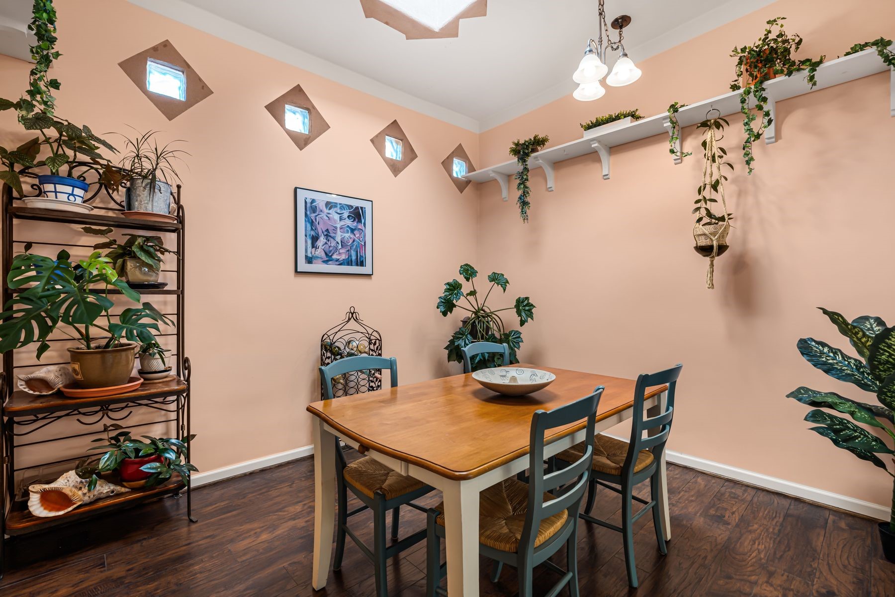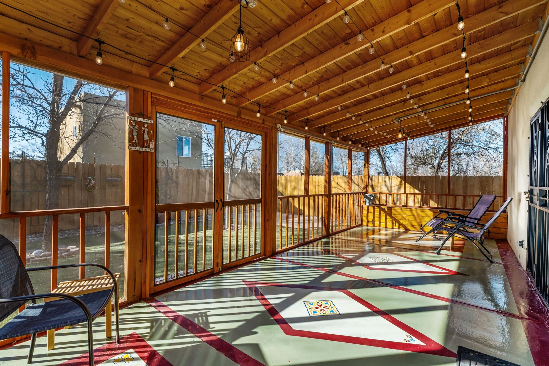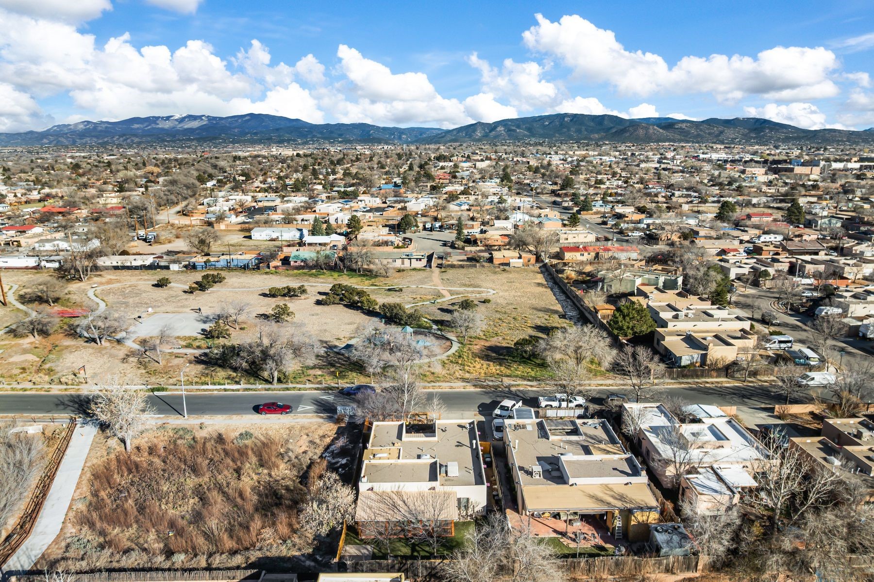 Discover this charming home in a quiet midtown location across from Los Hermanos Rodriguez Park and bordering undeveloped common area on one side for added privacy. This single-level, no-steps home offers abundant natural light and excellent separation between the primary suite and two guest bedrooms. The inviting living room features tile flooring and a wood-burning kiva fireplace, while the kitchen and dining area offer easy flow for everyday living. A standout feature is the screened-in portal, providing additional outdoor living space and direct access to the fully fenced rear yard. The backyard includes low-maintenance landscaping, mature shade trees, turf, river rock accents, and room for gardening or pets. The front garden is a lush seasonal oasis with blooming perennials and established plantings that enhance curb appeal. The home includes laminate and tile flooring throughout (no carpet), in-floor radiant heat, and evaporative cooling for year-round comfort. The extra-wide one-car garage provides valuable storage or workspace. Recent updates include a new dishwasher (2023), new microwave (2024), new tankless boiler, and rainwater management improvements (2025). A radon mitigation system is already in place. This thoughtfully maintained home offers privacy, comfort, and easy indoor-outdoor living in a central Santa Fe location. With park access just across the street and shopping, restaurants, and amenities only 10 minutes away, this home combines quiet neighborhood living with excellent convenience.