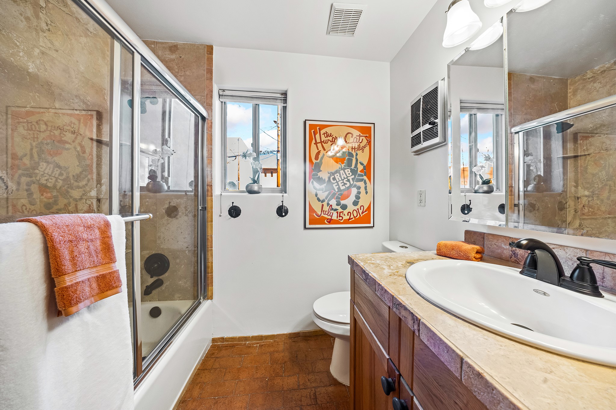 Rebuilt in 2006 on the foundation of an original 1940s adobe dwelling, this bright and open 2-bedroom, 2-bath home, with a 2013 office/studio addition, is a fine blend of traditional Santa Fe style and modern comforts. The kitchen features travertine countertops, hickory cabinetry, and all-new Samsung stainless-steel appliances (2025). Travertine tile graces both baths. There's in-floor radiant heat in all but the office, supported by a new high-efficiency boiler, plus a new, on demand water heater--both installed in 2025. Most of the home sports a new, TPO roof (2023). Fully enclosed behind walls and an electronic gate, this appealing property provides rare in-town privacy and secure parking just a half mile from the Coop, Leo's, and the Railyard's shops and galleries.