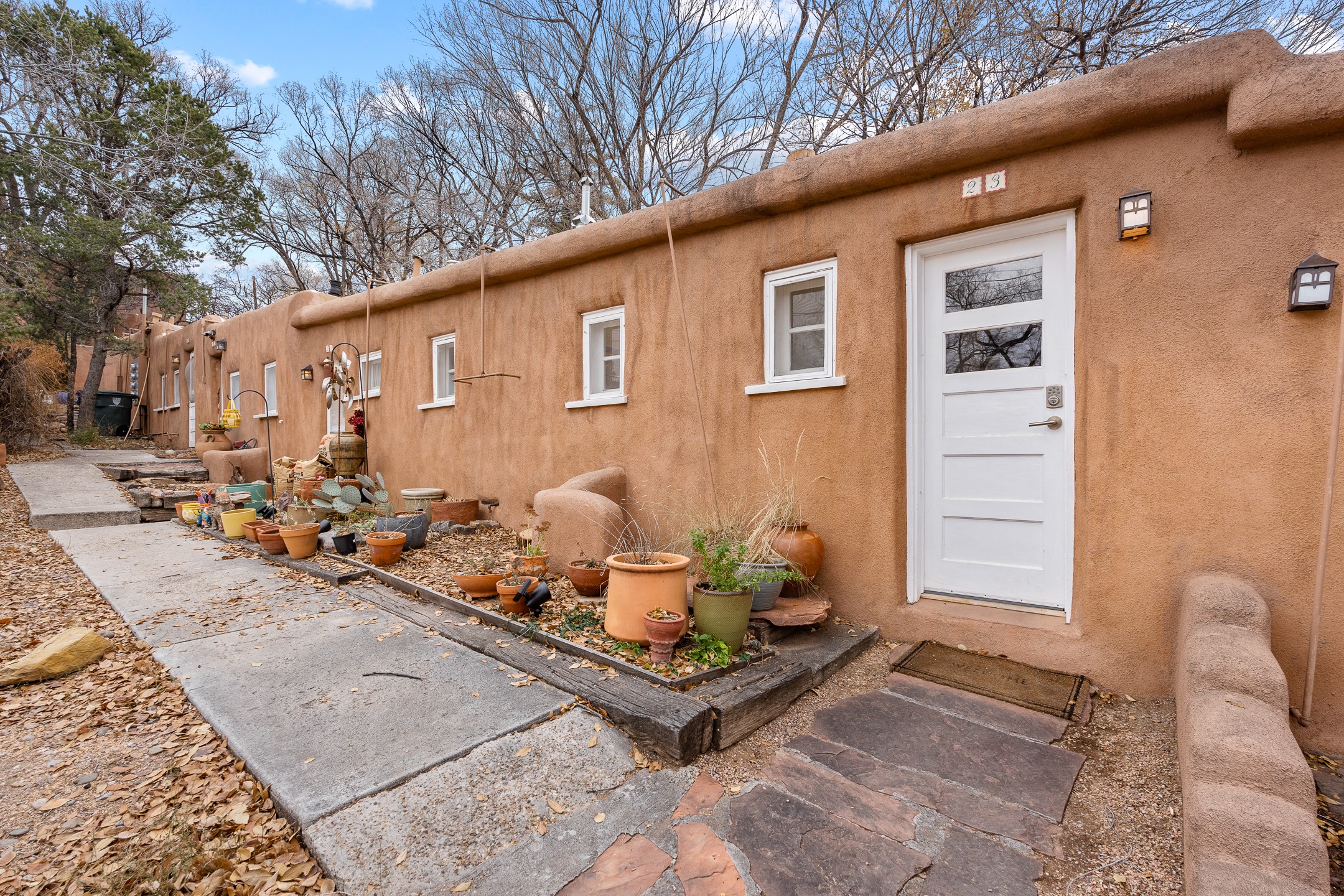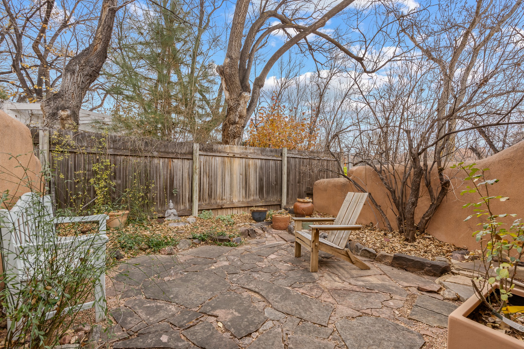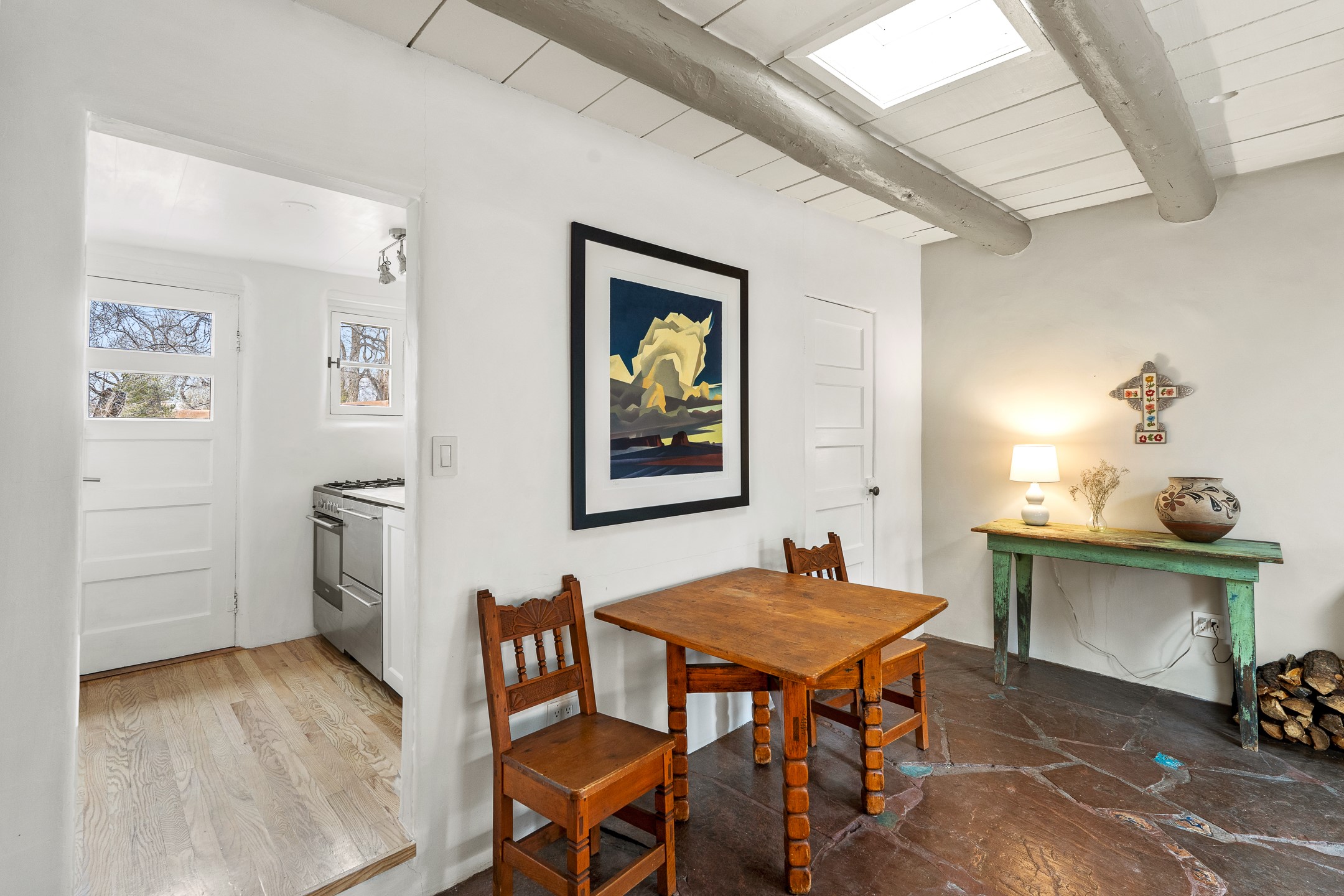 Tucked in the storied Webster Compound on Garcia Street, this enchanting adobe retreat offers a rare opportunity to live within one of Santa Fe's most culturally significant enclaves. Part of an artist colony that nurtured writers, poets, and painters. This timeless residence is more than a home. It's a connection point to Santa Fe's creative soul.Flagstone floors, hand-plastered walls, skylights, and vigas create an atmosphere that feels both grounding and uplifting, an old-world sanctuary shaped by nearly a century of history. The great room centers around an inviting kiva fireplace, its soft glow anchoring the space whether you are relaxing, dreaming, or creating. Doors and divided-light windows open to a south-facing walled garden where winter sunlight warms the adobe and summer trees cast delicate shade. The patio, lilac tree, and serene enclosure evoke the feeling of a hidden courtyard in a far-off place.The newer owner will step into a lineage. Willa Cather, Arthur Sze, Ramona Sakiestewa, Stanley Noyes, and Kon Tiki author Thor Heyerdahl once lived and created within this very compound, shaping works that traveled far beyond Santa Fe. There is a quiet hum of inspiration that lingers on these grounds, and the new steward of this residence will feel it immediately. This home whispers a sweet lullaby.The kitchen blends traditional charm with modern usefulness. Oak floors, stainless steel appliances, custom cabinets, pantry space, and a generous wood countertop. The full bath features classic Mexican tile. With a design that welcomes both simplicity and depth, the home becomes an ideal escape for contemplation, creativity, and renewal.Just moments from Downtown Subscription, Canyon Road, Garcia Street Books, Museum Hill, hiking trails, and the Plaza, this location is quintessential Eastside living, with treed lanes, intimate beauty, and the sense of belonging to a part of Santa Fe that still breathes with history, art, and human connection.
