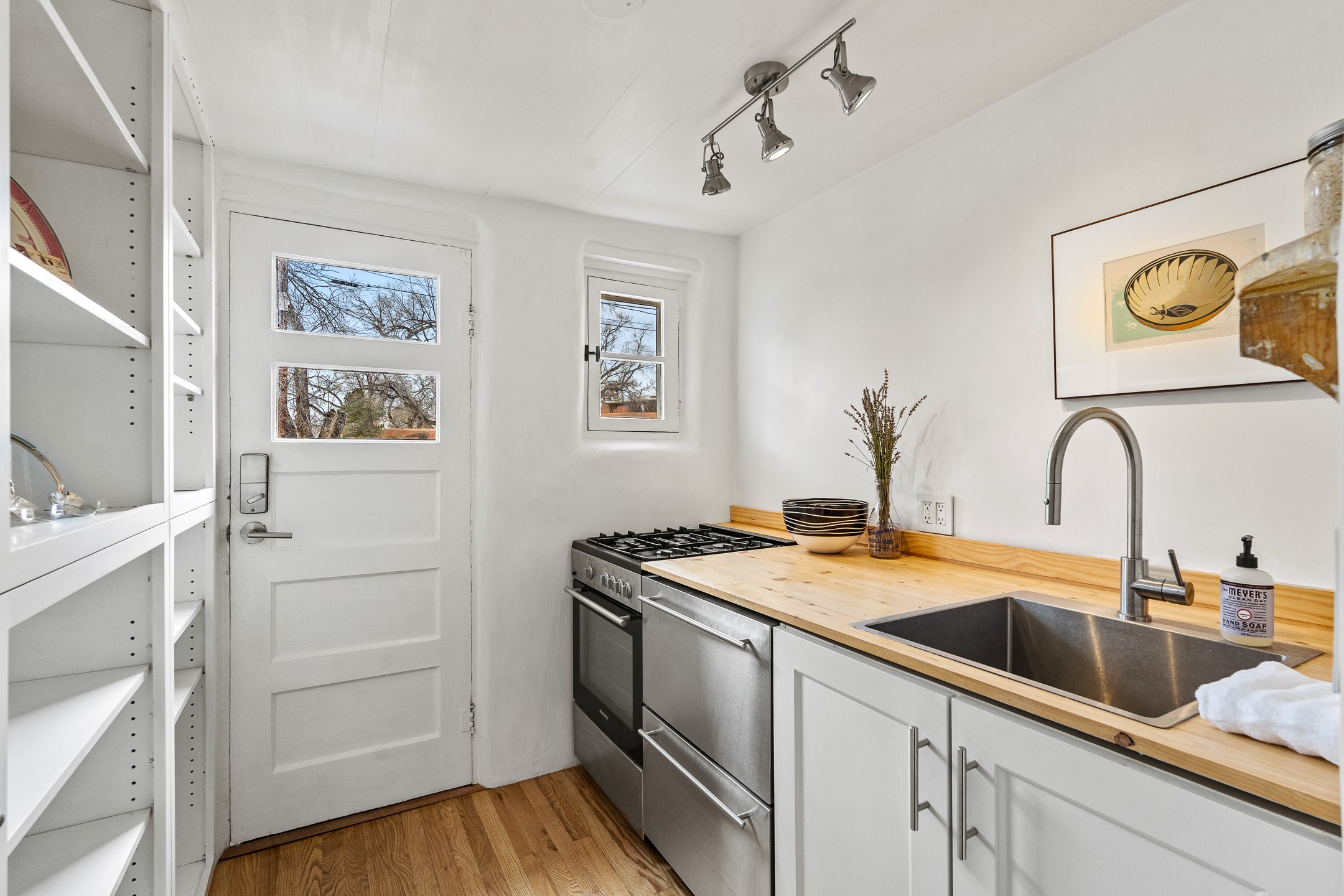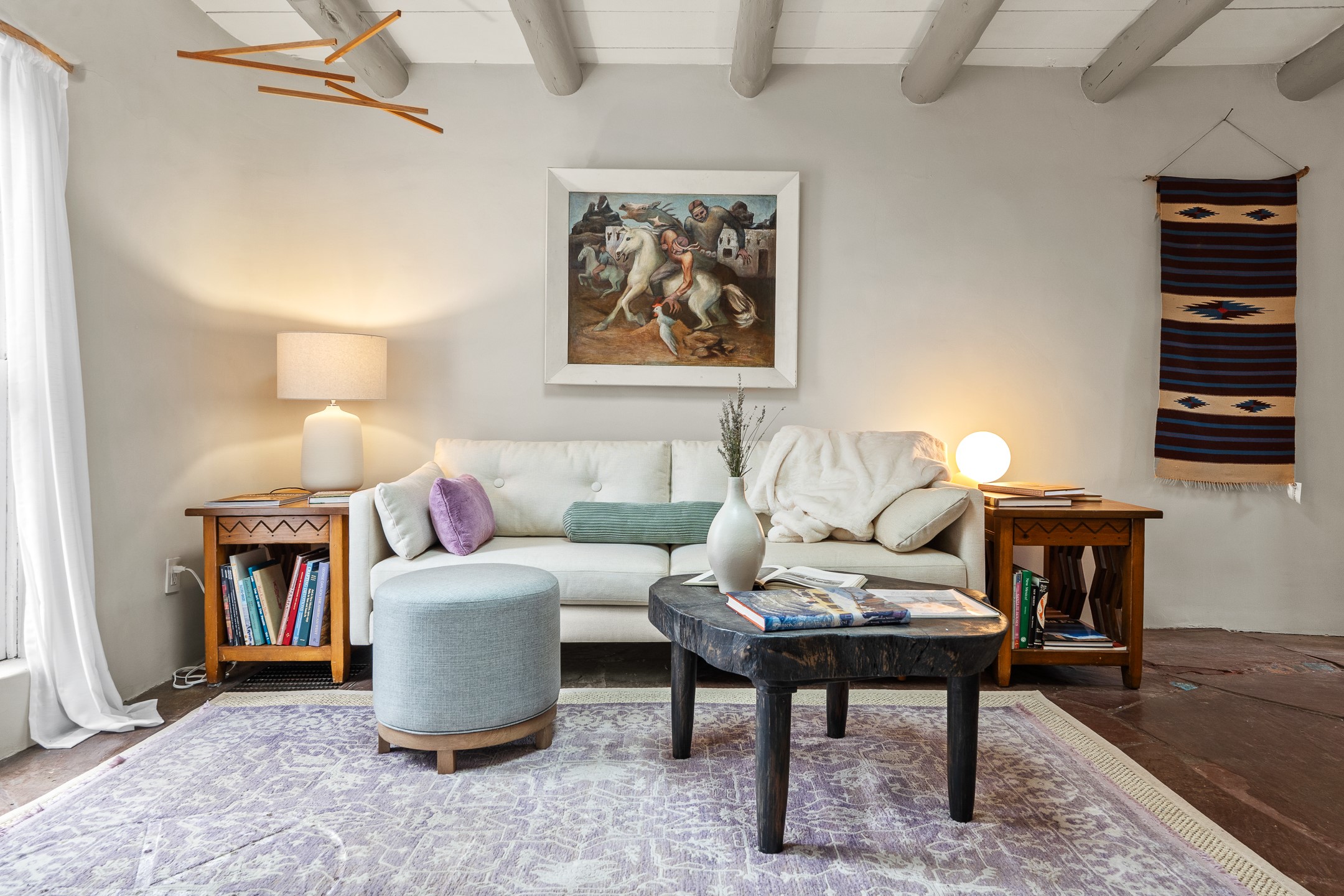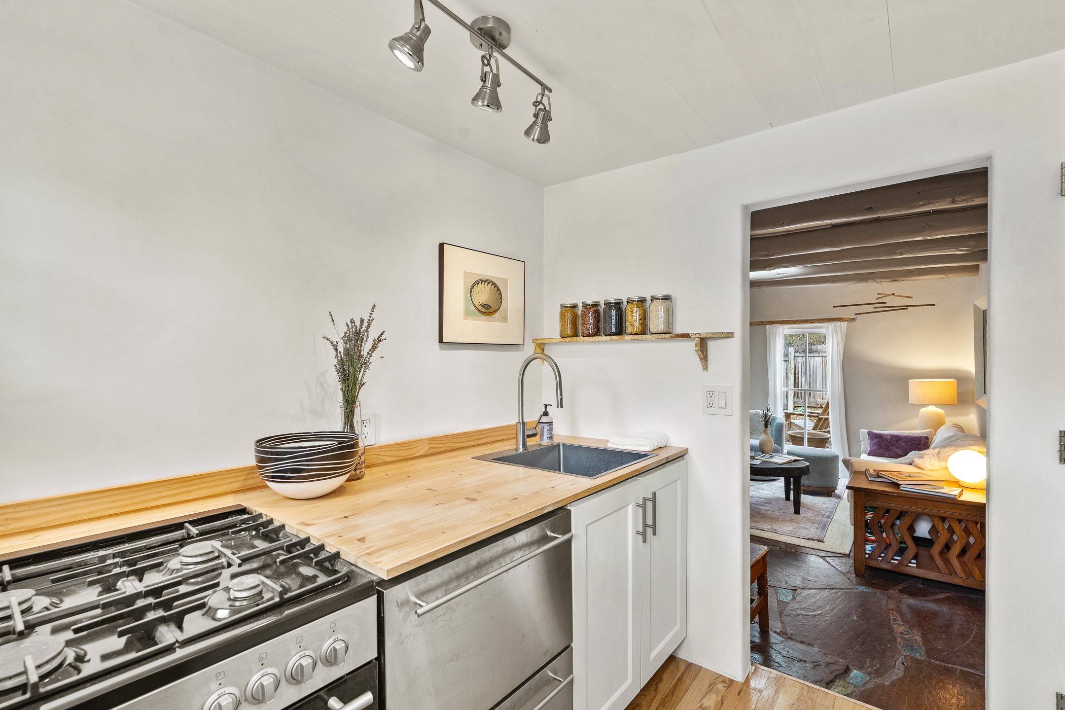 Tucked in the storied Webster Compound on Garcia Street, this enchanting adobe retreat offers a rare opportunity to live within one of Santa Fe's most culturally significant enclaves. Part of an artist colony that nurtured writers, poets, and painters. This timeless residence is more than a home. It's a connection point to Santa Fe's creative soul.Flagstone floors, hand-plastered walls, skylights, and vigas create an atmosphere that feels both grounding and uplifting, an old-world sanctuary shaped by nearly a century of history. The great room centers around an inviting kiva fireplace, its soft glow anchoring the space whether you are relaxing, dreaming, or creating. Doors and divided-light windows open to a south-facing walled garden where winter sunlight warms the adobe and summer trees cast delicate shade. The patio, lilac tree, and serene enclosure evoke the feeling of a hidden courtyard in a far-off place.The newer owner will step into a lineage. Willa Cather, Arthur Sze, Ramona Sakiestewa, Stanley Noyes, and Kon Tiki author Thor Heyerdahl once lived and created within this very compound, shaping works that traveled far beyond Santa Fe. There is a quiet hum of inspiration that lingers on these grounds, and the new steward of this residence will feel it immediately. This home whispers a sweet lullaby.The kitchen blends traditional charm with modern usefulness. Oak floors, stainless steel appliances, custom cabinets, pantry space, and a generous wood countertop. The full bath features classic Mexican tile. With a design that welcomes both simplicity and depth, the home becomes an ideal escape for contemplation, creativity, and renewal.Just moments from Downtown Subscription, Canyon Road, Garcia Street Books, Museum Hill, hiking trails, and the Plaza, this location is quintessential Eastside living, with treed lanes, intimate beauty, and the sense of belonging to a part of Santa Fe that still breathes with history, art, and human connection.