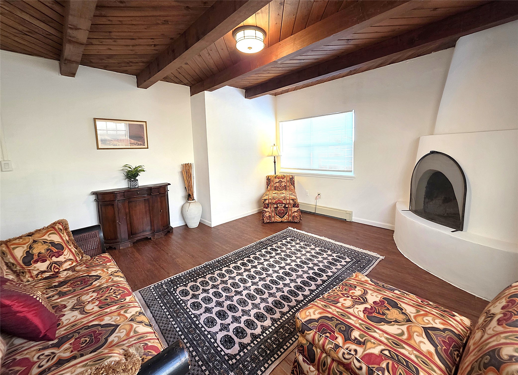 Situated in the desirable Pueblos de Rodeo neighborhood, this thoughtfully updated 1,701 sq. ft. residence offers refined Southwestern charm with modern comfort. The home features three bedrooms and two full baths, anchored by a classic kiva fireplace that brings warmth and character to the living space.The refreshed kitchen is equipped with new appliances, including a range/oven, refrigerator, and dishwasher, and flows seamlessly into a welcoming den and dining area with direct access to the private backyard patio--ideal for indoor-outdoor living.An enclosed sun-filled small room between the den and patio, complete with a new sliding glass door and discreet pet access, provides a flexible space well-suited for pet owners.Exterior and interior improvements include new flooring, fresh interior paint, new STO stucco, and a new roof with a transferable five-year warranty. The property also offers an oversized two-car garage, a fenced backyard, and a storage shed.Conveniently located near the Forked Lightning Racquet Club at the Rodeo Grounds, this home blends comfort, style, and lifestyle in one of Santa Fe's well-established neighborhoods.