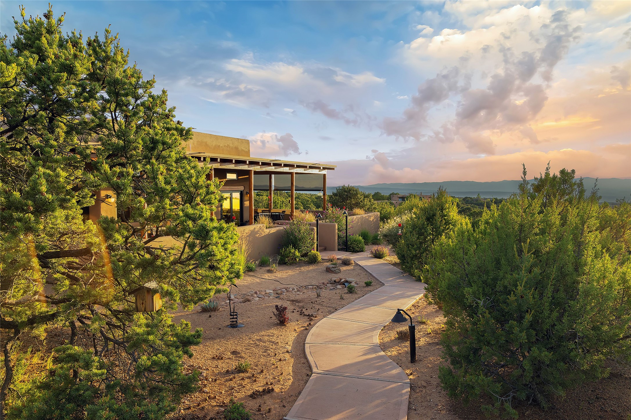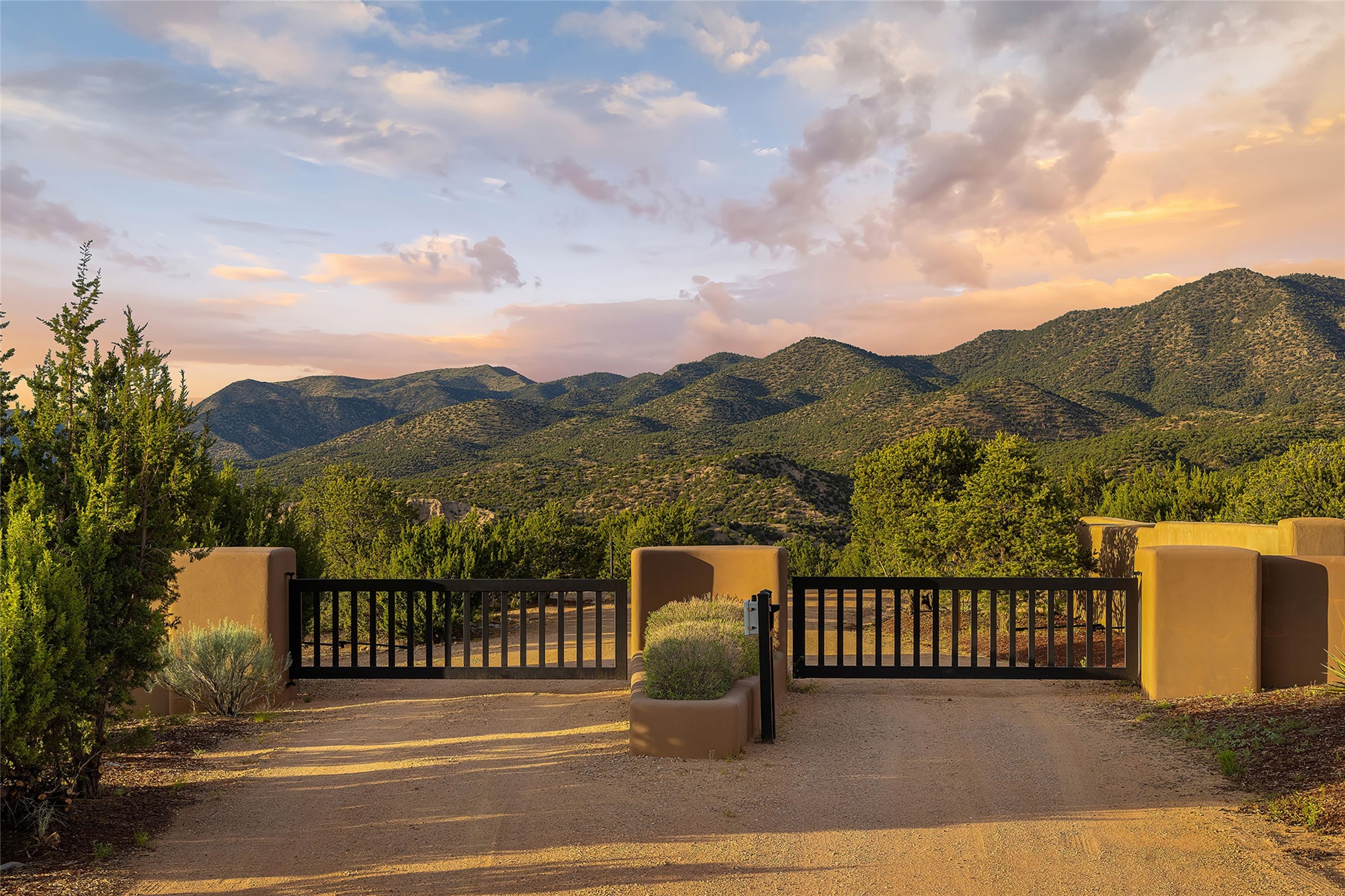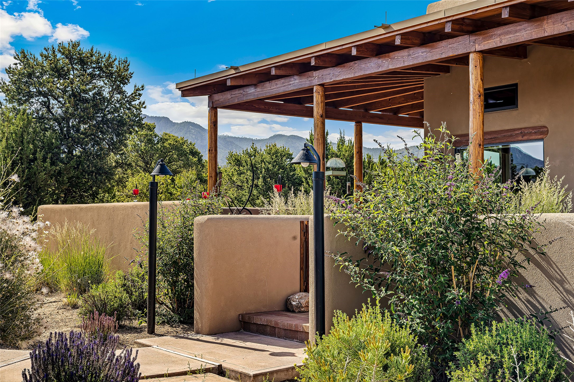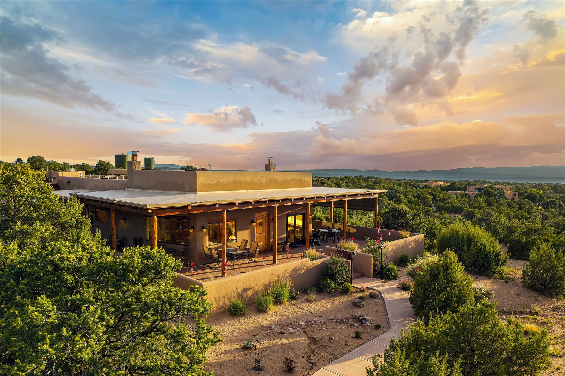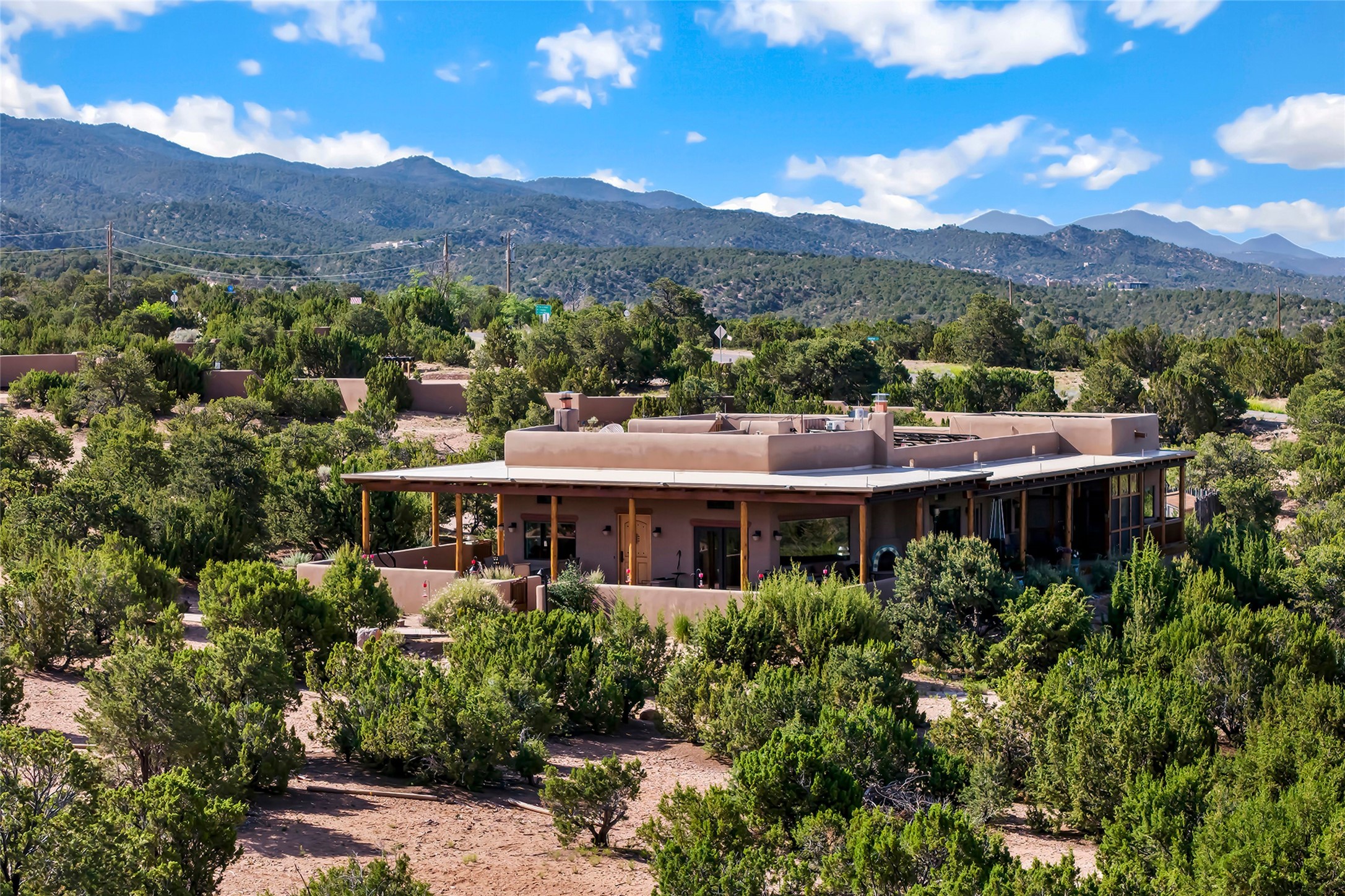 Meticulously designed by its current owners and custom built in 2014 by Tierra Concepts, this exceptional single-level Santa Fe-style residence is perched high (7200 ft) on a mesa above Tesuque Village, in the gated community of Tesuque Villas. Set on 3.5 secluded acres of beautifully landscaped environs, this solar-intensive all-electric home affords panoramic vistas in every direction - from Santa Fe Baldy and the Sangres to the east, to the entire Jemez range across the Rio Grande Valley to the west, with its fabled sunsets year-around.The front entrance opens into a spacious living and dining "great room," with a high viga-and-latilla ceiling and solid hickory flooring, and adjoining kitchen (with pantry). Its sweeping views are framed by large picture windows and a corner kiva fireplace. This majestic space links seamlessly with a wrap-around portal and walled garden, ideal for gatherings large and small, as well as outdoor dining and relaxation.A central galleried corridor continues the beautiful hickory flooring, fostering an easy, elegant flow throughout the house. It leads past the primary bedroom suite (with luxury bathroom) and two other bedrooms, to a private guest suite. These four bedrooms and their three bathrooms are well-suited to multiple purposes. The guest suite bedroom can be a music or other activity room; and another bedroom, with built-in shelving, makes an excellent office. All have magnificent views. A rooftop deck - easily accessible via outside stairway - and enclosed porch do so as well.Wonderfully secluded from town, tourists and traffic, and yet just 15 minutes from downtown Santa Fe, this gem of a home and location is not too close to town for comfort, but is close enough. Only moments from the Four Seasons Resort, and not far from the Tesuque Village Market, it perfectly blends tranquility, craftsmanship, and breathtaking views in one of Santa Fe's most coveted settings.