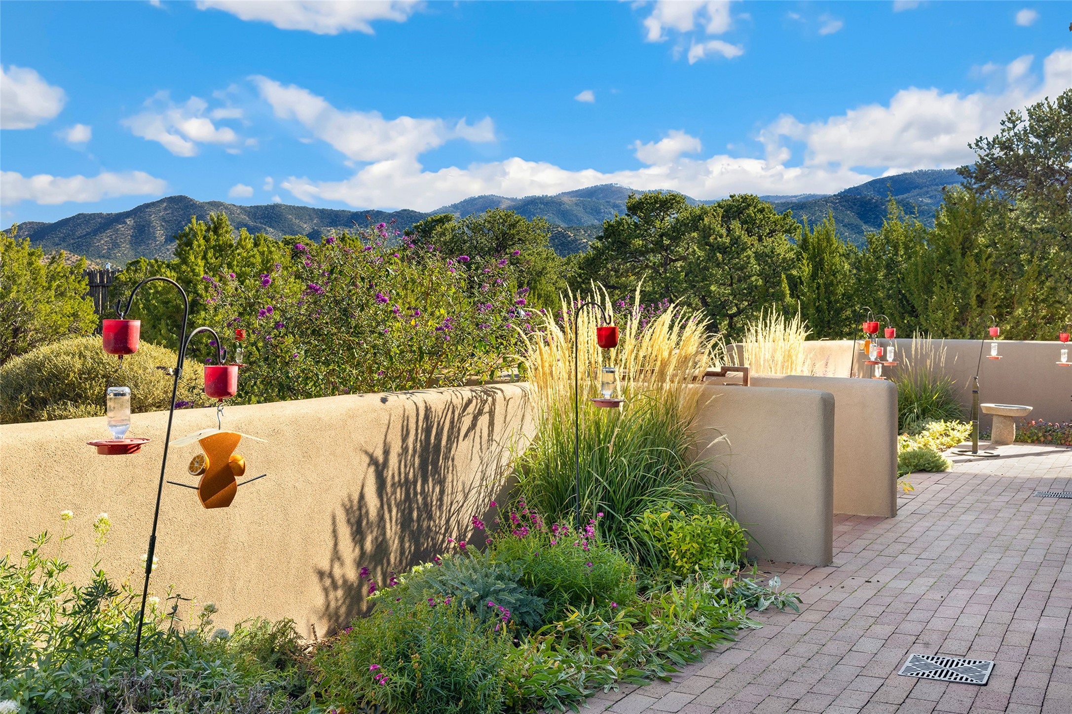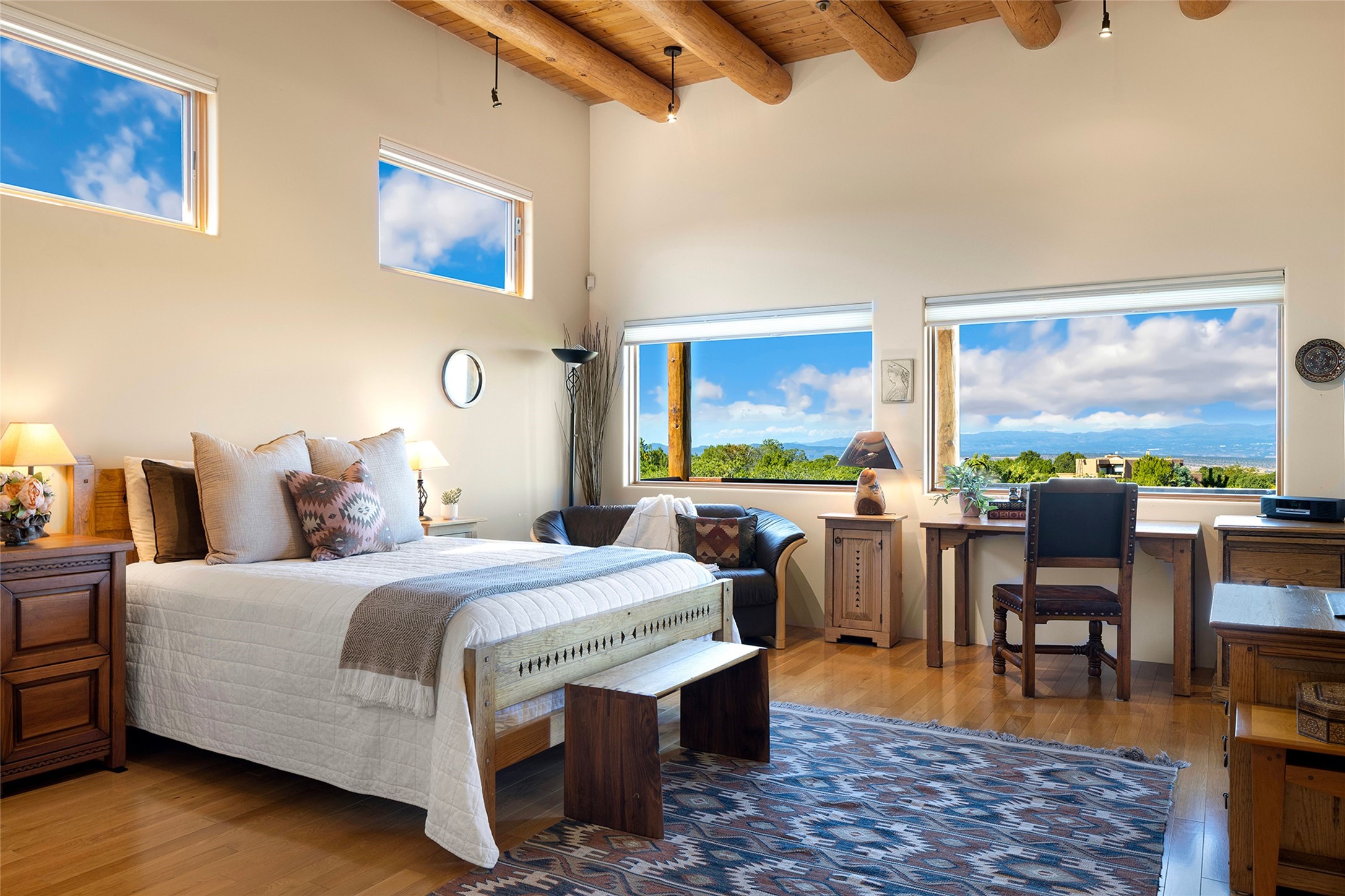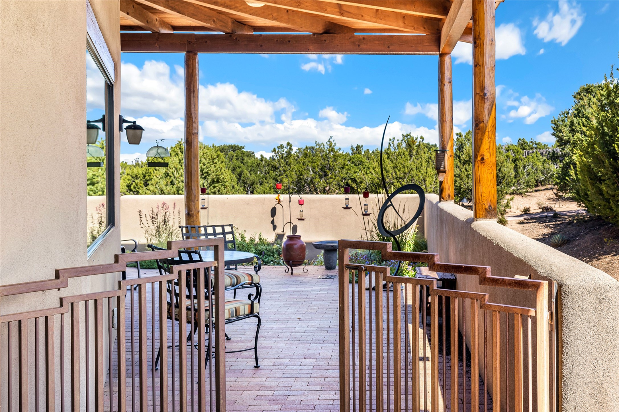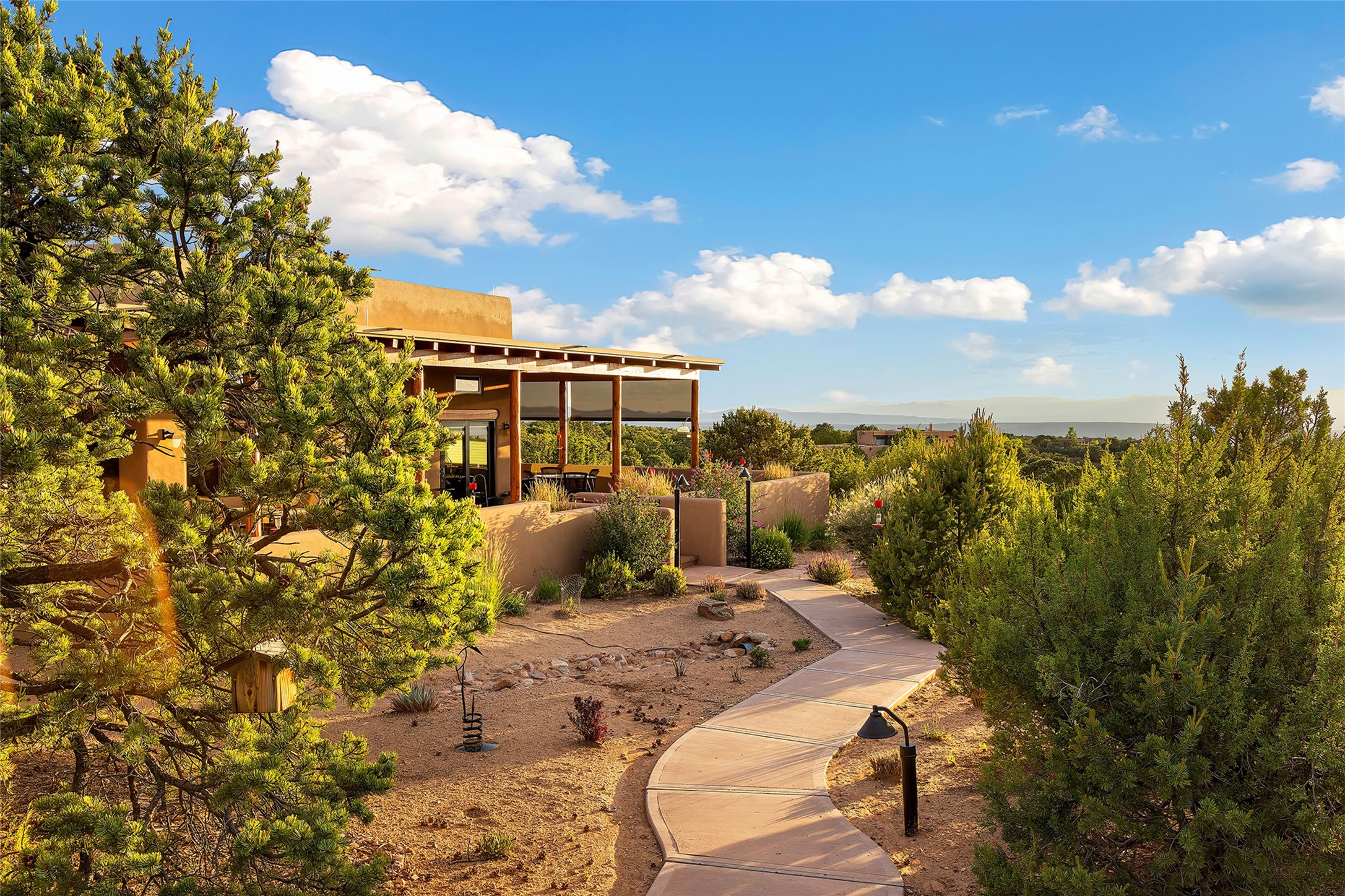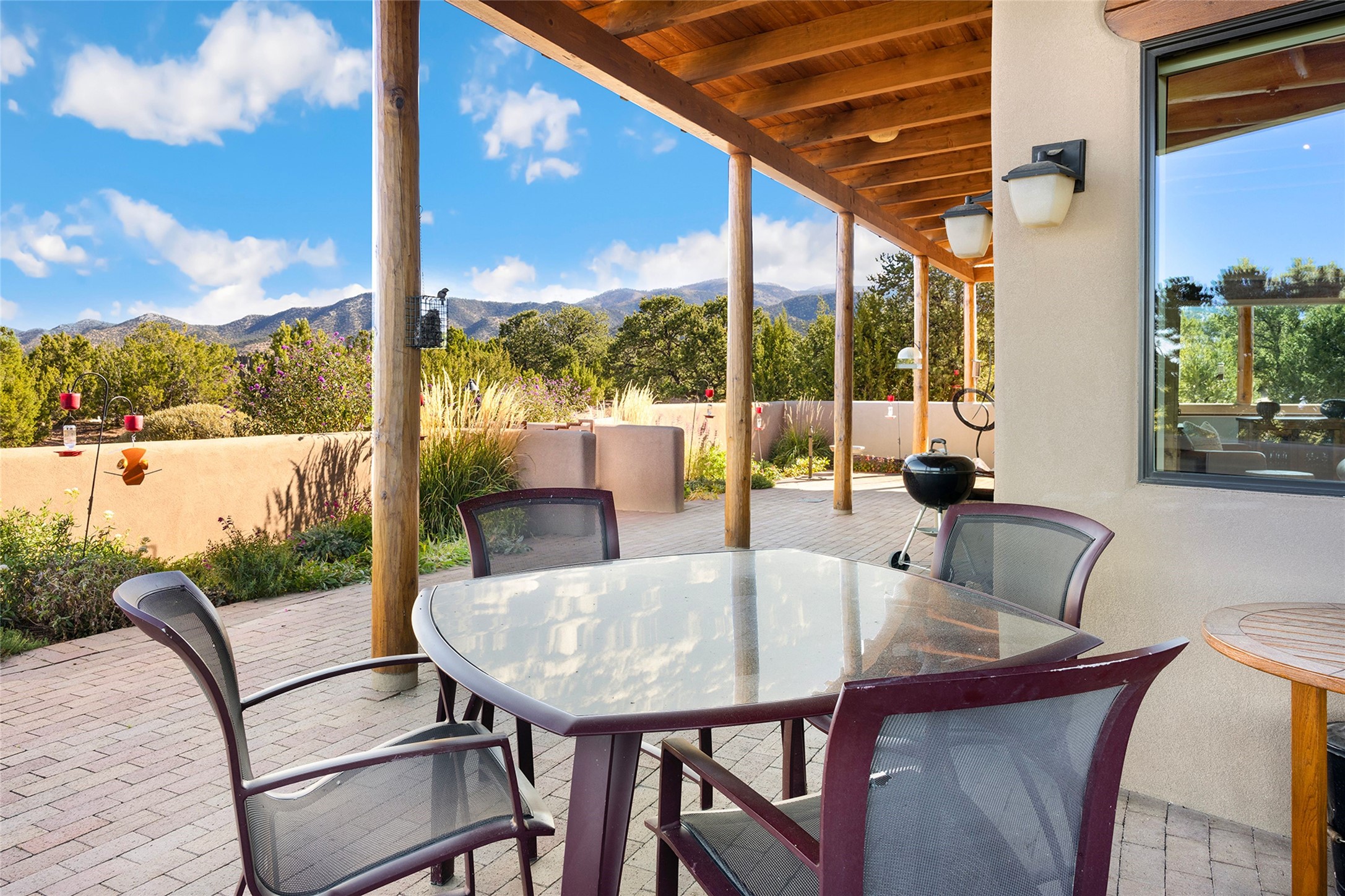 Meticulously designed by its current owners and custom built in 2014 by Tierra Concepts, this exceptional single-level Santa Fe-style residence is perched high (7200 ft) on a mesa above Tesuque Village, in the gated community of Tesuque Villas. Set on 3.5 secluded acres of beautifully landscaped environs, this solar-intensive all-electric home affords panoramic vistas in every direction - from Santa Fe Baldy and the Sangres to the east, to the entire Jemez range across the Rio Grande Valley to the west, with its fabled sunsets year-around.The front entrance opens into a spacious living and dining "great room," with a high viga-and-latilla ceiling and solid hickory flooring, and adjoining kitchen (with pantry). Its sweeping views are framed by large picture windows and a corner kiva fireplace. This majestic space links seamlessly with a wrap-around portal and walled garden, ideal for gatherings large and small, as well as outdoor dining and relaxation.A central galleried corridor continues the beautiful hickory flooring, fostering an easy, elegant flow throughout the house. It leads past the primary bedroom suite (with luxury bathroom) and two other bedrooms, to a private guest suite. These four bedrooms and their three bathrooms are well-suited to multiple purposes. The guest suite bedroom can be a music or other activity room; and another bedroom, with built-in shelving, makes an excellent office. All have magnificent views. A rooftop deck - easily accessible via outside stairway - and enclosed porch do so as well.Wonderfully secluded from town, tourists and traffic, and yet just 15 minutes from downtown Santa Fe, this gem of a home and location is not too close to town for comfort, but is close enough. Only moments from the Four Seasons Resort, and not far from the Tesuque Village Market, it perfectly blends tranquility, craftsmanship, and breathtaking views in one of Santa Fe's most coveted settings.