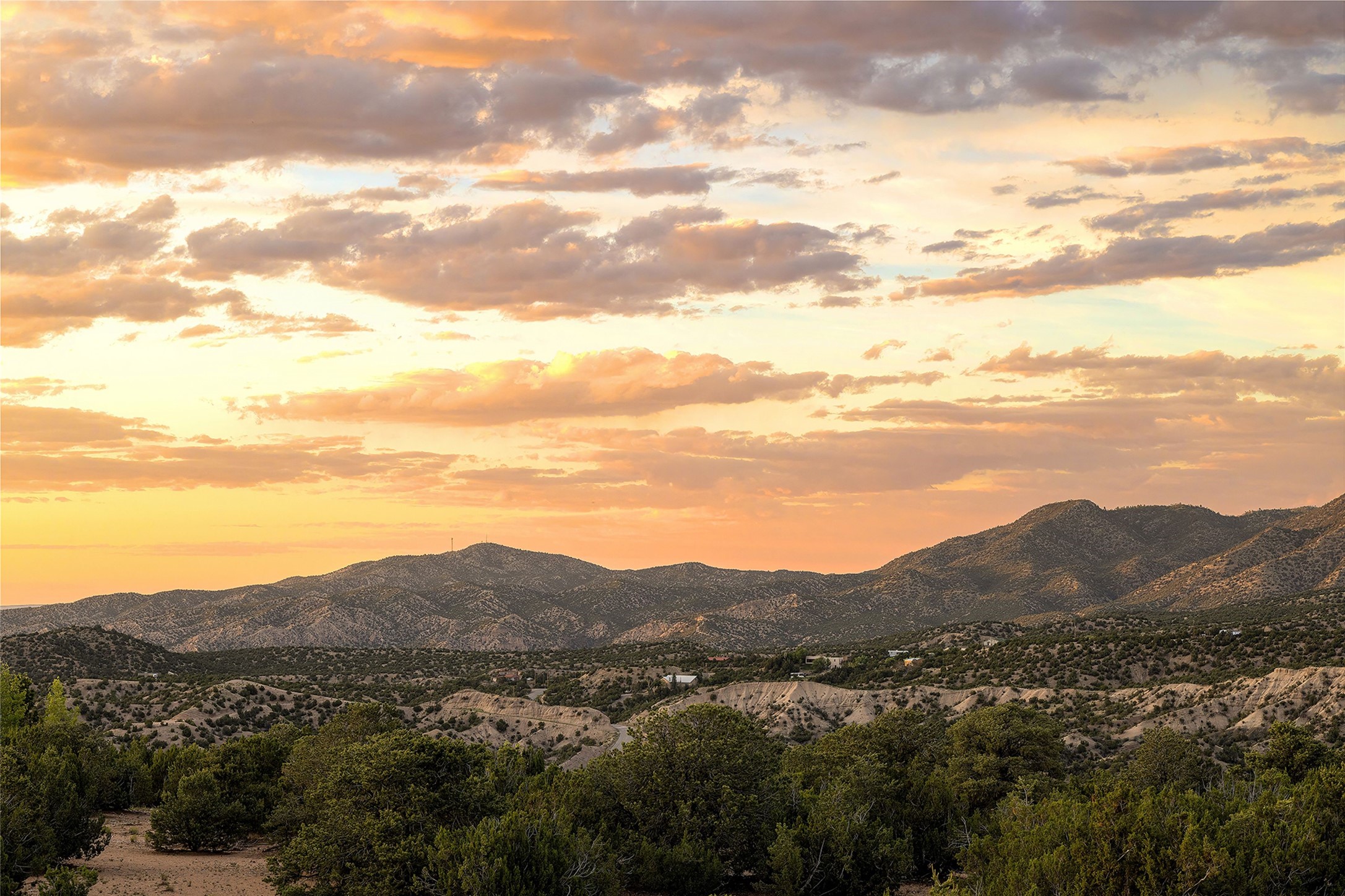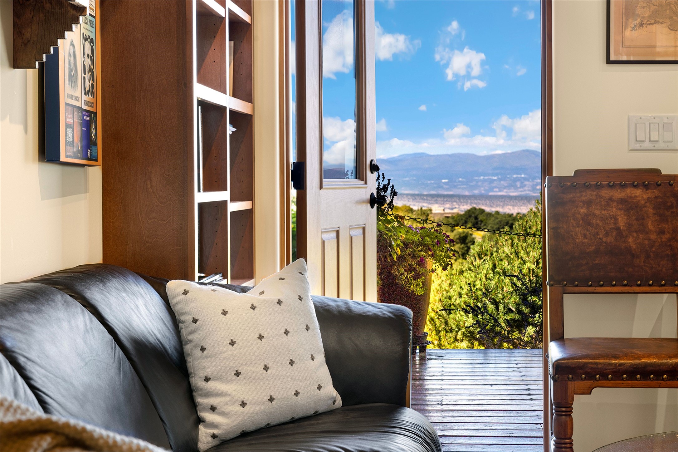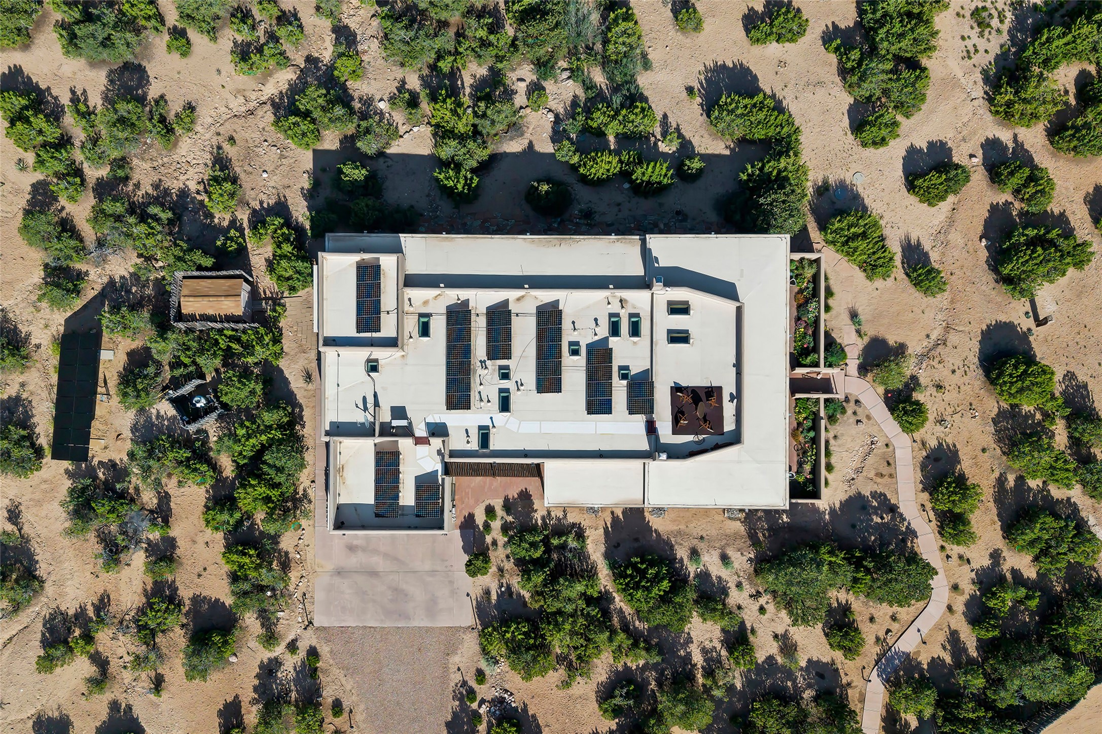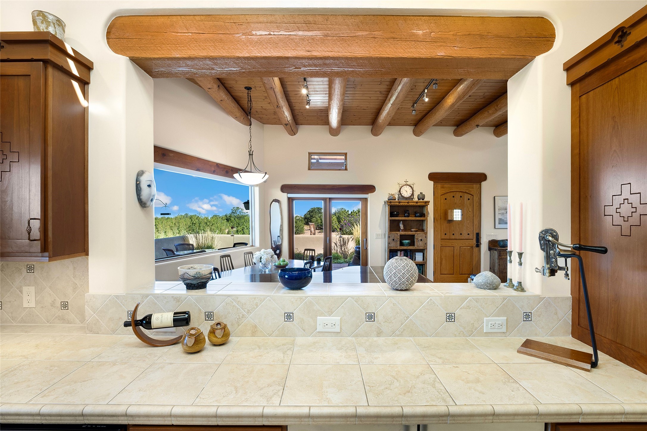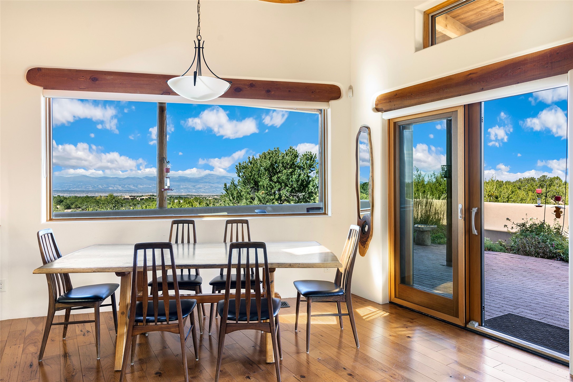 Meticulously designed by its current owners and custom built in 2014 by Tierra Concepts, this exceptional single-level Santa Fe-style residence is perched high (7200 ft) on a mesa above Tesuque Village, in the gated community of Tesuque Villas. Set on 3.5 secluded acres of beautifully landscaped environs, this solar-intensive all-electric home affords panoramic vistas in every direction - from Santa Fe Baldy and the Sangres to the east, to the entire Jemez range across the Rio Grande Valley to the west, with its fabled sunsets year-around.The front entrance opens into a spacious living and dining "great room," with a high viga-and-latilla ceiling and solid hickory flooring, and adjoining kitchen (with pantry). Its sweeping views are framed by large picture windows and a corner kiva fireplace. This majestic space links seamlessly with a wrap-around portal and walled garden, ideal for gatherings large and small, as well as outdoor dining and relaxation.A central galleried corridor continues the beautiful hickory flooring, fostering an easy, elegant flow throughout the house. It leads past the primary bedroom suite (with luxury bathroom) and two other bedrooms, to a private guest suite. These four bedrooms and their three bathrooms are well-suited to multiple purposes. The guest suite bedroom can be a music or other activity room; and another bedroom, with built-in shelving, makes an excellent office. All have magnificent views. A rooftop deck - easily accessible via outside stairway - and enclosed porch do so as well.Wonderfully secluded from town, tourists and traffic, and yet just 15 minutes from downtown Santa Fe, this gem of a home and location is not too close to town for comfort, but is close enough. Only moments from the Four Seasons Resort, and not far from the Tesuque Village Market, it perfectly blends tranquility, craftsmanship, and breathtaking views in one of Santa Fe's most coveted settings.