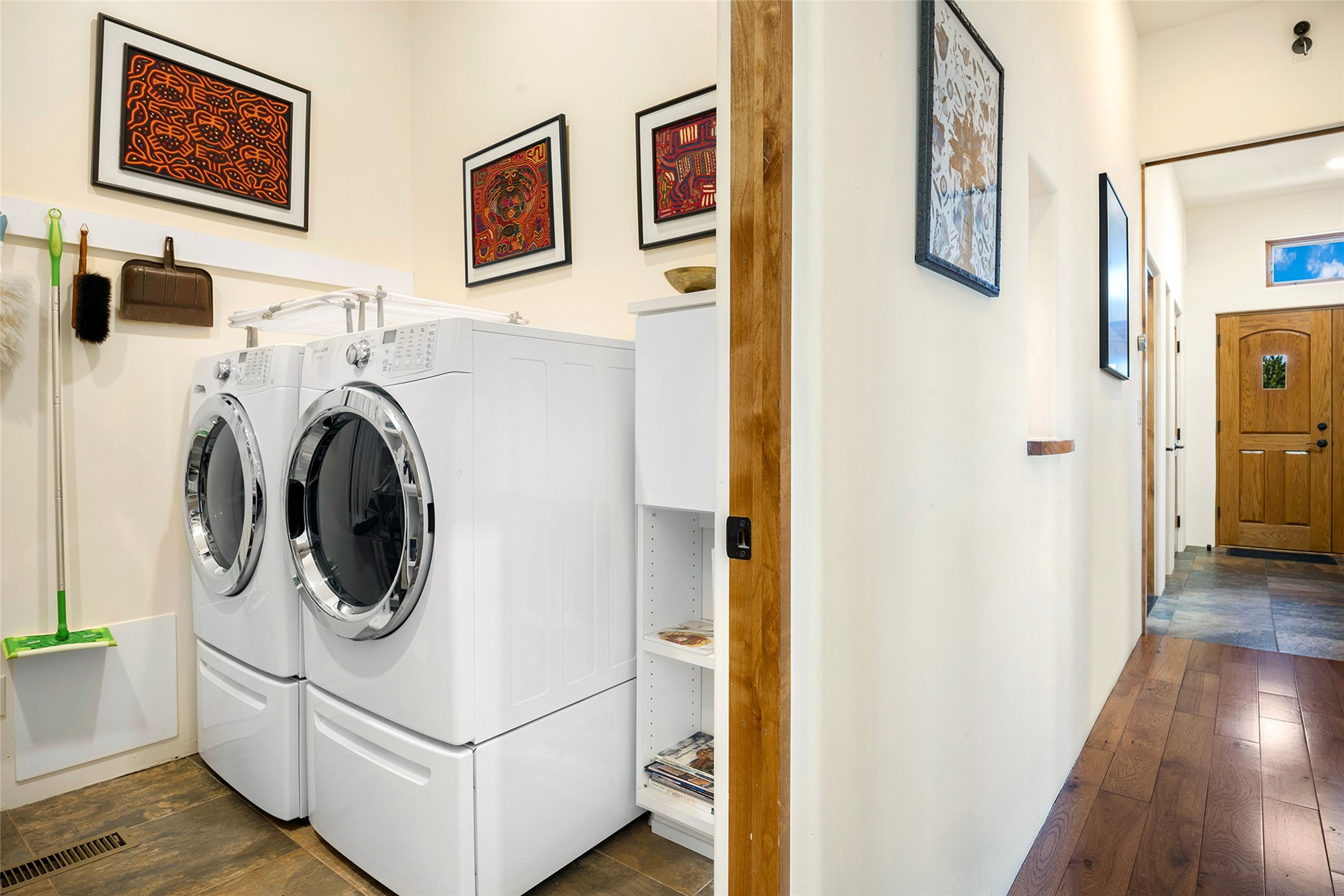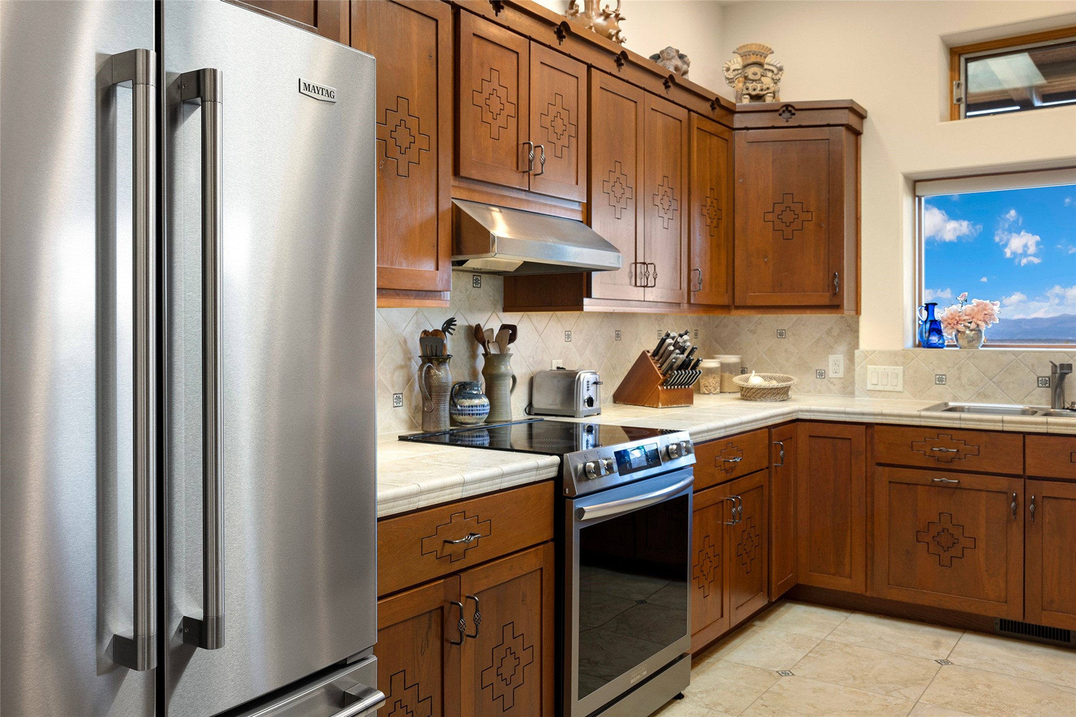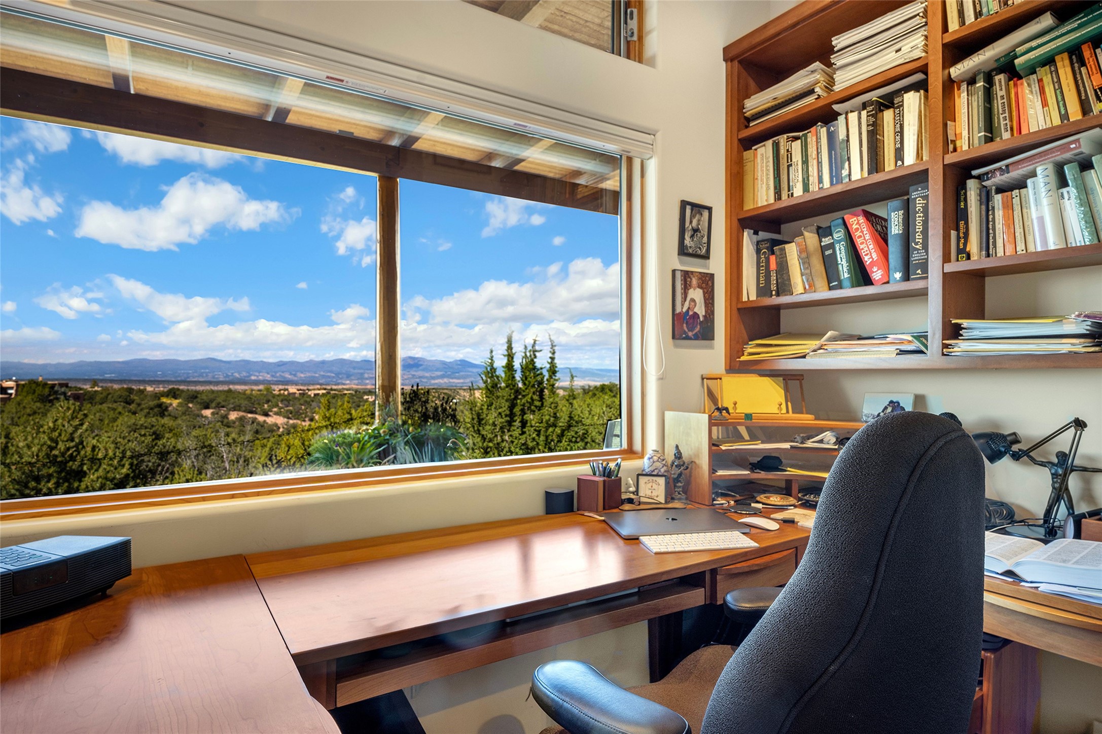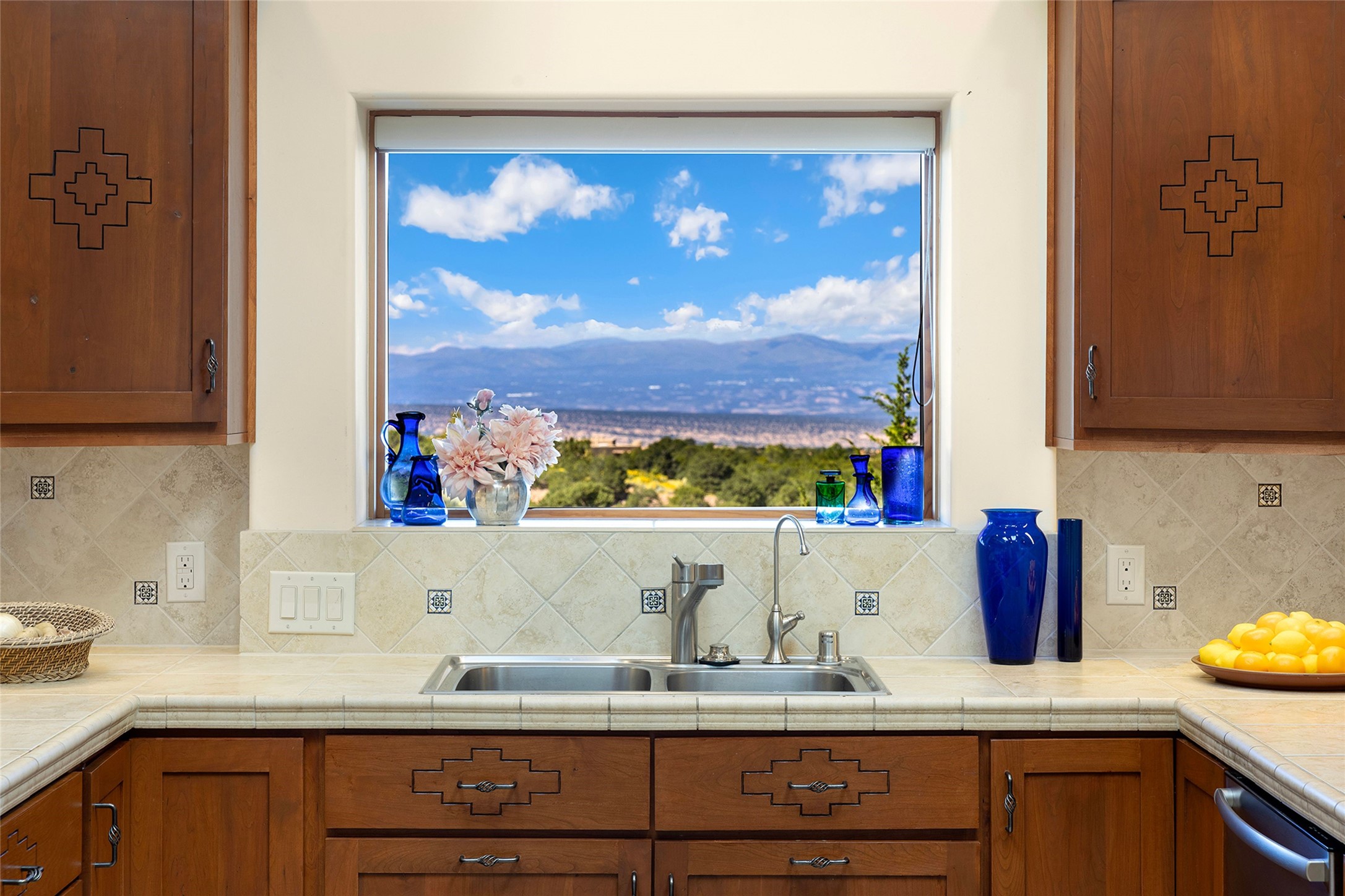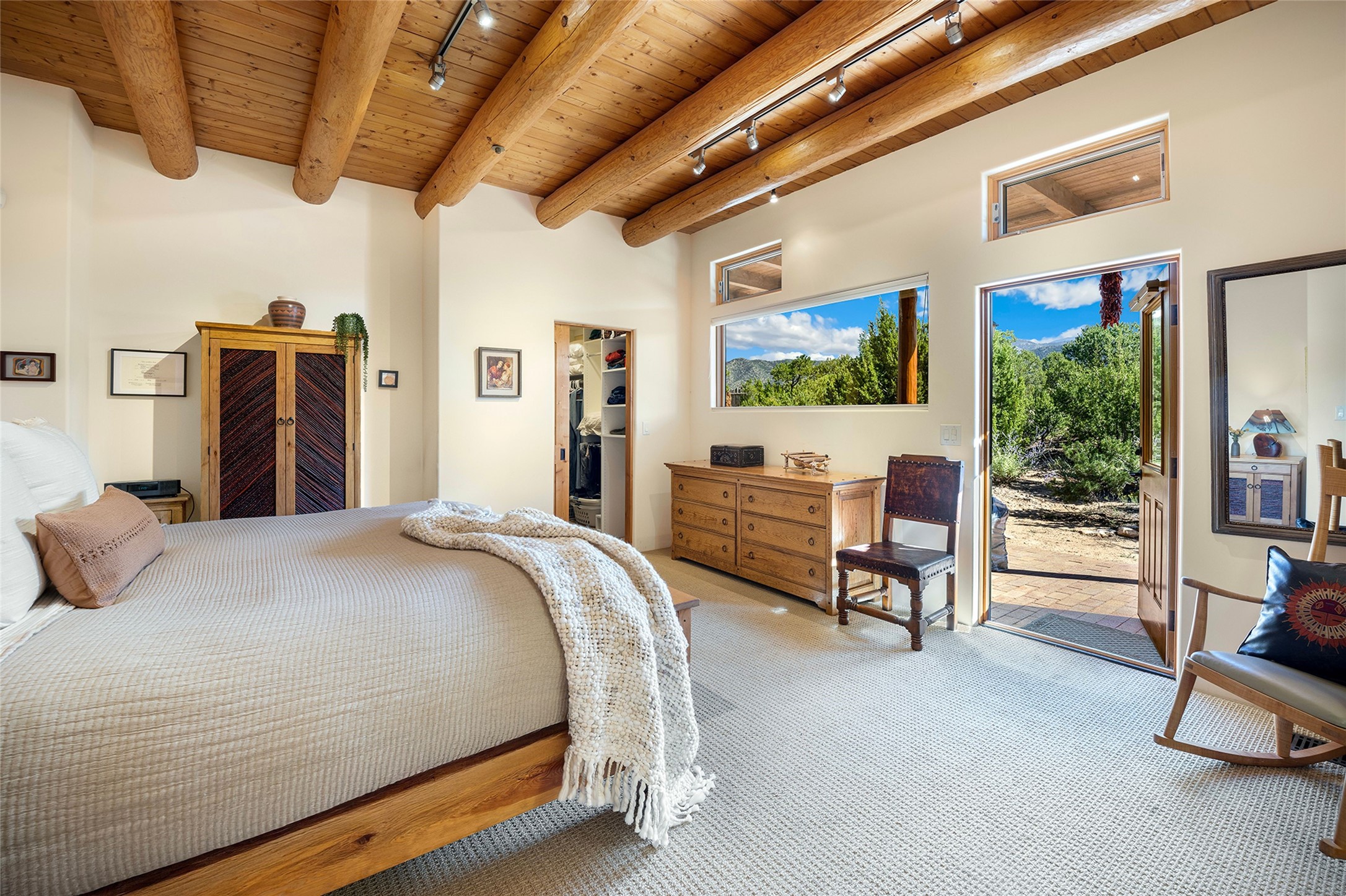 Meticulously designed by its current owners and custom built in 2014 by Tierra Concepts, this exceptional single-level Santa Fe-style residence is perched high (7200 ft) on a mesa above Tesuque Village, in the gated community of Tesuque Villas. Set on 3.5 secluded acres of beautifully landscaped environs, this solar-intensive all-electric home affords panoramic vistas in every direction - from Santa Fe Baldy and the Sangres to the east, to the entire Jemez range across the Rio Grande Valley to the west, with its fabled sunsets year-around.The front entrance opens into a spacious living and dining "great room," with a high viga-and-latilla ceiling and solid hickory flooring, and adjoining kitchen (with pantry). Its sweeping views are framed by large picture windows and a corner kiva fireplace. This majestic space links seamlessly with a wrap-around portal and walled garden, ideal for gatherings large and small, as well as outdoor dining and relaxation.A central galleried corridor continues the beautiful hickory flooring, fostering an easy, elegant flow throughout the house. It leads past the primary bedroom suite (with luxury bathroom) and two other bedrooms, to a private guest suite. These four bedrooms and their three bathrooms are well-suited to multiple purposes. The guest suite bedroom can be a music or other activity room; and another bedroom, with built-in shelving, makes an excellent office. All have magnificent views. A rooftop deck - easily accessible via outside stairway - and enclosed porch do so as well.Wonderfully secluded from town, tourists and traffic, and yet just 15 minutes from downtown Santa Fe, this gem of a home and location is not too close to town for comfort, but is close enough. Only moments from the Four Seasons Resort, and not far from the Tesuque Village Market, it perfectly blends tranquility, craftsmanship, and breathtaking views in one of Santa Fe's most coveted settings.