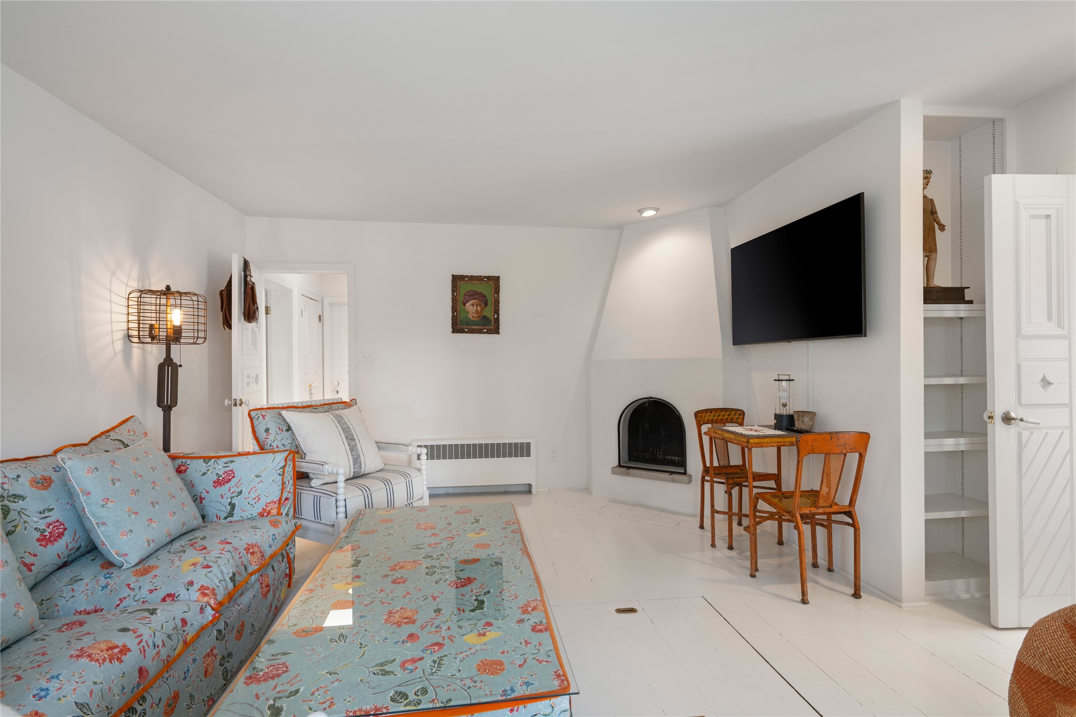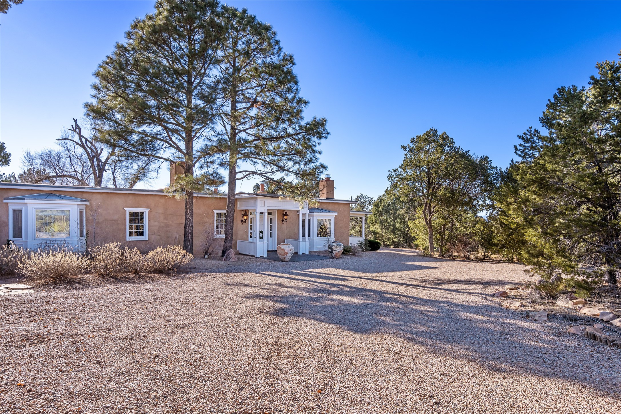 Privately nestled among mature trees on nearly three acres, this distinguished New Mexico Territorial-style estate captures sweeping views of the Sangre de Cristo, Sandia, and Ortiz Mountains. Timeless architecture and thoughtful craftsmanship define the 3,600-square-foot main residence, where a gracious brick-floored entry hall creates an immediate sense of arrival and seamlessly connects the home's refined living spaces. A separate one bedroom, one bath guest house offers a welcoming retreat for visitors, complete with a living and dining area, full kitchen, and private patio. The property also offers a substantial heated, detached garage/studio that presents endless possibilities as an artist's studio, workshop, or collector's showroom. Designed for both elegant entertaining and everyday comfort, the residence offers four bedrooms, four bathrooms, formal dining room, and a generous eat-in kitchen. The serene primary suite is a private sanctuary, featuring its own media room, walk-in closet, and secluded portal--perfect for quiet mornings or sunset views. Eight fireplaces throughout the home, including one on the expansive backyard portal, provide warmth, ambiance, and year-round livability. Multiple portals invite effortless indoor-outdoor living, ideal for enjoying Santa Fe's celebrated climate and breathtaking mountain vistas. Located in Santa Fe's coveted Historic Eastside, this exceptional property offers rare privacy just minutes from renowned hiking trails, Museum Hill, Canyon Road, and the Downtown Plaza--an extraordinary opportunity to experience refined living at the heart of Northern New Mexico's cultural landscape.