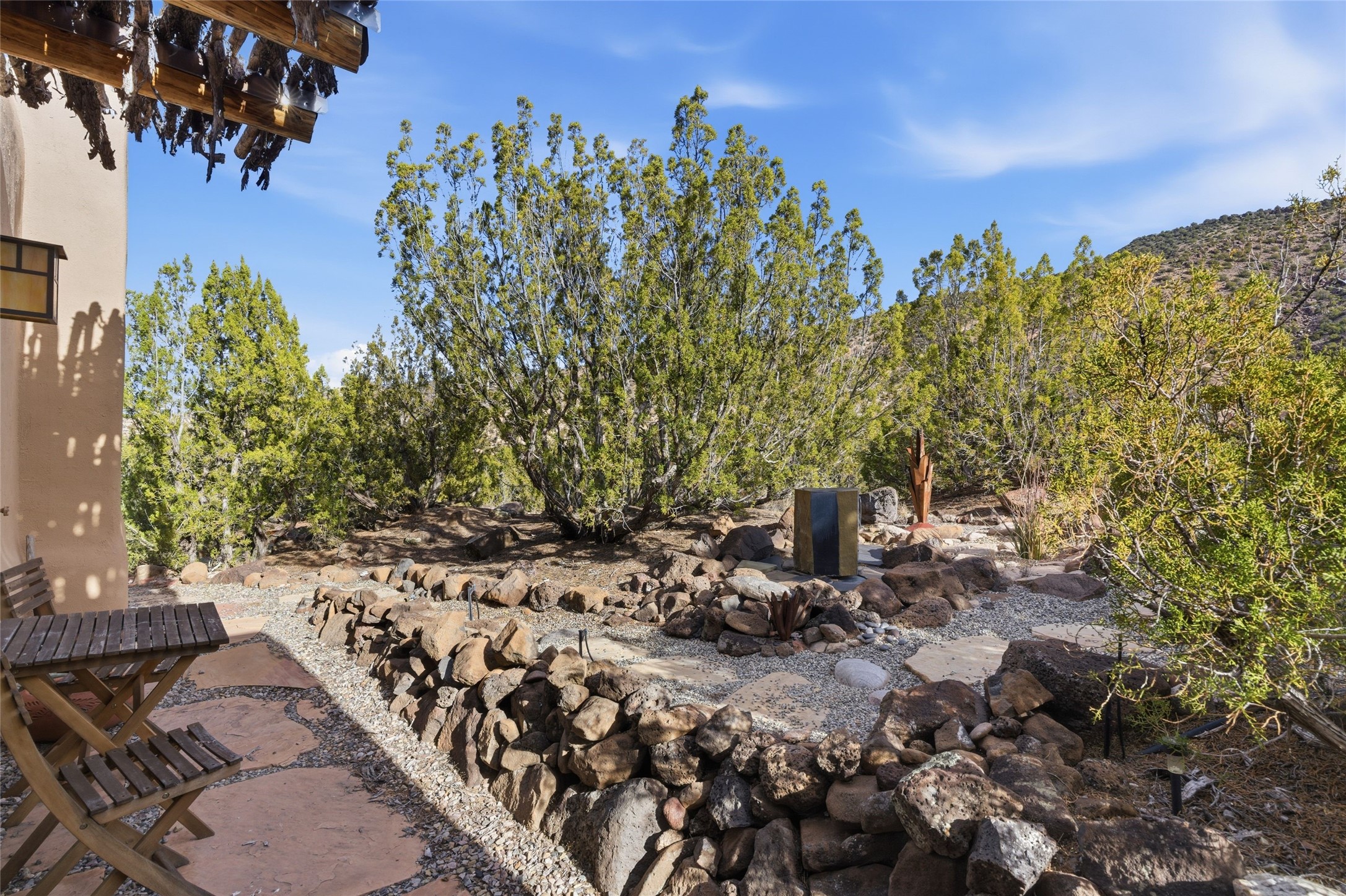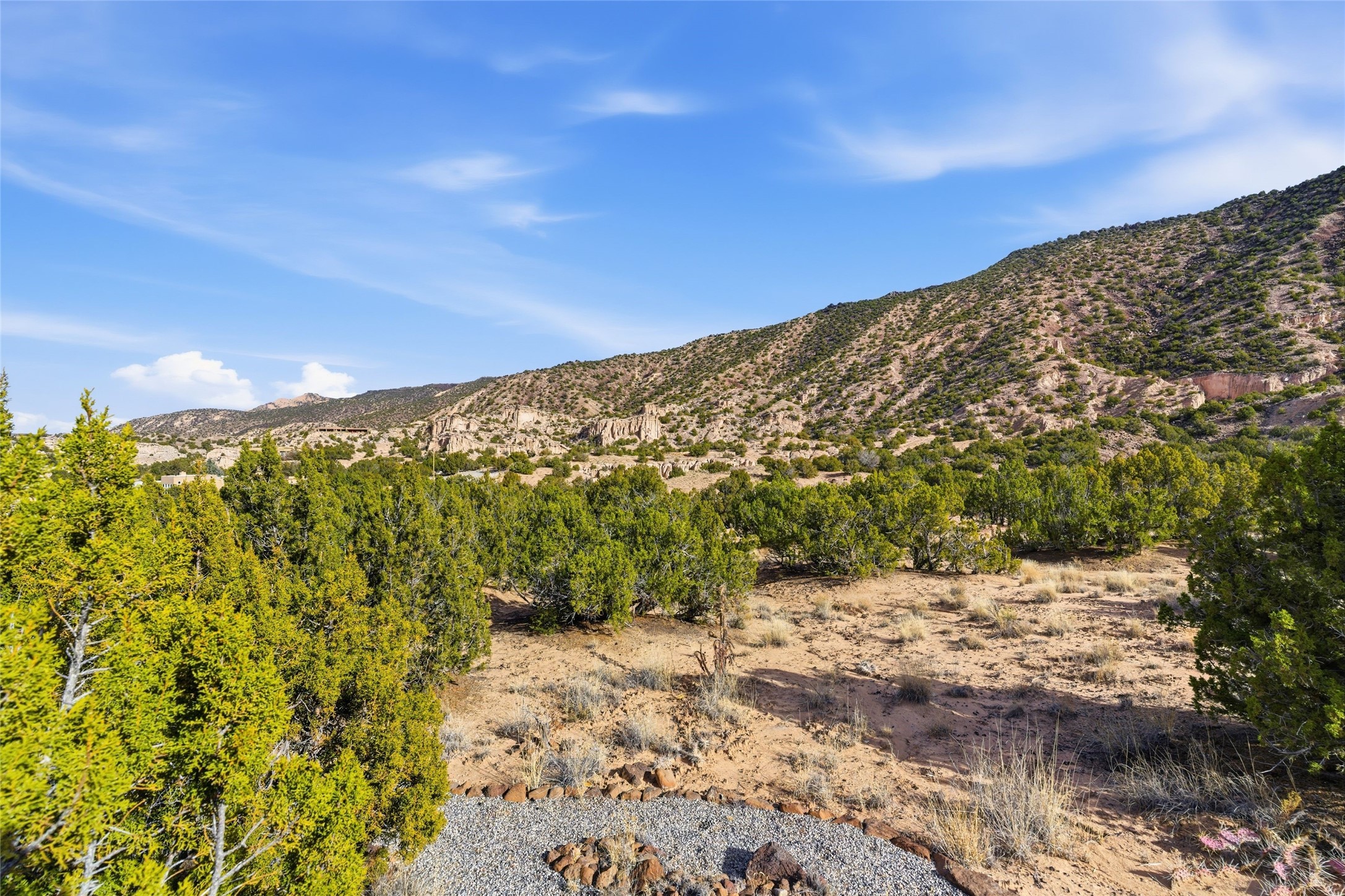 Tucked within a gated community and sited on approximately 13 acres, this Anasazi casita, one of 10 free-standing condo's offers an inviting single-level one-bedroom, one-bath residence offers a peaceful retreat framed by dramatic views of the White Cliffs and the surrounding natural landscape. Built in 1997, the home provides approximately 825 square feet of thoughtfully designed living space, featuring radiant in-floor heating and a charming kiva-style wood-burning fireplace that creates a warm and comfortable atmosphere year-round. Classic Santa Fe style elements are showcased throughout, including Saltillo tile floors, hand-carved beams, and custom doors that add character and timeless appeal. The layout flows easily for everyday living or weekend escapes, emphasizing comfort and a strong connection to the outdoors.The home is surrounded by outdoor patios, offering ideal spaces for relaxing, restaurant, or simply taking in the expansive scenery and changing light throughout the day. Water is supplied through a shared well system serving the community.Ideally located with convenient access to both Los Alamos and Santa Fe, this property also serves as a perfect launching point for scenic day trips to Taos and the Ojo Caliente Hot Springs. Whether used as a full-time residence, seasonal getaway, or investment opportunity, this home offers a unique blend of privacy, ease, and Northern New Mexico lifestyle.