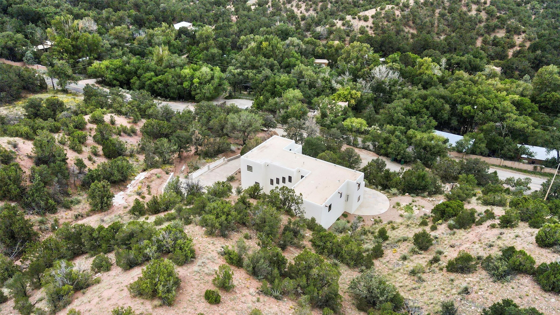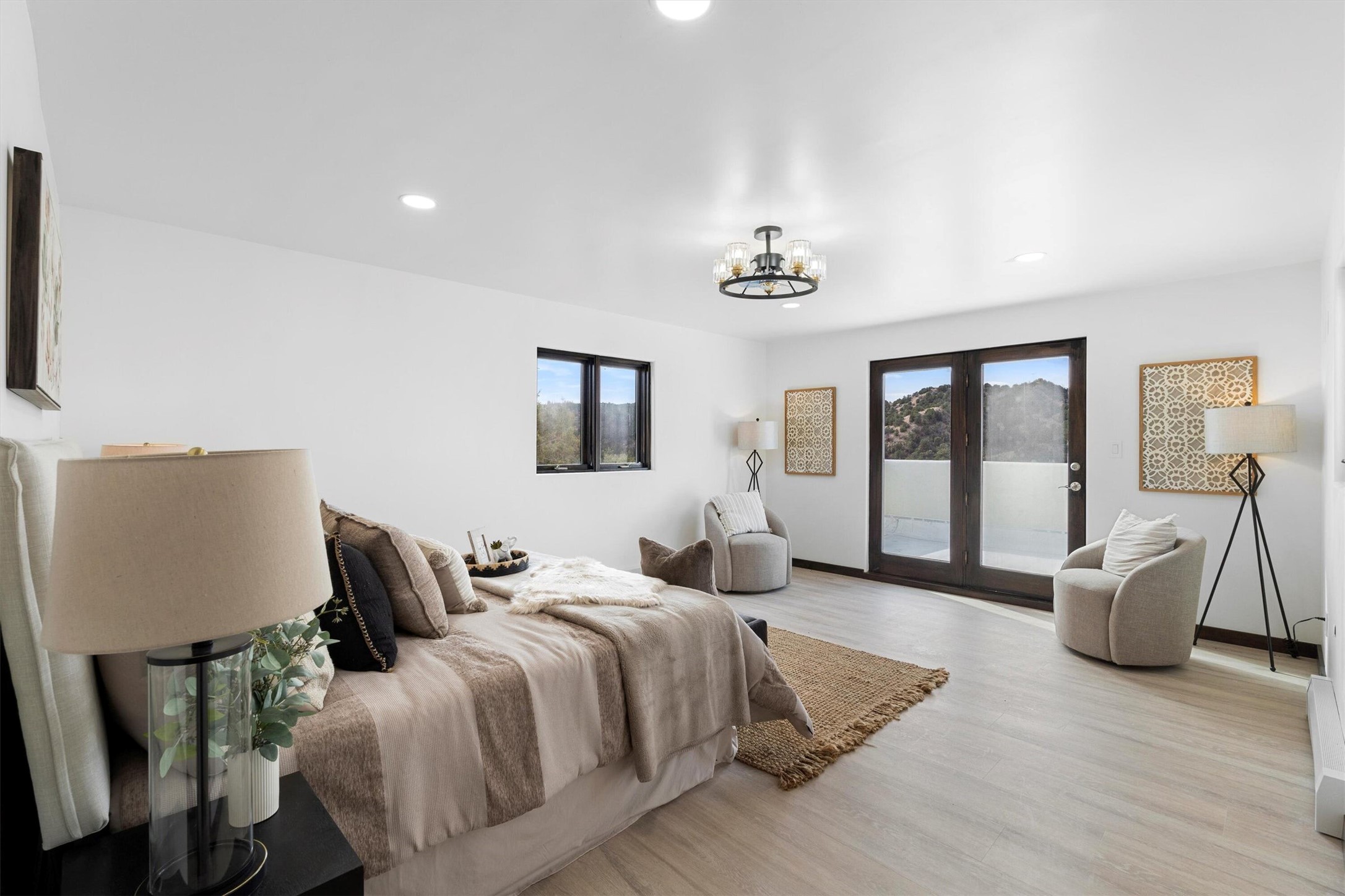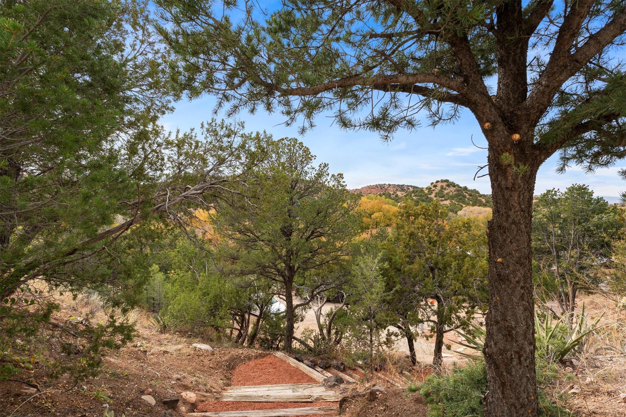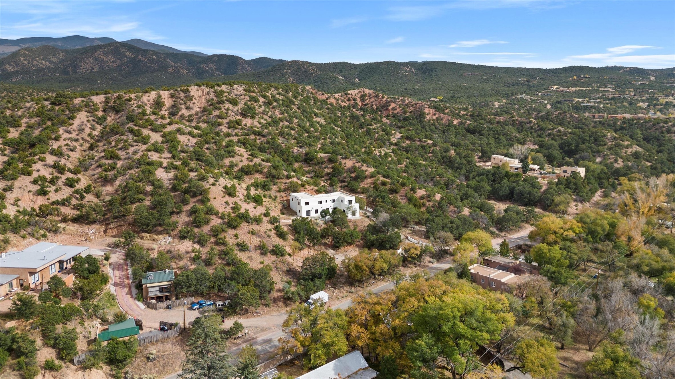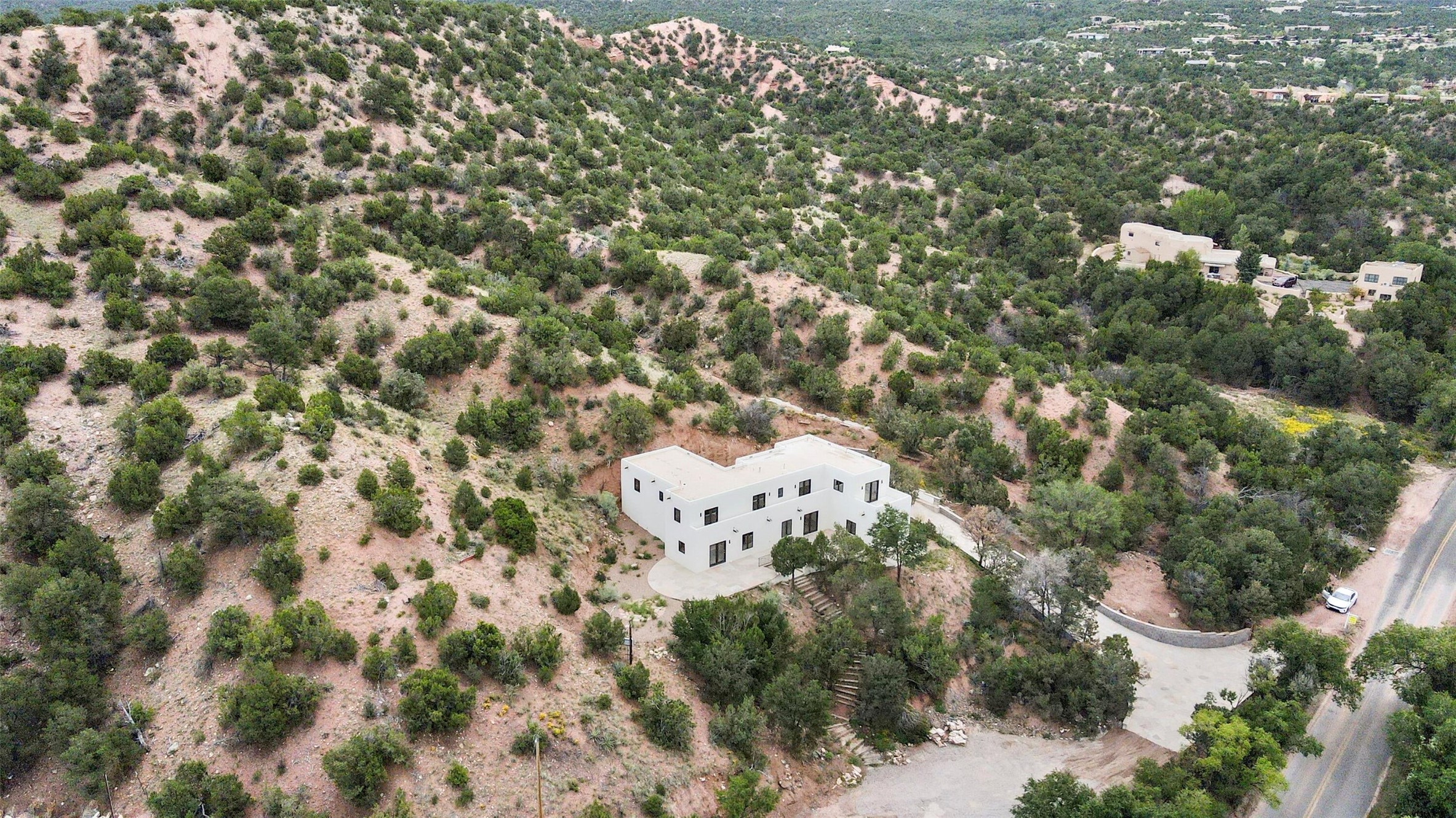 This updated Southwest-style home is waiting for you! Step inside to discover a stunning custom-built gourmet kitchen featuring a generous 8-foot island and elegant quartz countertops, complete with all-new stainless steel appliances. The home showcases beautiful vigas throughout and offers an open living space highlighted by a cozy Kiva gas fireplace, perfect for relaxation or as a flexible area tailored to your needs. French doors lead to an inviting open patio, where you can soak in breathtaking views of the Jemez Mountains. This residence boasts two primary suites, each with spacious walk-in closets, and a convenient stackable washer and dryer located in the main primary bedroom closet in addition to the large laundry room located on the first floor.Each full bathroom is designed with double vanities, custom knotty alder cabinets, and stylish LED-lit vanity mirrors. Enjoy the convenience of a laundry chute on the second floor and an attached two-car garage, with ample parking available for guests on both the upper and lower levels. Best feature is the new stone paved private driveway!Situated in a prime location, this home is adjacent to the renowned Bishops Lodge Resort, Spa, and Horse Stables, offering an unparalleled lifestyle of comfort and leisure. Geotechnical report available to your realtor.