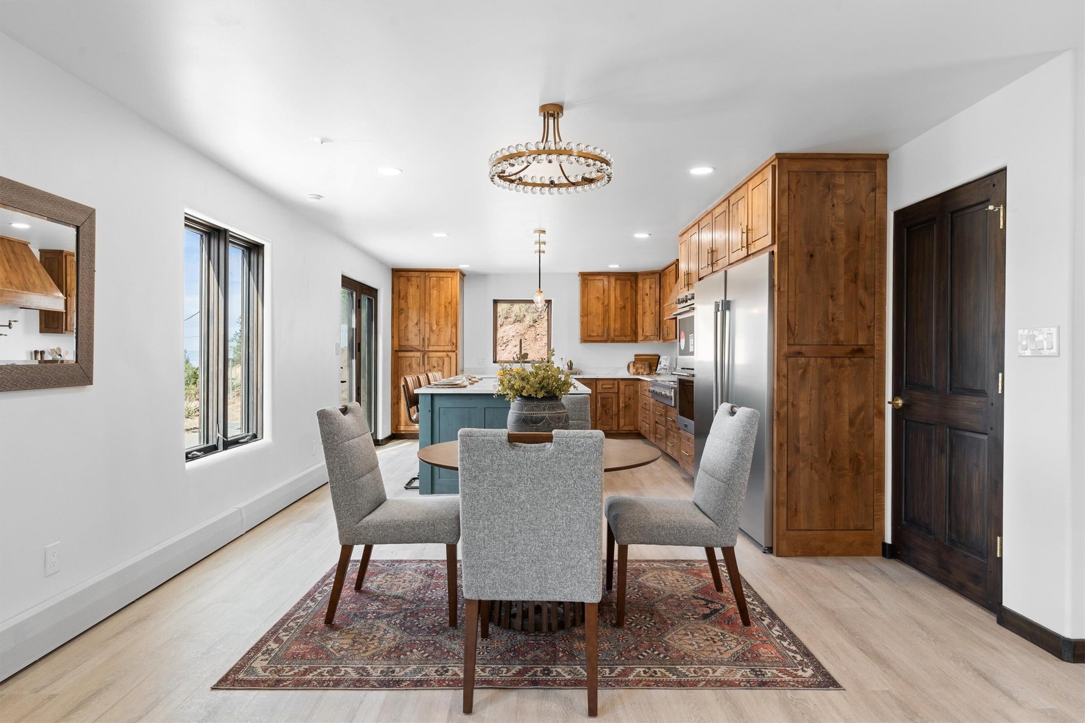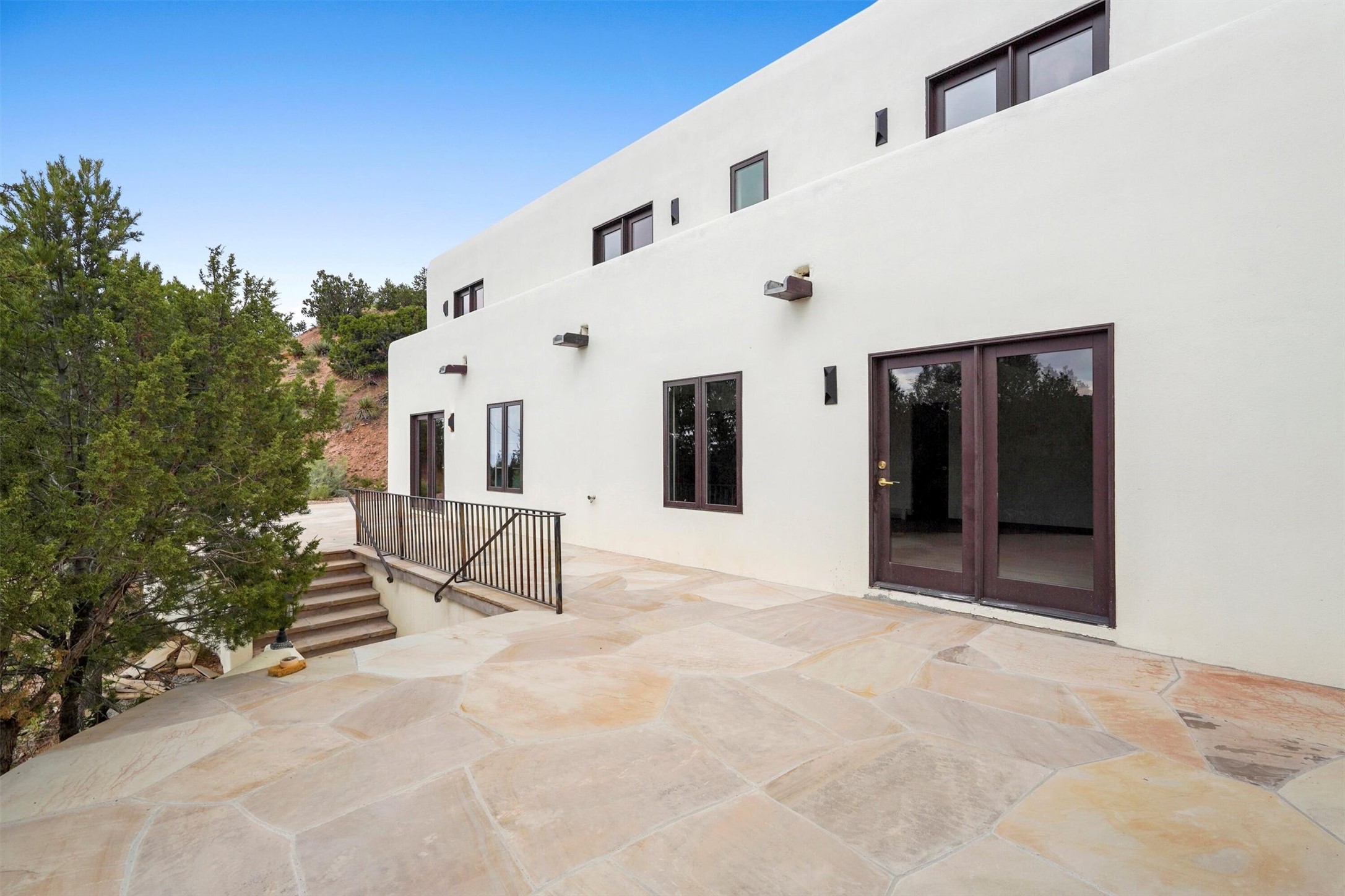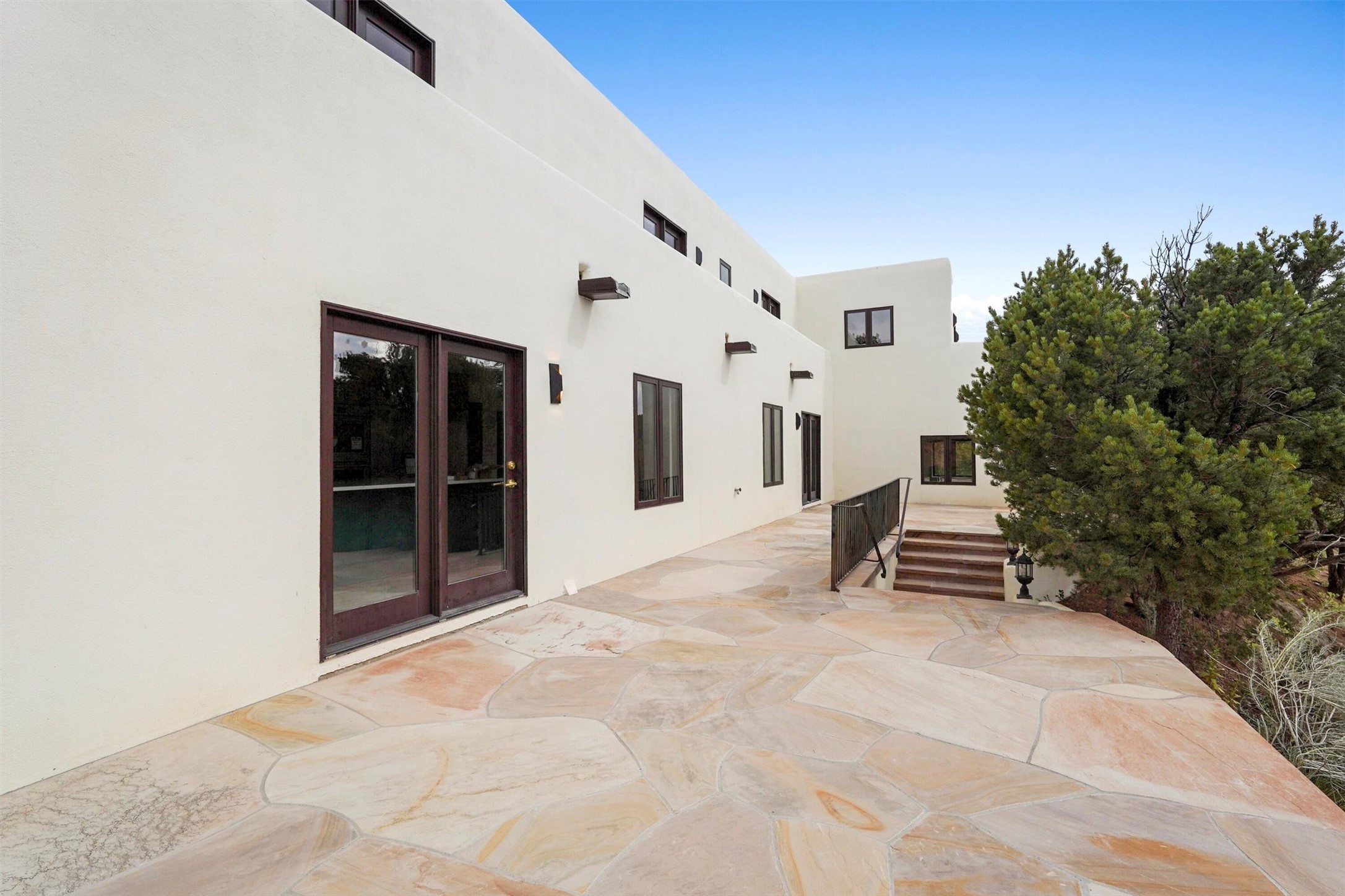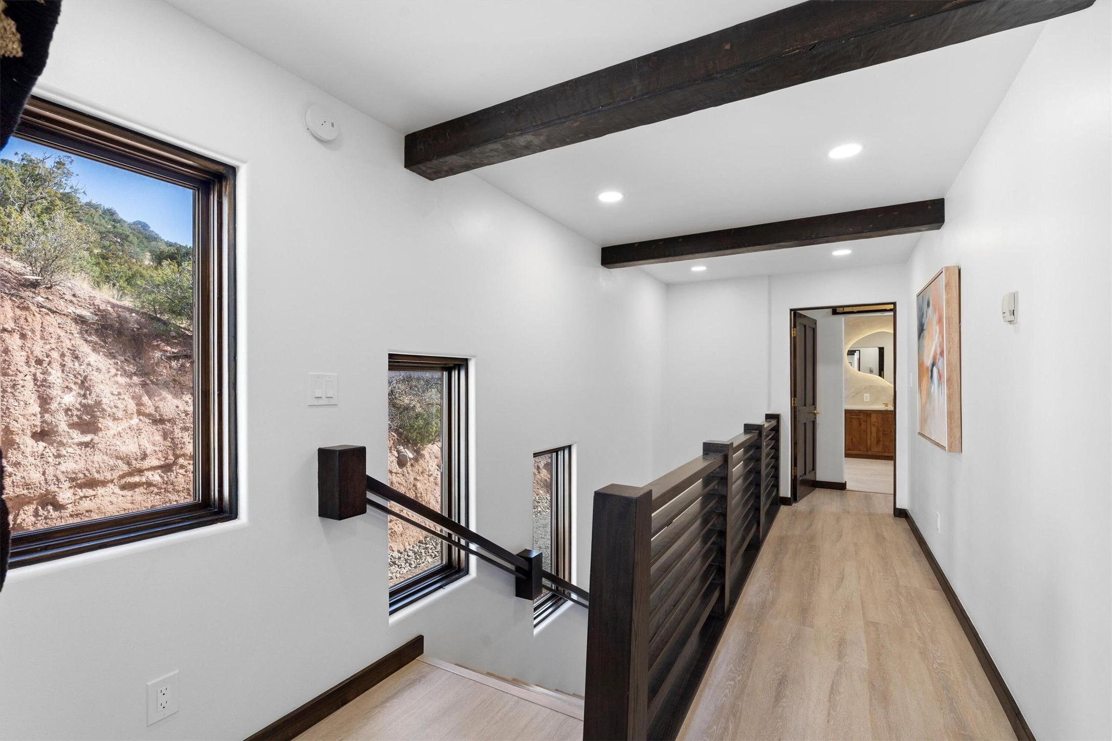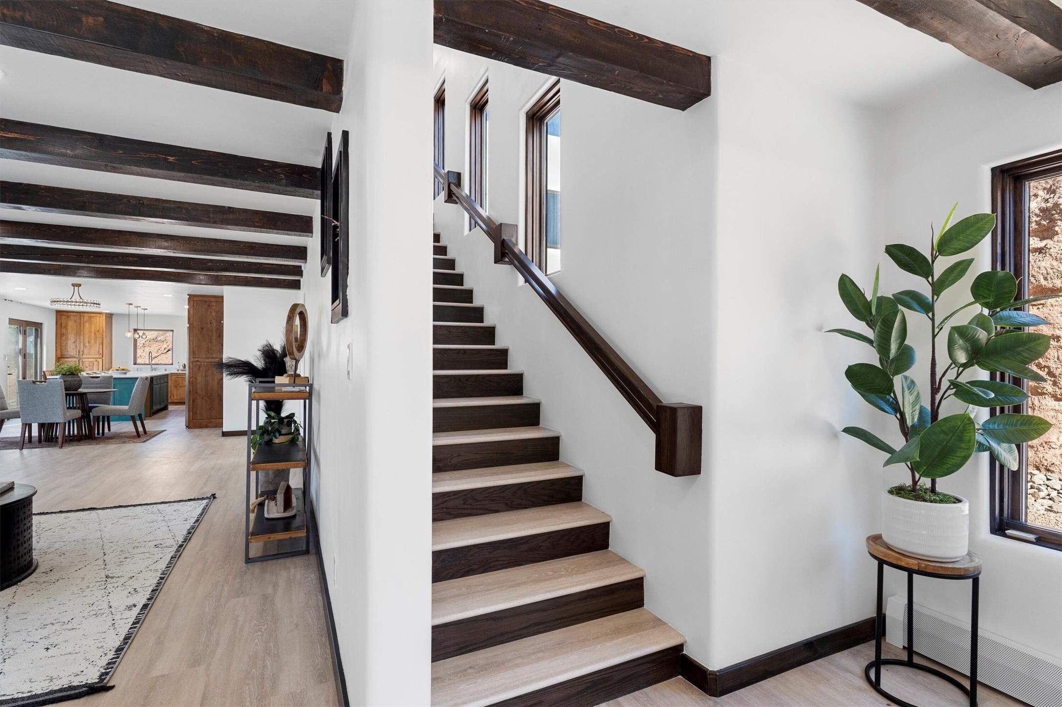 This updated Southwest-style home is waiting for you! Step inside to discover a stunning custom-built gourmet kitchen featuring a generous 8-foot island and elegant quartz countertops, complete with all-new stainless steel appliances. The home showcases beautiful vigas throughout and offers an open living space highlighted by a cozy Kiva gas fireplace, perfect for relaxation or as a flexible area tailored to your needs. French doors lead to an inviting open patio, where you can soak in breathtaking views of the Jemez Mountains. This residence boasts two primary suites, each with spacious walk-in closets, and a convenient stackable washer and dryer located in the main primary bedroom closet in addition to the large laundry room located on the first floor.Each full bathroom is designed with double vanities, custom knotty alder cabinets, and stylish LED-lit vanity mirrors. Enjoy the convenience of a laundry chute on the second floor and an attached two-car garage, with ample parking available for guests on both the upper and lower levels. Best feature is the new stone paved private driveway!Situated in a prime location, this home is adjacent to the renowned Bishops Lodge Resort, Spa, and Horse Stables, offering an unparalleled lifestyle of comfort and leisure. Geotechnical report available to your realtor.