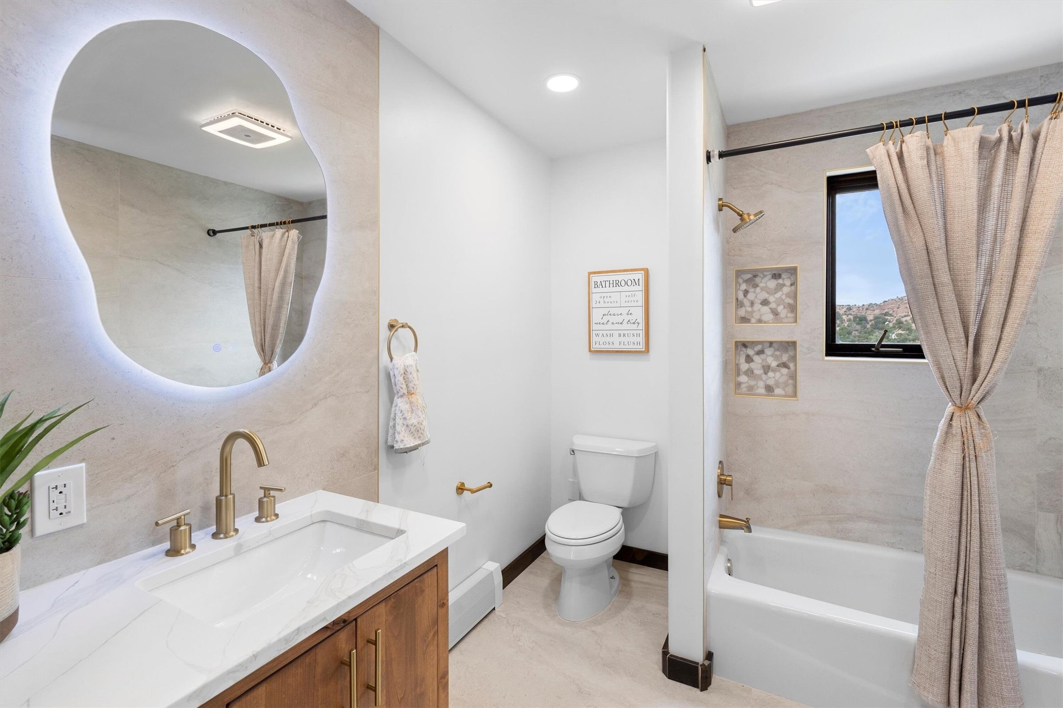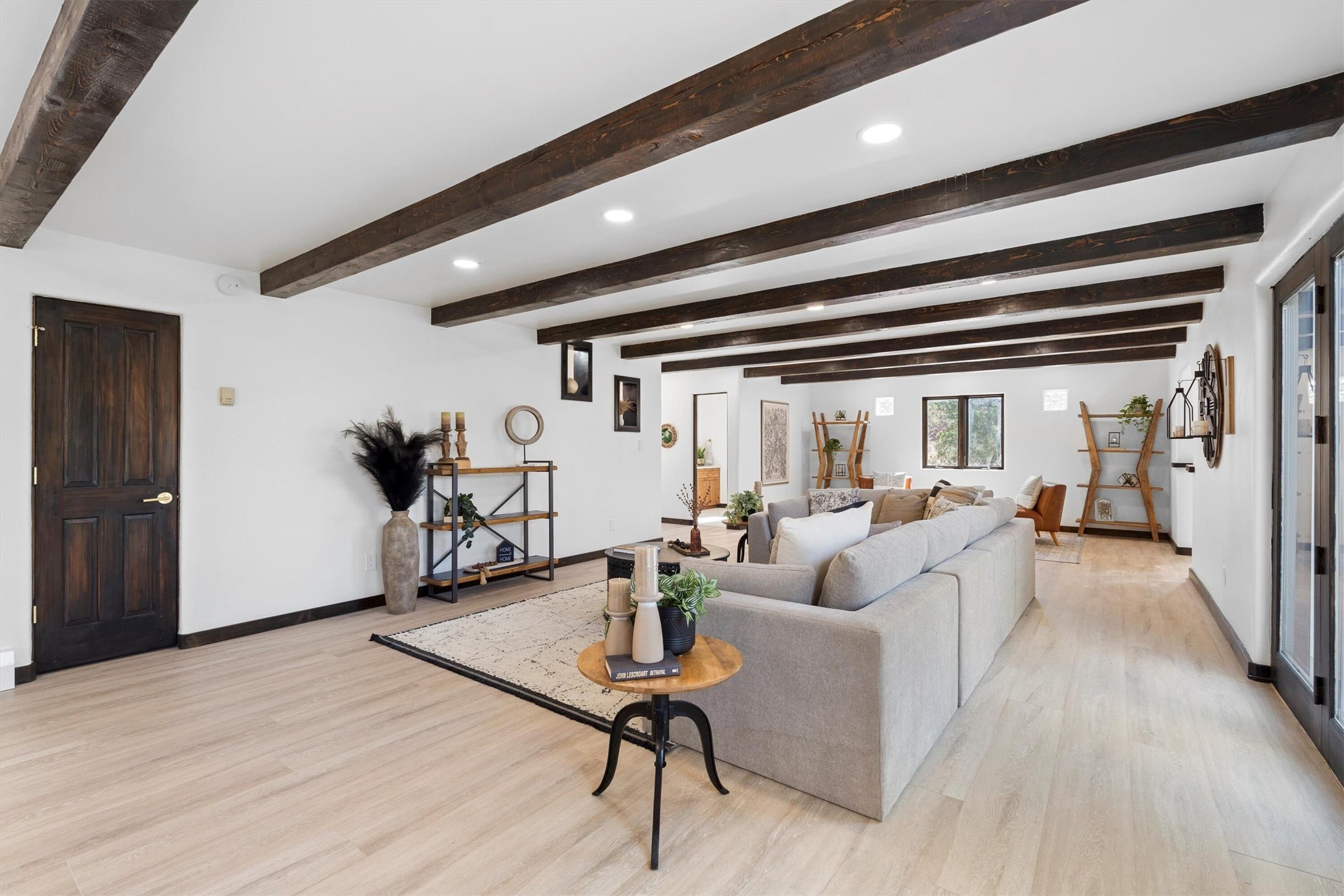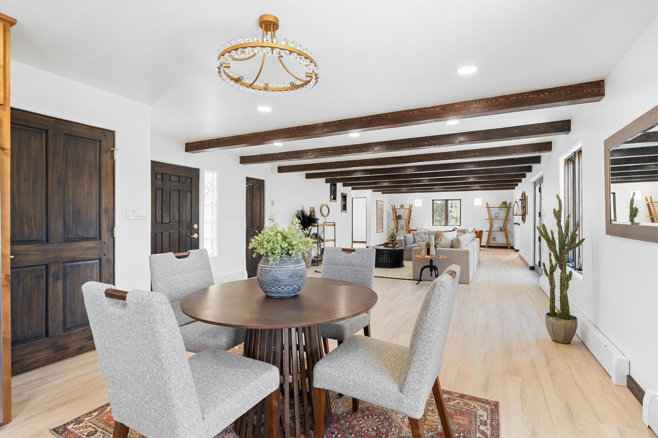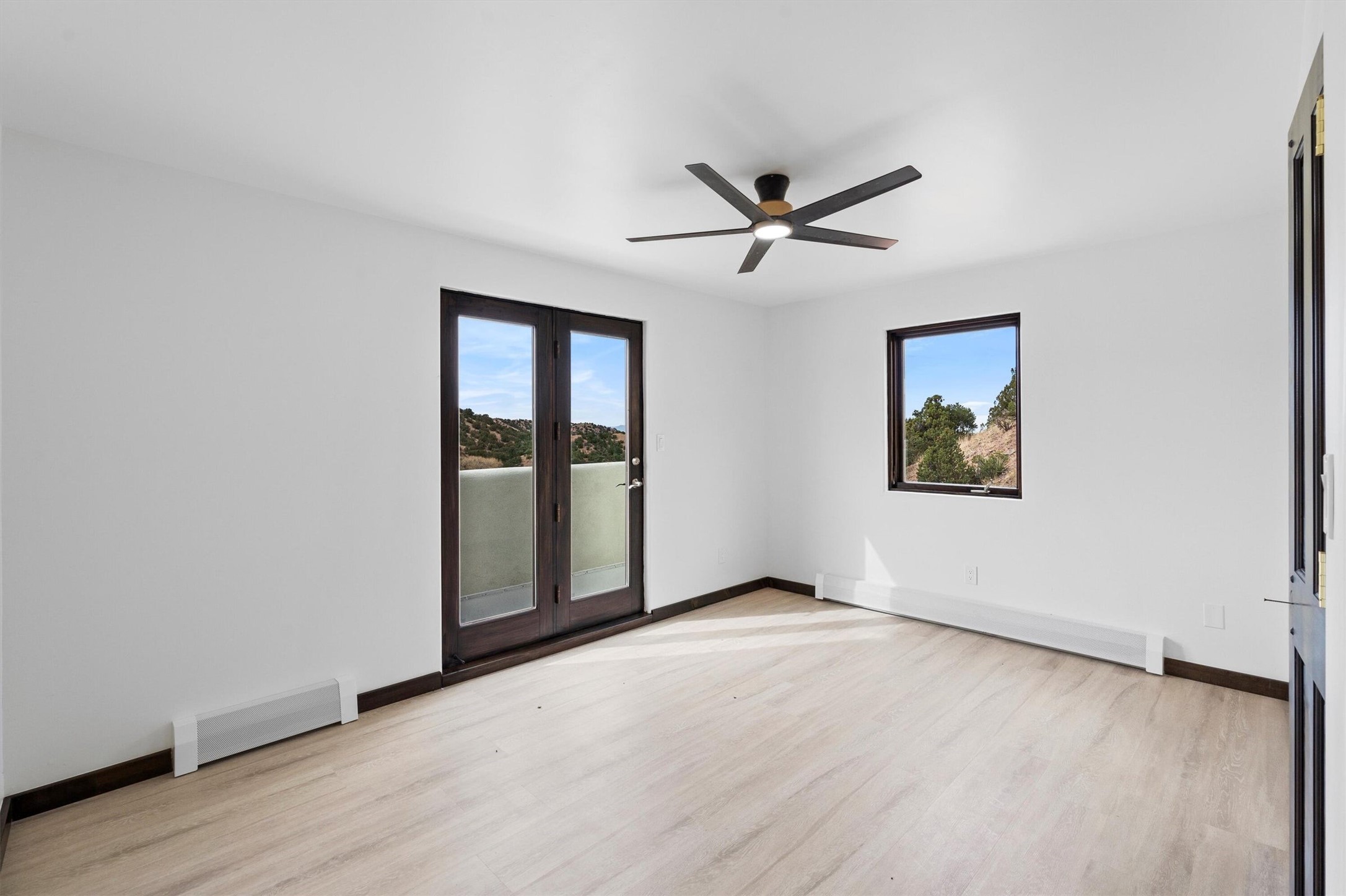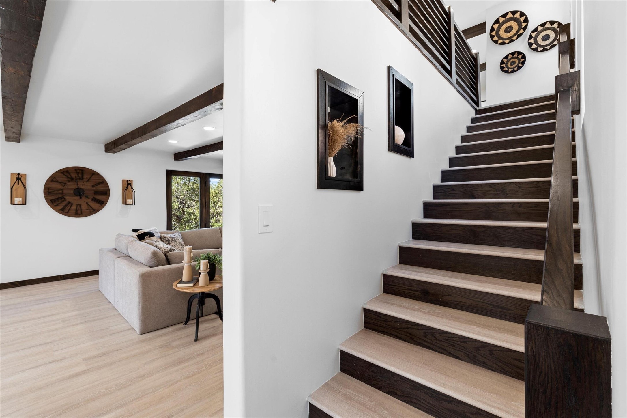 This updated Southwest-style home is waiting for you! Step inside to discover a stunning custom-built gourmet kitchen featuring a generous 8-foot island and elegant quartz countertops, complete with all-new stainless steel appliances. The home showcases beautiful vigas throughout and offers an open living space highlighted by a cozy Kiva gas fireplace, perfect for relaxation or as a flexible area tailored to your needs. French doors lead to an inviting open patio, where you can soak in breathtaking views of the Jemez Mountains. This residence boasts two primary suites, each with spacious walk-in closets, and a convenient stackable washer and dryer located in the main primary bedroom closet in addition to the large laundry room located on the first floor.Each full bathroom is designed with double vanities, custom knotty alder cabinets, and stylish LED-lit vanity mirrors. Enjoy the convenience of a laundry chute on the second floor and an attached two-car garage, with ample parking available for guests on both the upper and lower levels. Best feature is the new stone paved private driveway!Situated in a prime location, this home is adjacent to the renowned Bishops Lodge Resort, Spa, and Horse Stables, offering an unparalleled lifestyle of comfort and leisure. Geotechnical report available to your realtor.