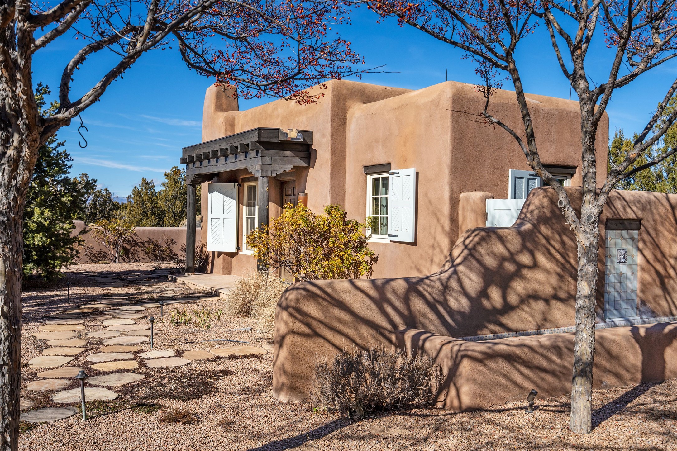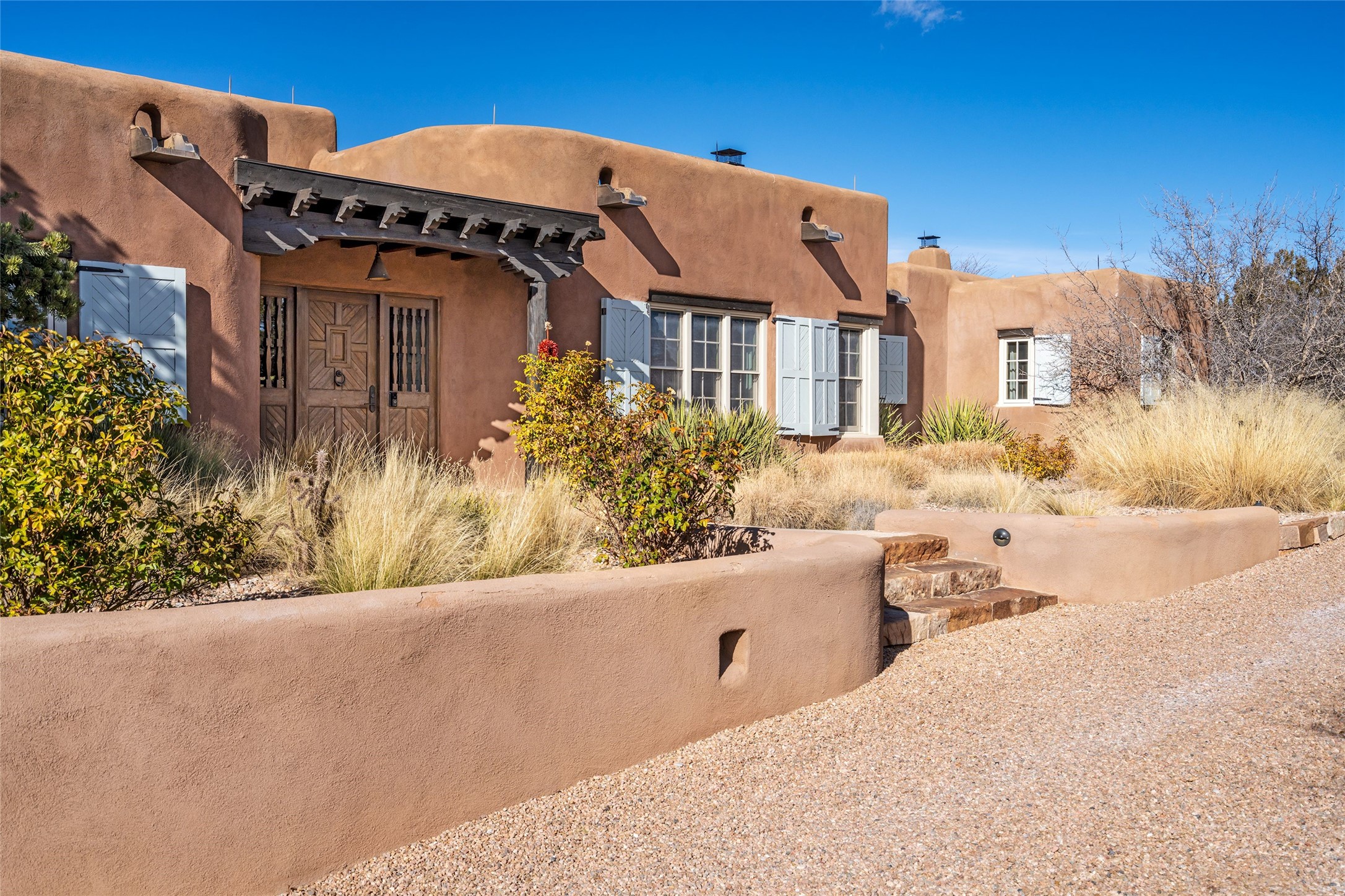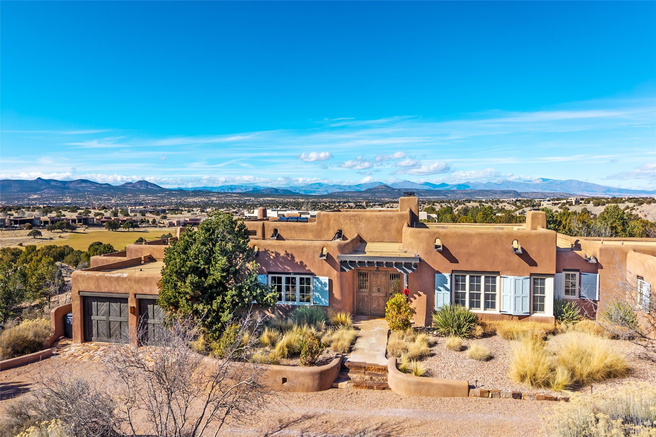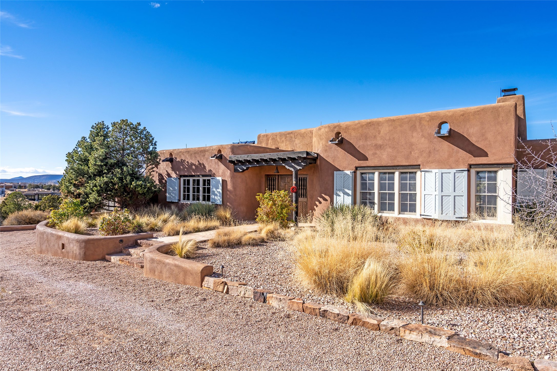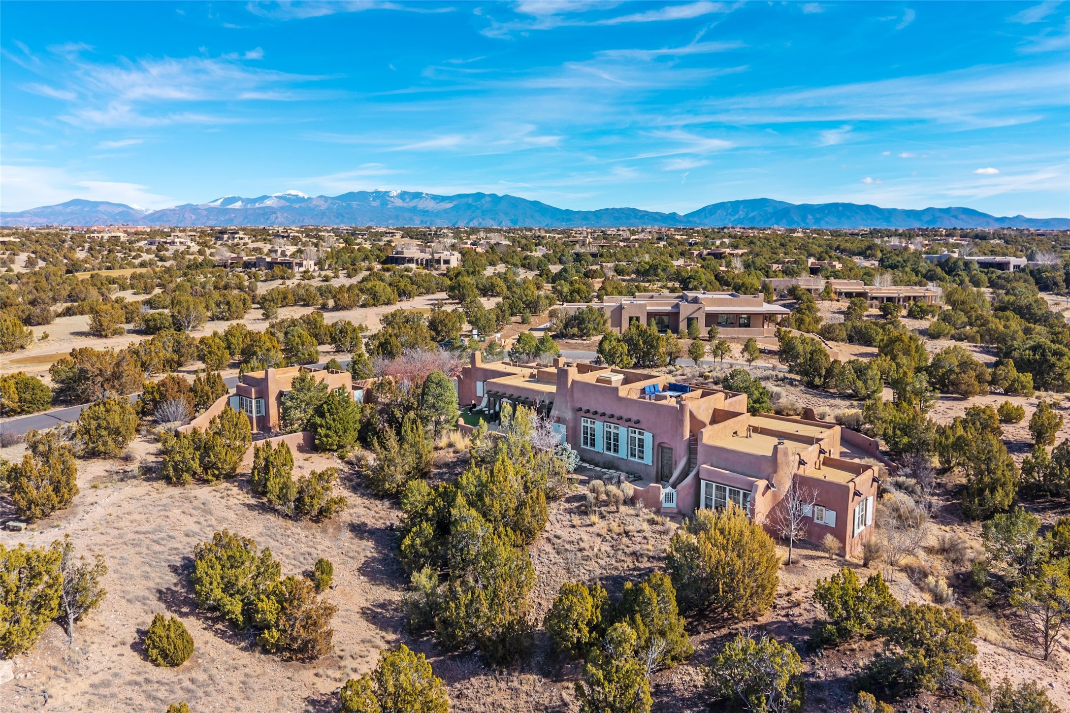 DESIGNED BY THE AWARD-WINNING ARCHITECTURAL FIRM OF CURTIS & WINDHAM ARCHITECTS, THIS SUPERB LAS CAMPANAS RESIDENCE ENJOYS THE TIMELESS HALLMARKS OF A TRADITIONAL FIRST-CLASS CUSTOM BUILD WITH EXQUISITELY LANDSCAPED GARDENS AND A WINDING PATH TO THE GUEST CASITA. Approach the home through tall natural grasses and glimpse the unique design element of wooden shutters on the windows, giving the home a European feel. Warm, rich woods throughout - most notably hand-crafted coffered ceilings, beautiful custom doors, and wooden floors as well as hand crafted tiles added by the current owners make for a sumptuous yet relaxed living space. The living room is expansive with tall windows, flanked by a handsome wall of built-in showcases, also added by the present owners, making several seating areas possible. The chef's kitchen offers a large island, top-of-the-line appliances and amenities plus a true walk-in pantry. While the property has sensational entertaining areas inside and out - the focus of this home is intimacy. High efficiency rastra type construction lends a solid, sturdy, quiet feel to the home and the enclosed rear garden is reminiscent of Provence - enjoy the sound of water from the fountain as you dine alfresco among a grove of Hawthorne trees. Rooftop deck. Excellent privacy on a large lot that spans two golf courses. Very special. Unique, one-of-a-kind property.