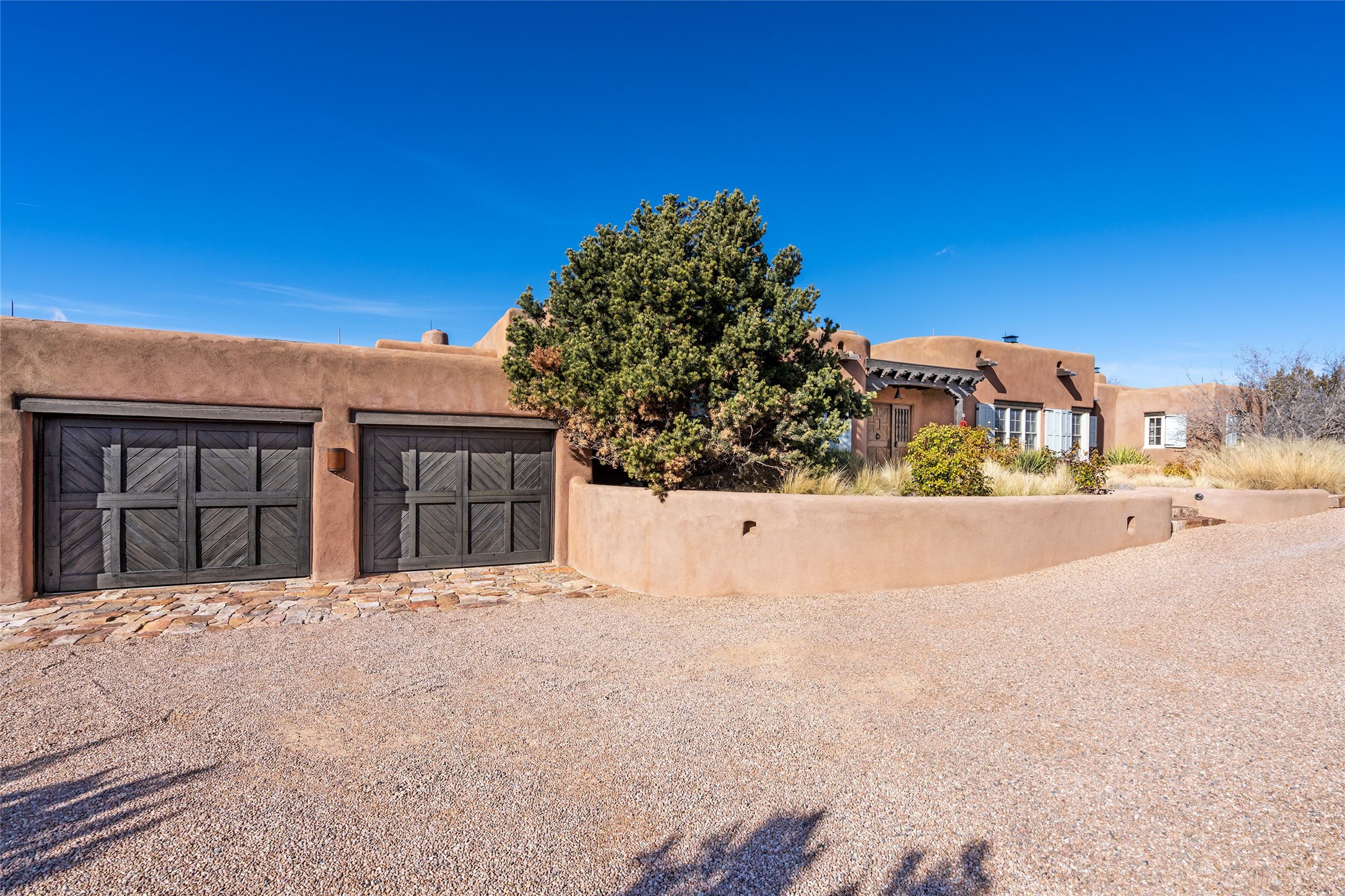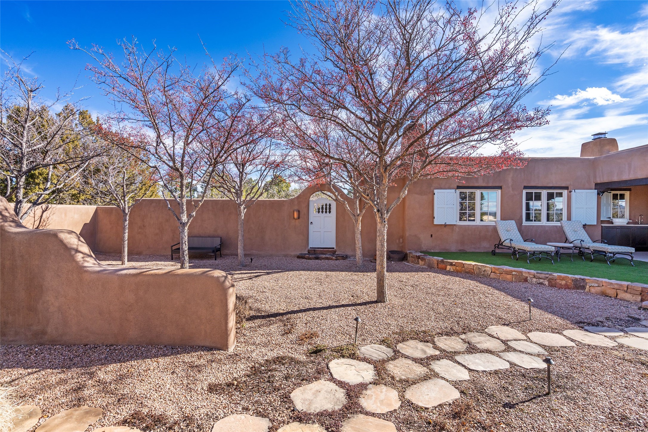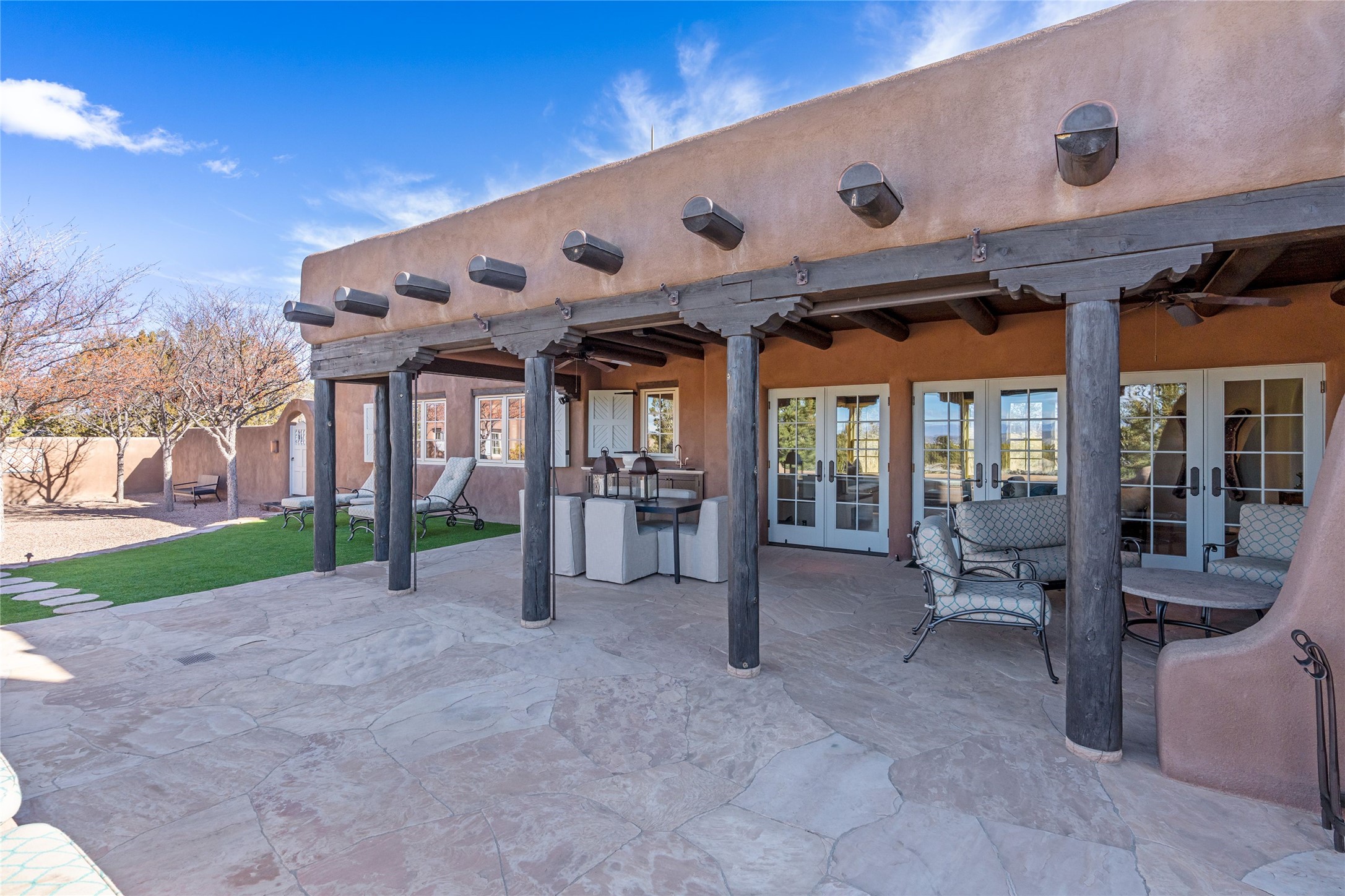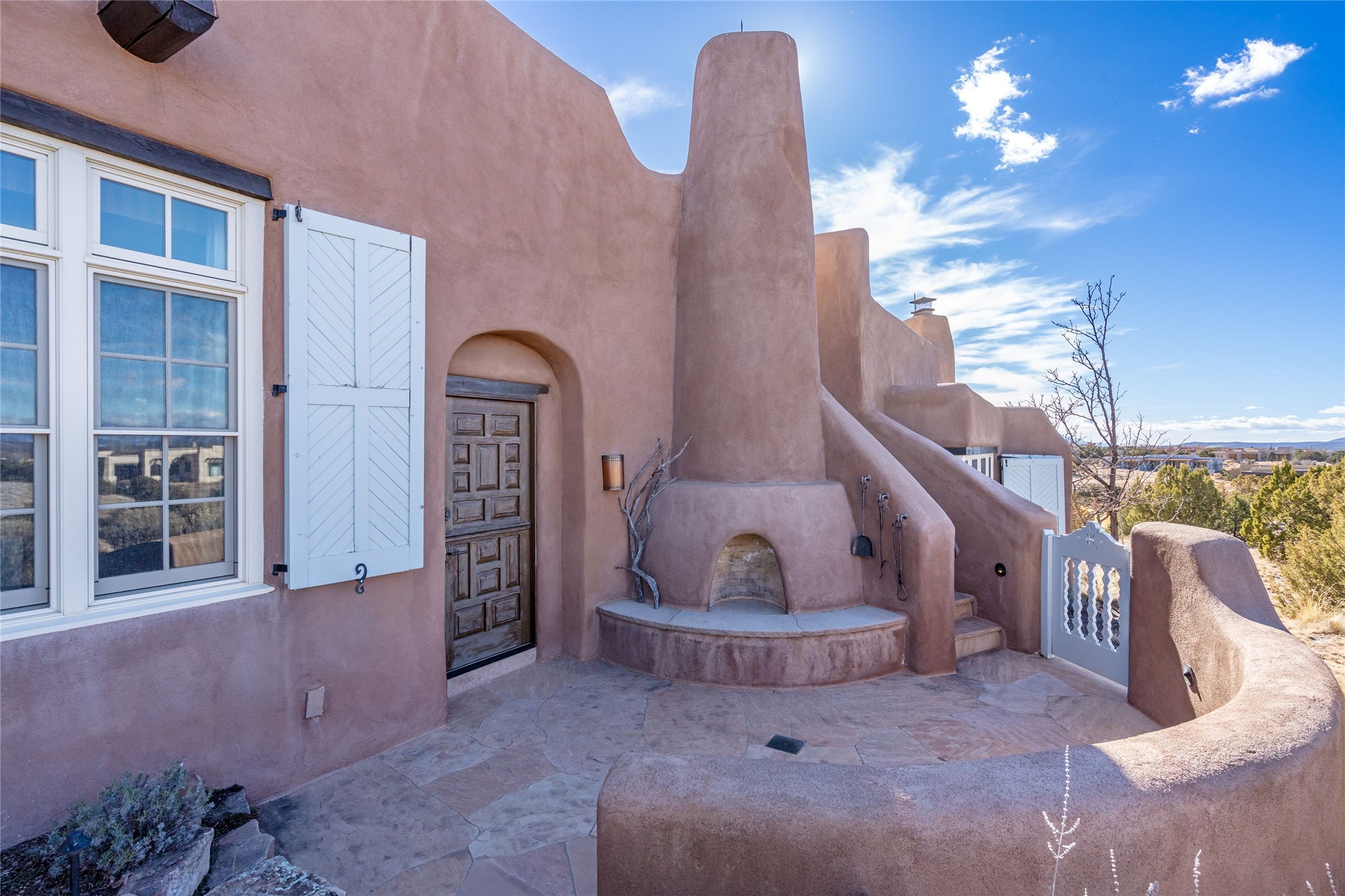 DESIGNED BY THE AWARD-WINNING ARCHITECTURAL FIRM OF CURTIS & WINDHAM ARCHITECTS, THIS SUPERB LAS CAMPANAS RESIDENCE ENJOYS THE TIMELESS HALLMARKS OF A TRADITIONAL FIRST-CLASS CUSTOM BUILD WITH EXQUISITELY LANDSCAPED GARDENS AND A WINDING PATH TO THE GUEST CASITA. Approach the home through tall natural grasses and glimpse the unique design element of wooden shutters on the windows, giving the home a European feel. Warm, rich woods throughout - most notably hand-crafted coffered ceilings, beautiful custom doors, and wooden floors as well as hand crafted tiles added by the current owners make for a sumptuous yet relaxed living space. The living room is expansive with tall windows, flanked by a handsome wall of built-in showcases, also added by the present owners, making several seating areas possible. The chef's kitchen offers a large island, top-of-the-line appliances and amenities plus a true walk-in pantry. While the property has sensational entertaining areas inside and out - the focus of this home is intimacy. High efficiency rastra type construction lends a solid, sturdy, quiet feel to the home and the enclosed rear garden is reminiscent of Provence - enjoy the sound of water from the fountain as you dine alfresco among a grove of Hawthorne trees. Rooftop deck. Excellent privacy on a large lot that spans two golf courses. Very special. Unique, one-of-a-kind property.