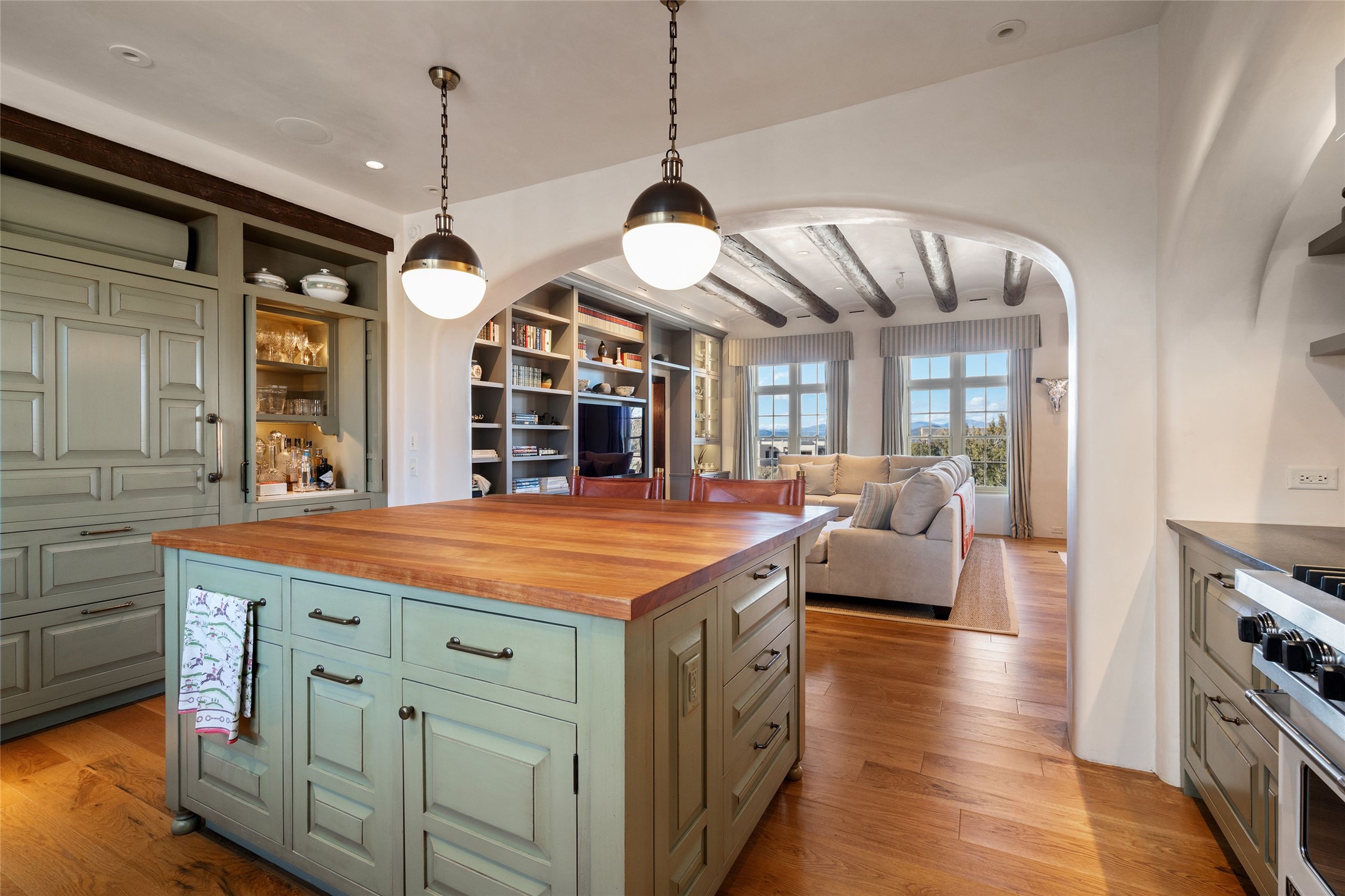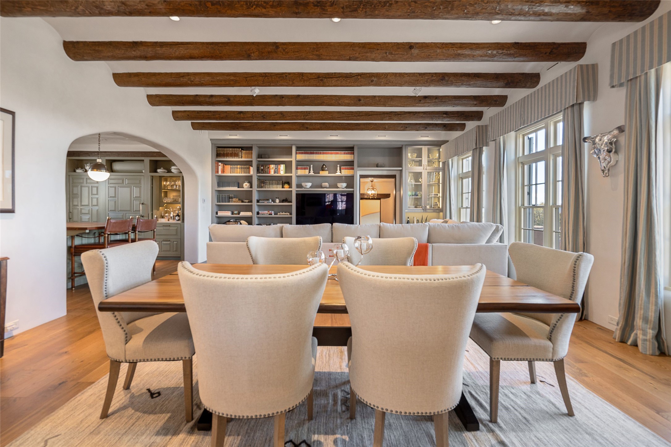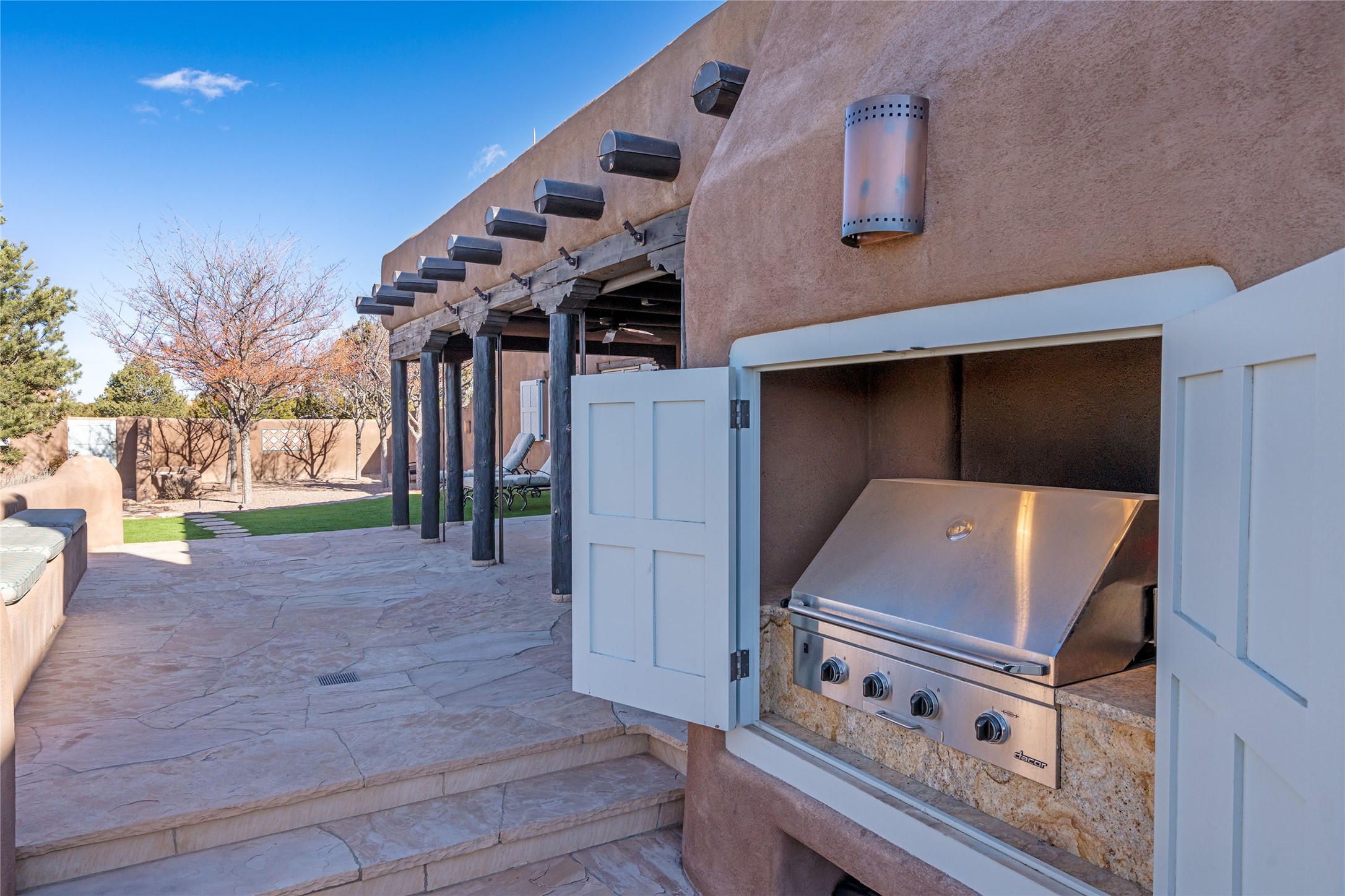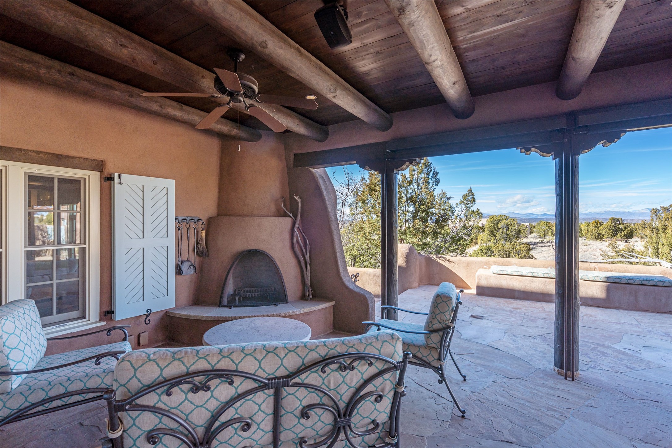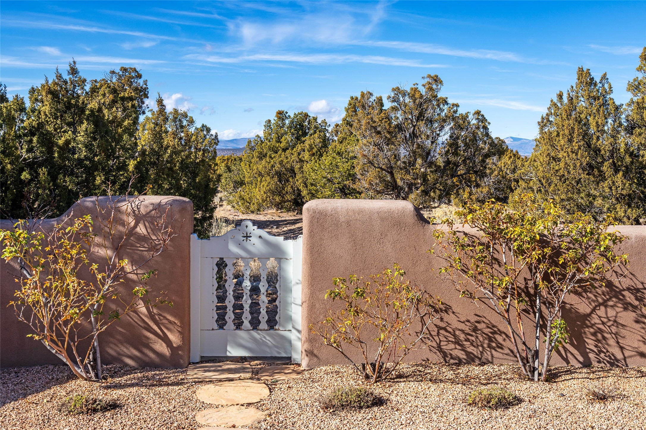 DESIGNED BY THE AWARD-WINNING ARCHITECTURAL FIRM OF CURTIS & WINDHAM ARCHITECTS, THIS SUPERB LAS CAMPANAS RESIDENCE ENJOYS THE TIMELESS HALLMARKS OF A TRADITIONAL FIRST-CLASS CUSTOM BUILD WITH EXQUISITELY LANDSCAPED GARDENS AND A WINDING PATH TO THE GUEST CASITA. Approach the home through tall natural grasses and glimpse the unique design element of wooden shutters on the windows, giving the home a European feel. Warm, rich woods throughout - most notably hand-crafted coffered ceilings, beautiful custom doors, and wooden floors as well as hand crafted tiles added by the current owners make for a sumptuous yet relaxed living space. The living room is expansive with tall windows, flanked by a handsome wall of built-in showcases, also added by the present owners, making several seating areas possible. The chef's kitchen offers a large island, top-of-the-line appliances and amenities plus a true walk-in pantry. While the property has sensational entertaining areas inside and out - the focus of this home is intimacy. High efficiency rastra type construction lends a solid, sturdy, quiet feel to the home and the enclosed rear garden is reminiscent of Provence - enjoy the sound of water from the fountain as you dine alfresco among a grove of Hawthorne trees. Rooftop deck. Excellent privacy on a large lot that spans two golf courses. Very special. Unique, one-of-a-kind property.