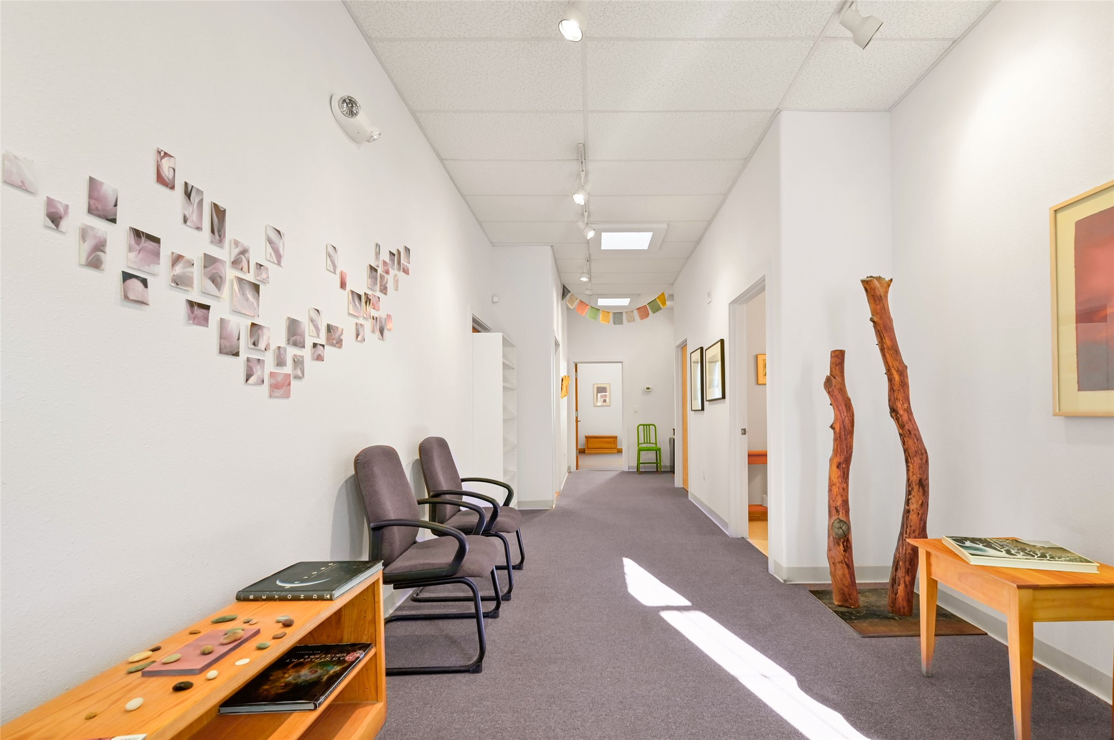 Galisteo Business Park Office Space for Sale. This nicely built-out office space features a reception and waiting area with high ceilings, skylights, and track lighting throughout. The space includes two large, windowed private offices, one office offers an expansive area with vinyl flooring, large enough for a group setting or training room, and could be converted into a third office. Additional features include a kitchenette and two in-suite restrooms. The property is professionally managed and conveniently located within the St. Michael's and S. St. Francis corridor. Monthly condo association dues apply.