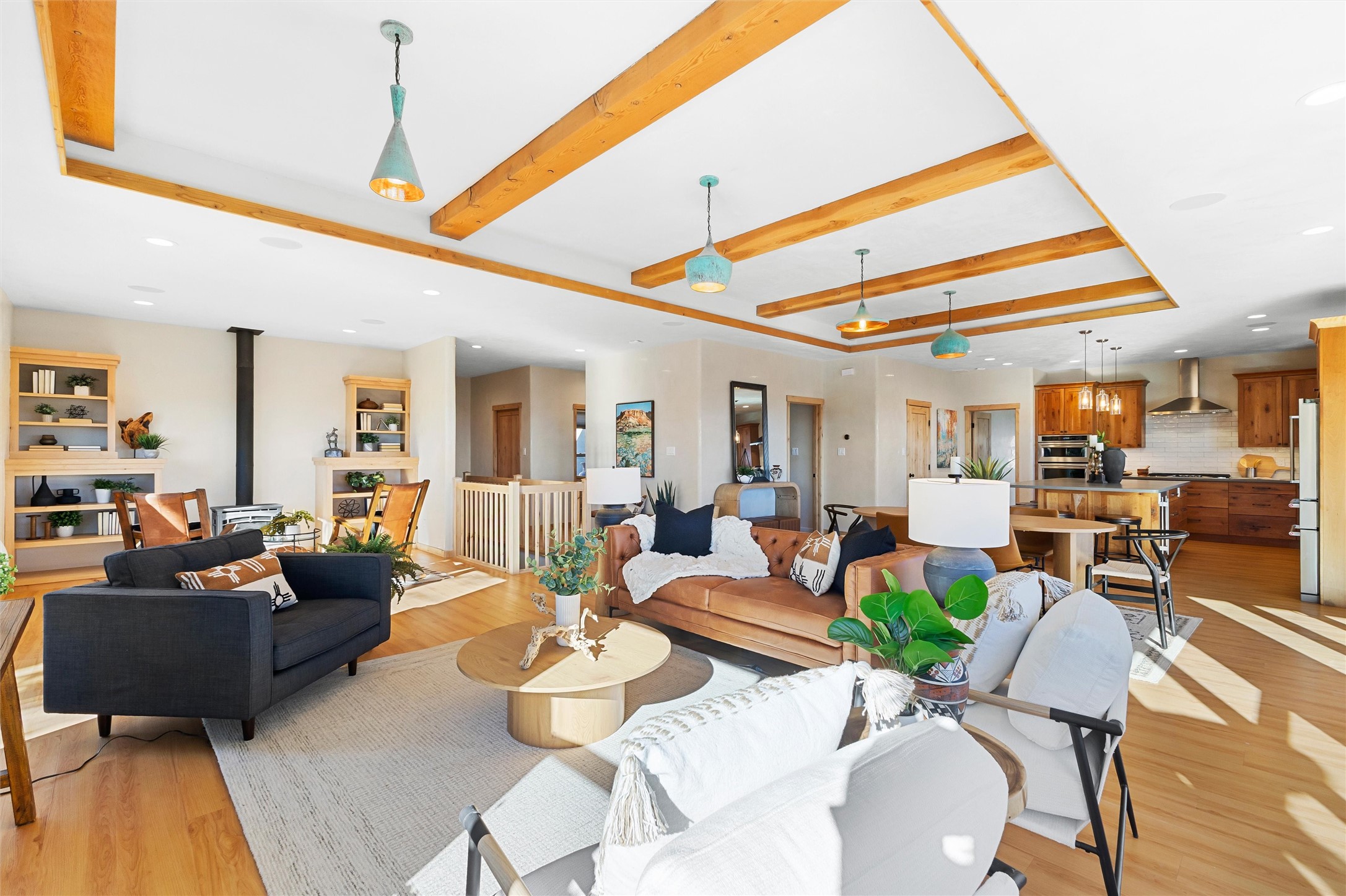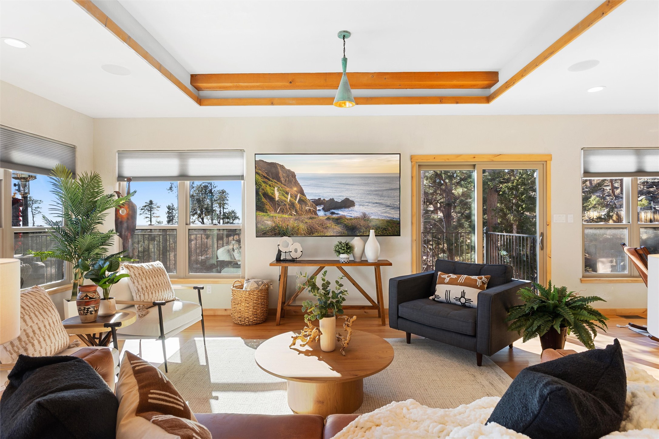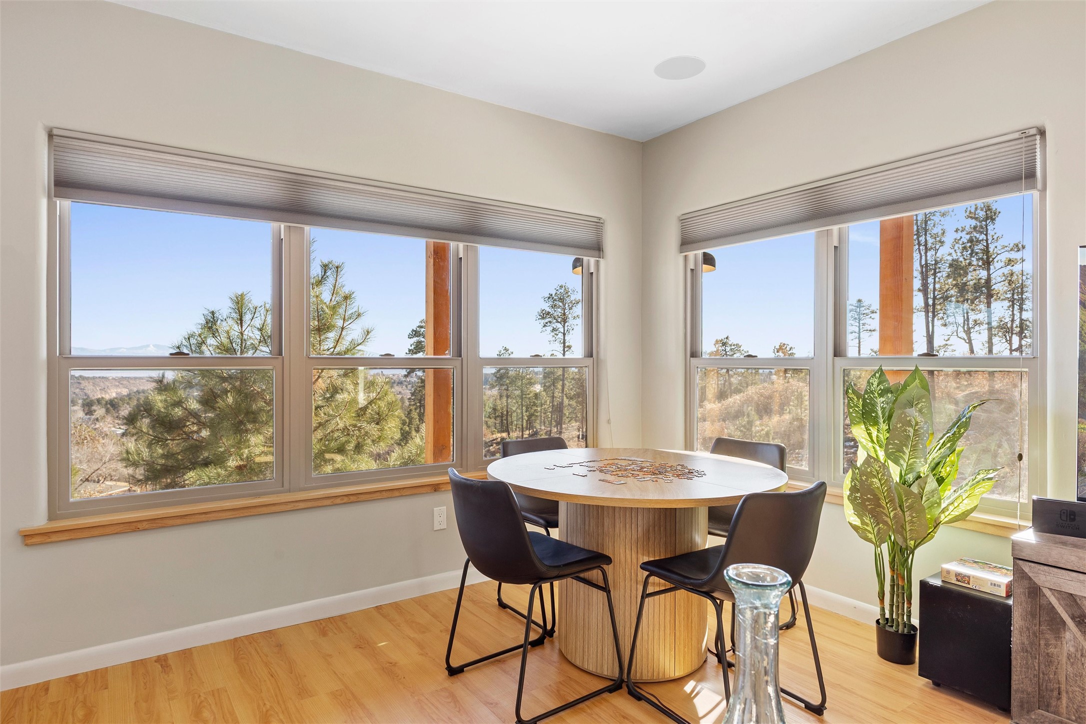 Tucked at the end of a quiet cul-de-sac in one of Los Alamos' most desirable neighborhoods, 1610 Solana is a truly rare offering. Set on over one acre (the largest lot in the neighborhood) and backing to National Forest and County land for unmatched privacy and a breathtaking natural backdrop. With arguably the best views in town, you'll enjoy sweeping vistas of the townsite, the Sangre de Cristo range, and more from multiple spaces throughout the home.Finished in 2022, this stunning residence offers over 3,500 square feet of modern, beautifully crafted living space and all of the contemporary amenities today's buyers expect. The primary suite is a showstopper with a private deck walkout, an enviable walk-in closet, and a spa-inspired ensuite highlighted by a copper soaking tub.Designed for comfortable main-floor living, the upper level includes two additional bedrooms, one with its own ensuite plus an additional full bath. Venetian plaster walls add softness and sophistication to the main living areas, while multiple gathering spaces provide room to relax or entertain with ease. Head outside to the wrap-around deck with a covered porch, the perfect place to take in the views in every season.The walkout basement expands your options with another spacious family room, a guest bedroom with attached bath, and a versatile bonus room ideal for an office or additional guest space, complete with a Murphy bed.An oversized two-car garage offers generous storage and flexible space for a home gym or workshop, and the large laundry room with attached mudroom just off the garage keeps daily life organized and effortless.New, modern, spacious, and surrounded by nature, 1610 Solana delivers the Los Alamos lifestyle at its finest.