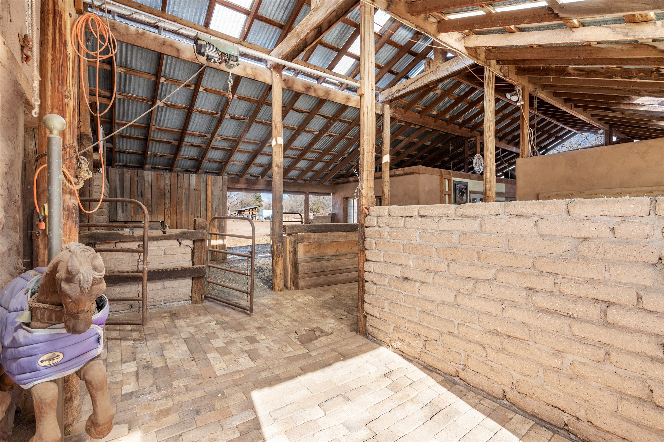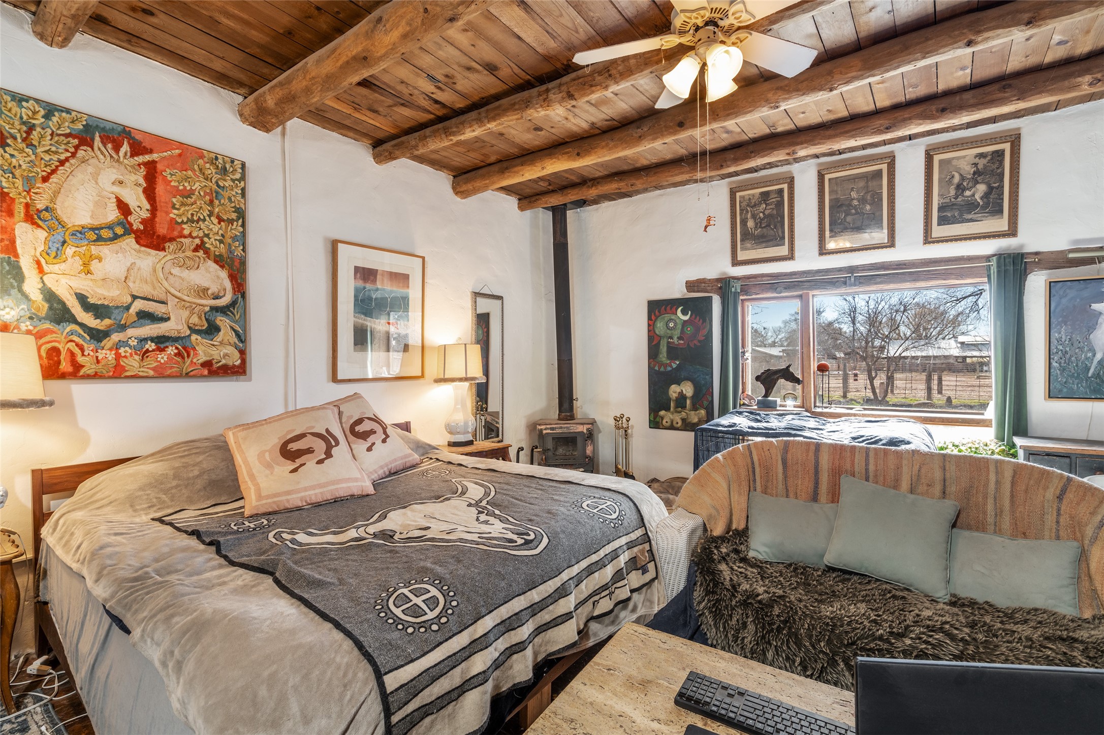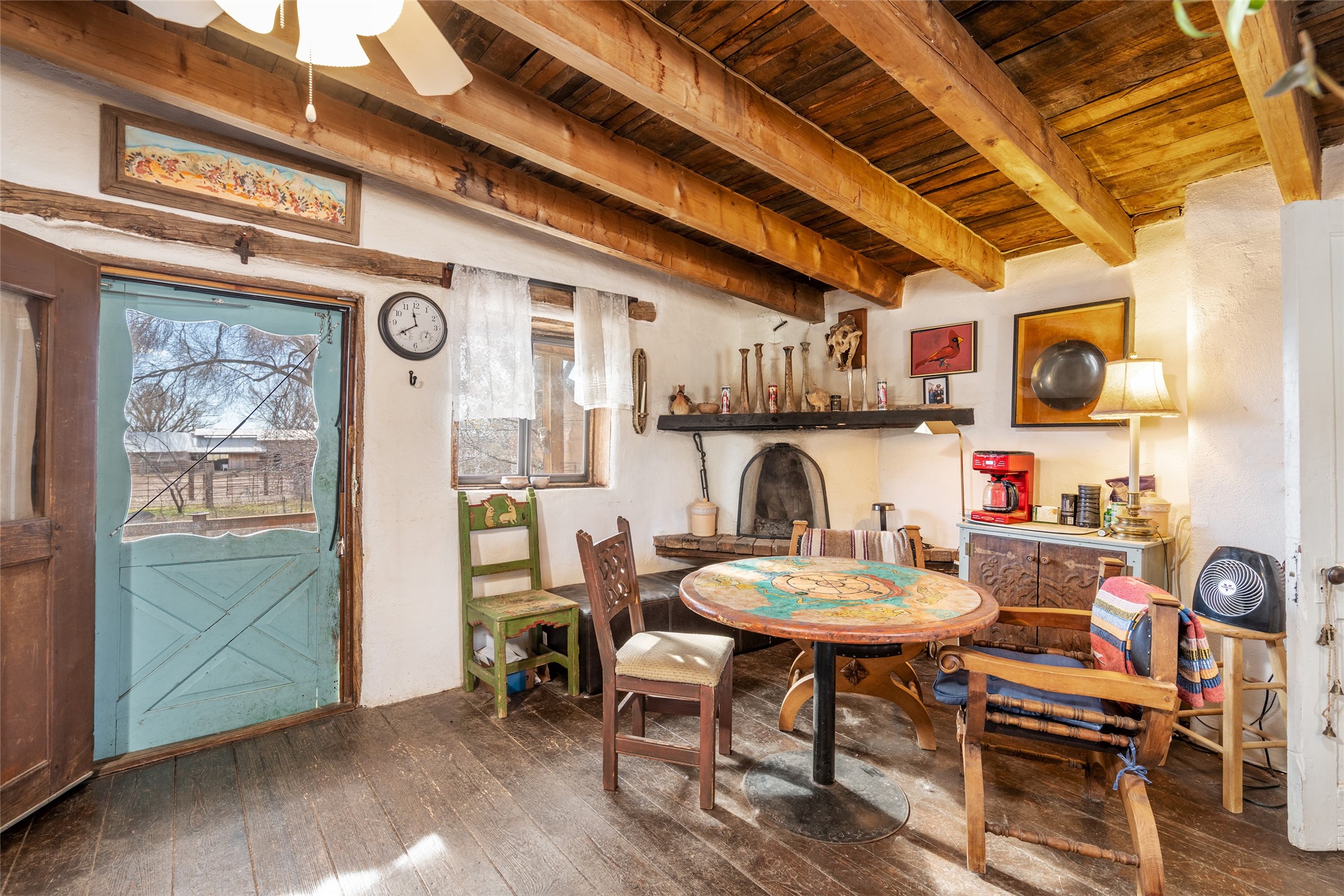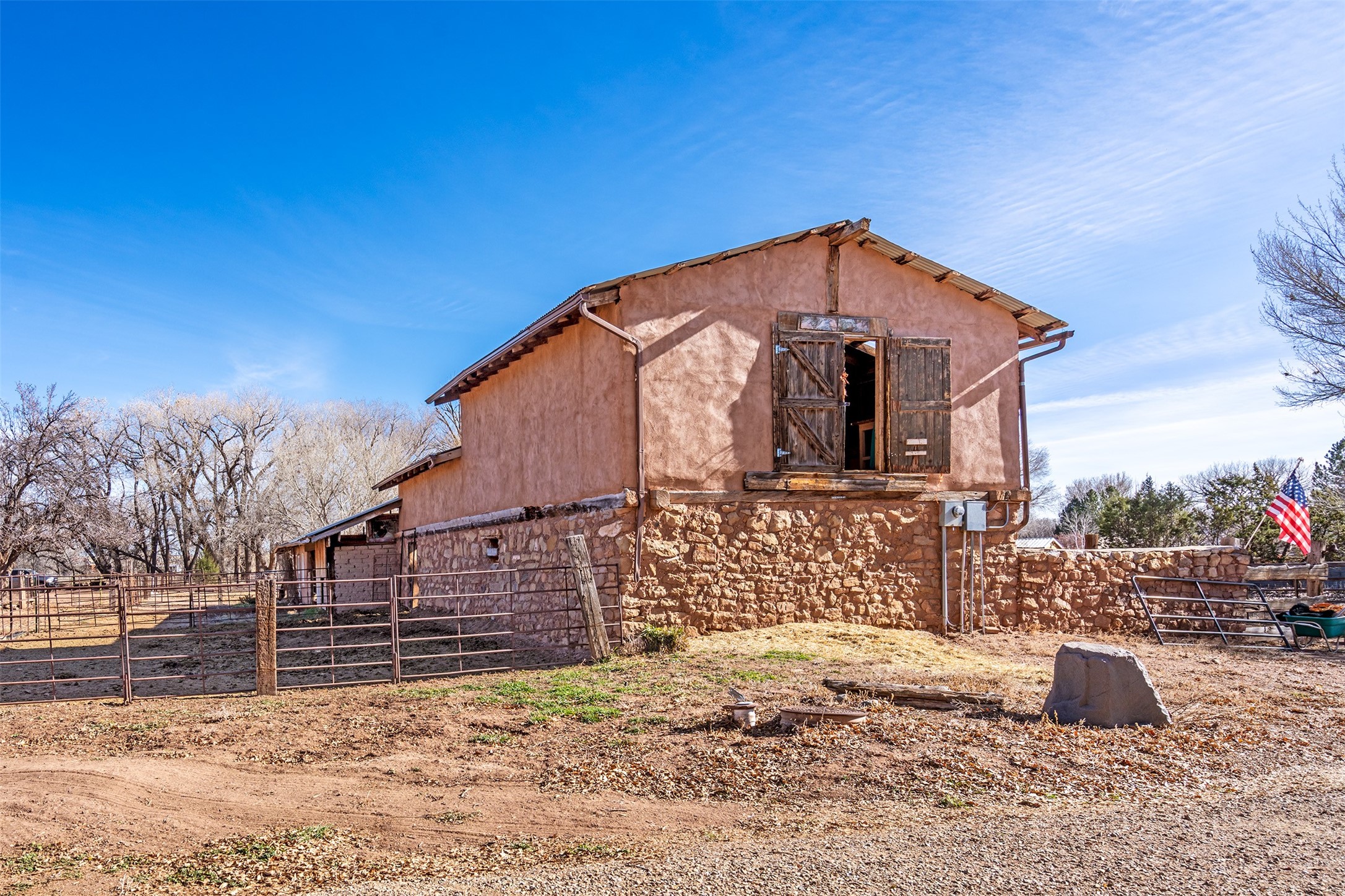 This historic Galisteo Hacienda presents a rare opportunity to restore an iconic adobe estate set on 3.8 acres within the village of Galisteo, one of the largest landholdings under Traditional Community zoning, which supports residential, live/work, and art gallery uses. Dating to the 1800s, the property once served as the headquarters of Don Jos Ortiz y Pino's sheep empire and later as the iconic Quartermill Farm - home, studio, and gallery of acclaimed artist Priscilla Hoback--making it uniquely suited to continue as a creative live/work estate. Located in the heart of Galisteo Village, the property includes a former gallery along a central village road and a substantial adobe main house privately set behind it.The hacienda features two residential wings with four bedrooms and three baths, a large library, grand living and dining rooms, multiple fireplaces, and authentic architectural details. A generous inner courtyard with mature trees, portals, and a koi pond creates a serene, campus-like setting ideal for both living and creative pursuits, complemented by fruit trees, gardens, and expansive village acreage.Equestrian facilities include a large handcrafted stone and adobe barn with spacious stalls and turnouts, wash rack, hay loft, tack room with bath, and an oversized arena, supported by a private well dedicated to the barn. Additional structures include an art studio with sink and loft, and a one-bedroom guest house--formerly the historic town bar--offering flexibility for guests, staff, or extended work use.The property is in need of renovation and restoration, presenting an exceptional opportunity for a discerning buyer to reimagine a historically significant live/work estate, blending residential life, creative enterprise, and community engagement in one of Galisteo's most storied village settings.