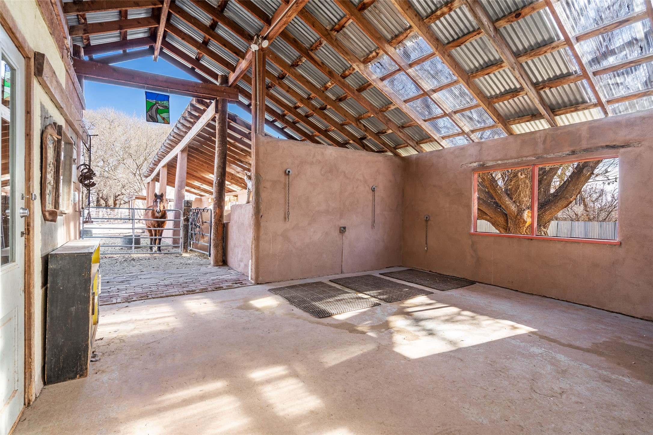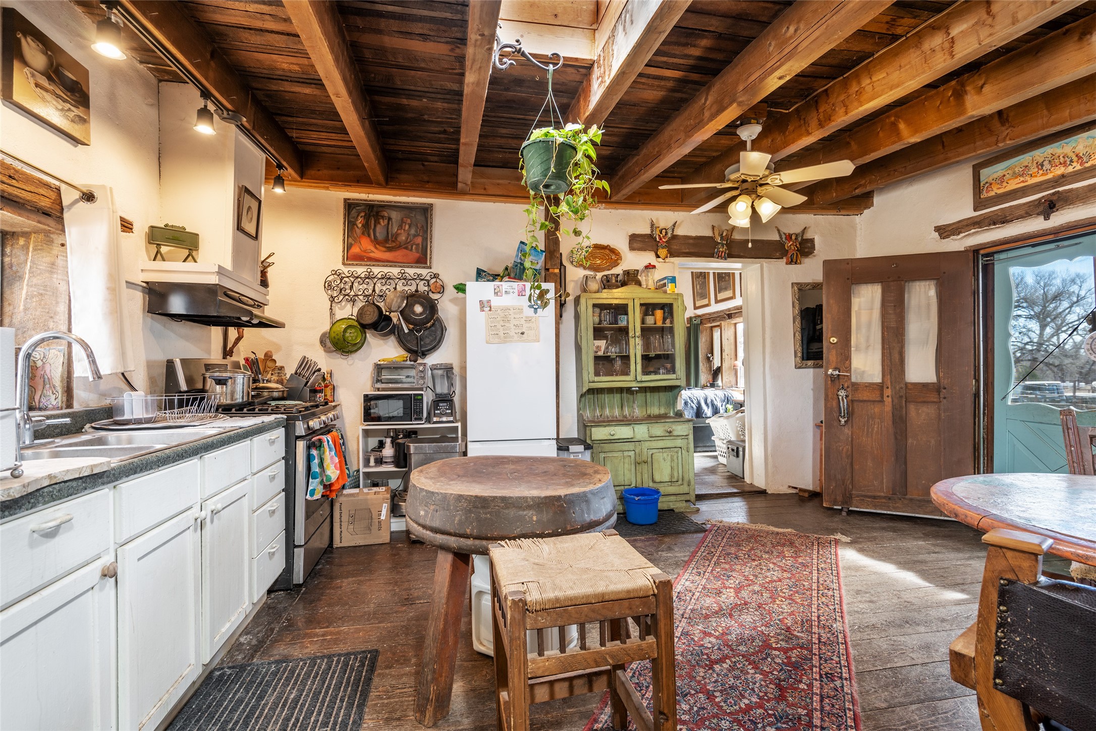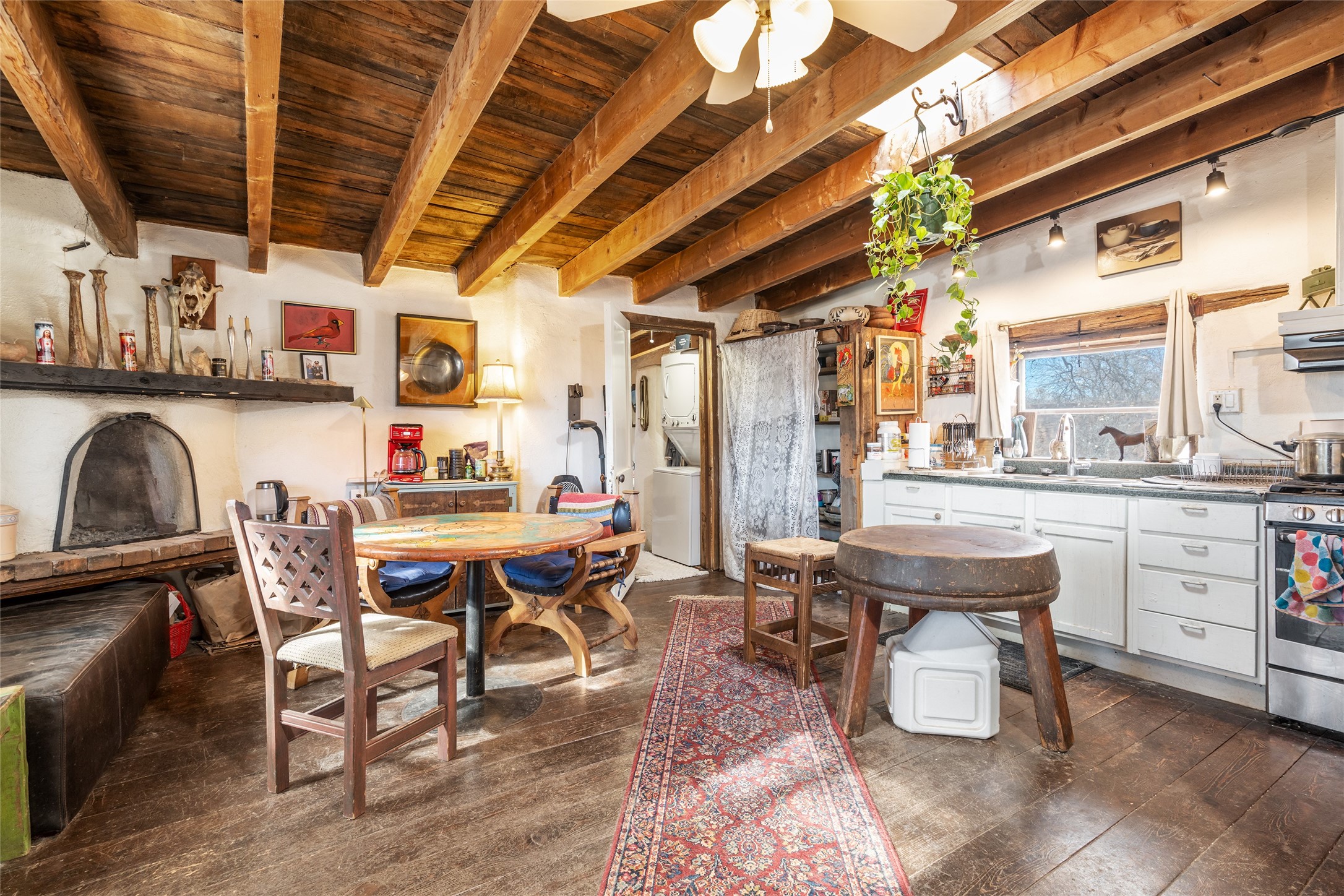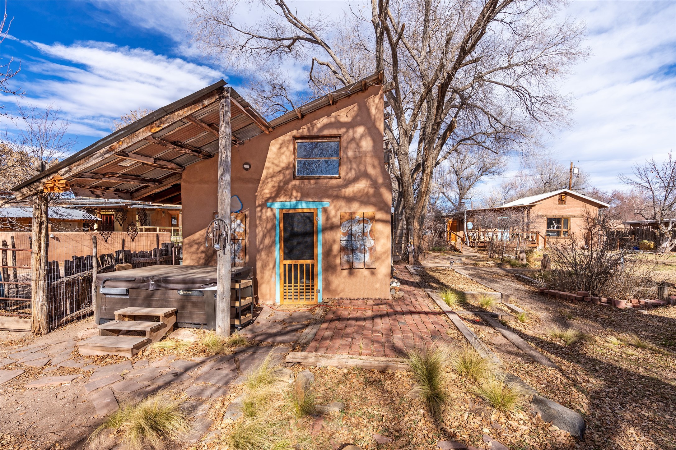 This historic Galisteo Hacienda presents a rare opportunity to restore an iconic adobe estate set on 3.8 acres within the village of Galisteo, one of the largest landholdings under Traditional Community zoning, which supports residential, live/work, and art gallery uses. Dating to the 1800s, the property once served as the headquarters of Don Jos Ortiz y Pino's sheep empire and later as the iconic Quartermill Farm - home, studio, and gallery of acclaimed artist Priscilla Hoback--making it uniquely suited to continue as a creative live/work estate. Located in the heart of Galisteo Village, the property includes a former gallery along a central village road and a substantial adobe main house privately set behind it.The hacienda features two residential wings with four bedrooms and three baths, a large library, grand living and dining rooms, multiple fireplaces, and authentic architectural details. A generous inner courtyard with mature trees, portals, and a koi pond creates a serene, campus-like setting ideal for both living and creative pursuits, complemented by fruit trees, gardens, and expansive village acreage.Equestrian facilities include a large handcrafted stone and adobe barn with spacious stalls and turnouts, wash rack, hay loft, tack room with bath, and an oversized arena, supported by a private well dedicated to the barn. Additional structures include an art studio with sink and loft, and a one-bedroom guest house--formerly the historic town bar--offering flexibility for guests, staff, or extended work use.The property is in need of renovation and restoration, presenting an exceptional opportunity for a discerning buyer to reimagine a historically significant live/work estate, blending residential life, creative enterprise, and community engagement in one of Galisteo's most storied village settings.