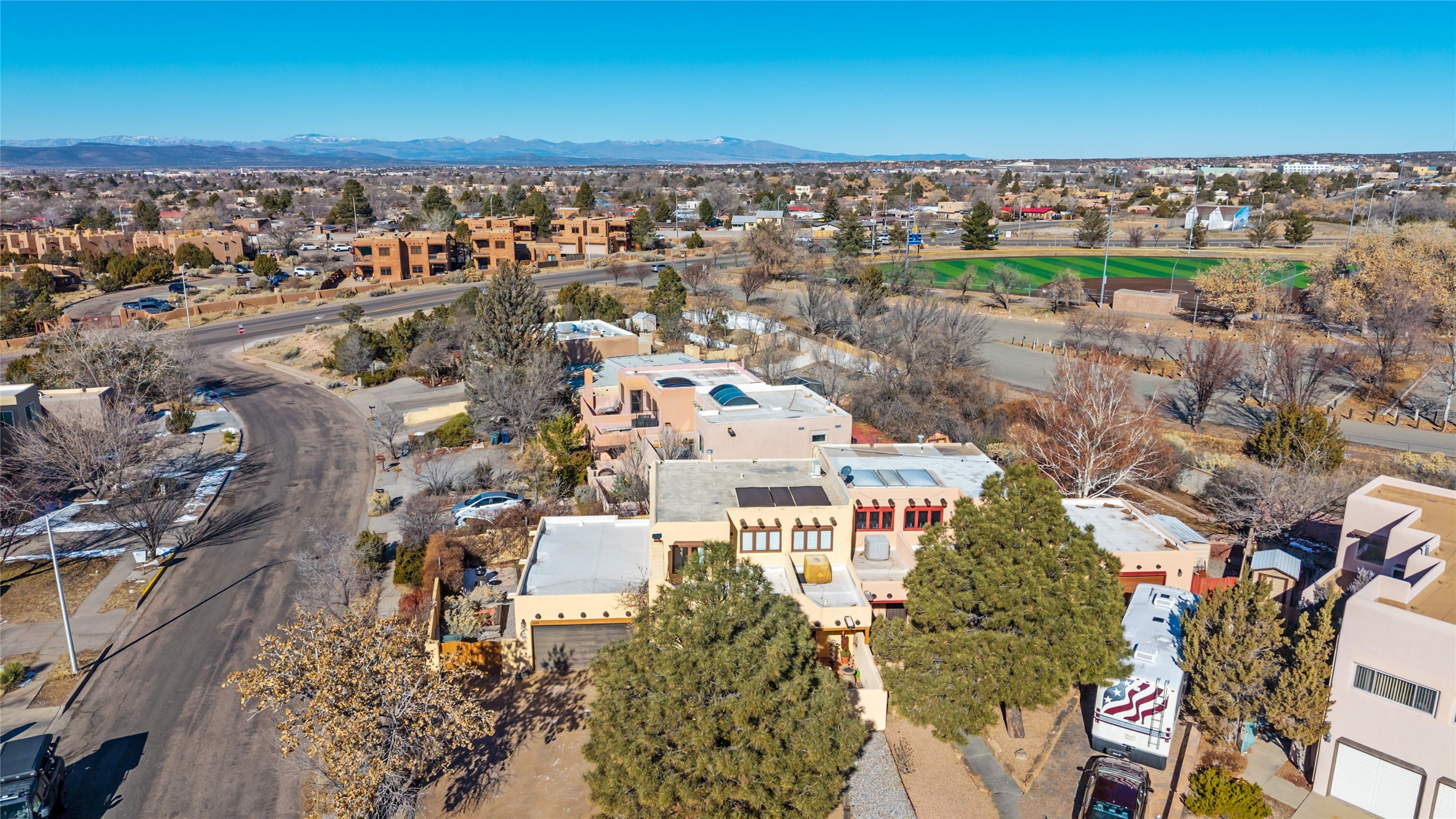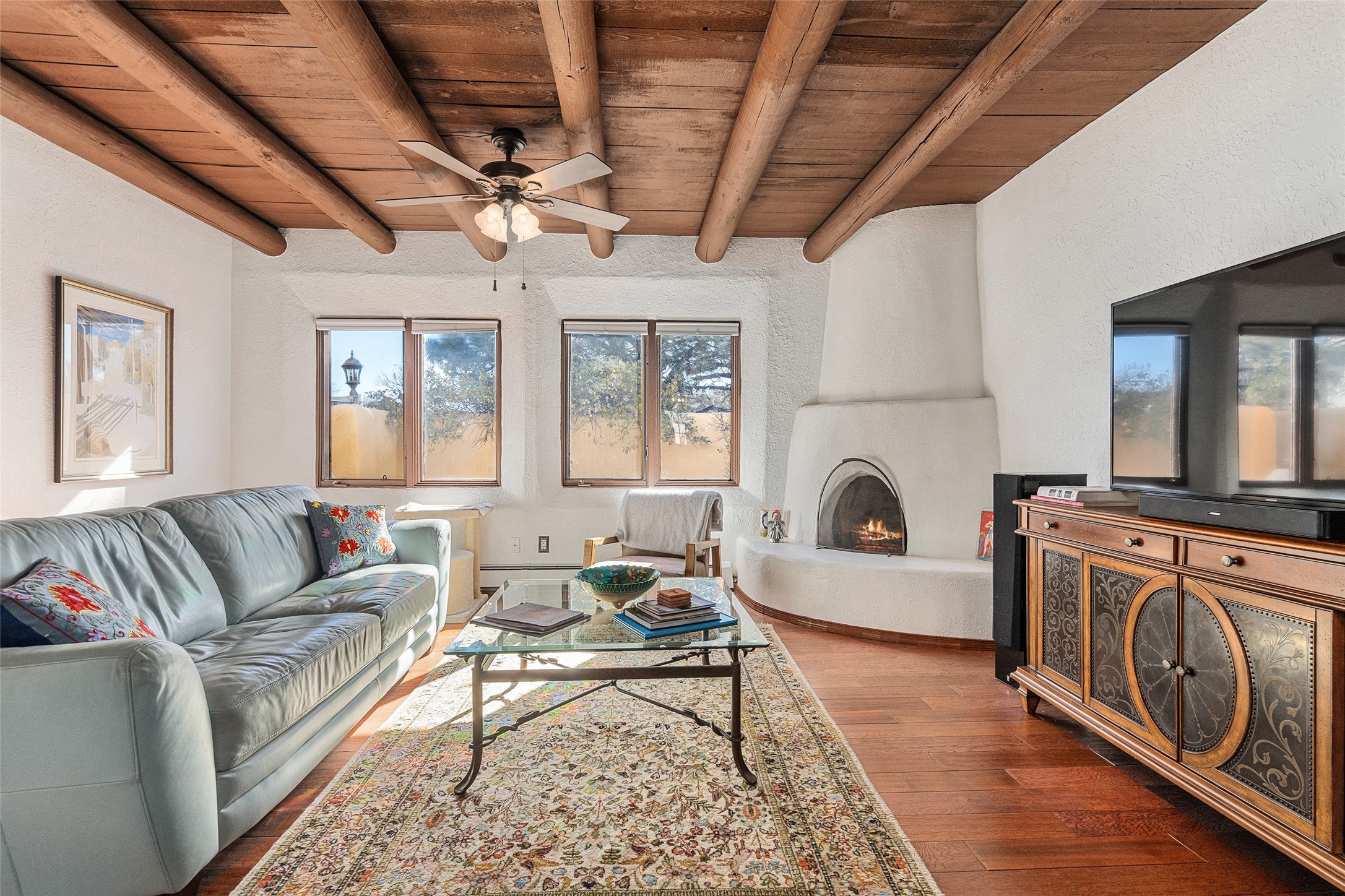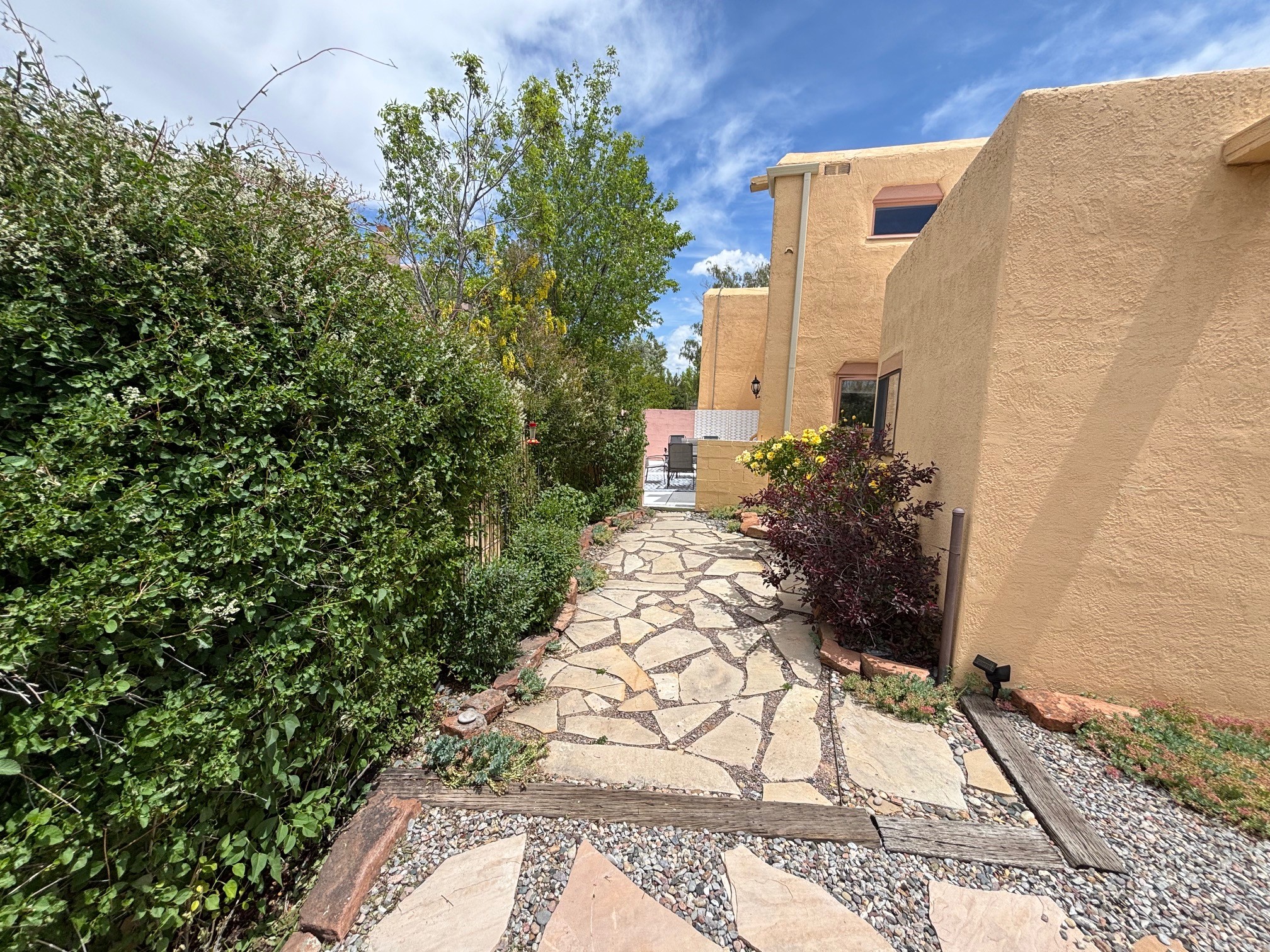Lovely, two story townhouse on a corner lot. Light and bright! Pueblo style with a kiva wood burning fireplace, vigas, plus Santa Fe style accents. Flooring includes brick, Pergo wood and tile. Newer blinds, and the roof and the boiler were replaced in 2021. Views from the 2nd story deck area. Primary bedroom and second bedroom are located upstairs with one bathroom. One bedroom and one bath are located downstairs. Stainless appliances in the kitchen. Nice sized laundry area and an attached 2 car garage. Walled in front/back patio. Conveniently located to Ragle Park, coffee shops, Target, grocery stores, Genoveva Chavez recreation center and Santa Fe Place Mall.