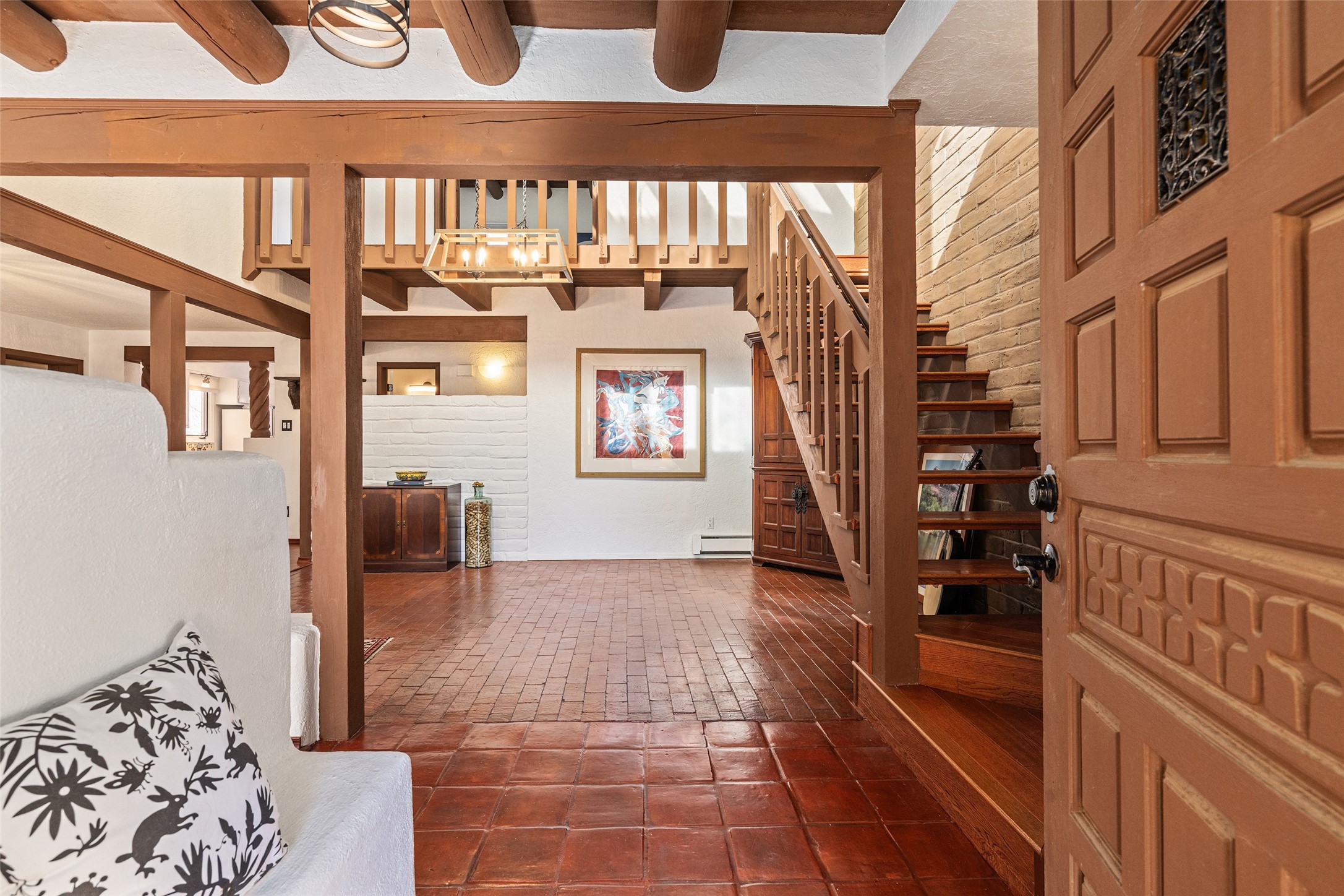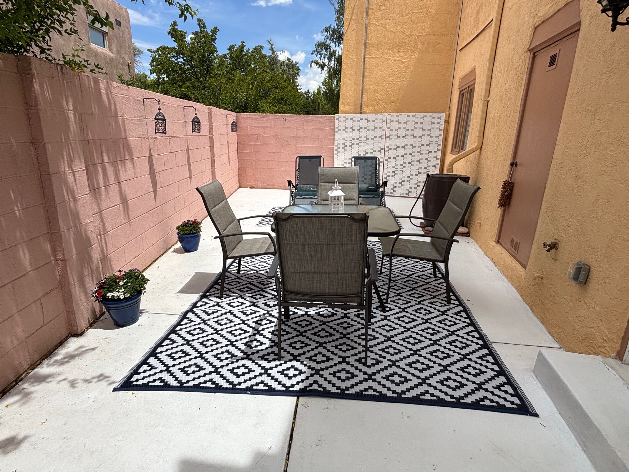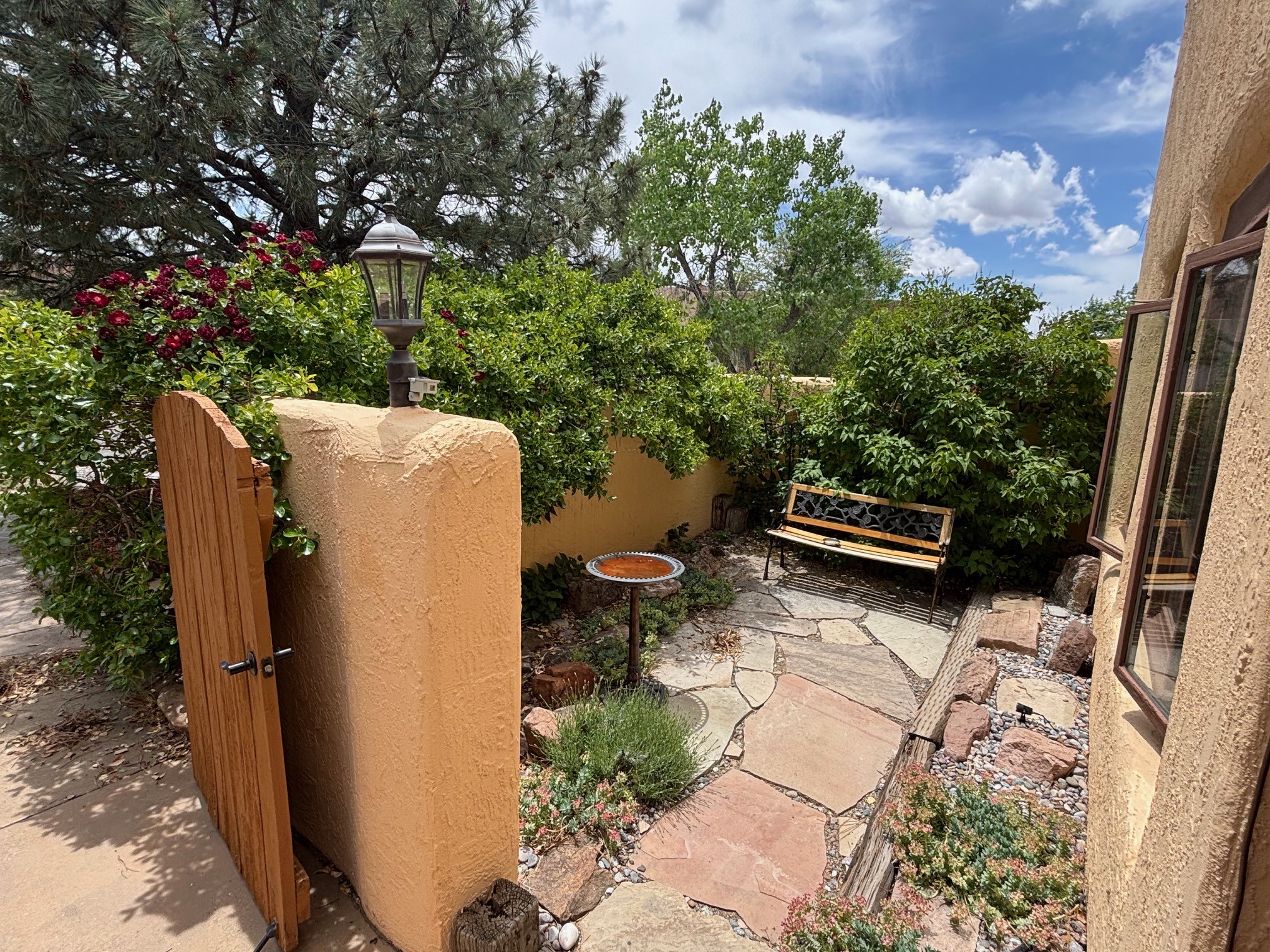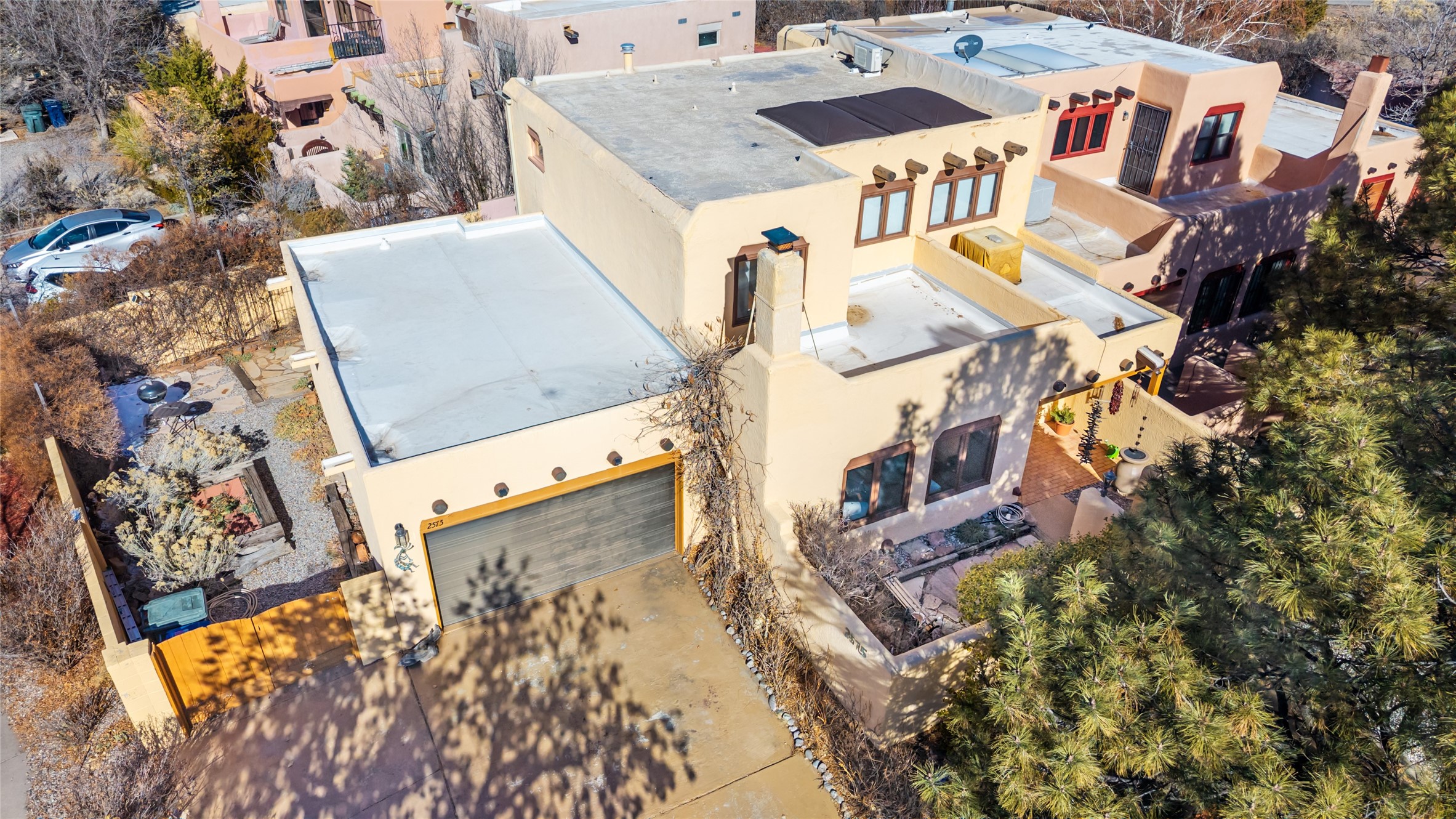 Lovely, two story townhouse on a corner lot. Light and bright! Pueblo style with a kiva wood burning fireplace, vigas, plus Santa Fe style accents. Flooring includes brick, Pergo wood and tile. Newer blinds, and the roof and the boiler were replaced in 2021. Views from the 2nd story deck area. Primary bedroom and second bedroom are located upstairs with one bathroom. One bedroom and one bath are located downstairs. Stainless appliances in the kitchen. Nice sized laundry area and an attached 2 car garage. Walled in front/back patio. Conveniently located to Ragle Park, coffee shops, Target, grocery stores, Genoveva Chavez recreation center and Santa Fe Place Mall.