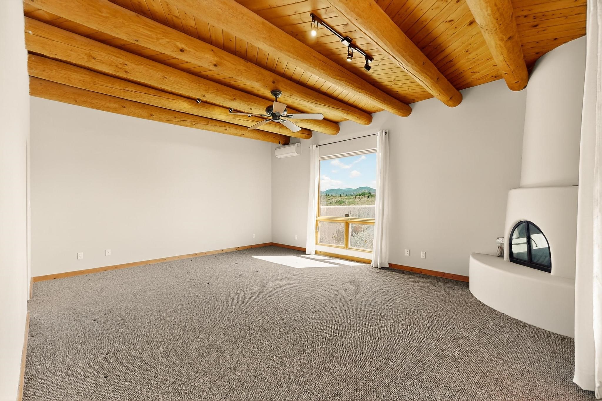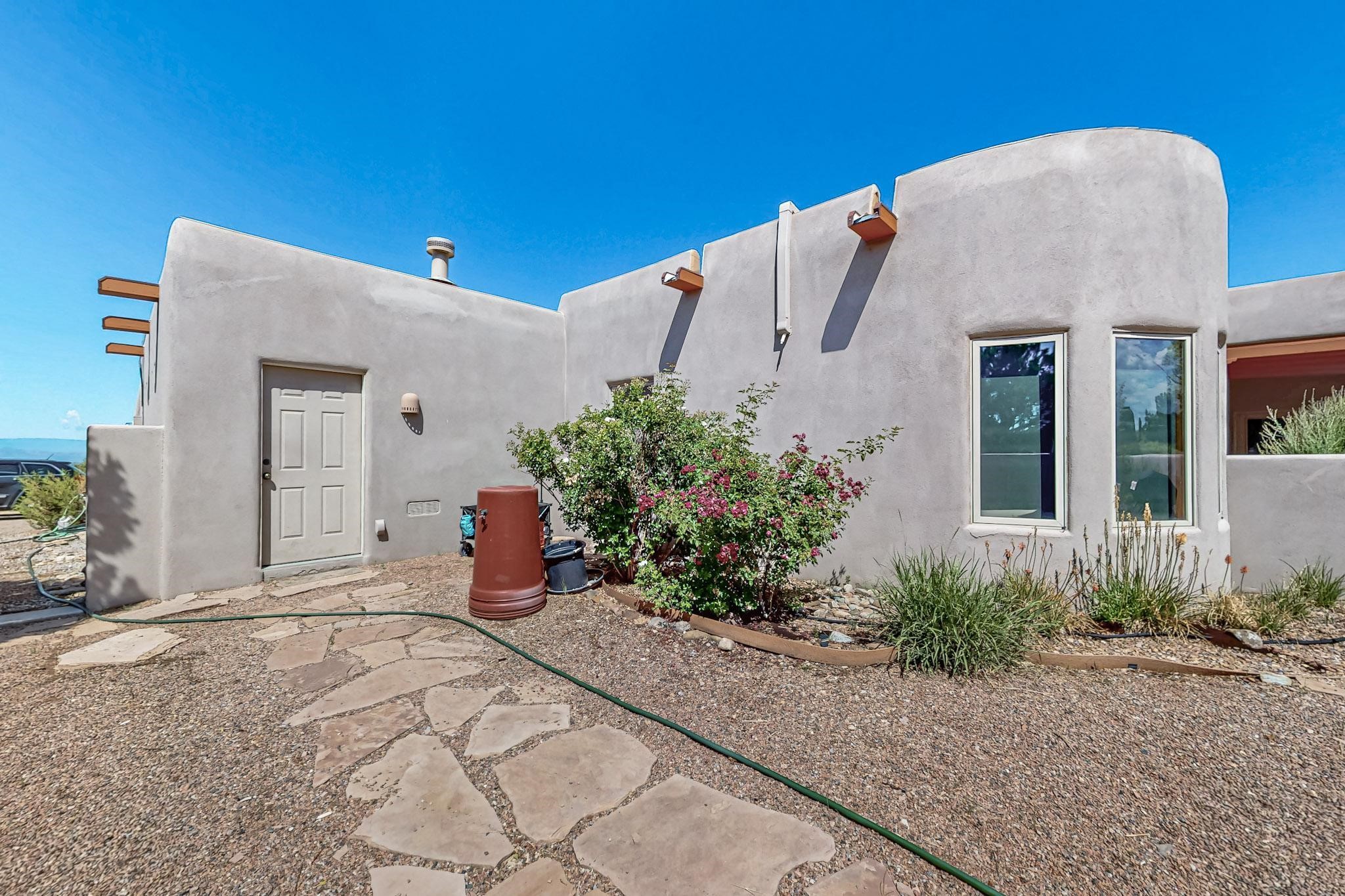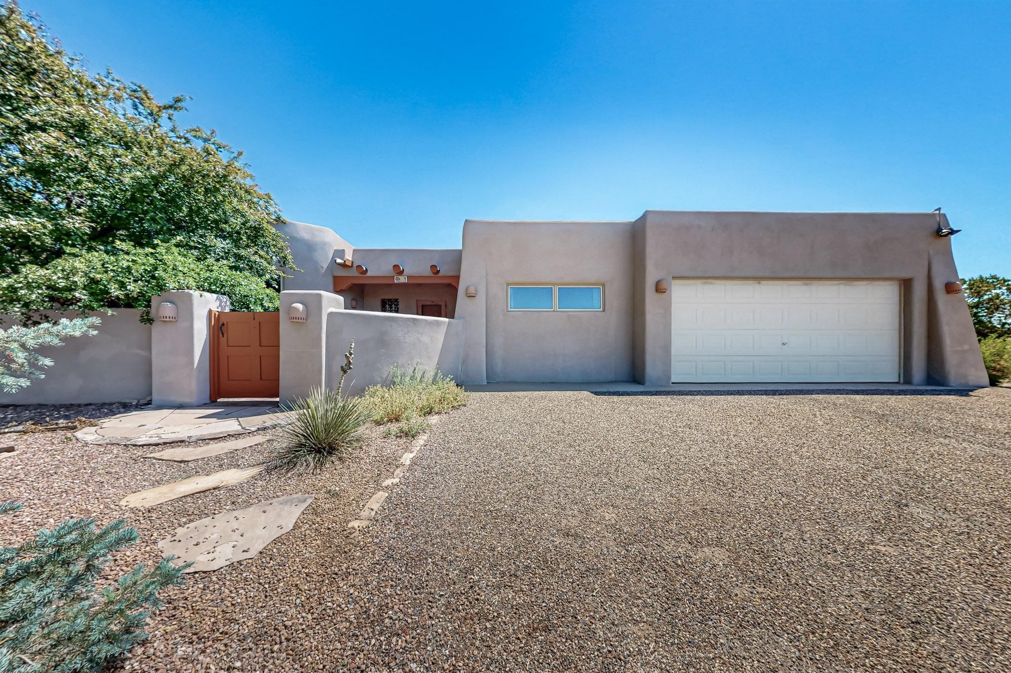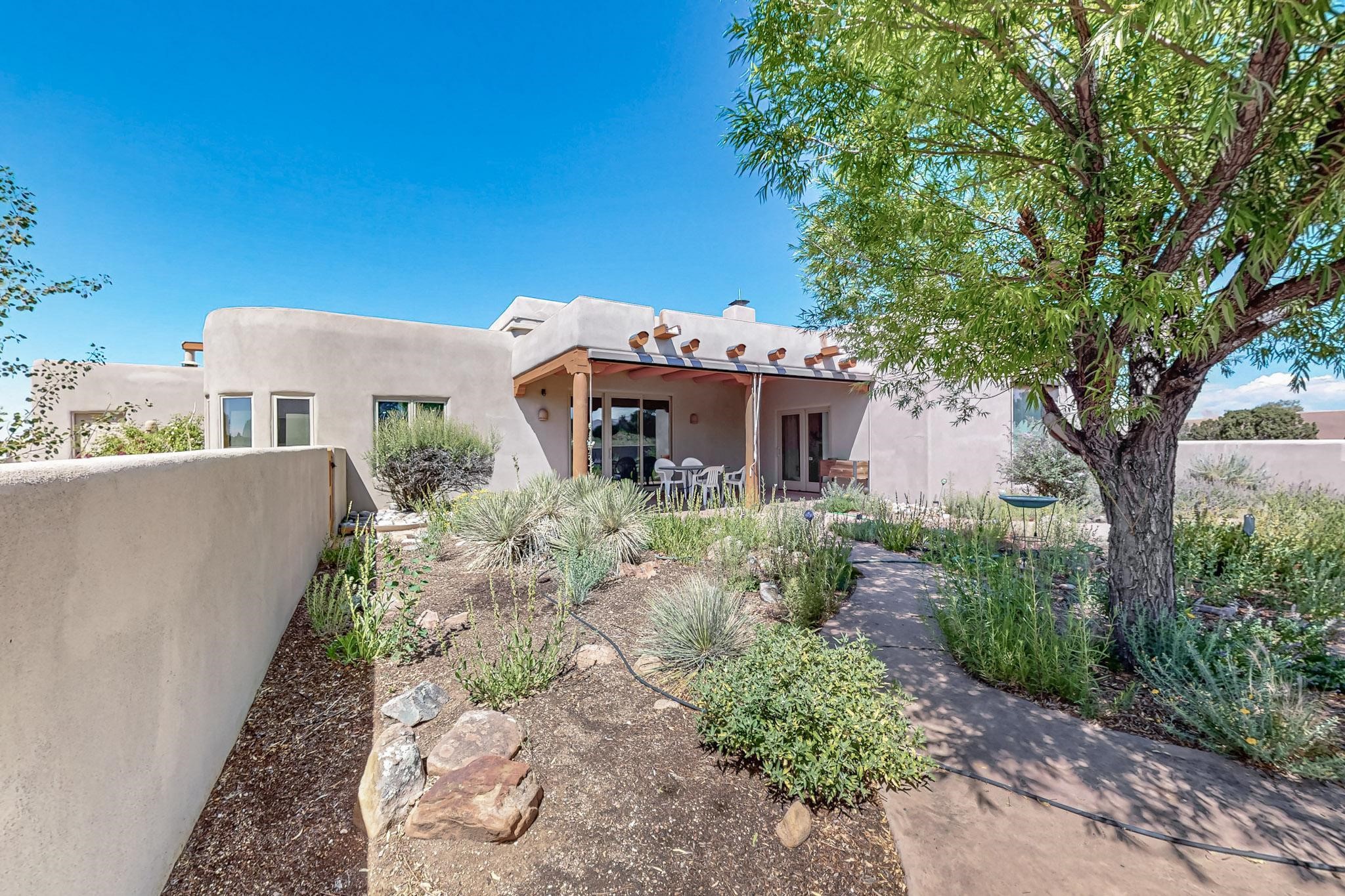 Priced to Sell! Potential multigenerational living. Expansive contemporary pueblo, split bedroom open plan design with high ceilings throughout. The main home includes a formal dining area, spacious great room with kiva fireplace, a large primary suite with kiva fireplace, large walk in closet and spa-like bathroom. Excellent separation from the two guest bedrooms and bath, plus a den/study. The kitchen has been remodeled including an induction range top, custom lighted cabinetry and 2 pantries. The radiant heating is supplemented by 5 mini splits to keep a comfortable temperature summer and winter. There is a large heated storage room/workroom for hobbies and toys plus an oversized 2 car garage with extra storage. Behind the home sits a detached 478 sq.ft. heated 2 room studio/guest with a 3/4 bathroom for extra guests/office or studio with a separate septic system. A lovely walled garden with a 3rd kiva fireplace for enjoyment plus a large portal for morning or evening outside entertainment. Enjoy the historic railway and rail trail bordering the back of your land. Plenty of guest parking with a paved driveway and easy access to Eldorado amenities, local shopping only minutes into Santa Fe.