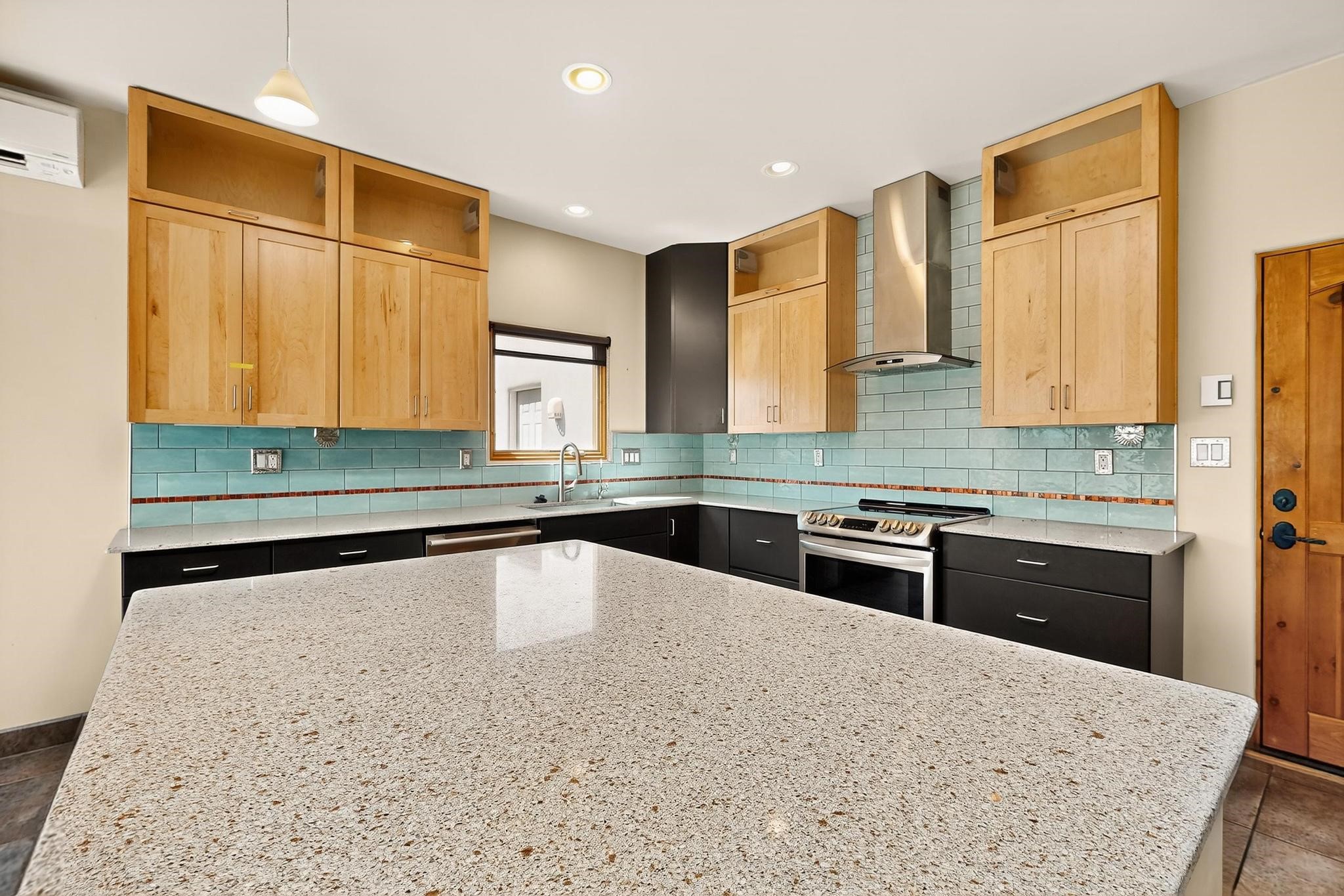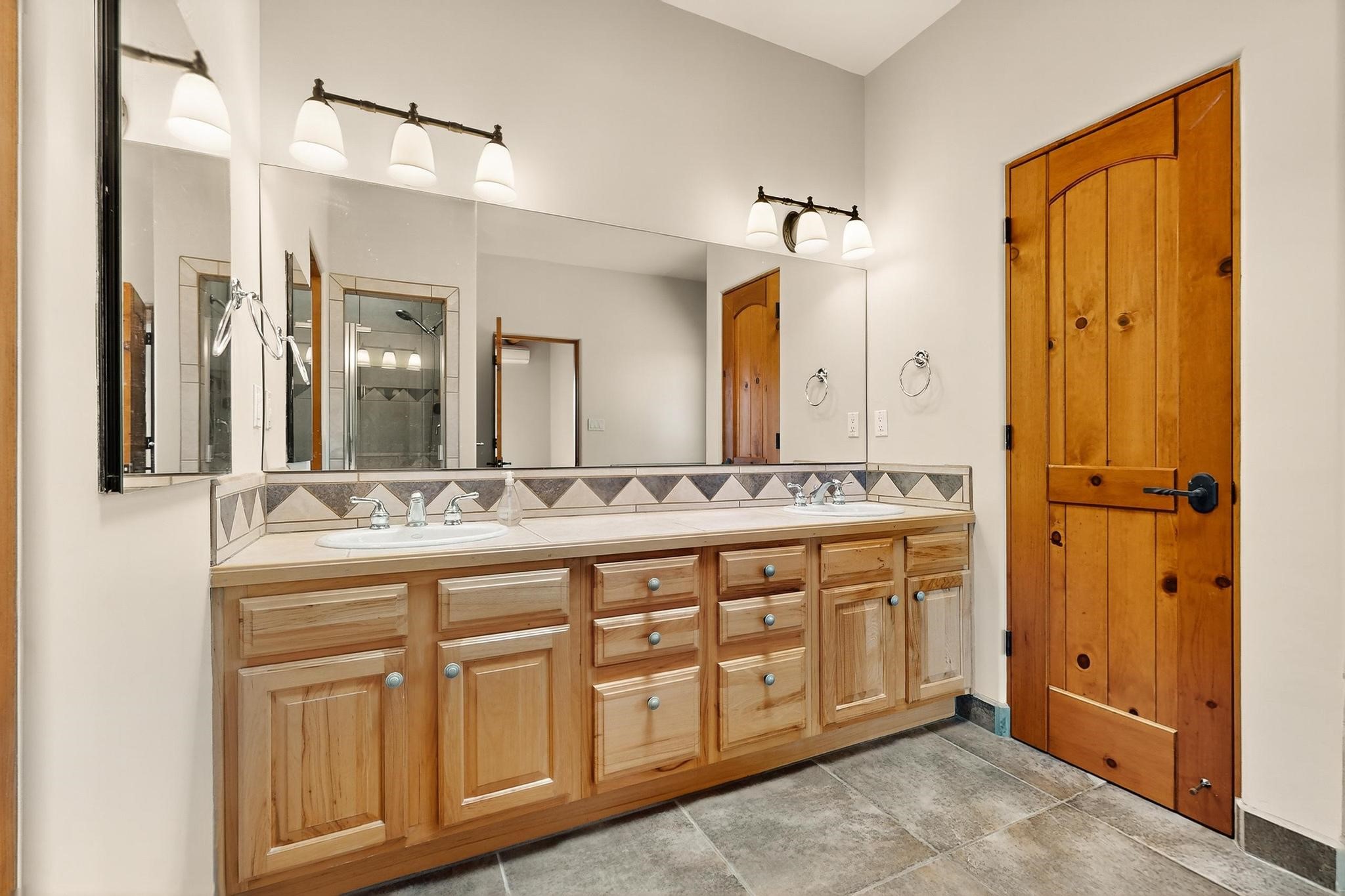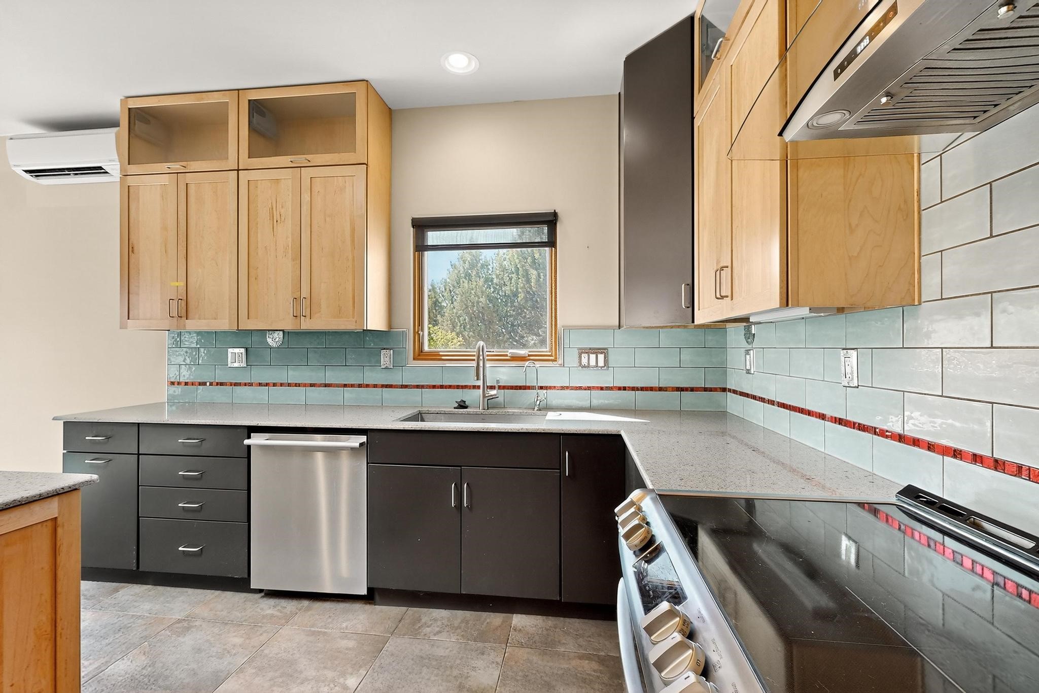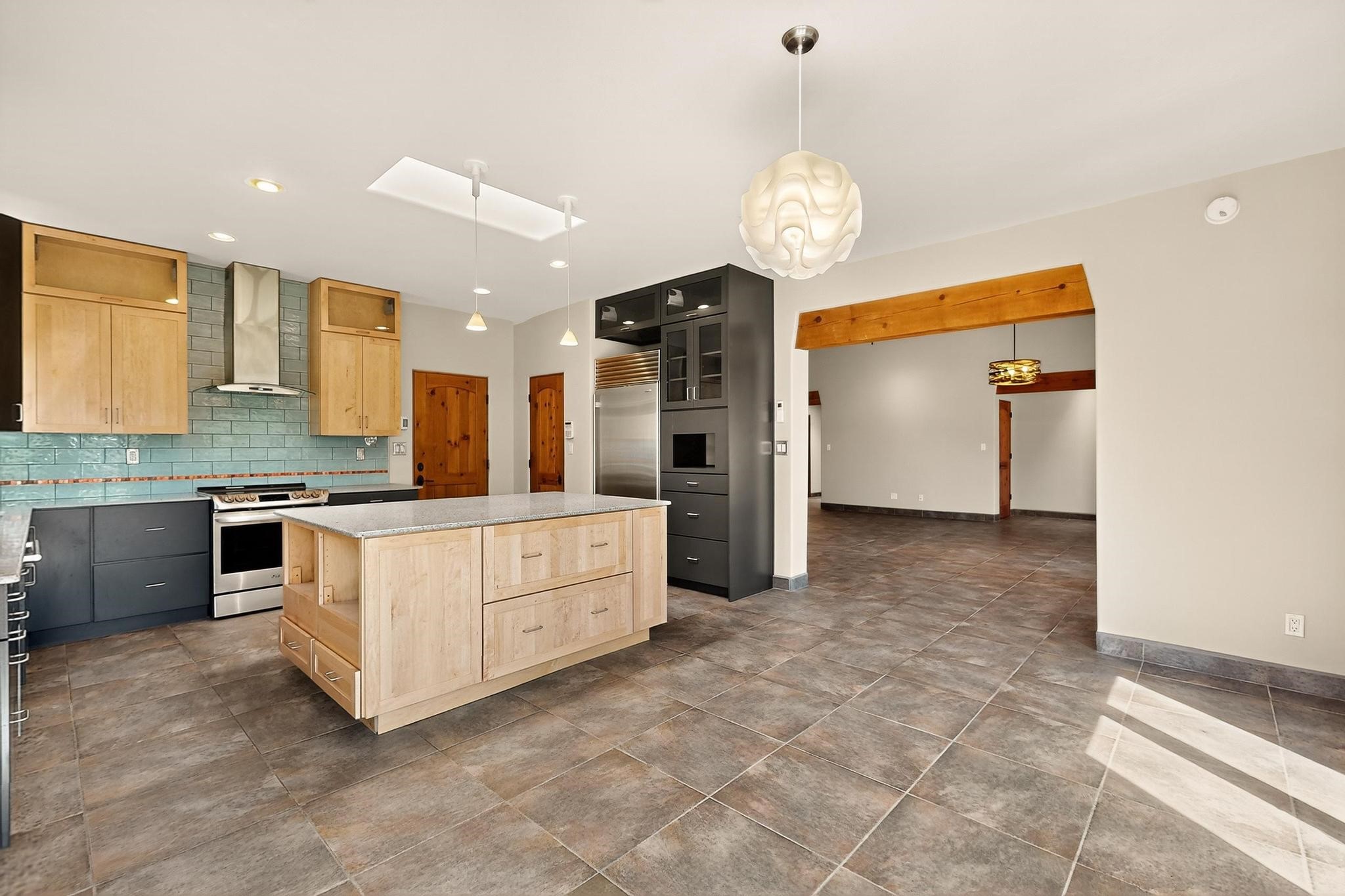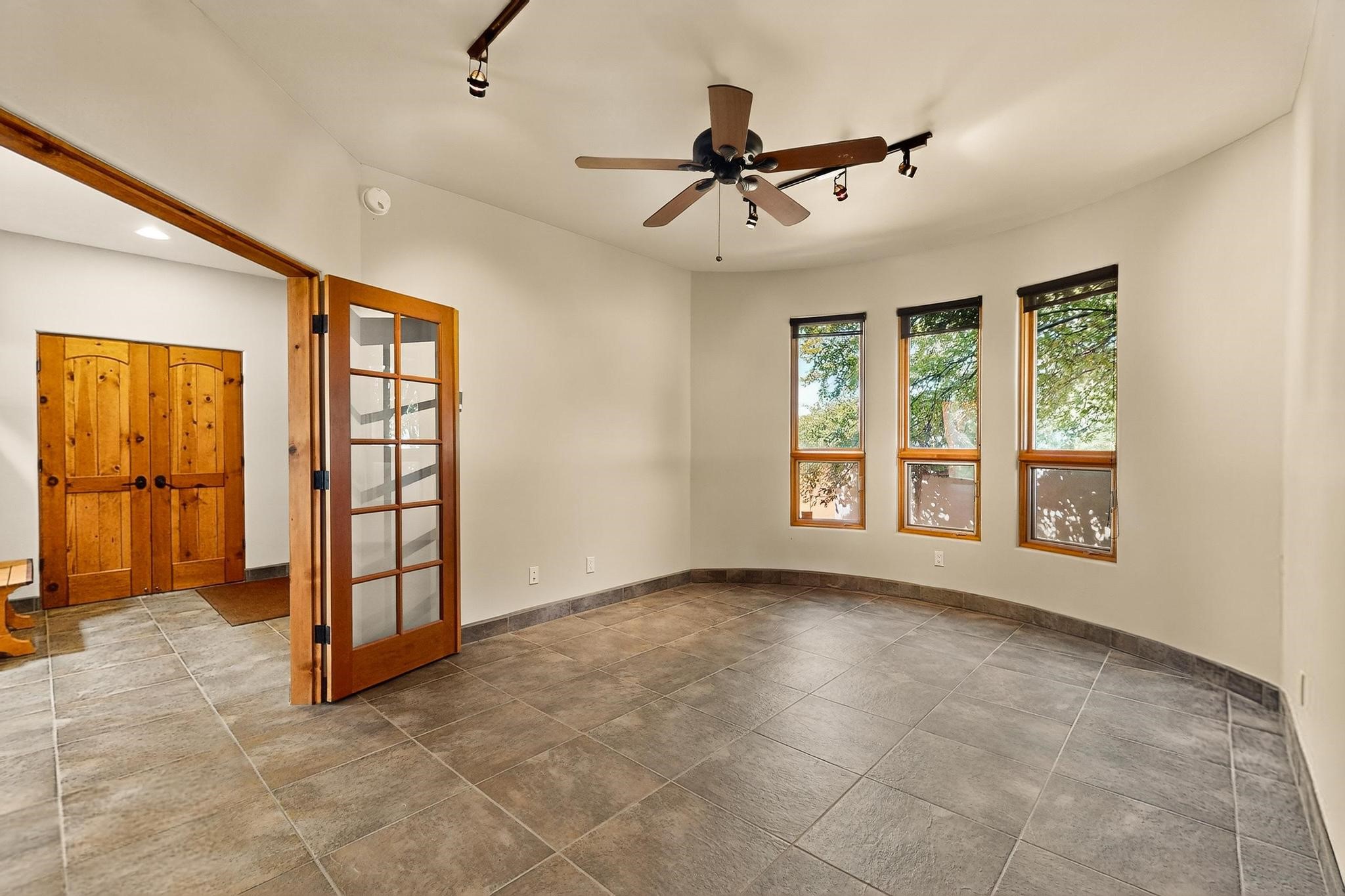 Priced to Sell! Potential multigenerational living. Expansive contemporary pueblo, split bedroom open plan design with high ceilings throughout. The main home includes a formal dining area, spacious great room with kiva fireplace, a large primary suite with kiva fireplace, large walk in closet and spa-like bathroom. Excellent separation from the two guest bedrooms and bath, plus a den/study. The kitchen has been remodeled including an induction range top, custom lighted cabinetry and 2 pantries. The radiant heating is supplemented by 5 mini splits to keep a comfortable temperature summer and winter. There is a large heated storage room/workroom for hobbies and toys plus an oversized 2 car garage with extra storage. Behind the home sits a detached 478 sq.ft. heated 2 room studio/guest with a 3/4 bathroom for extra guests/office or studio with a separate septic system. A lovely walled garden with a 3rd kiva fireplace for enjoyment plus a large portal for morning or evening outside entertainment. Enjoy the historic railway and rail trail bordering the back of your land. Plenty of guest parking with a paved driveway and easy access to Eldorado amenities, local shopping only minutes into Santa Fe.