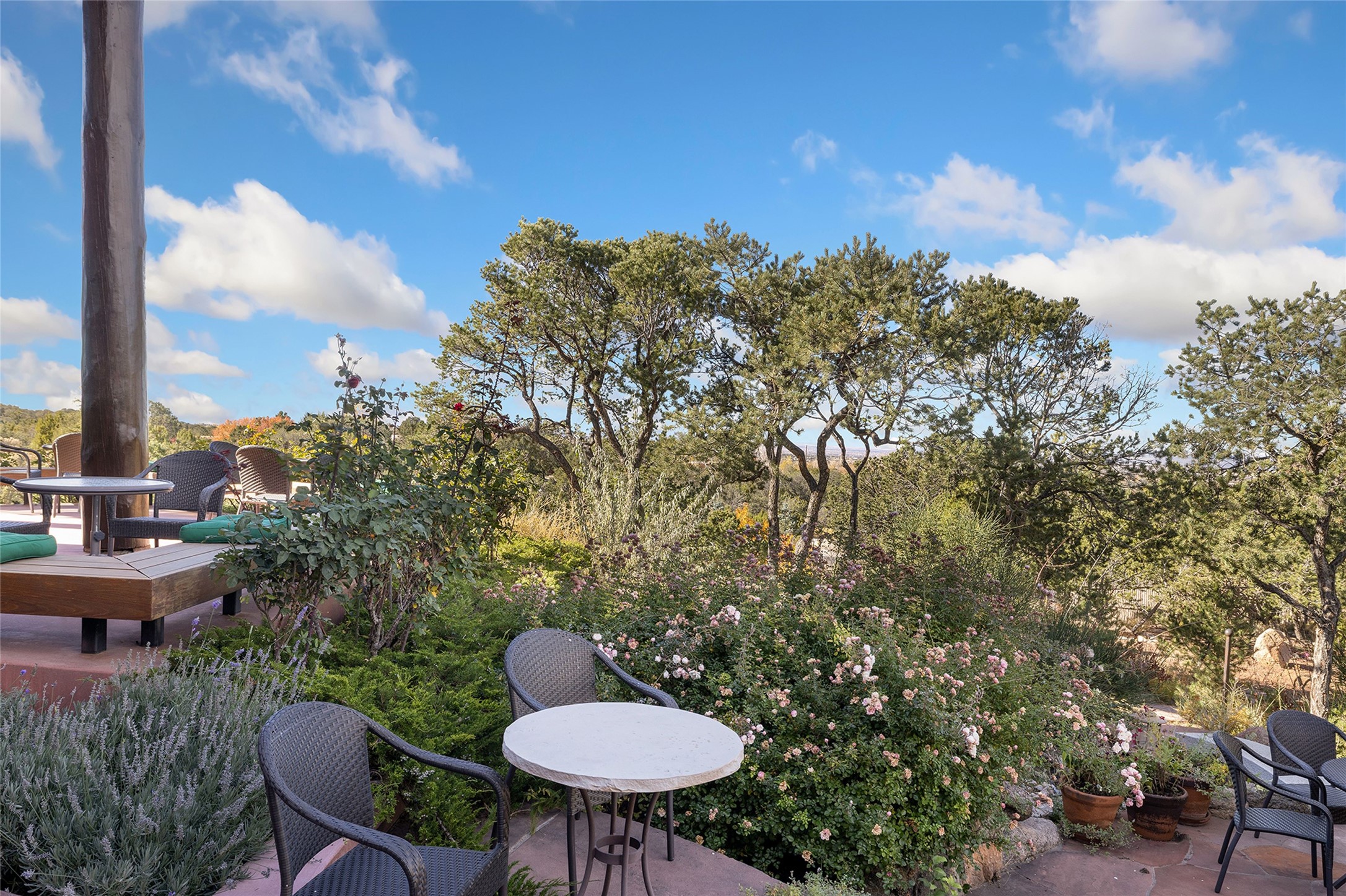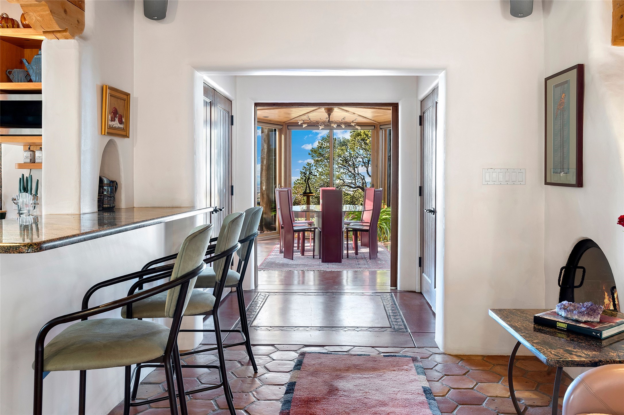 The Rocky Mountains stretch for 3,000 miles from Canada to New Mexico, taking their final shape in the Santa Fe foothills. 2022 Foothills Road is a fitting property to encapsulate the significance of this terminus, where the great mountains meet the special character of our town. The property comprises a 2-bedroom main house, a 2 bedroom casita, and an additional studio casita on 1.6 acres overlooking City lights below. The main house blends traditional puebloan design -- substantial rounded plaster walls, wooden vigas and latillas, and kiva fireplaces with modern proportions and touches of calming Japanese accents. The main level has a large primary suite with an updated bathroom, formal and informal sitting rooms, a secluded sunroom with a backdrop of a lush pond, and an indoor therapy pool room. Also on the main level is a light-filled kitchen wrapped with windows and featuring custom wooden cabinetry, a farmhouse sink, stone and wood countertops, and open display shelving that add warmth and architectural character. The showpiece of the main house is the glass-walled dining room that sits like a peninsula on the western edge, capturing expansive views of Santa Fe and the plains beyond to the Sandia Mountains in the south and sunsets atop the Jemez Mountains in the west. On the second level, exceptional views are further elevated. This upper story includes two rooms sharing a full bathroom, lending themselves as bedrooms or offices. On both levels, there is a powder room for guests. Regardless of the use, these rooms frame open skies as far as the eyes can see. Separate from the main house is the sized casita with 2 bedroom suites, and living area. Attached to this casita is the studio casita, an open and high-ceilinged room inviting the owner's creativity. The space can be used as an art studio, private work space, or a rentable living space as it features a kitchenette and bathroom. Finishing off the improvements is a large 2-car garage with extra storage space.