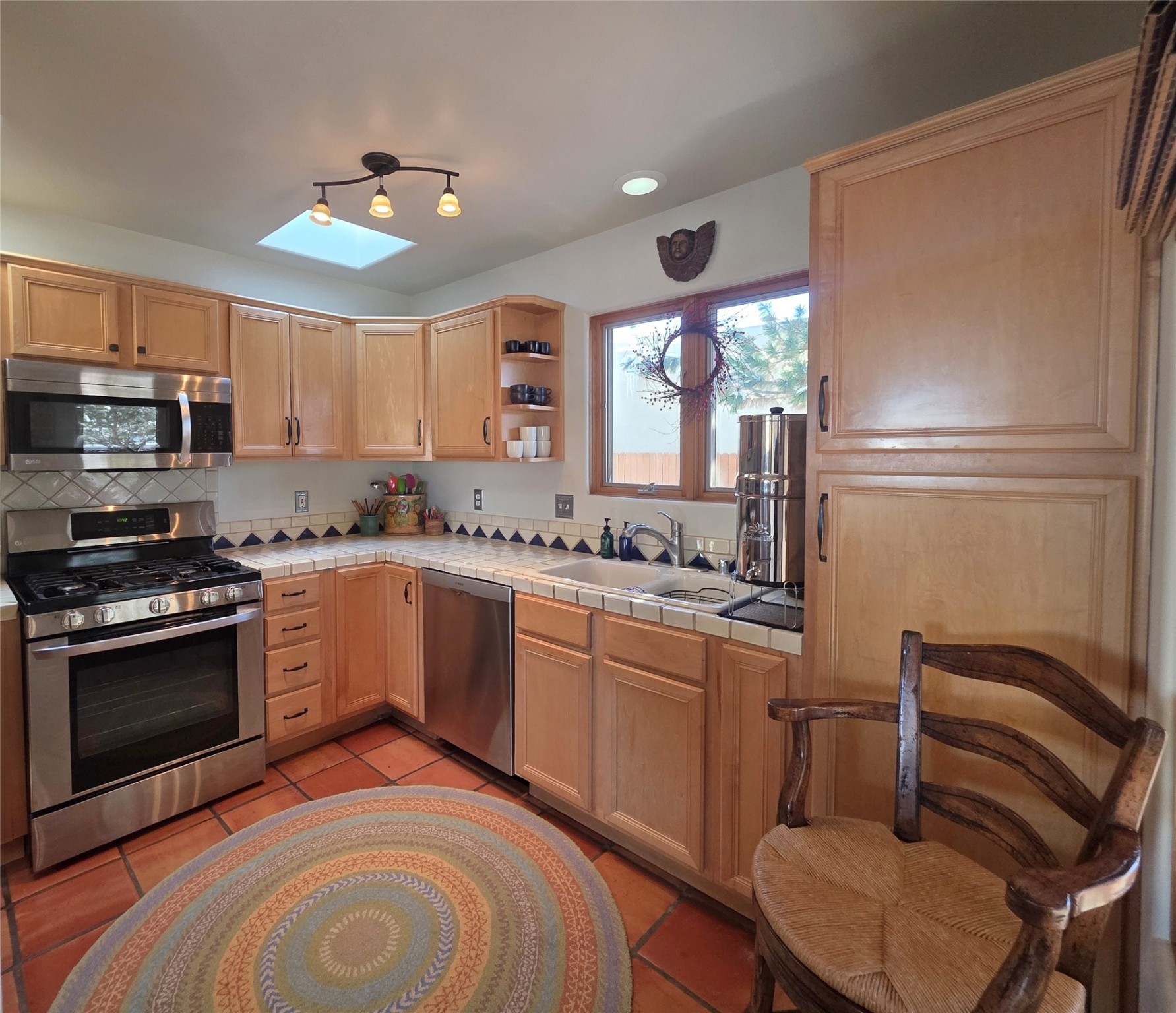 Set on a corner lot in Pueblos Del Sol, 3 bedrooms, 2 full baths 1,468 sq.ft., this inviting Santa Fe-style home blends timeless architecture with thoughtful livability. From the moment you enter, soaring ceilings, hand-crafted vigas and beams, a traditional kiva fireplace, and warm Saltillo tile floors create an atmosphere that feels both authentic and welcoming. The dining room frames beautiful views, opening to a covered patio where mature landscaping and quiet surroundings invite morning coffee or evening gatherings. The well-designed floor plan offers excellent separation, with a serene primary suite featuring a walk-out patio, westerly views, a generous walk-in closet, and a private bath.With radiant in-floor heating, a finished two-car garage, and a fully fenced yard, this home offers comfort, privacy, and ease -- a true Santa Fe retreat that is ready to enjoy.