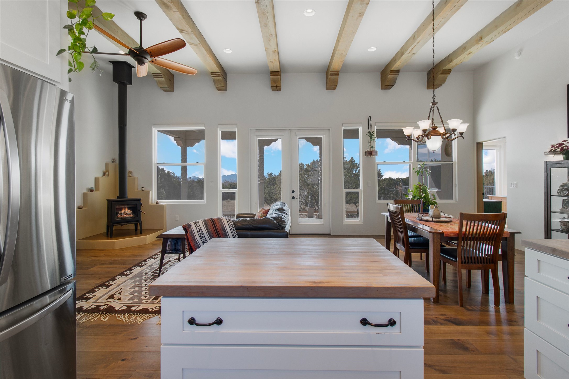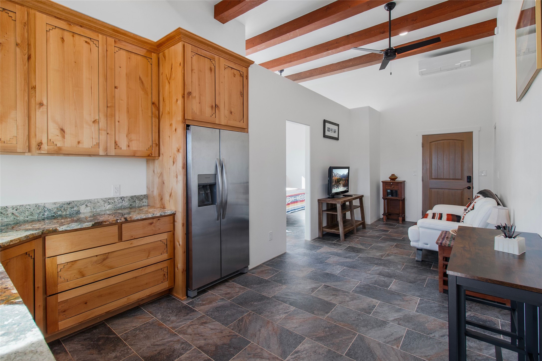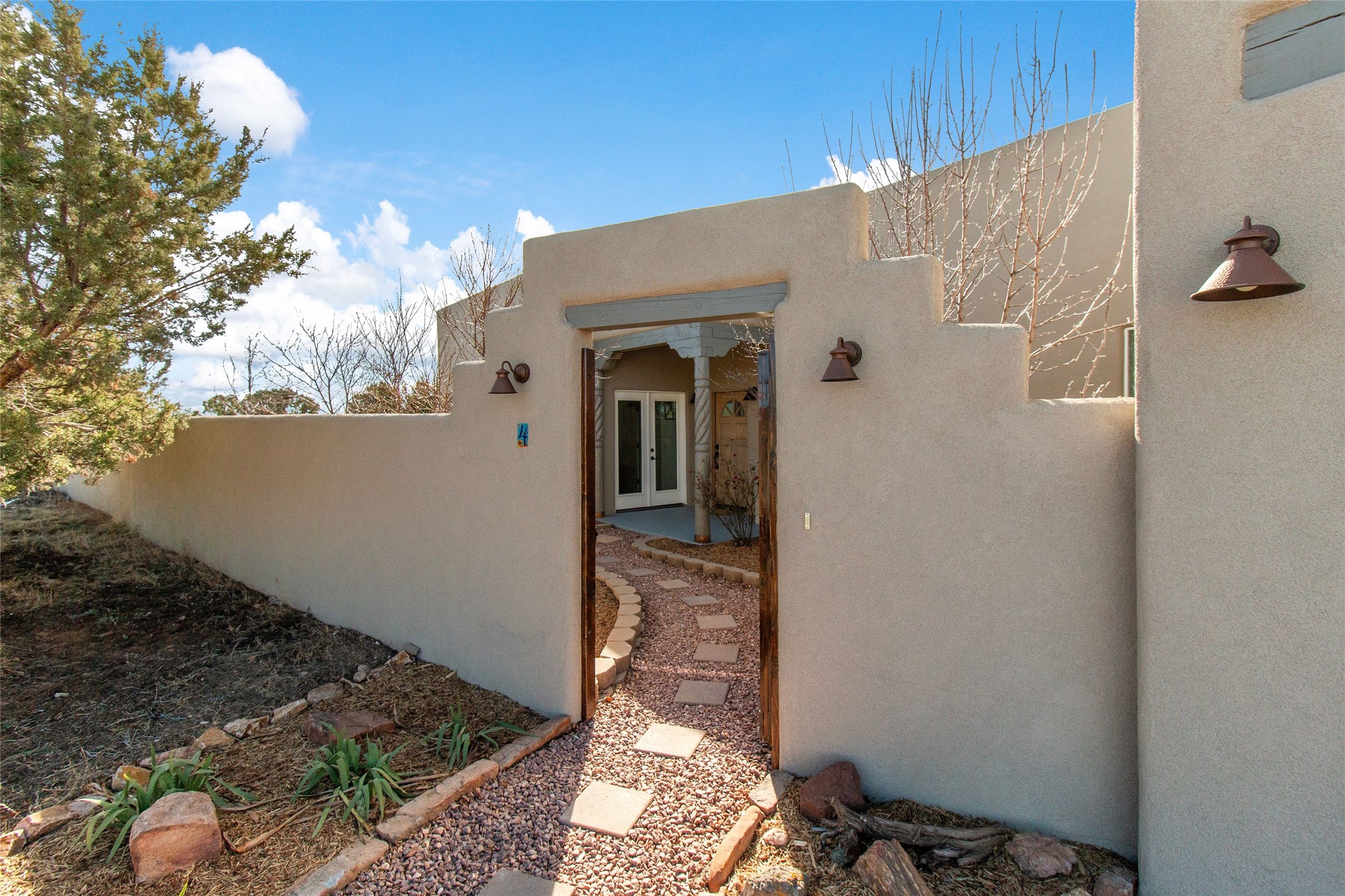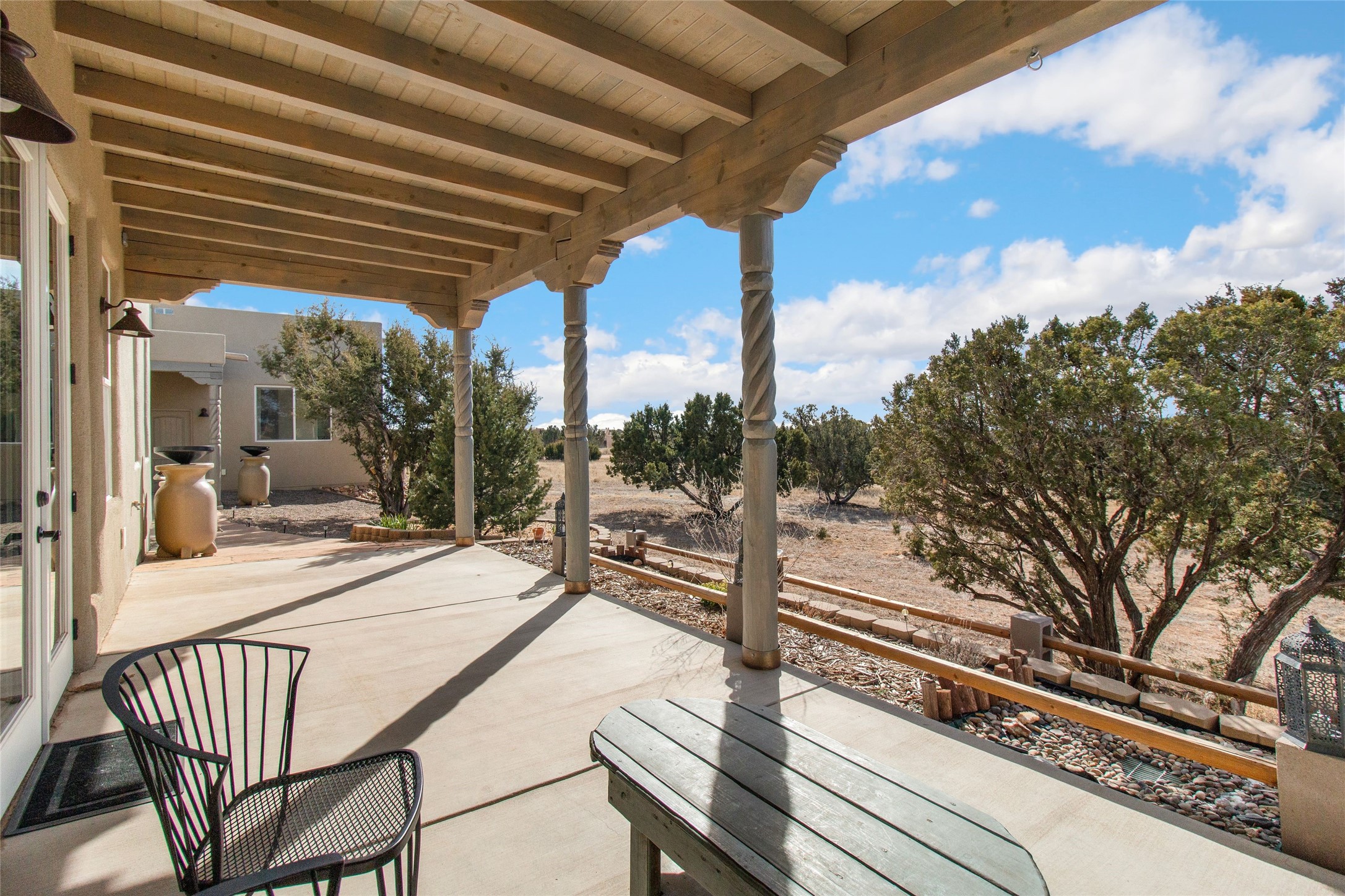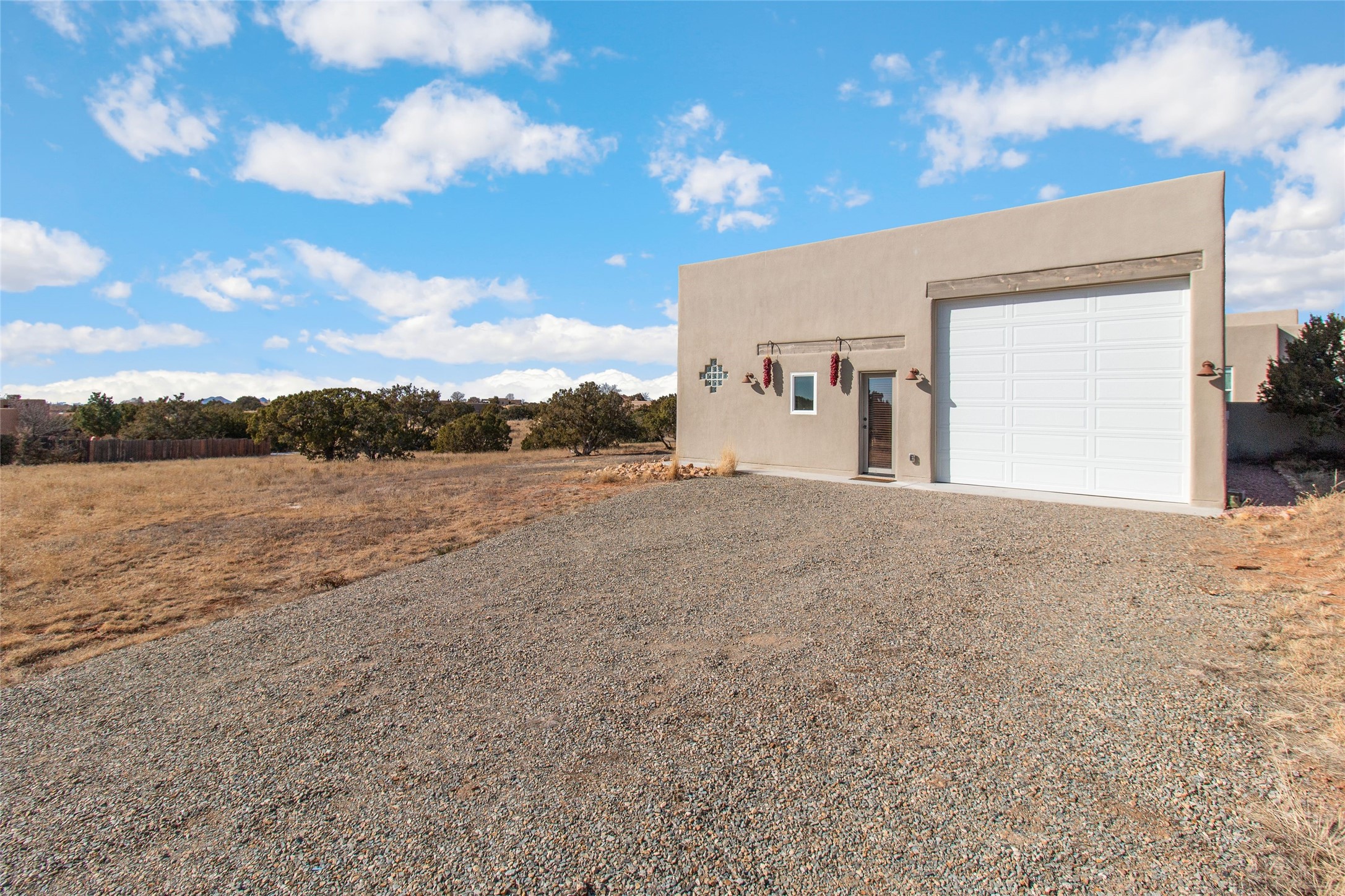 Pride of ownership is apparent the minute you walk into this exceptional 2019 contemporary build in Eldorado. Sellers have invested approximately $140,000 in improvements, included the construction of a new casita, during their ownership. Upon entry into the front court yard, you are greeted by apple, peach and cherry trees. The main house offers 3 bedrooms, 2 baths and open living concept with a split bedroom configuration for owner and guest privacy. Stunning views from the living room and back portal await you on this 1.4 acres. This home was built for energy efficiency as a priority with a HERS rating of 70. A solar panel system attached to the grid was added to the home in 2024 for ultra low electric bills. A Hearthstone Green Mountain convection wood stove takes the chill off those really cold winter evenings. An annually serviced tankless water heater ensures you never run out of hot water. Central cooling and heating. A detached one bedroom casita with a 3/4 quarters bathroom is perfect for guests or an in-law suite, plus an adjacent RV garage. For all the amenities available to homeowners in Eldorado, check out www.eldoradosf.org